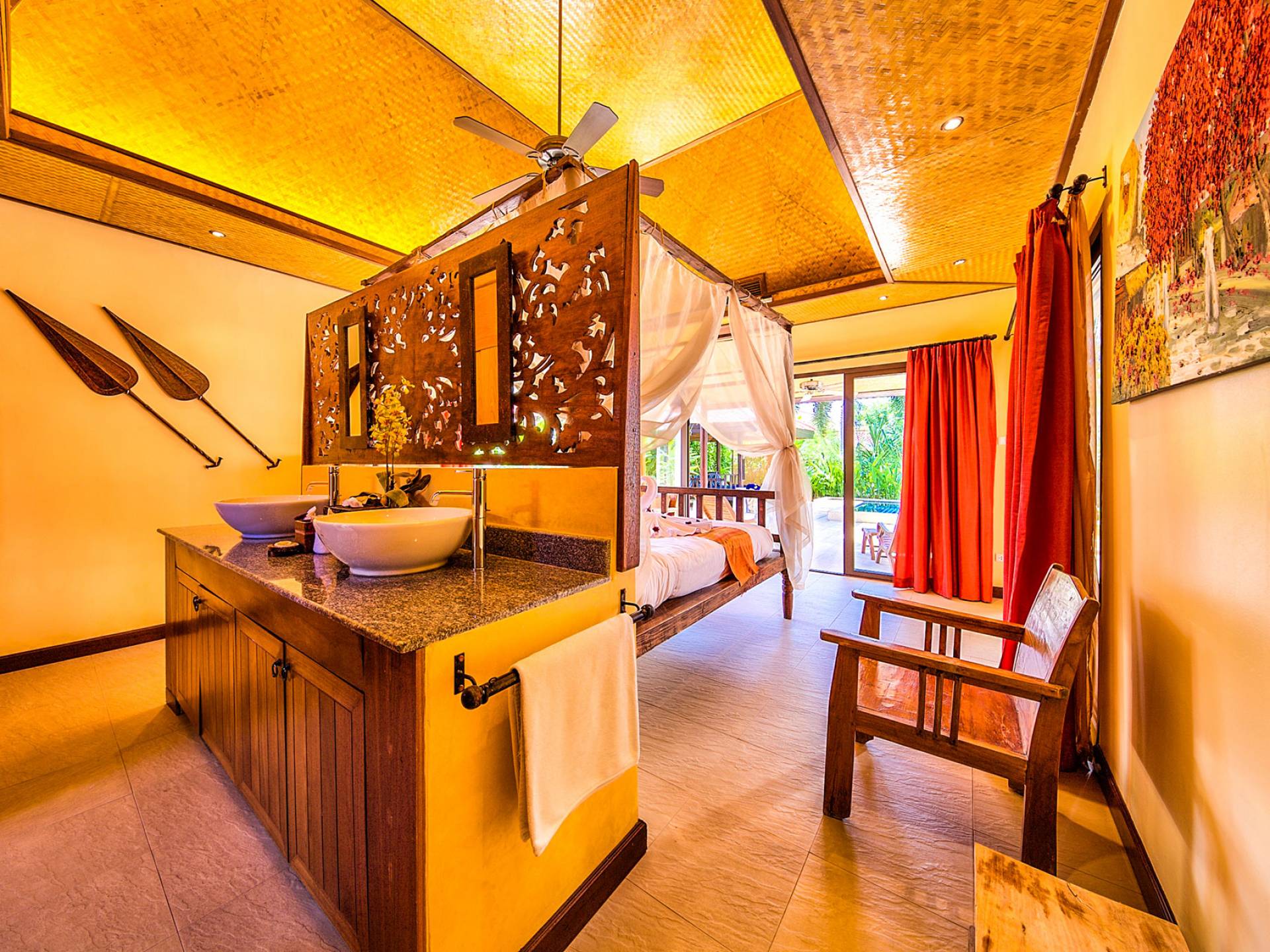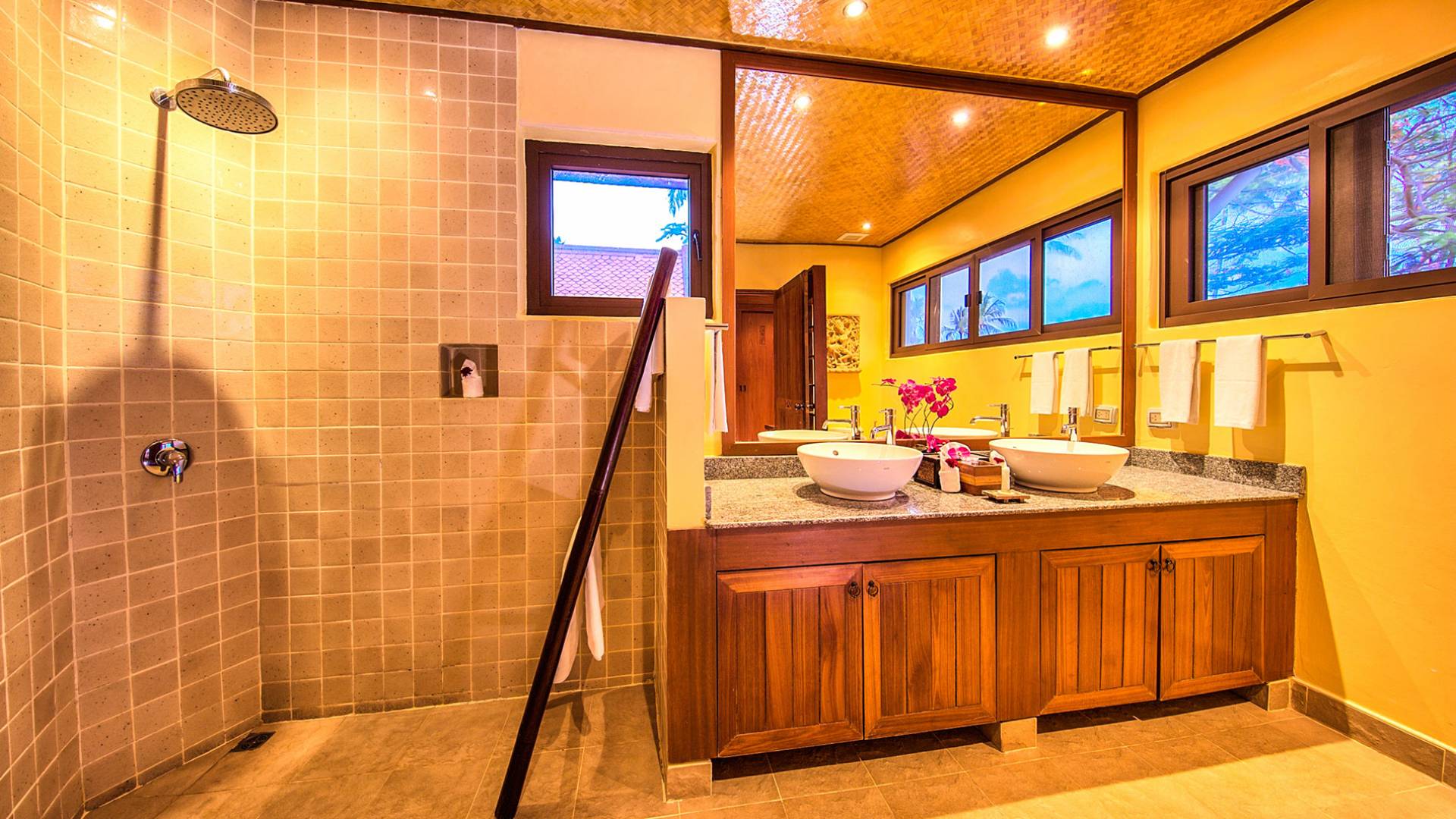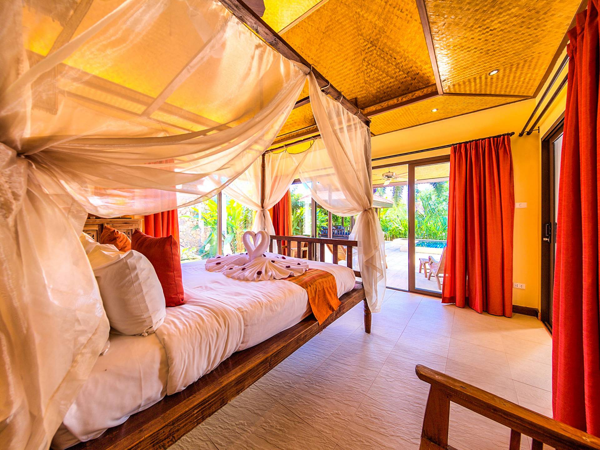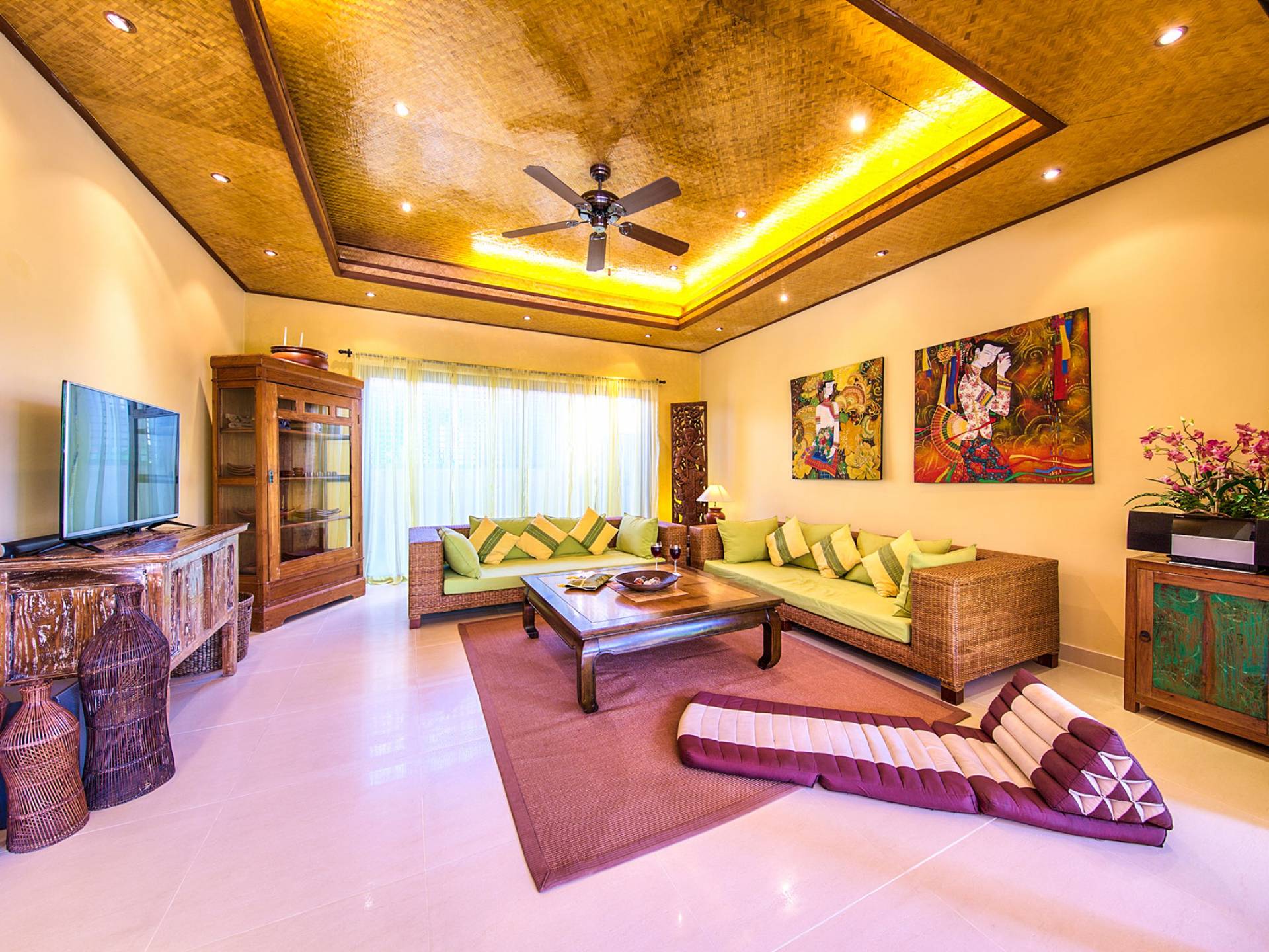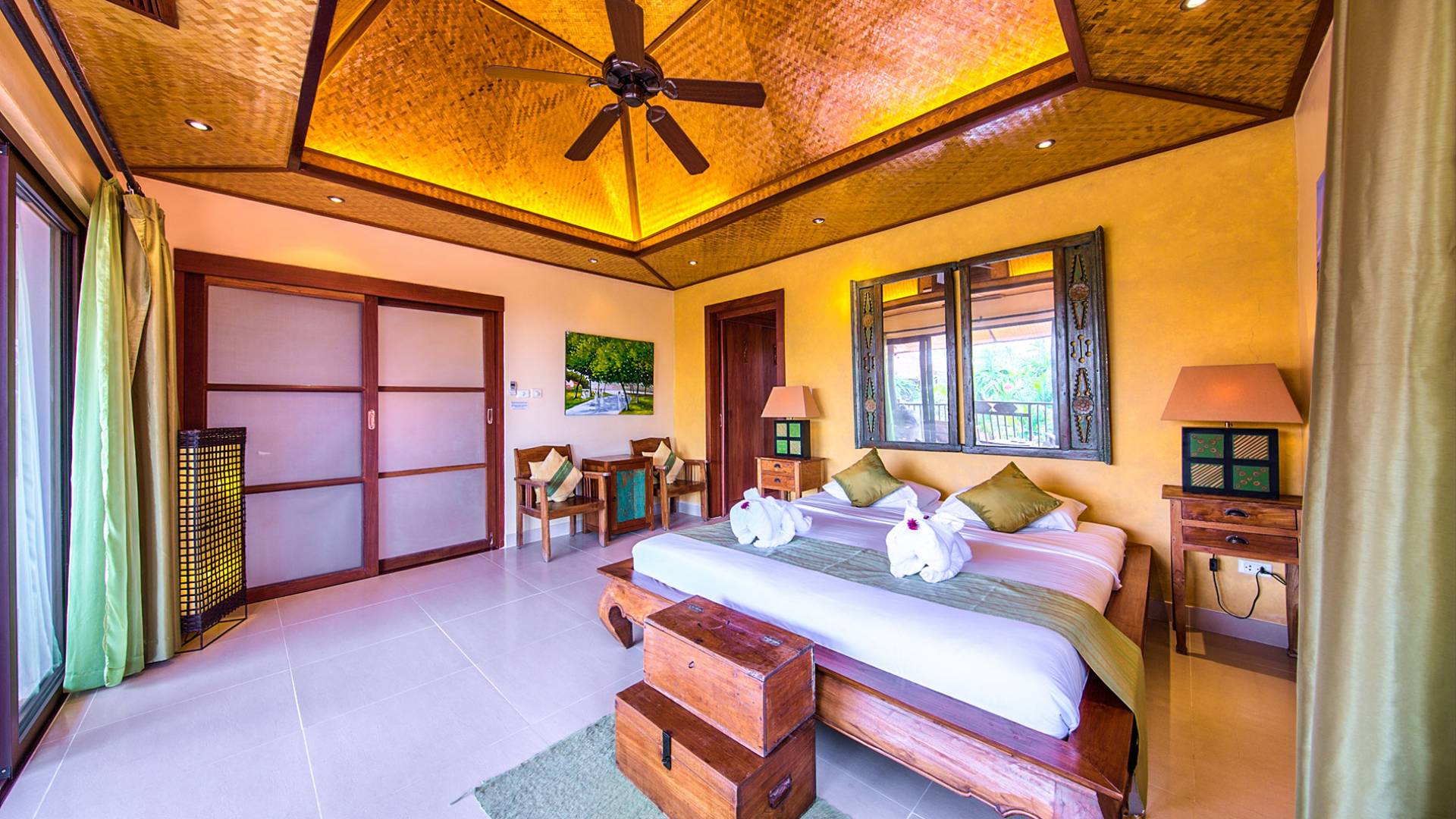 Villa Baan Buaa Samui è una lussuosa villa fronte mare in affitto con 3 camere da letto che può ospitare comodamente 6 adulti. Ci sono 3 camere matrimoniali e una culla che può essere fornita anche su richiesta e soggetta a disponibilità. Questa villa in affitto sulla spiaggia comprende un edificio principale di 2 piani e un edificio separato per gli ospiti adiacente. E' splendidamente arredato con molti pezzi d'antiquariato e riccamente decorato per riflettere l'architettura tailandese/balinese. Baan Buena è stato progettato per riflettere la vita tropicale interna ed esterna e offre un ambiente tranquillo e lussuoso per la tua vacanza sull'isola tropicale a Samui. La villa si trova a pochi passi dalla sabbia bianca di Nahai Beach e offre viste sul mare e sulla spiaggia dalle camere da letto e dai balconi al piano superiore.