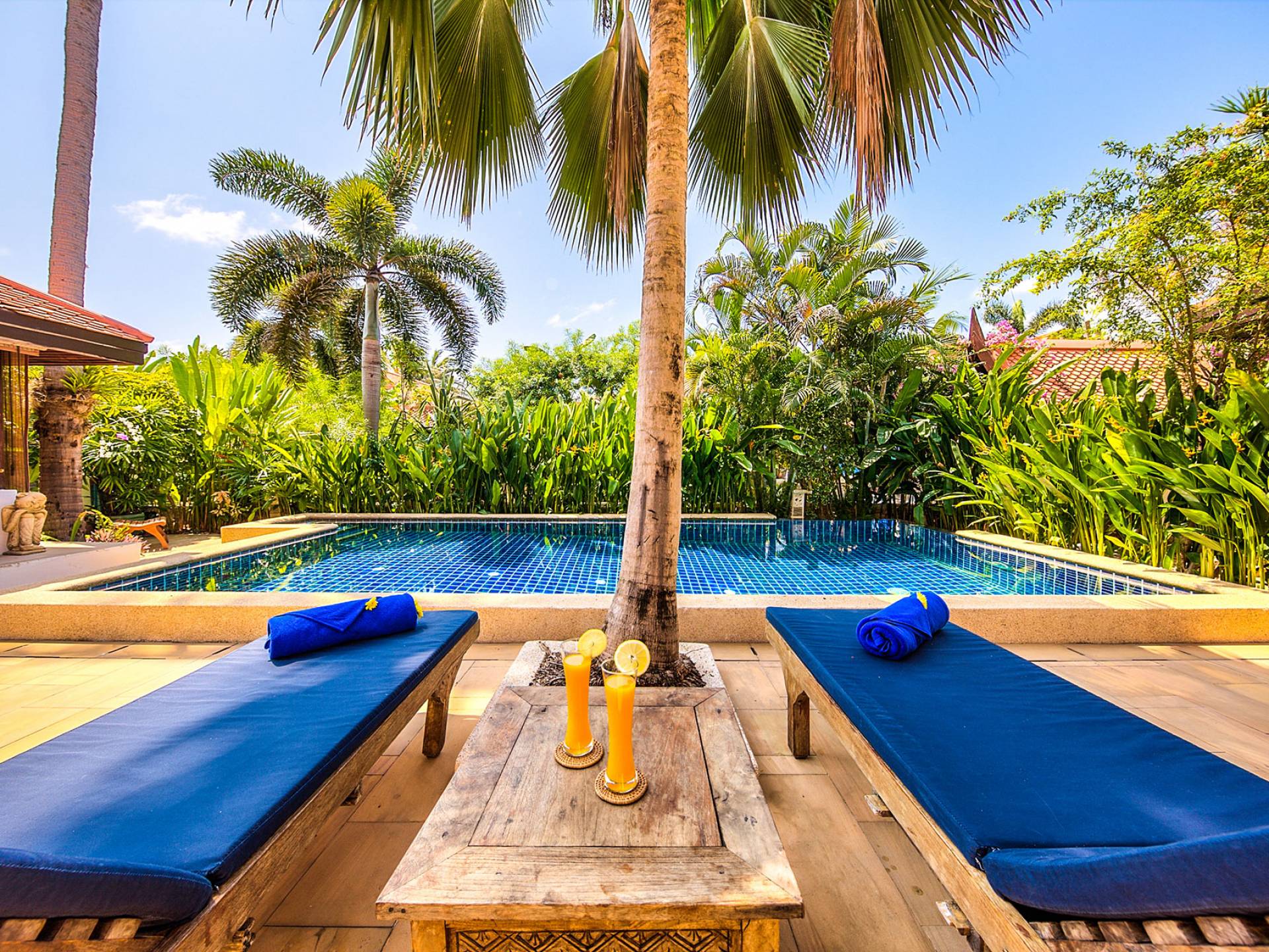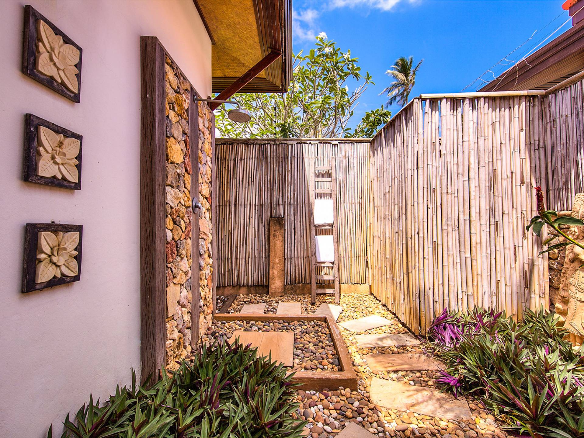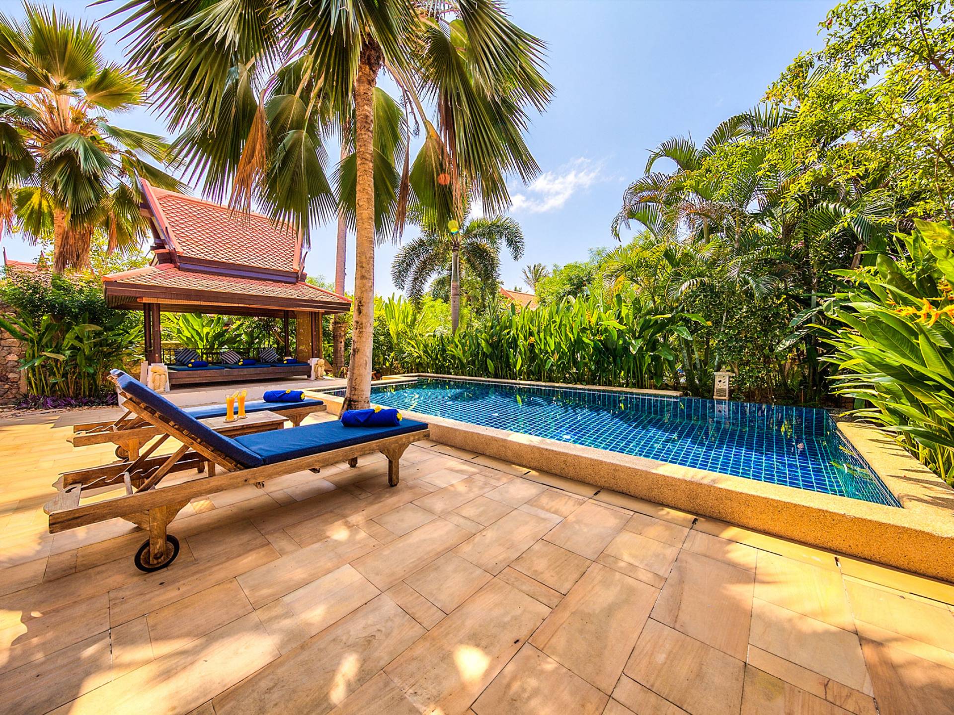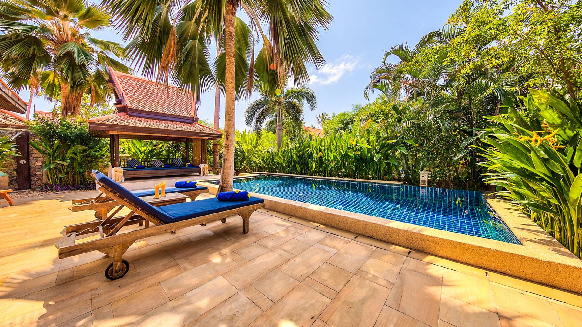 Villa Baan Buaa Samui ha la sua piscina privata con un'ampia terrazza in pietra arenaria e una doccia a bordo piscina. Il padiglione della sala thailandese con la sua piattaforma rialzata offre spazio per rilassarsi all'ombra vicino alla piscina. La villa è interamente climatizzata. I ventilatori a soffitto per interni ed esterni e le grandi finestre e porte scorrevoli massimizzano il raffreddamento naturale.
