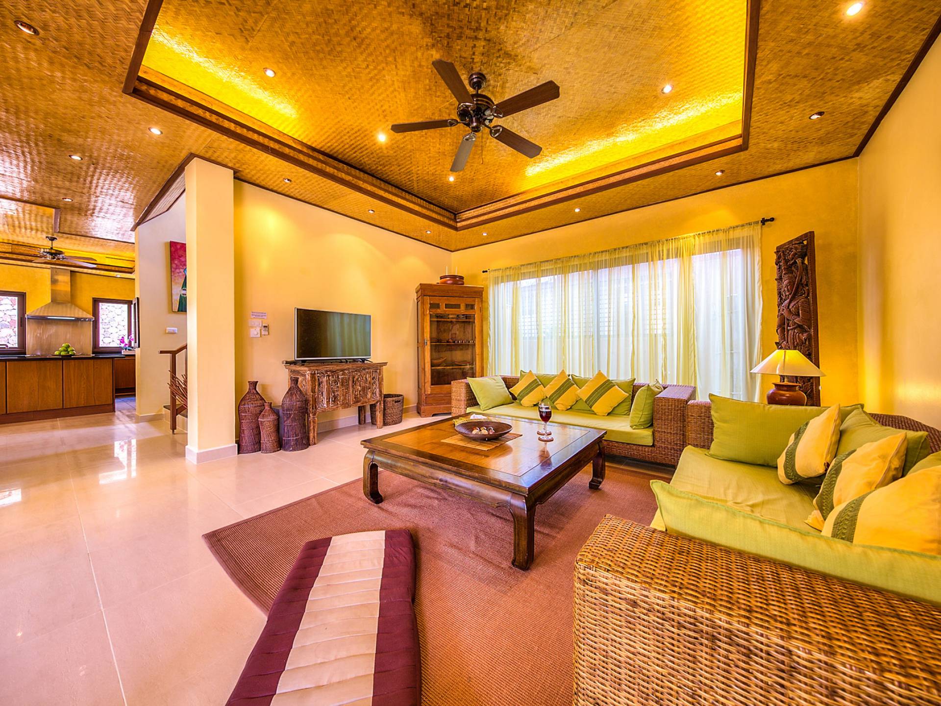Il soggiorno interno completa lo spazio abitativo esterno. Le porte della terrazza possono essere aperte per formare una zona giorno per le occasioni sociali. Per le opzioni di intrattenimento, c'è una grande TV al plasma da 50 pollici con un lettore DVD e una raccolta di film in DVD e un pacchetto completo di canali internazionali TV in diretta (True Visions Gold).
