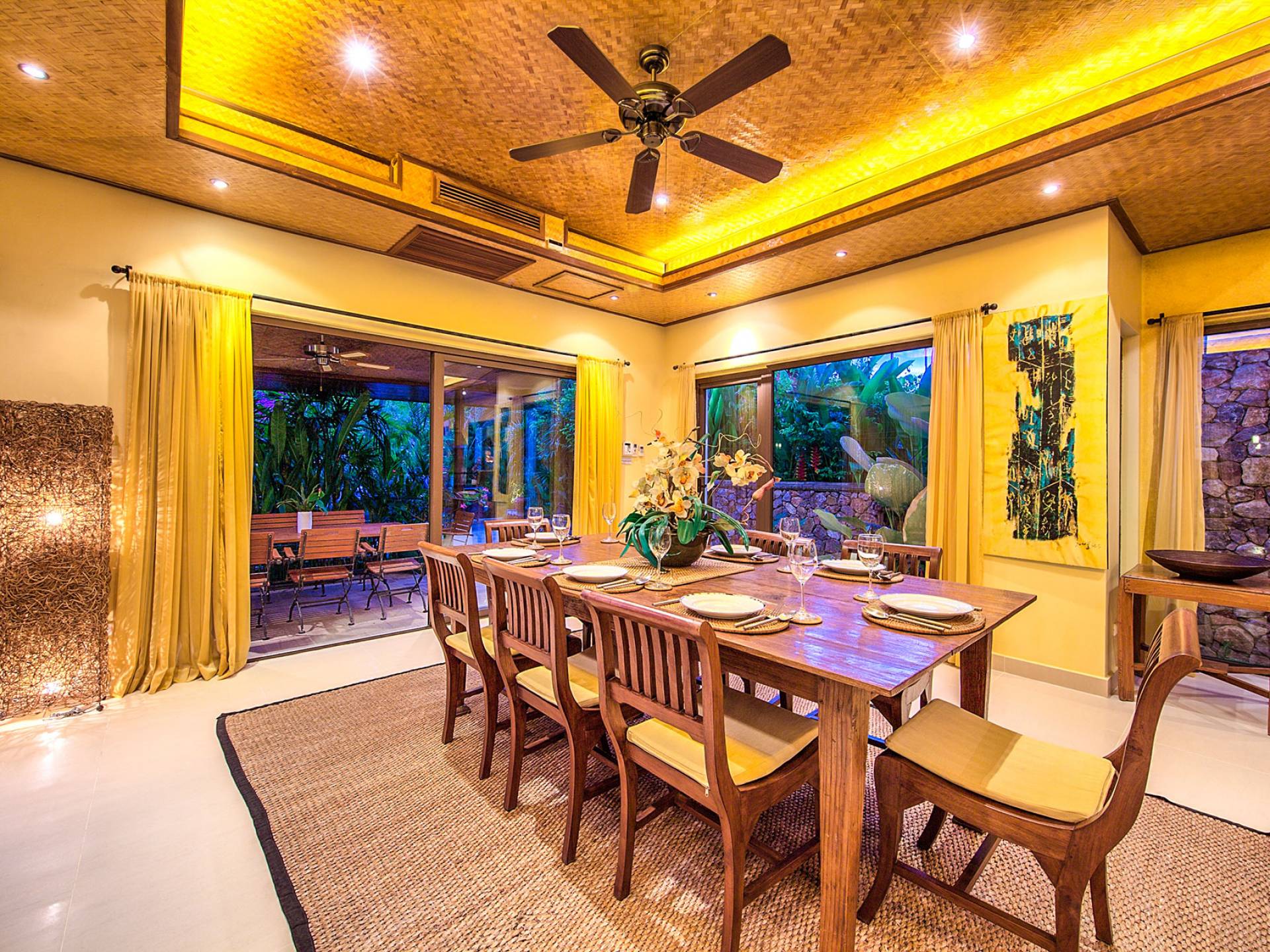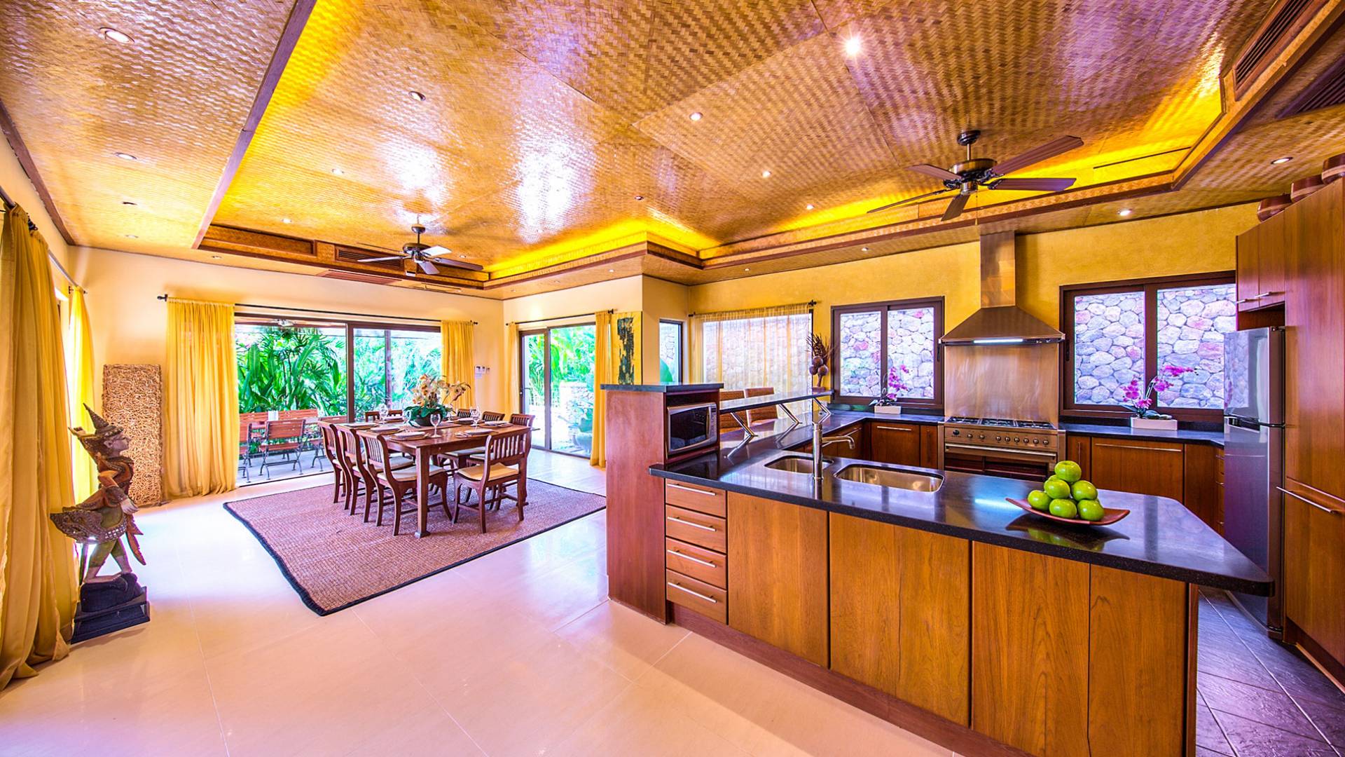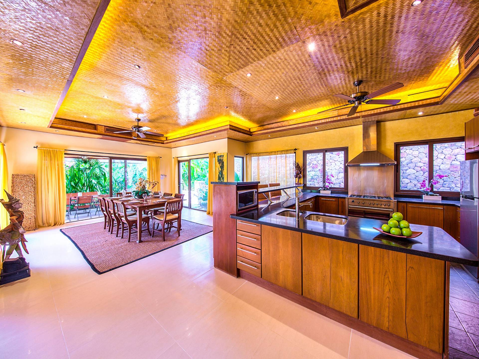 La sala da pranzo interna può ospitare comodamente otto persone. Le porte della terrazza si collegano a una zona pranzo all'aperto e alla terrazza della piscina. La zona pranzo all'aperto si affaccia sulla piscina e sulla terrazza in arenaria. Protetto dal suo ampio tetto, è aperto alle brezze rinfrescanti. Un grande barbecue a gas australiano consente di cucinare e grigliare all'aperto. La cucina in teak/granito in stile occidentale completamente attrezzata con bancone all'americana è completa di tutte le moderne attrezzature ed elettrodomestici. C'è anche una lavanderia adiacente dotata di lavatrice e asciugatrice.