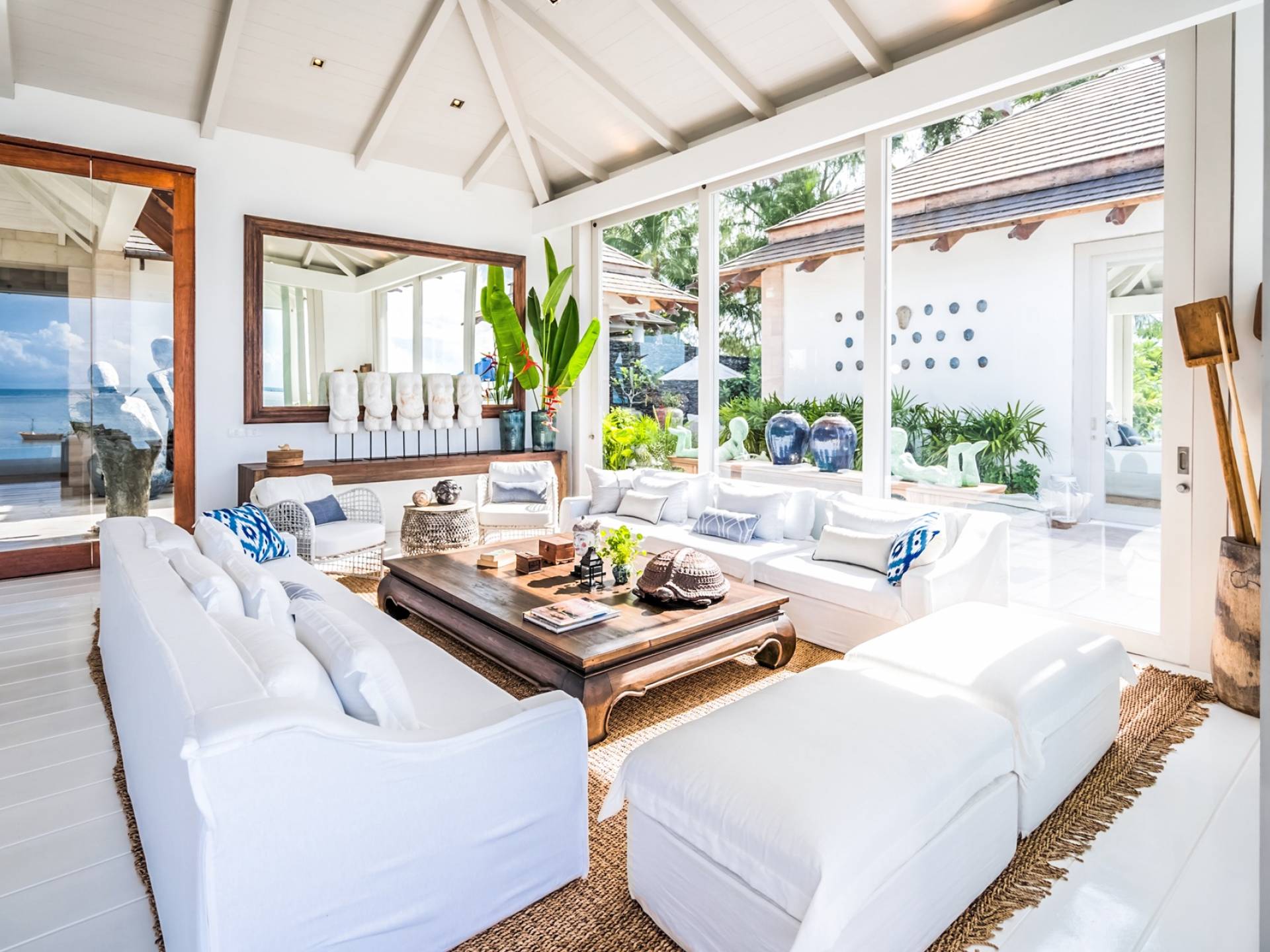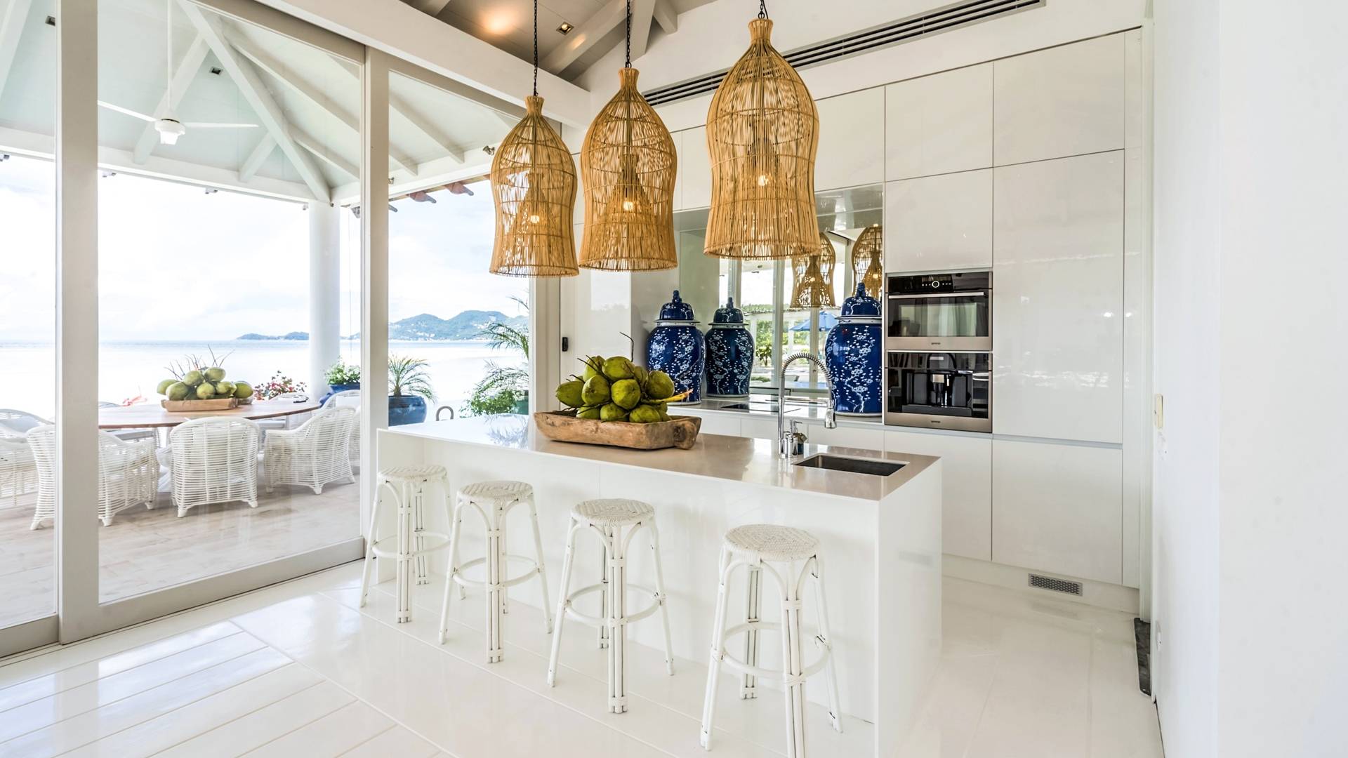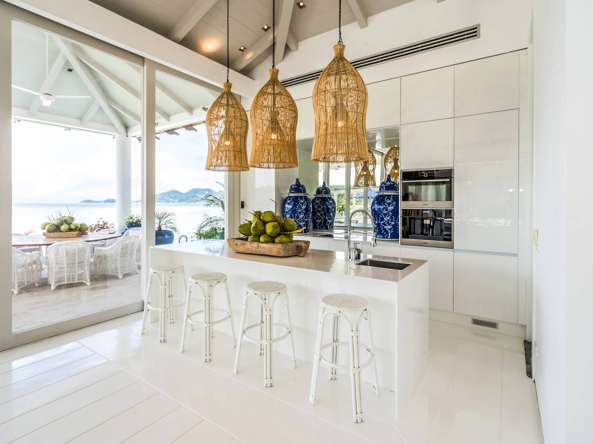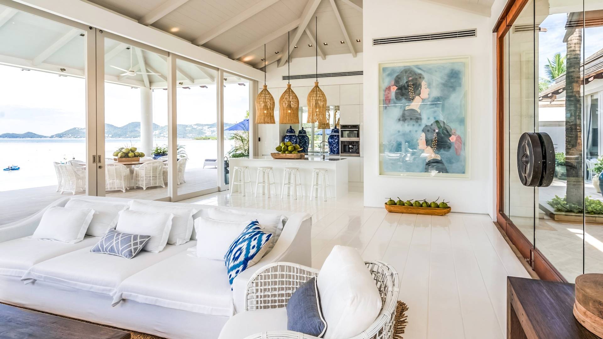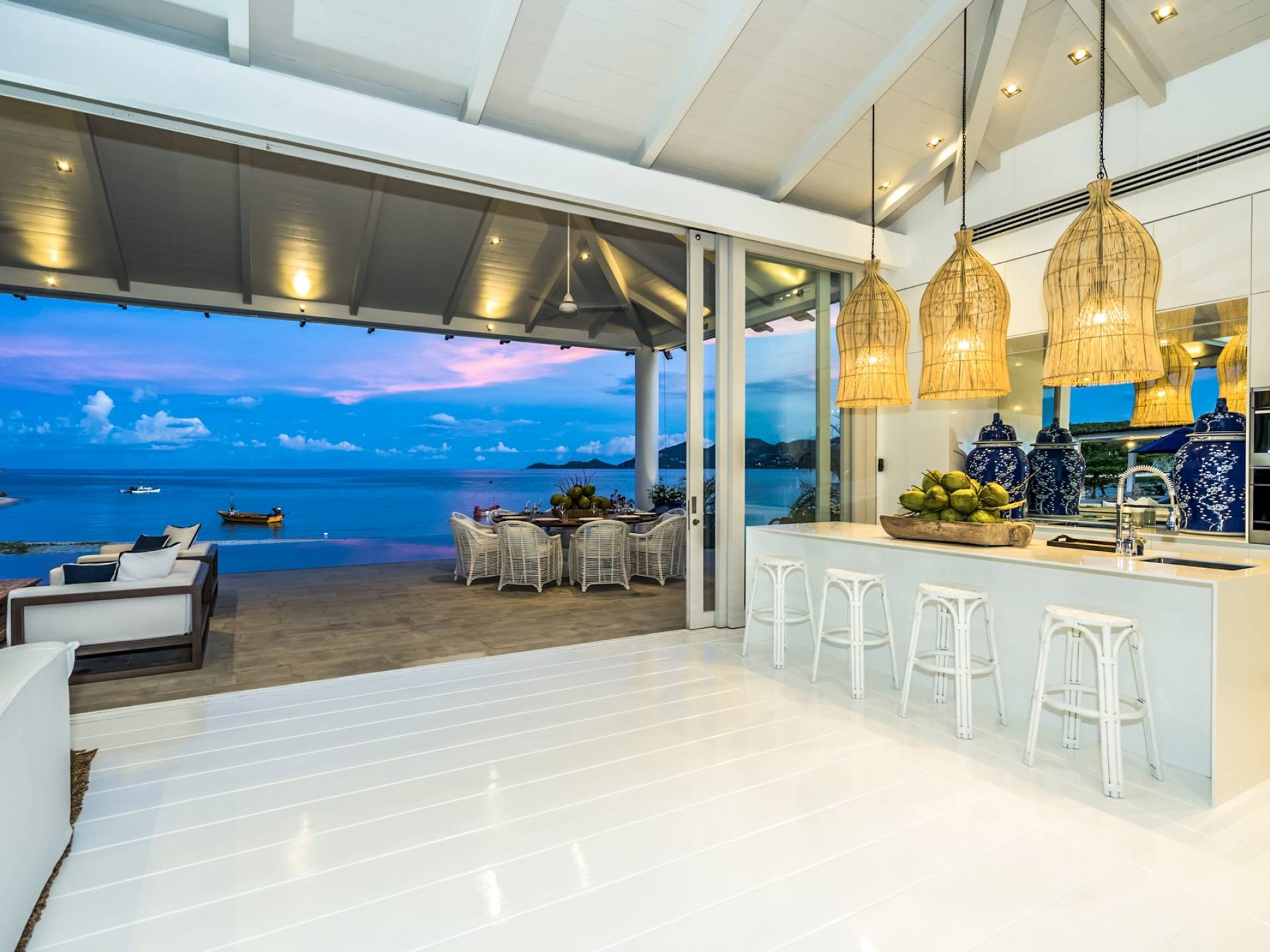 L'ampia zona giorno a pianta aperta è dominata da comodi divani bianchi lunghi e un tavolo da pranzo per otto persone. Le sontuose proporzioni di Mia Ocean Villa includono alti soffitti a volta con travi a vista con pannelli in legno. La proprietà è coperta con scandole di cedro e tutte le camere sono dotate di pareti in vetro a scomparsa che si aprono sul giardino o sulla terrazza della piscina. La cucina completamente attrezzata è definita da un'isola galleggiante.