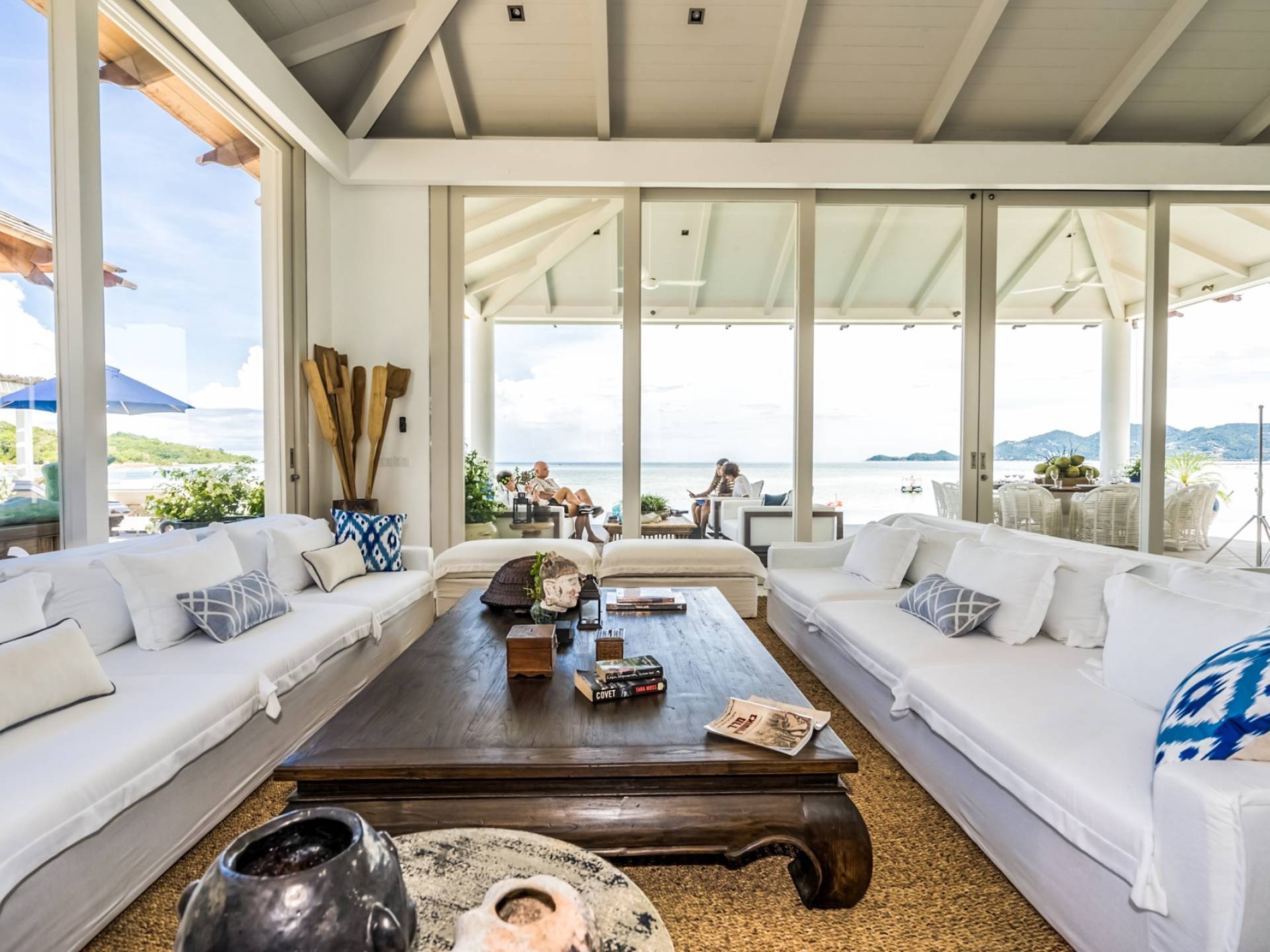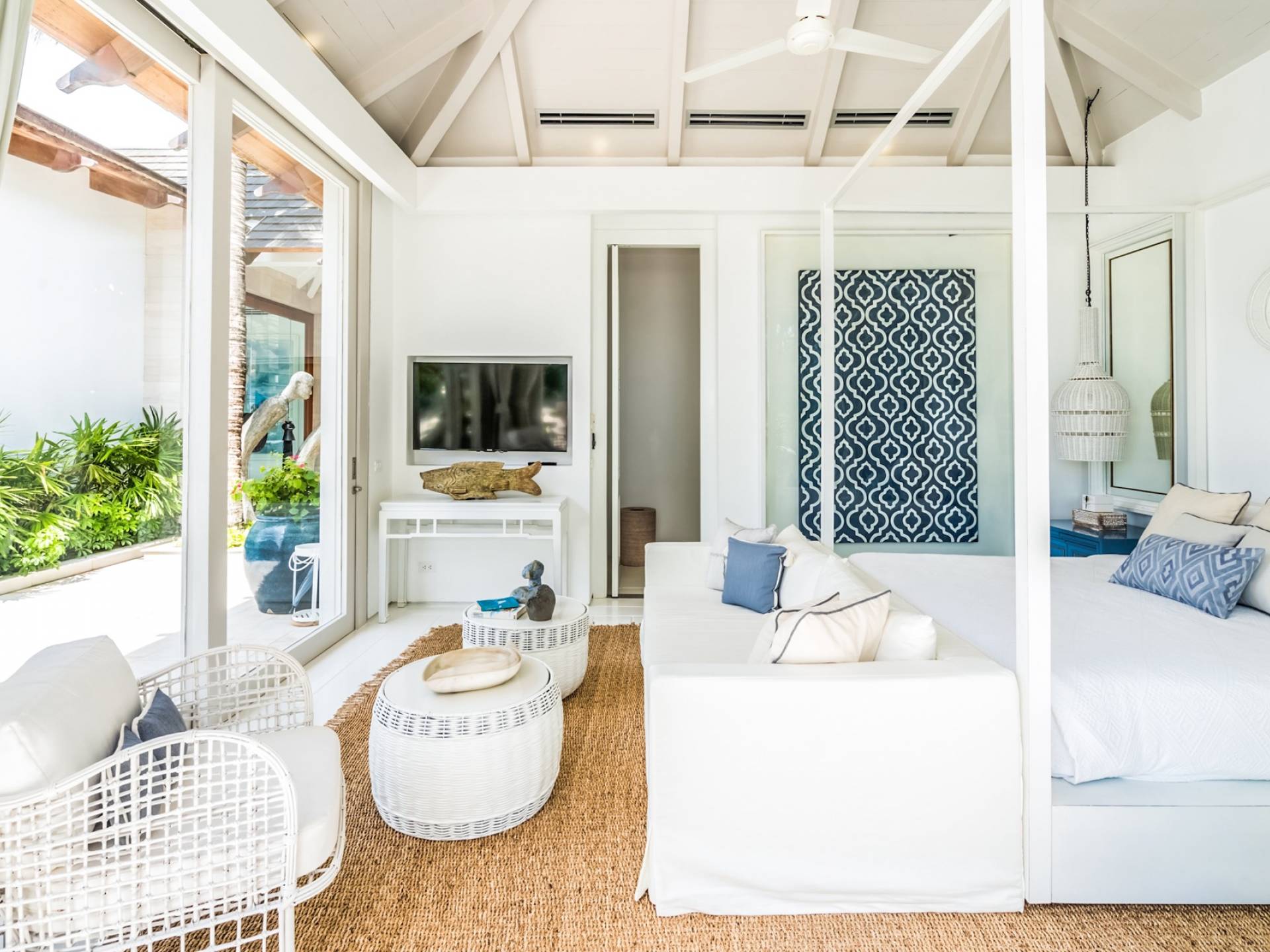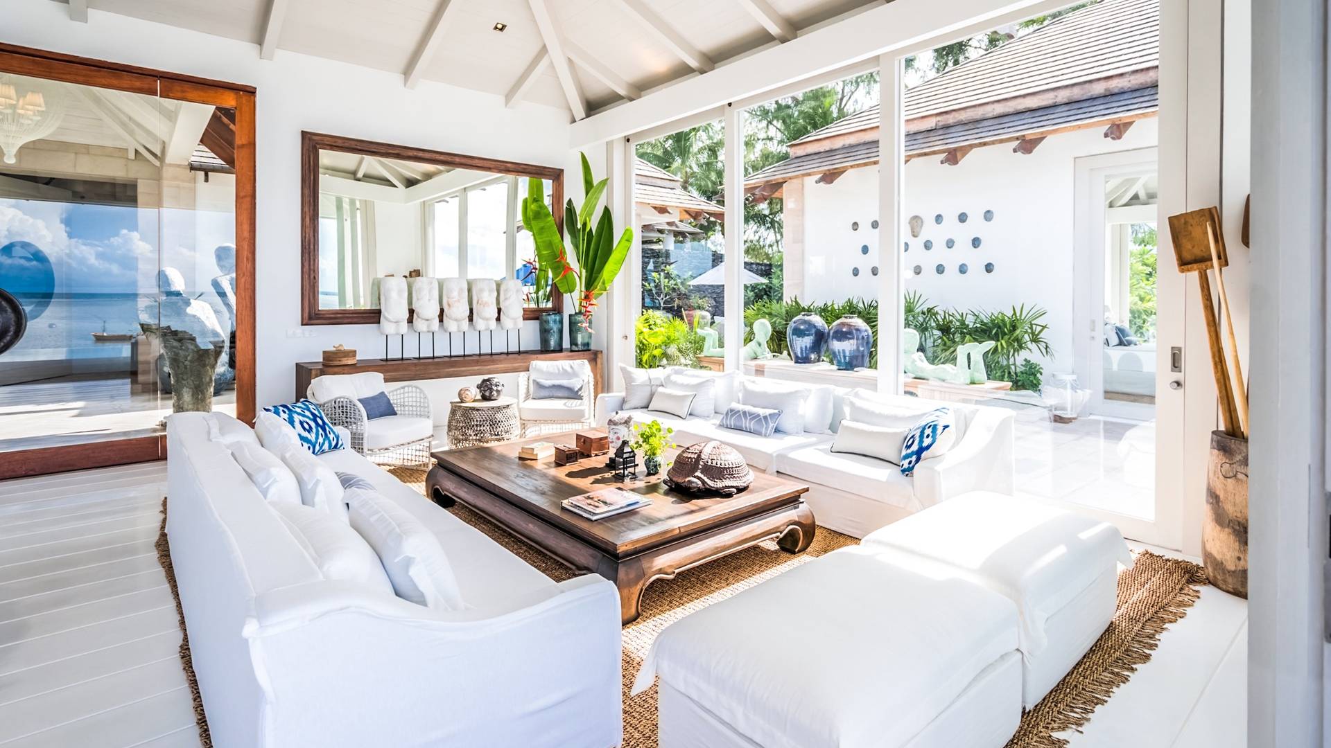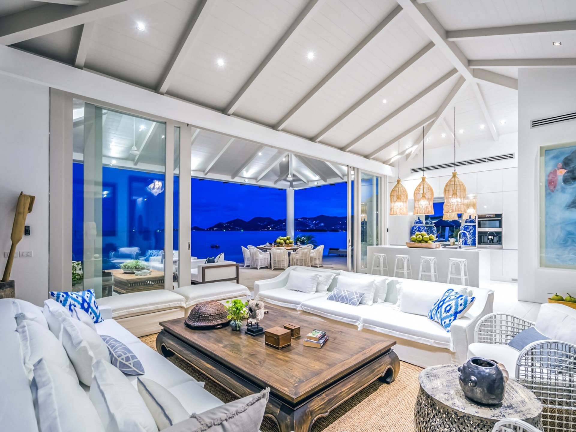 L'ampia zona giorno a pianta aperta è dominata da comodi divani bianchi lunghi e un tavolo da pranzo per otto persone. Le sontuose proporzioni di Mia Ocean Villa includono alti soffitti a volta con travi a vista con pannelli in legno. La proprietà è coperta con scandole di cedro e tutte le camere sono dotate di pareti in vetro a scomparsa che si aprono sul giardino o sulla terrazza della piscina. La cucina completamente attrezzata è definita da un'isola galleggiante.