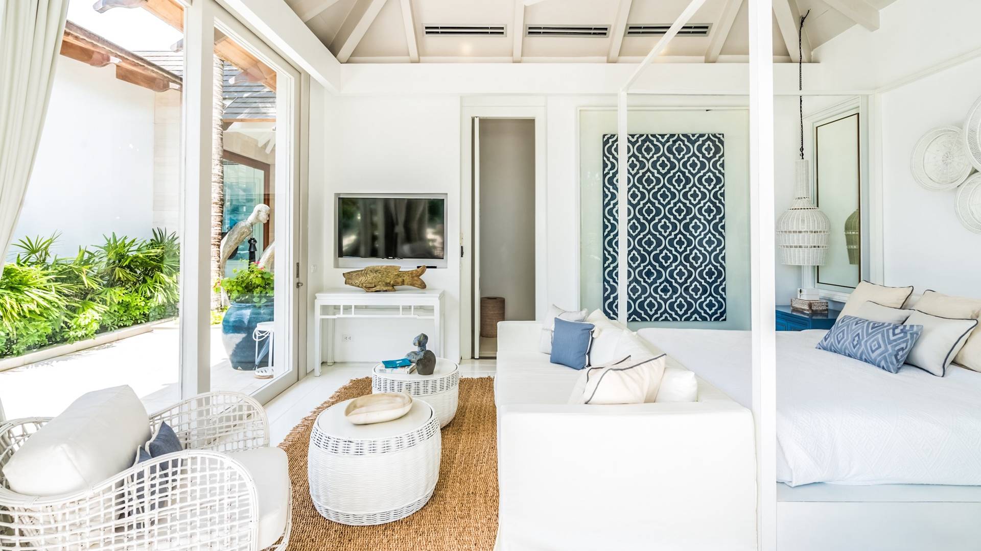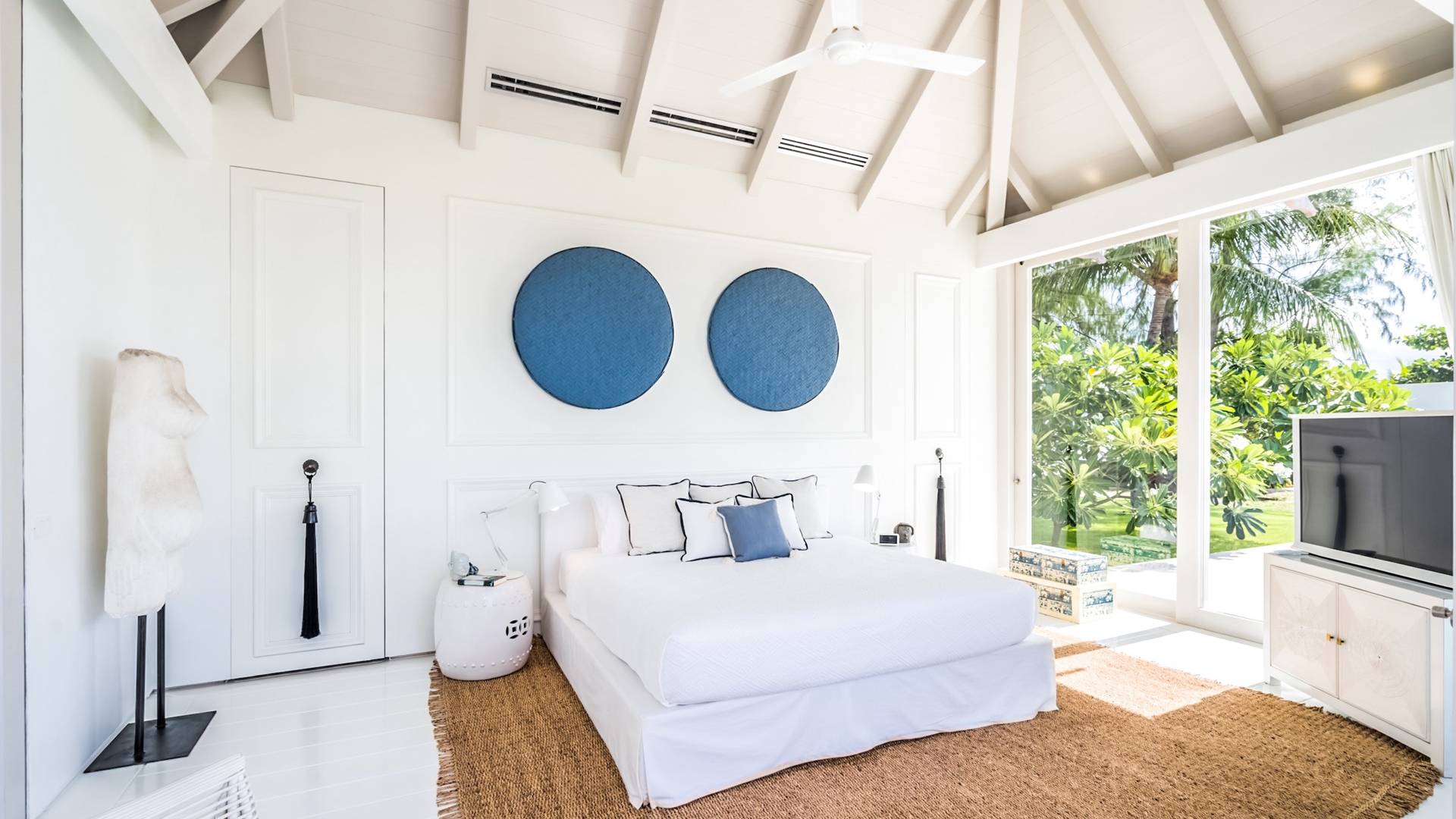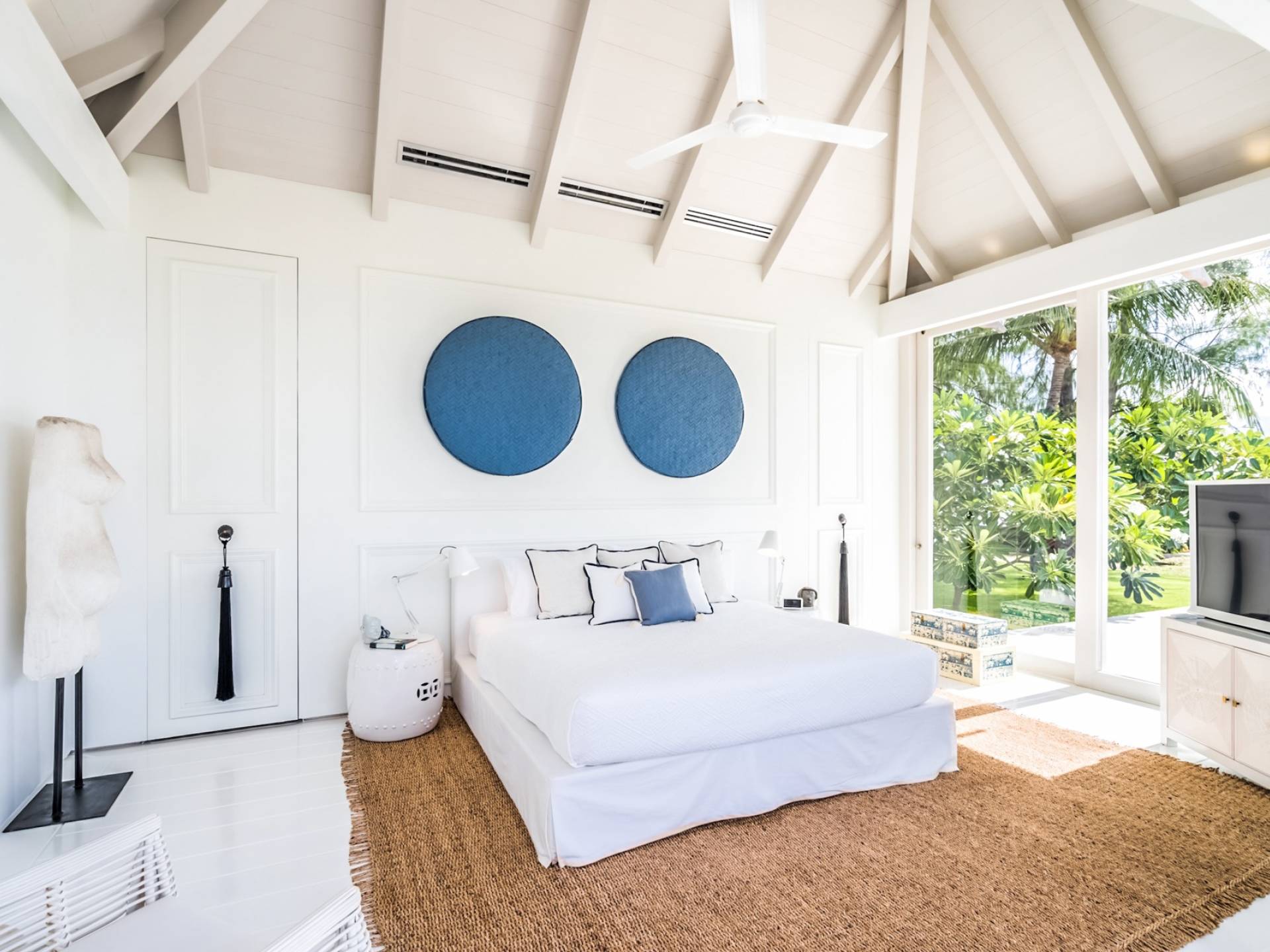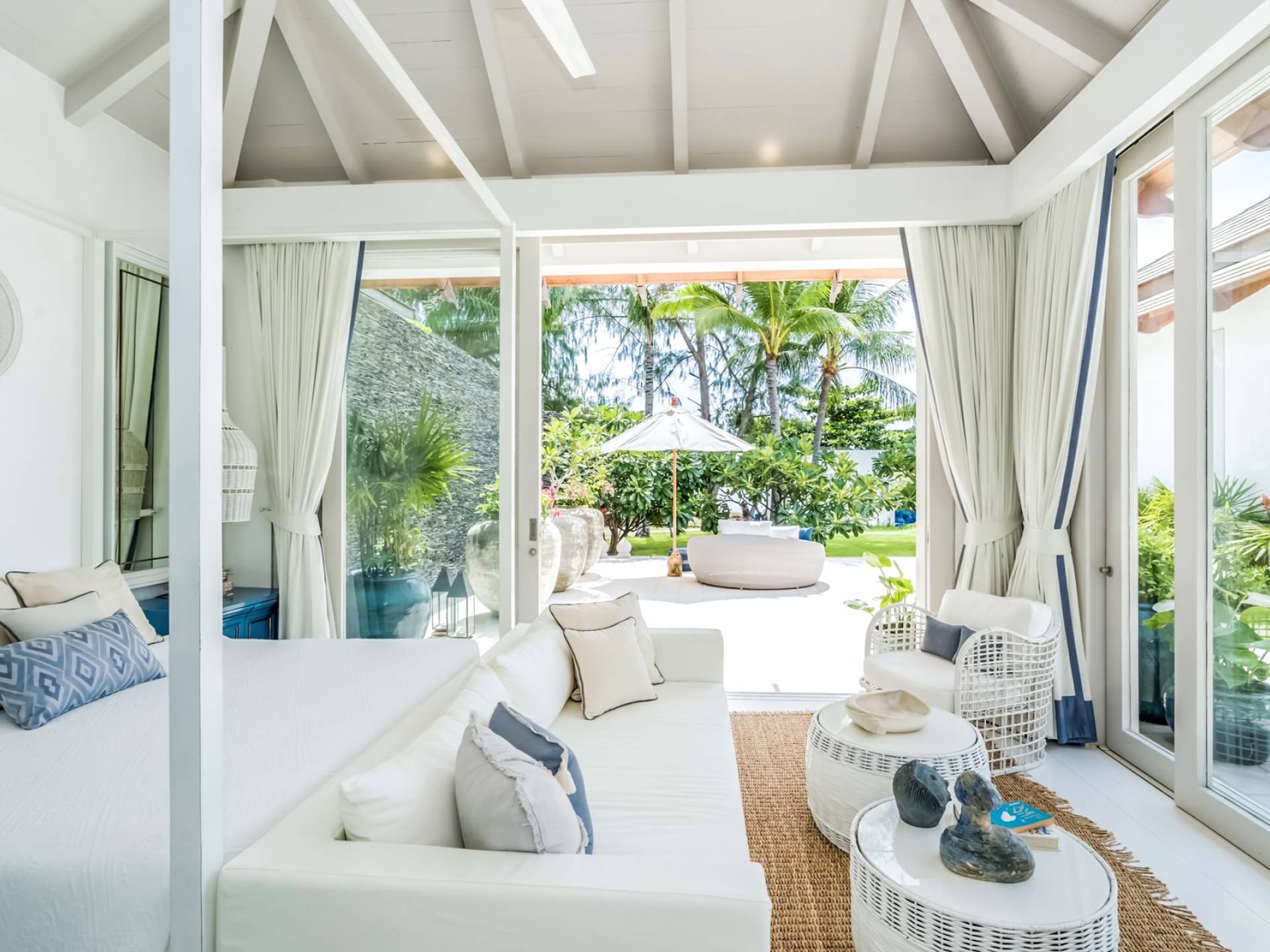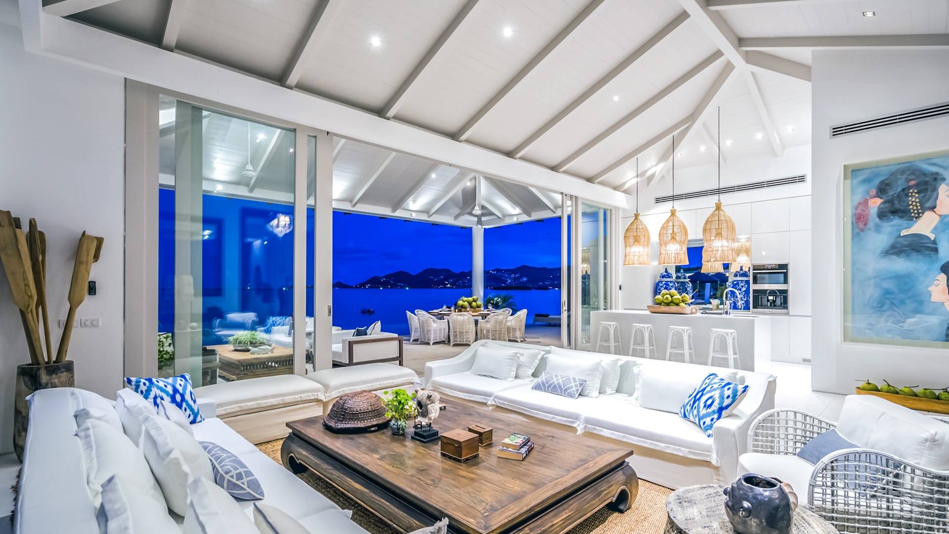 L'ampia zona giorno a pianta aperta è dominata da comodi divani bianchi lunghi e un tavolo da pranzo per otto persone. Le sontuose proporzioni di Mia Ocean Villa includono alti soffitti a volta con travi a vista con pannelli in legno. La proprietà è coperta con scandole di cedro e tutte le camere sono dotate di pareti in vetro a scomparsa che si aprono sul giardino o sulla terrazza della piscina. La cucina completamente attrezzata è definita da un'isola galleggiante.