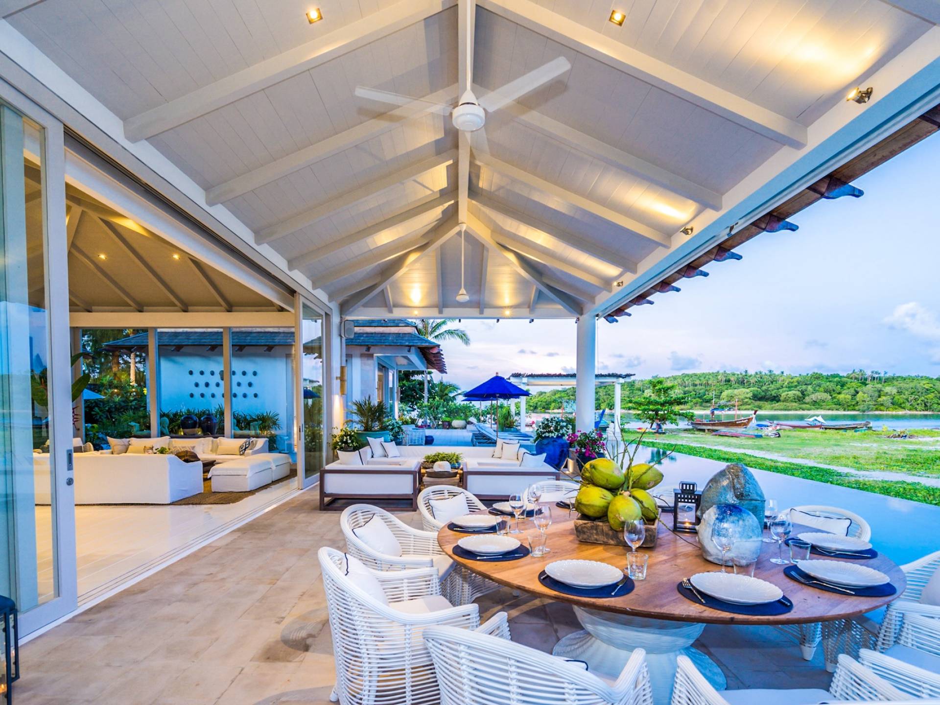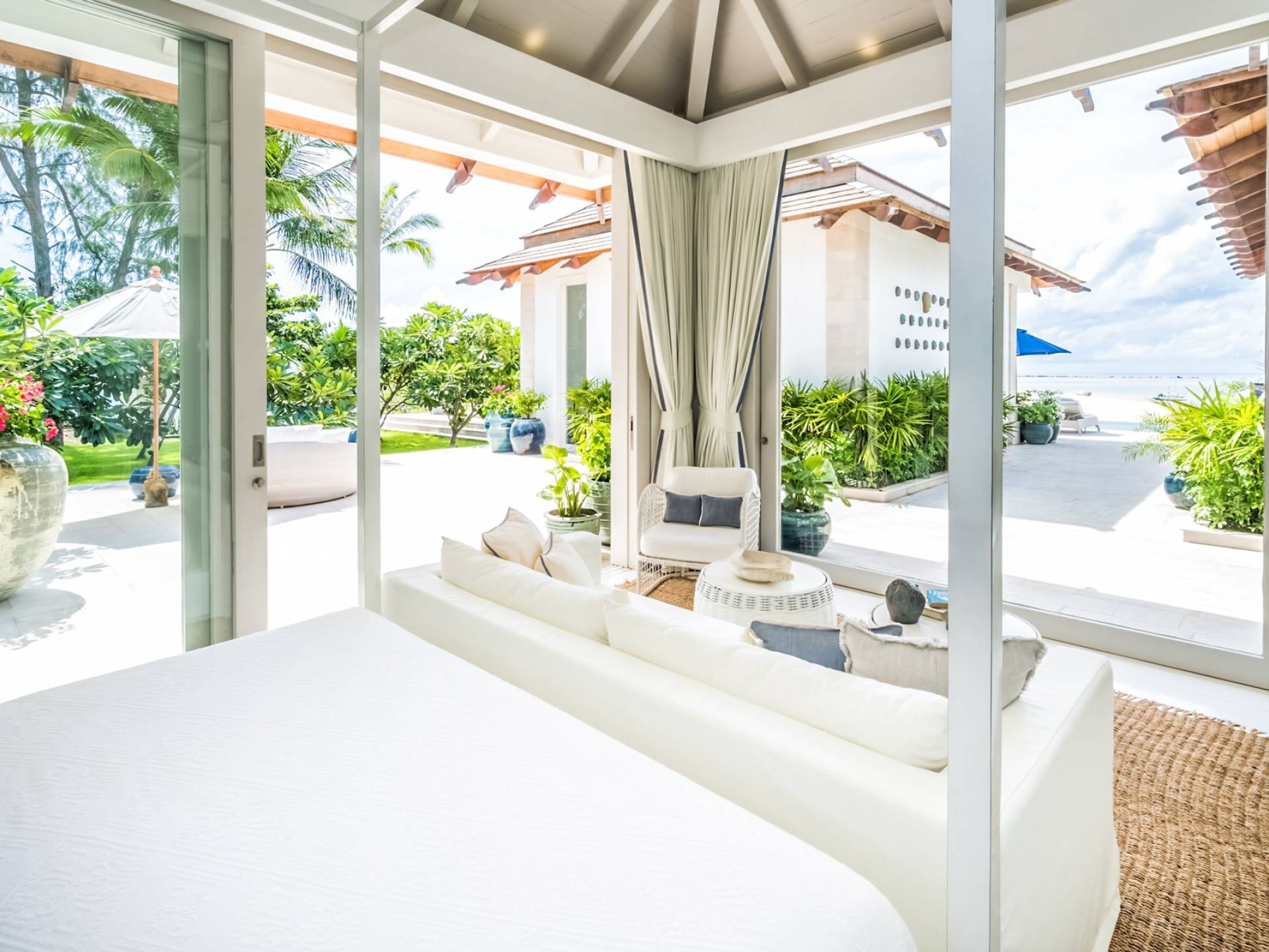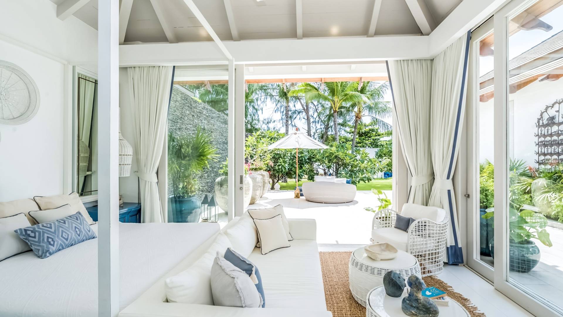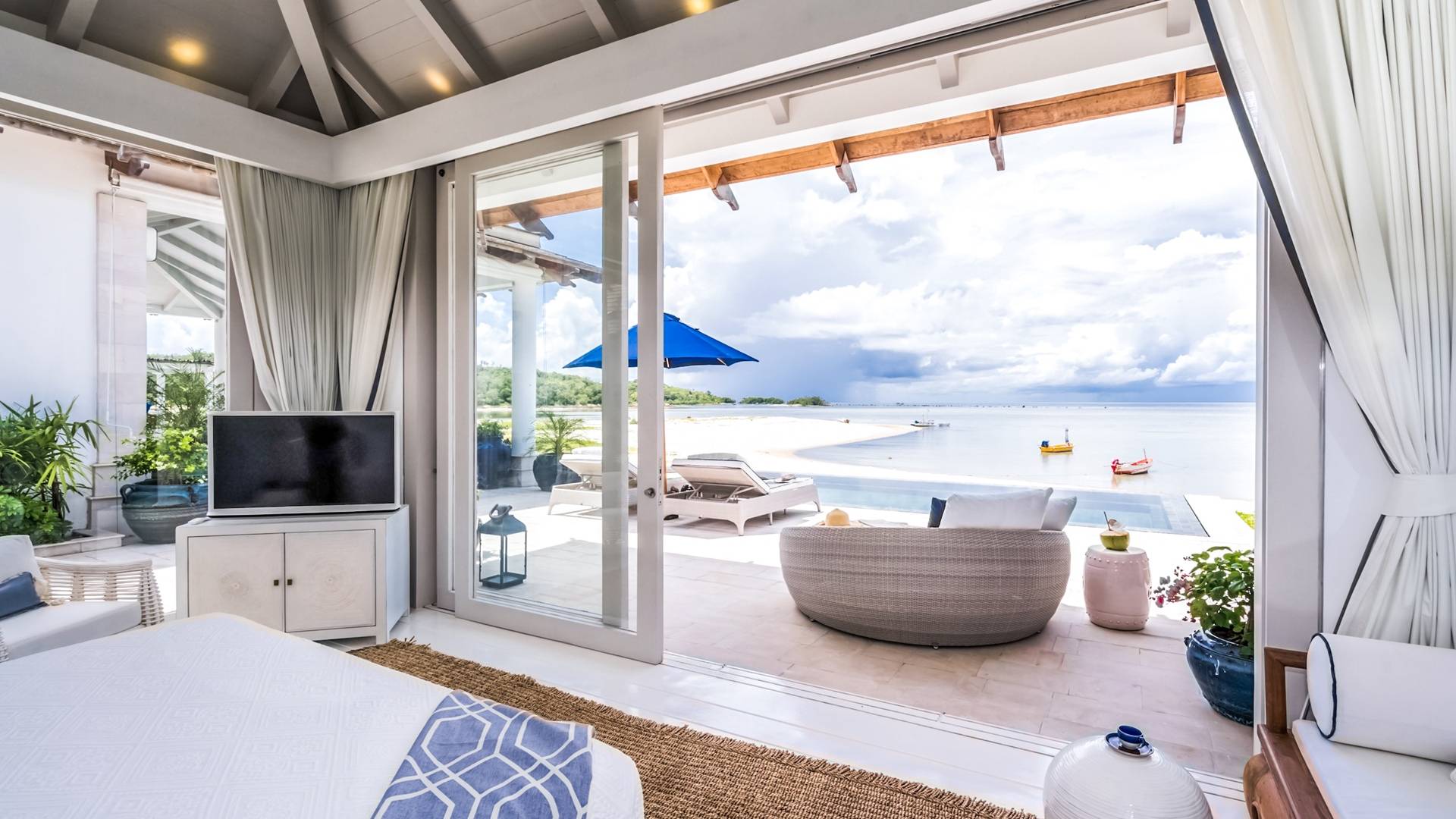L'ampia zona giorno a pianta aperta è dominata da comodi divani bianchi lunghi e un tavolo da pranzo per otto persone. Le sontuose proporzioni di Mia Ocean Villa includono alti soffitti a volta con travi a vista con pannelli in legno. La proprietà è coperta con scandole di cedro e tutte le camere sono dotate di pareti in vetro a scomparsa che si aprono sul giardino o sulla terrazza della piscina. La cucina completamente attrezzata è definita da un'isola galleggiante.