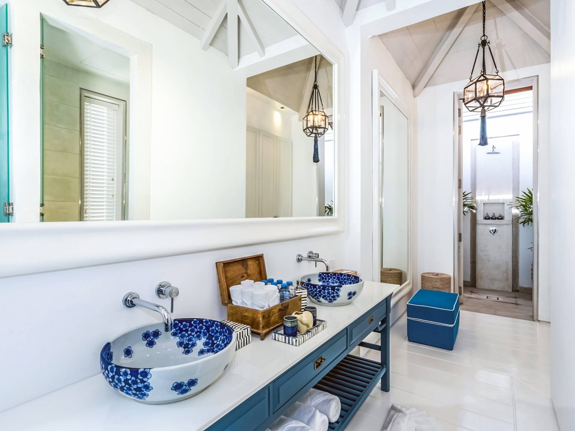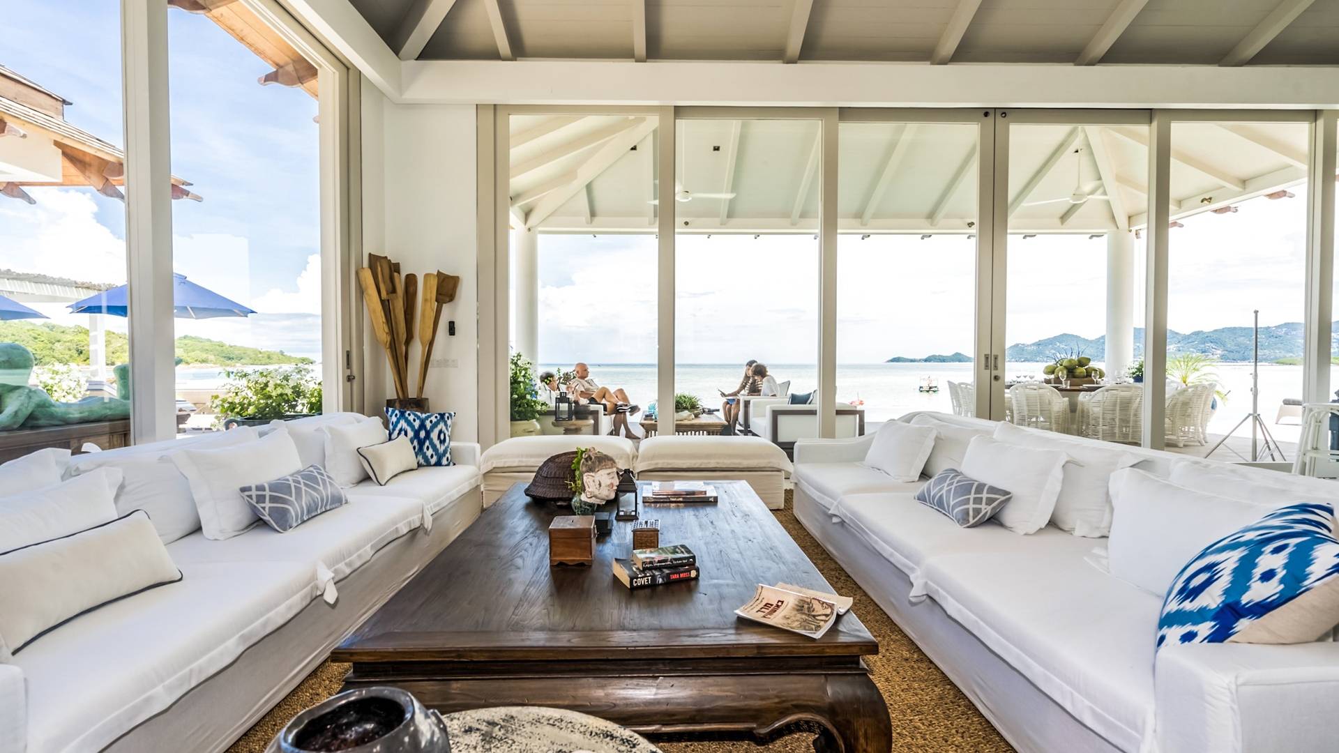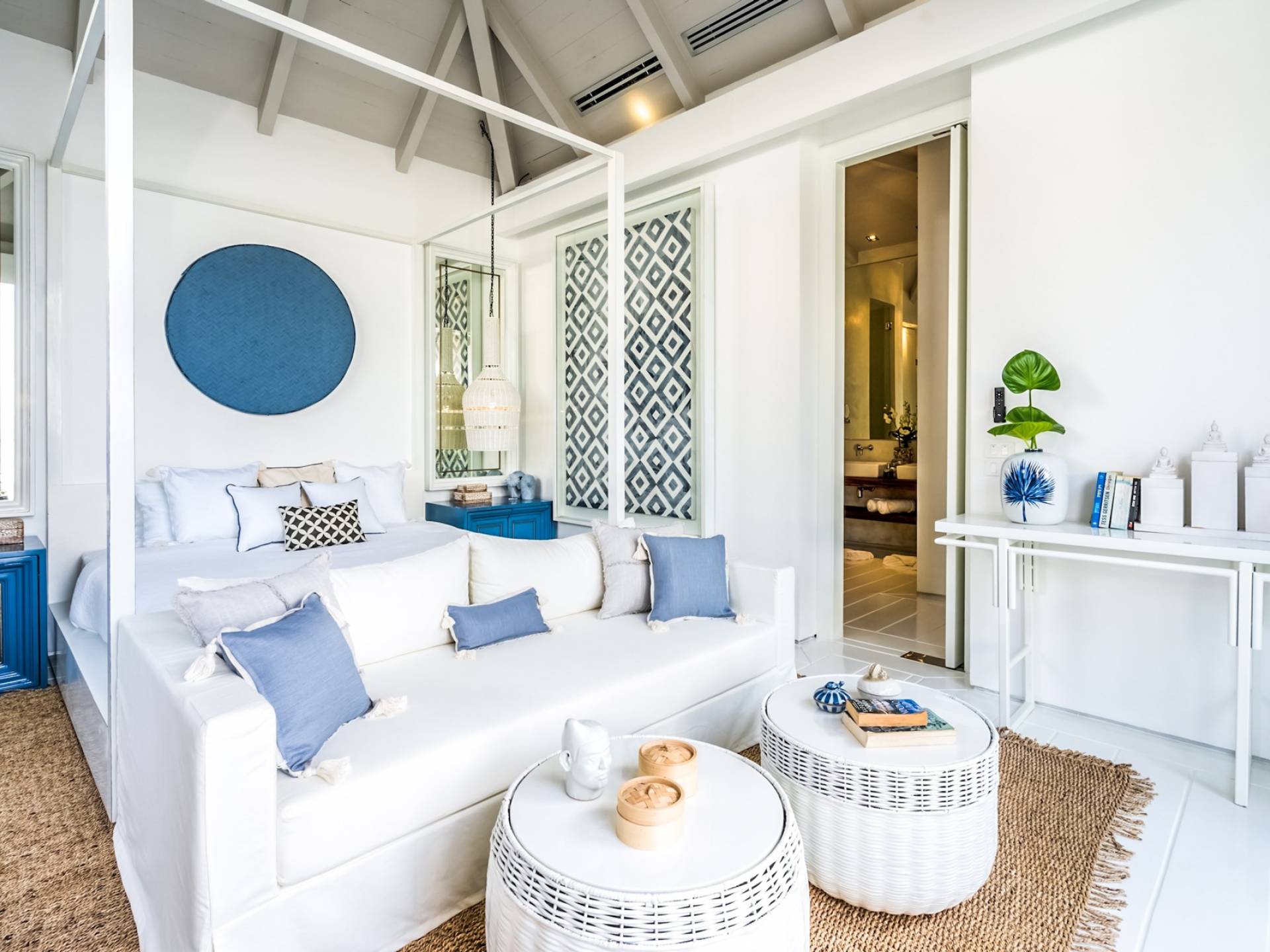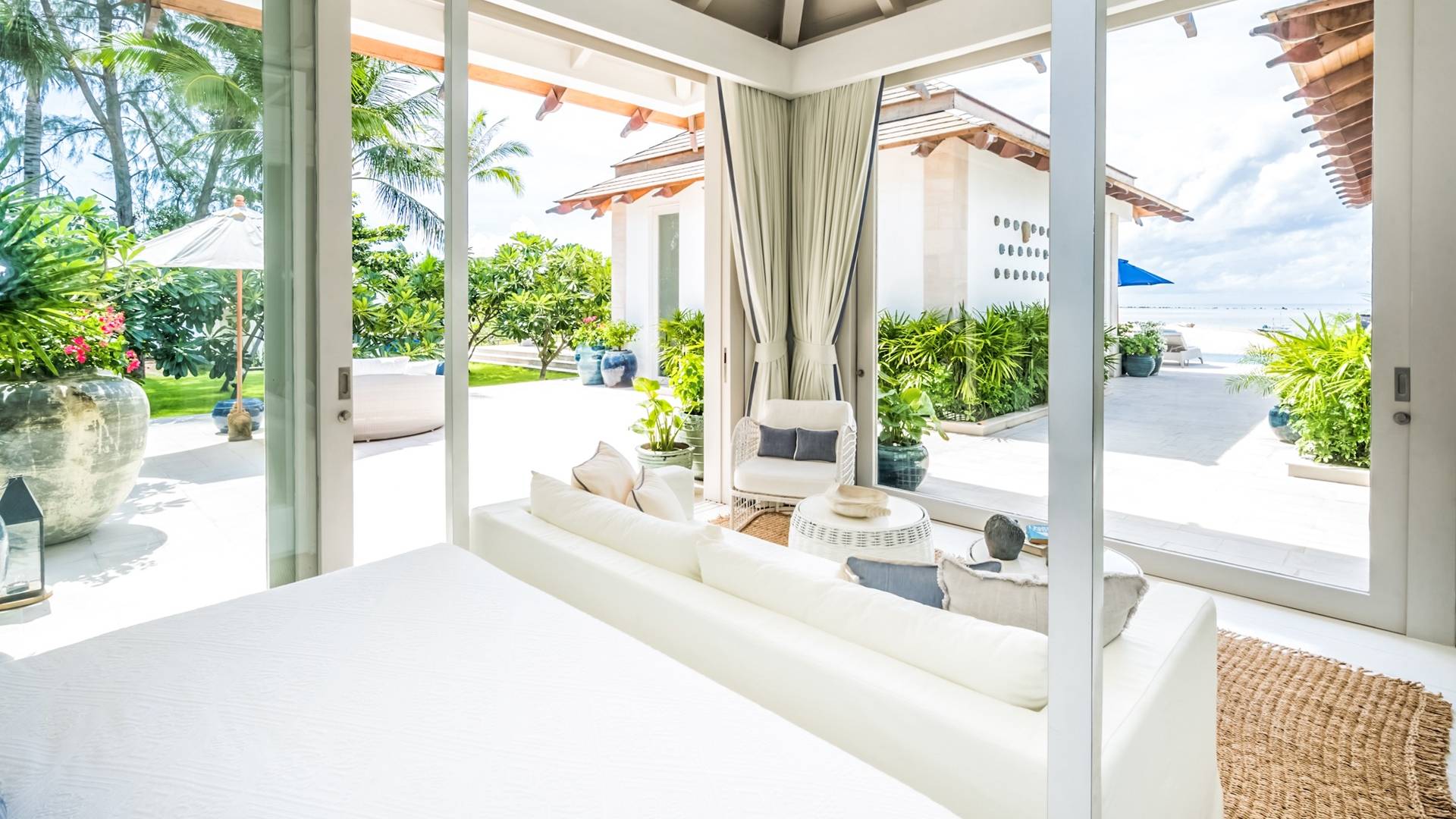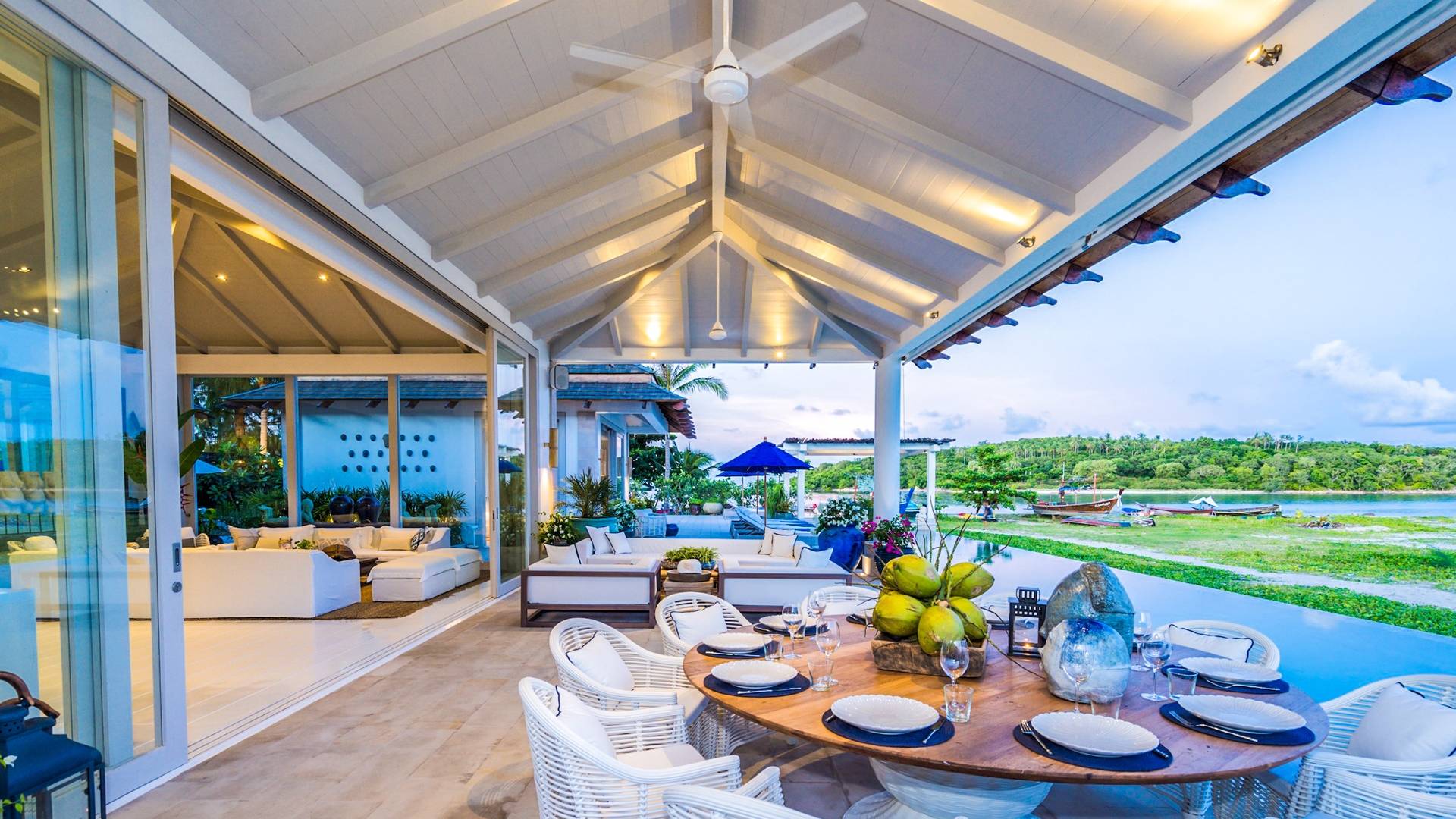 L'ampia zona giorno a pianta aperta è dominata da comodi divani bianchi lunghi e un tavolo da pranzo per otto persone. Le sontuose proporzioni di Mia Ocean Villa includono alti soffitti a volta con travi a vista con pannelli in legno. La proprietà è coperta con scandole di cedro e tutte le camere sono dotate di pareti in vetro a scomparsa che si aprono sul giardino o sulla terrazza della piscina. La cucina completamente attrezzata è definita da un'isola galleggiante.
