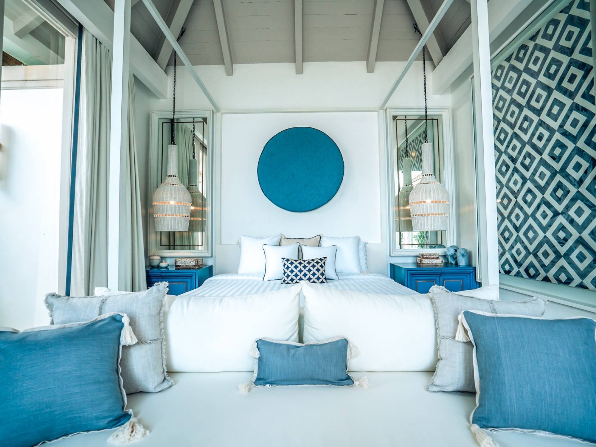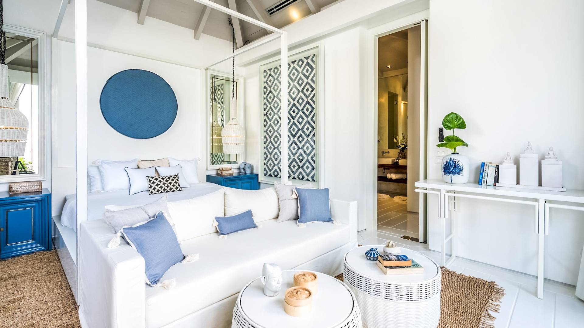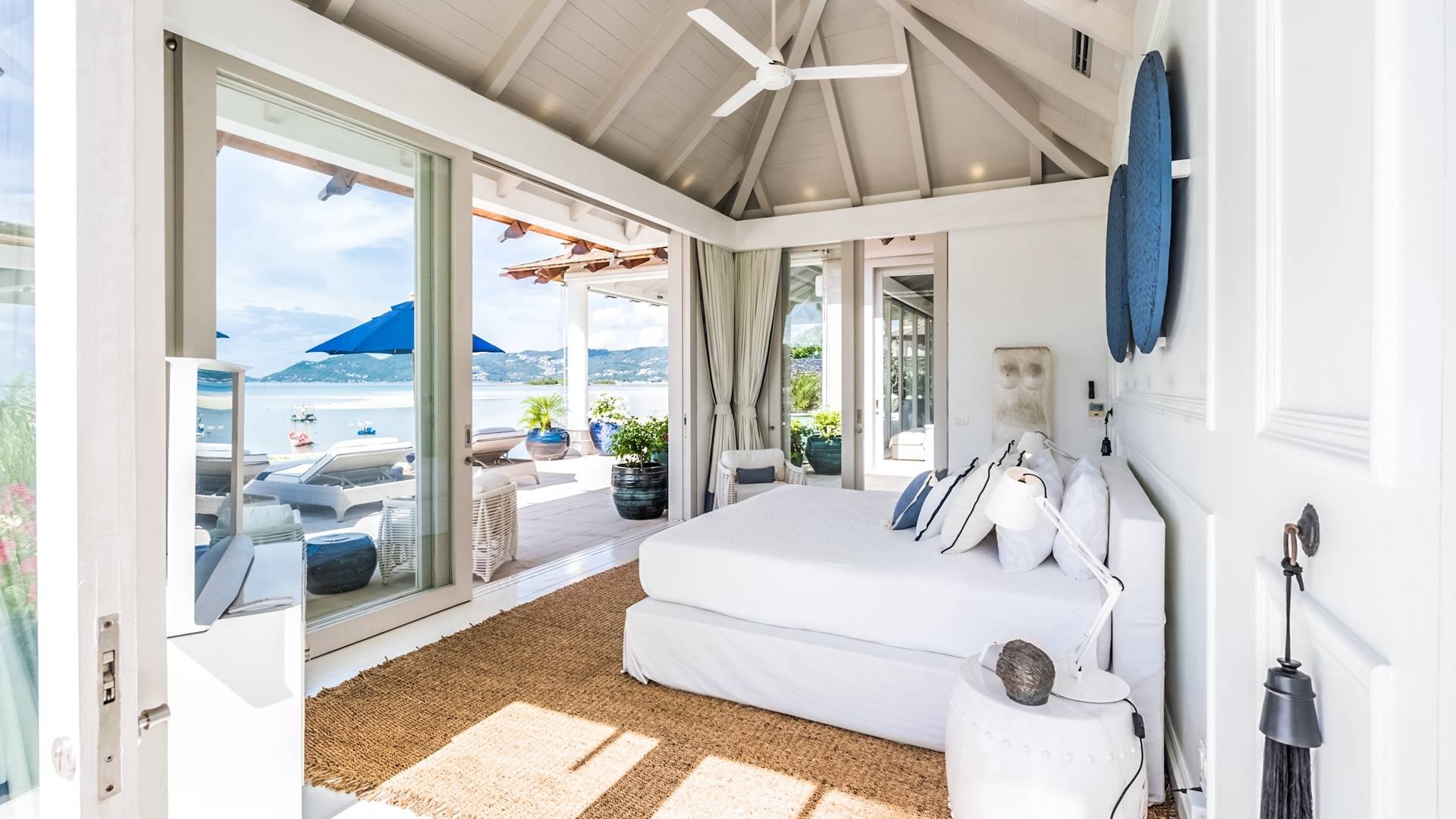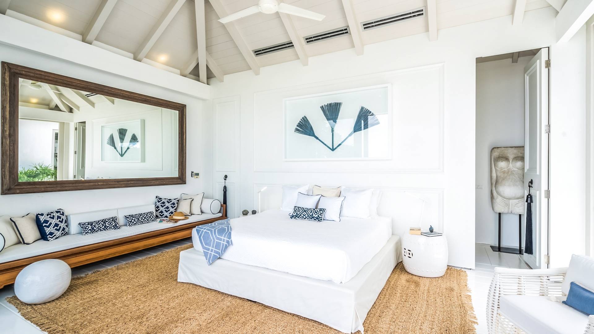 L'ampia zona giorno a pianta aperta è dominata da comodi divani bianchi lunghi e un tavolo da pranzo per otto persone. Le sontuose proporzioni di Mia Ocean Villa includono alti soffitti a volta con travi a vista con pannelli in legno. La proprietà è coperta con scandole di cedro e tutte le camere sono dotate di pareti in vetro a scomparsa che si aprono sul giardino o sulla terrazza della piscina. La cucina completamente attrezzata è definita da un'isola galleggiante.