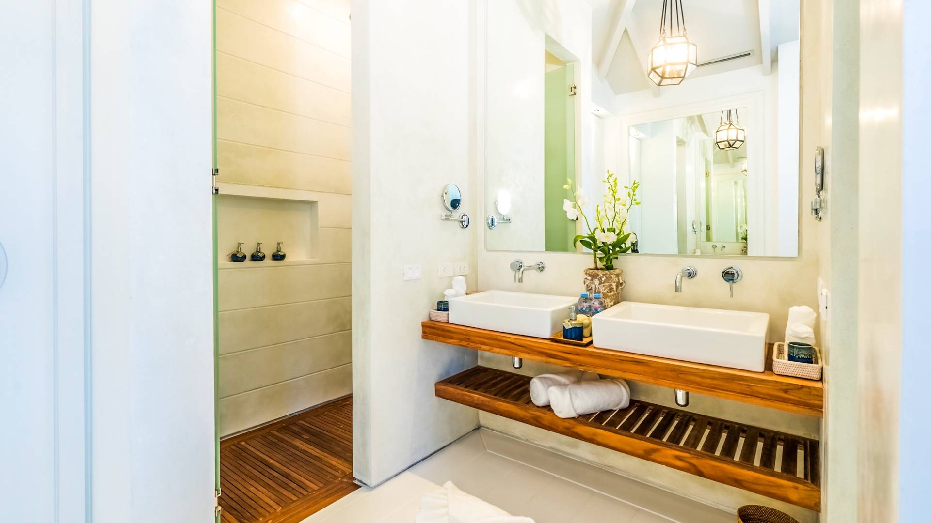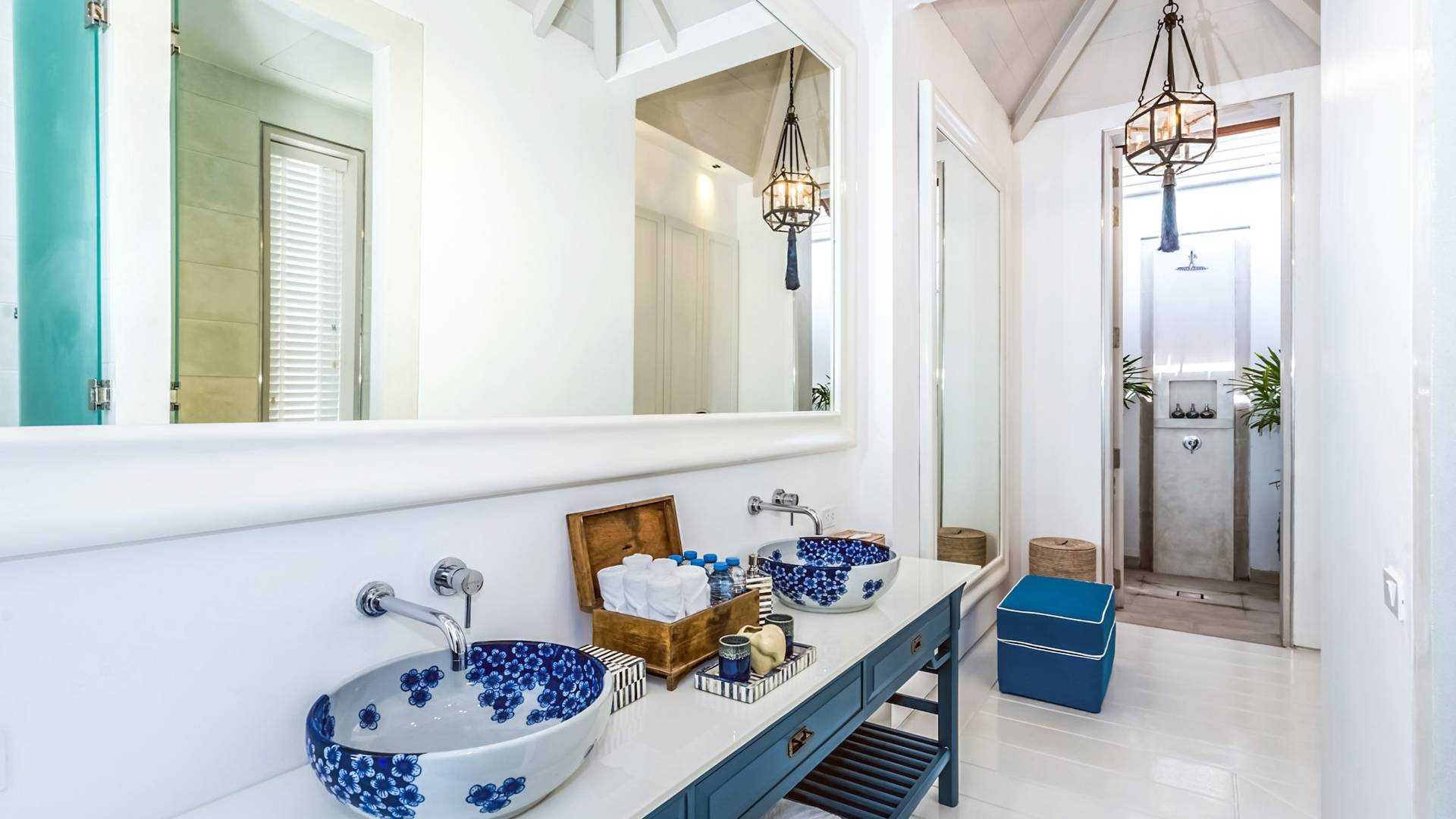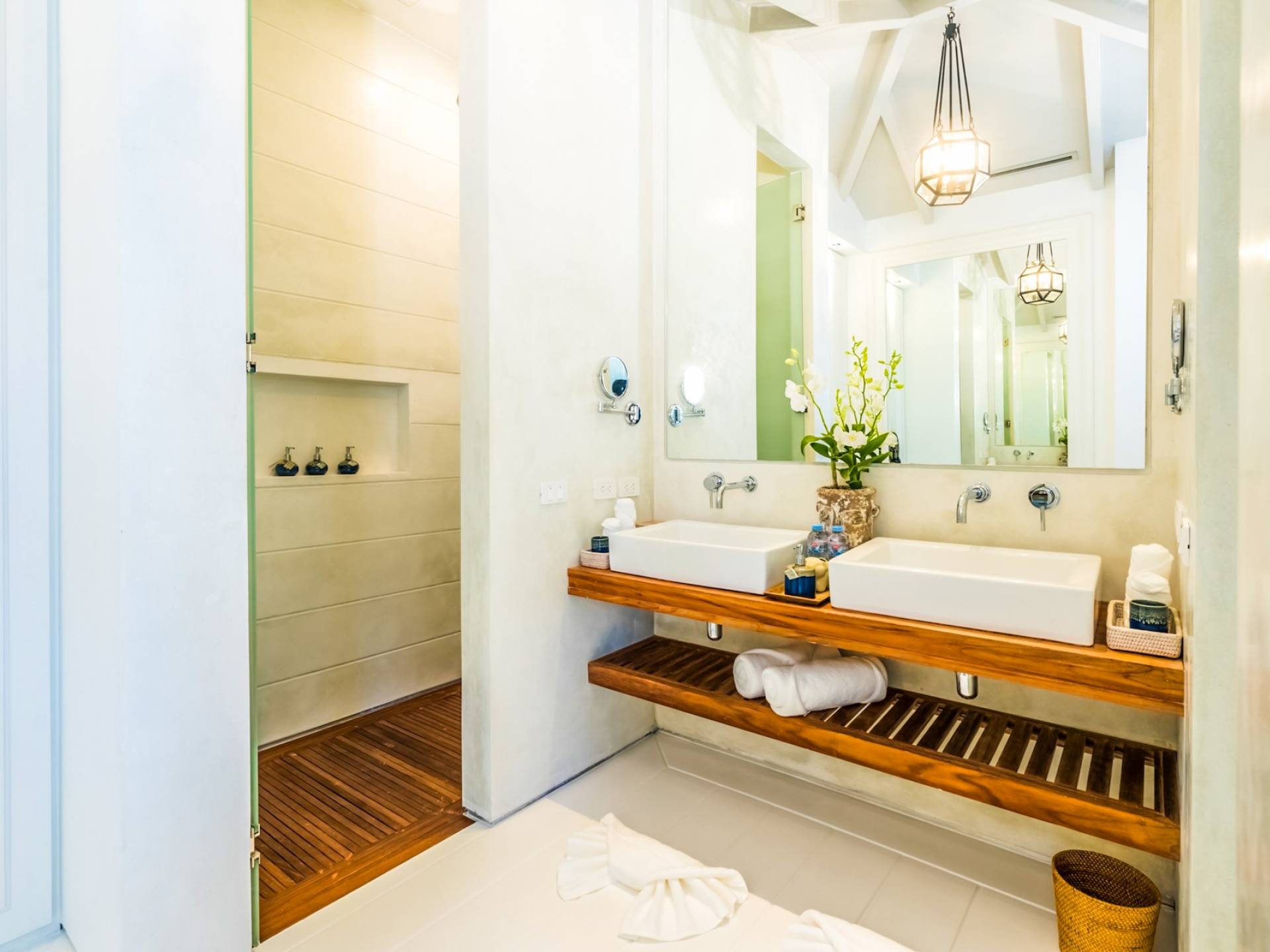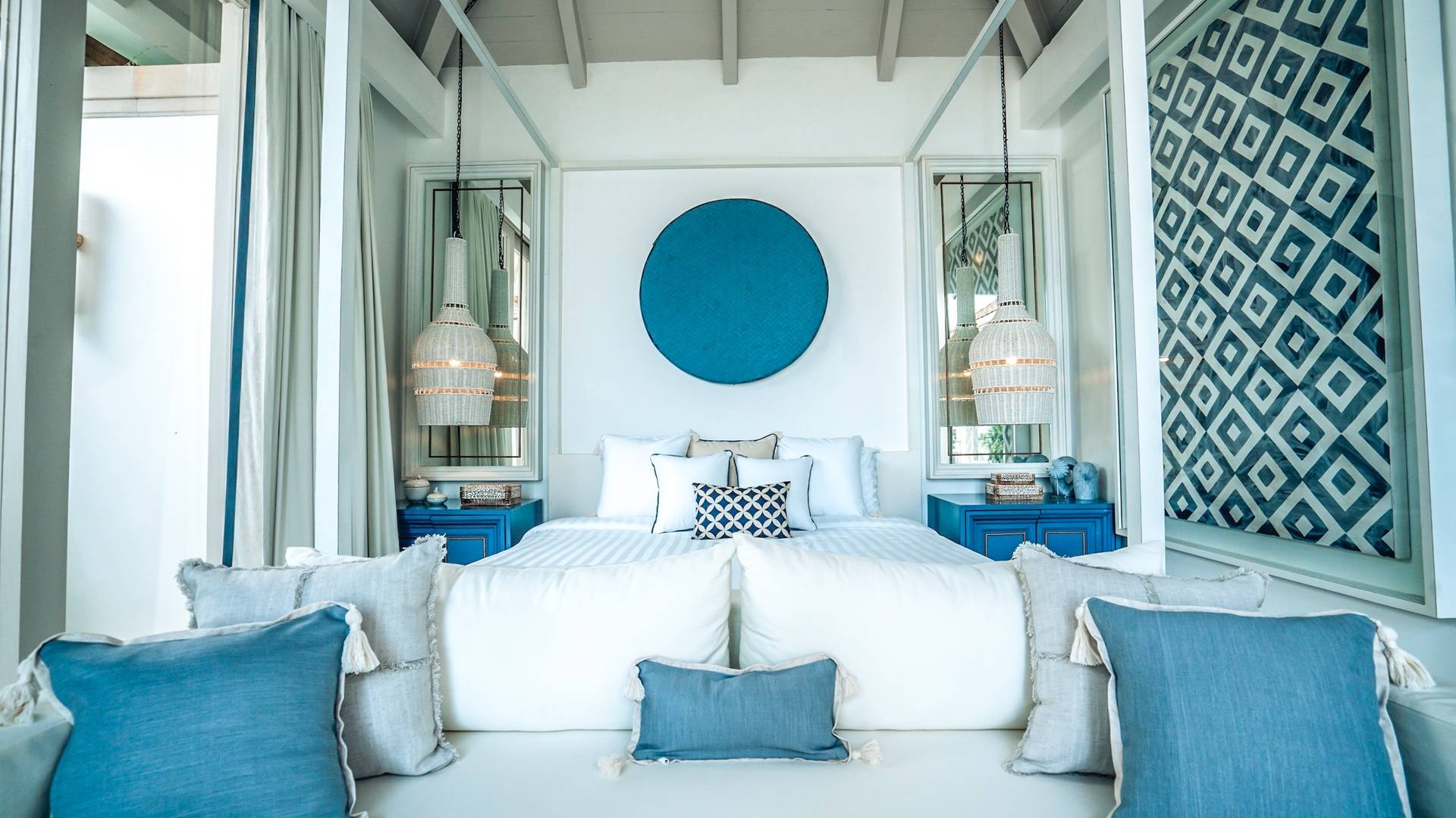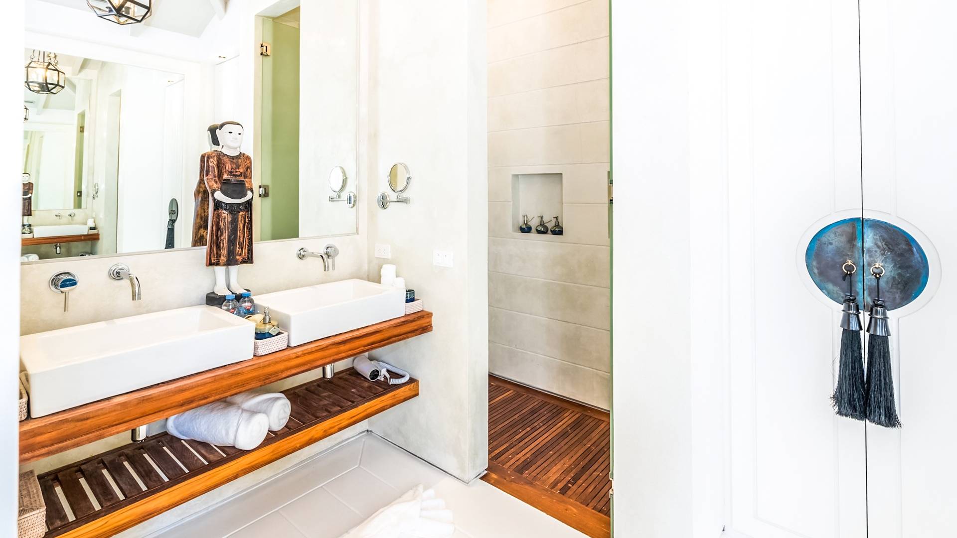 L'ampia zona giorno a pianta aperta è dominata da comodi divani bianchi lunghi e un tavolo da pranzo per otto persone. Le sontuose proporzioni di Mia Ocean Villa includono alti soffitti a volta con travi a vista con pannelli in legno. La proprietà è coperta con scandole di cedro e tutte le camere sono dotate di pareti in vetro a scomparsa che si aprono sul giardino o sulla terrazza della piscina. La cucina completamente attrezzata è definita da un'isola galleggiante.