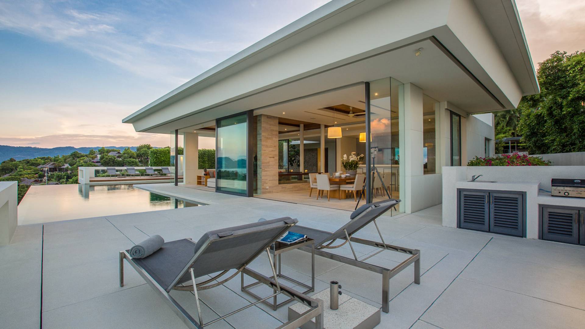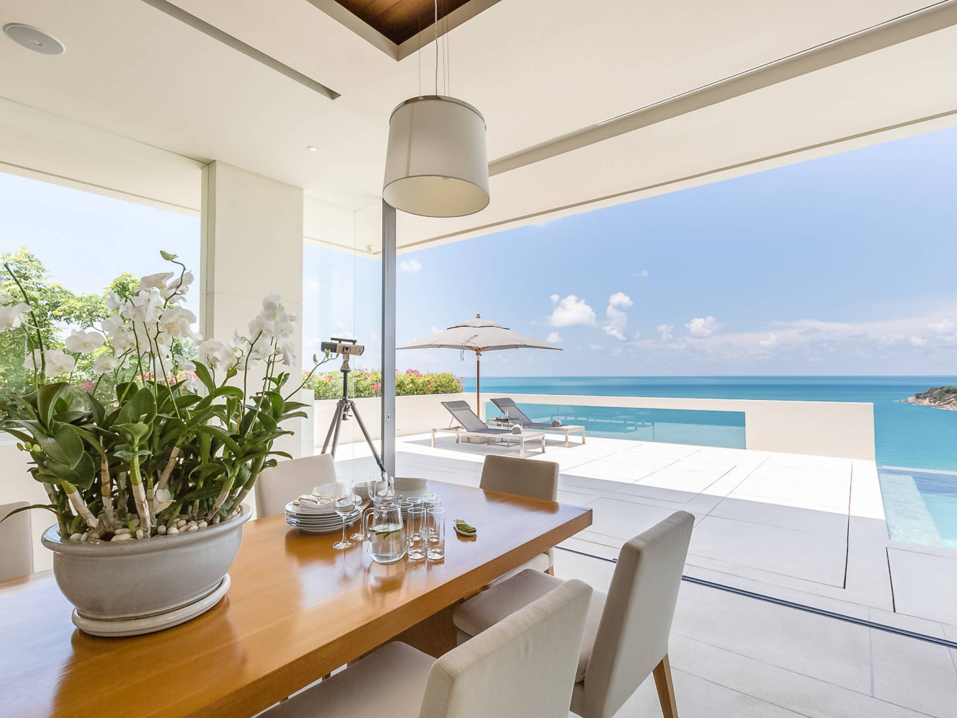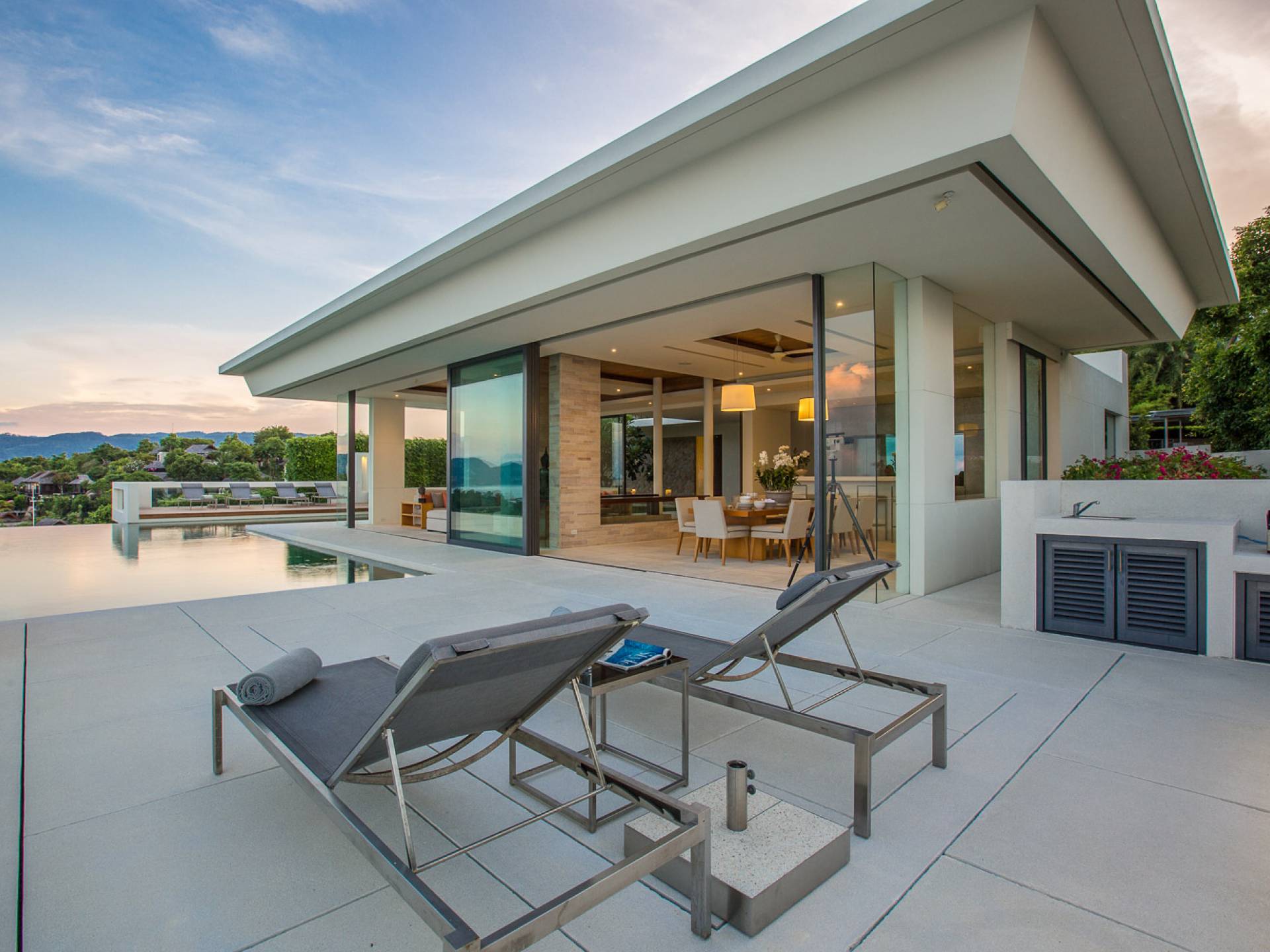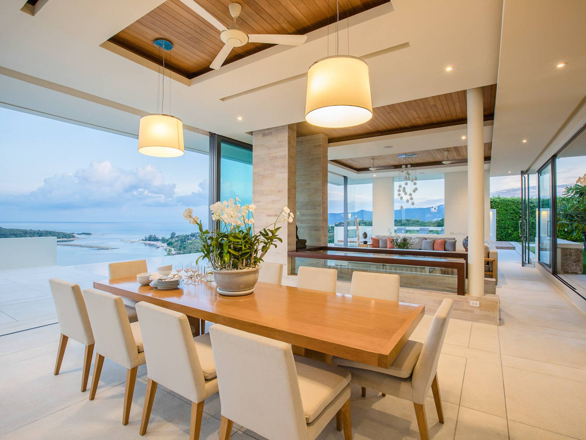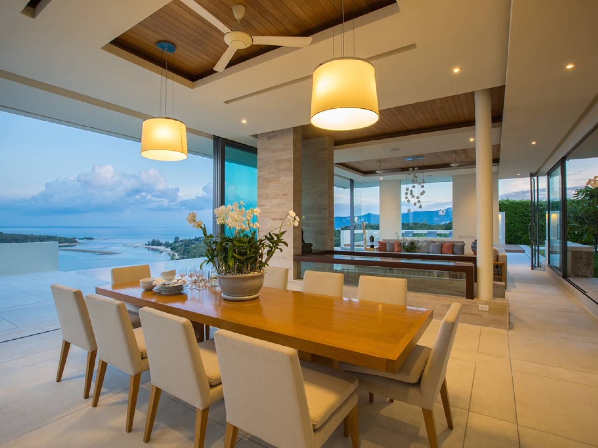 Villa Natha Samui è abilmente costruita su 3 livelli per massimizzare lo spazio utilizzabile e una vista sull'oceano superlativa. Ogni livello dispone di un proprio giardino privato ed è collegato al piano successivo da una scala interna chiusa. Un ampio salone di passaggio, una sala da pranzo con vista sul mare e una cucina a vista attrezzata sono tutti situati al piano superiore, così come una delle 2 camere da letto principali. Questa camera da letto e la zona giorno al piano superiore si aprono direttamente sull'invitante piscina a sfioro e sulla sua terrazza solarium arredata in pietra e legno, mentre la sala da pranzo si estende su una terrazza separata con un barbecue incorporato per pasti all'aperto.