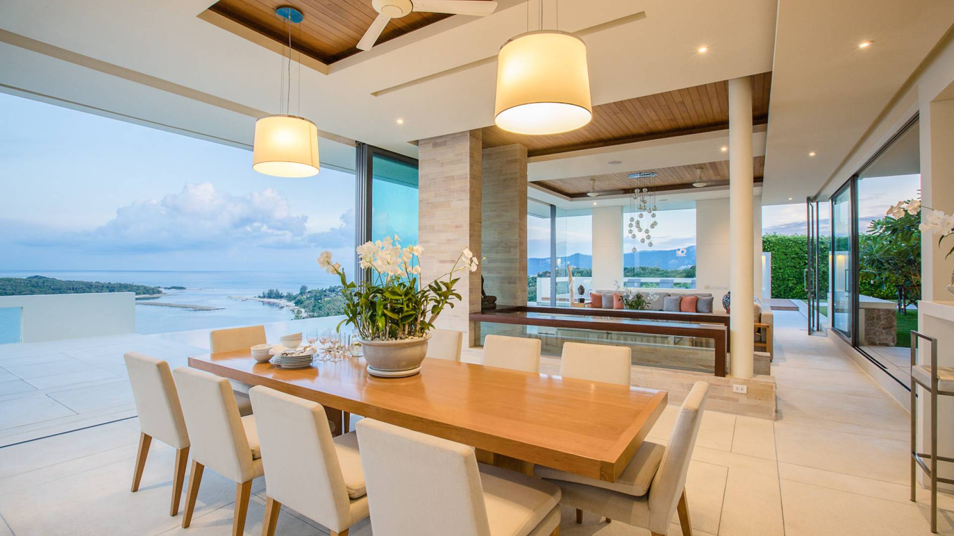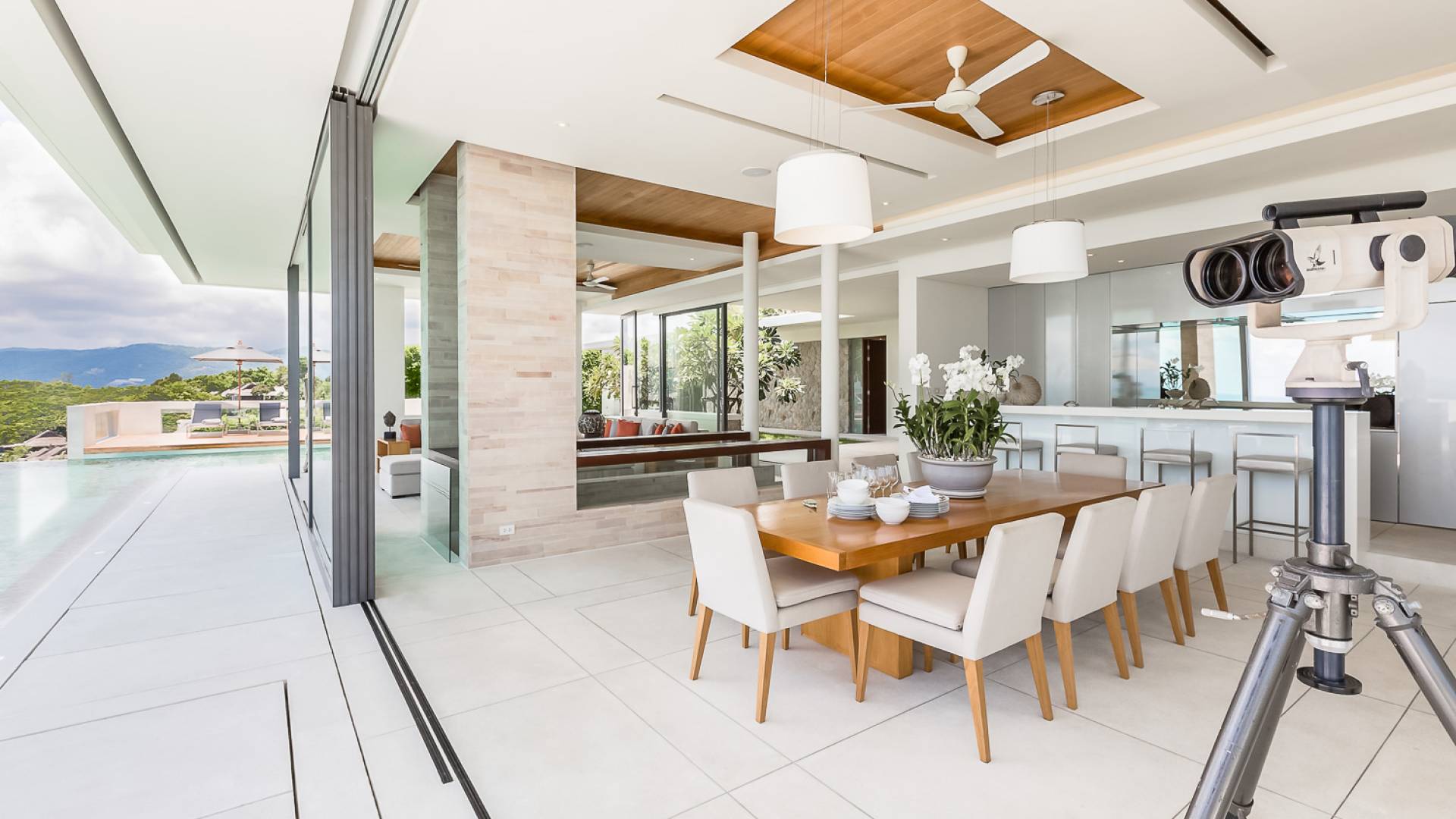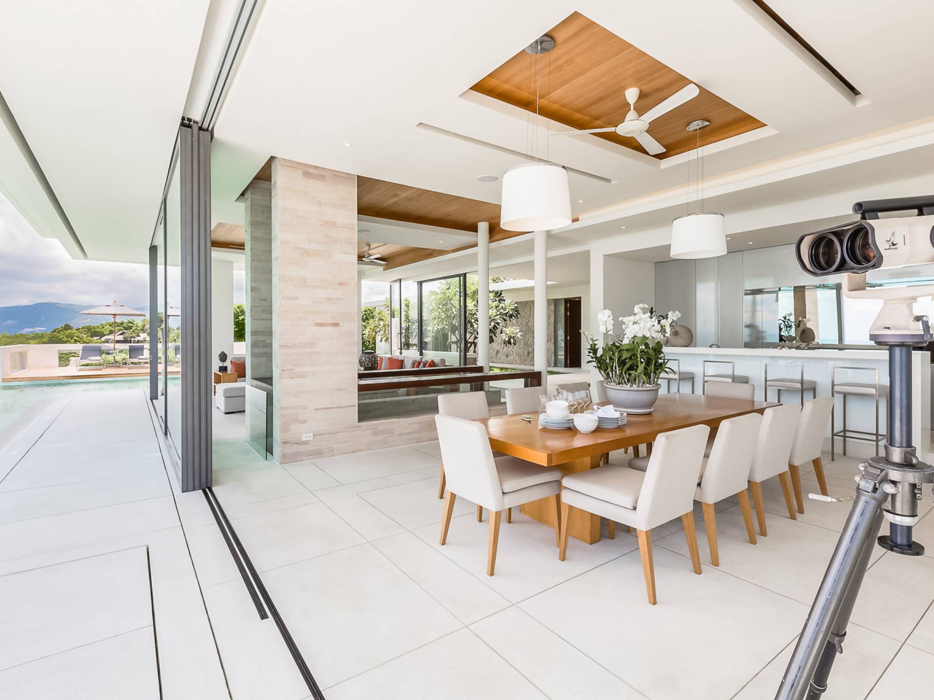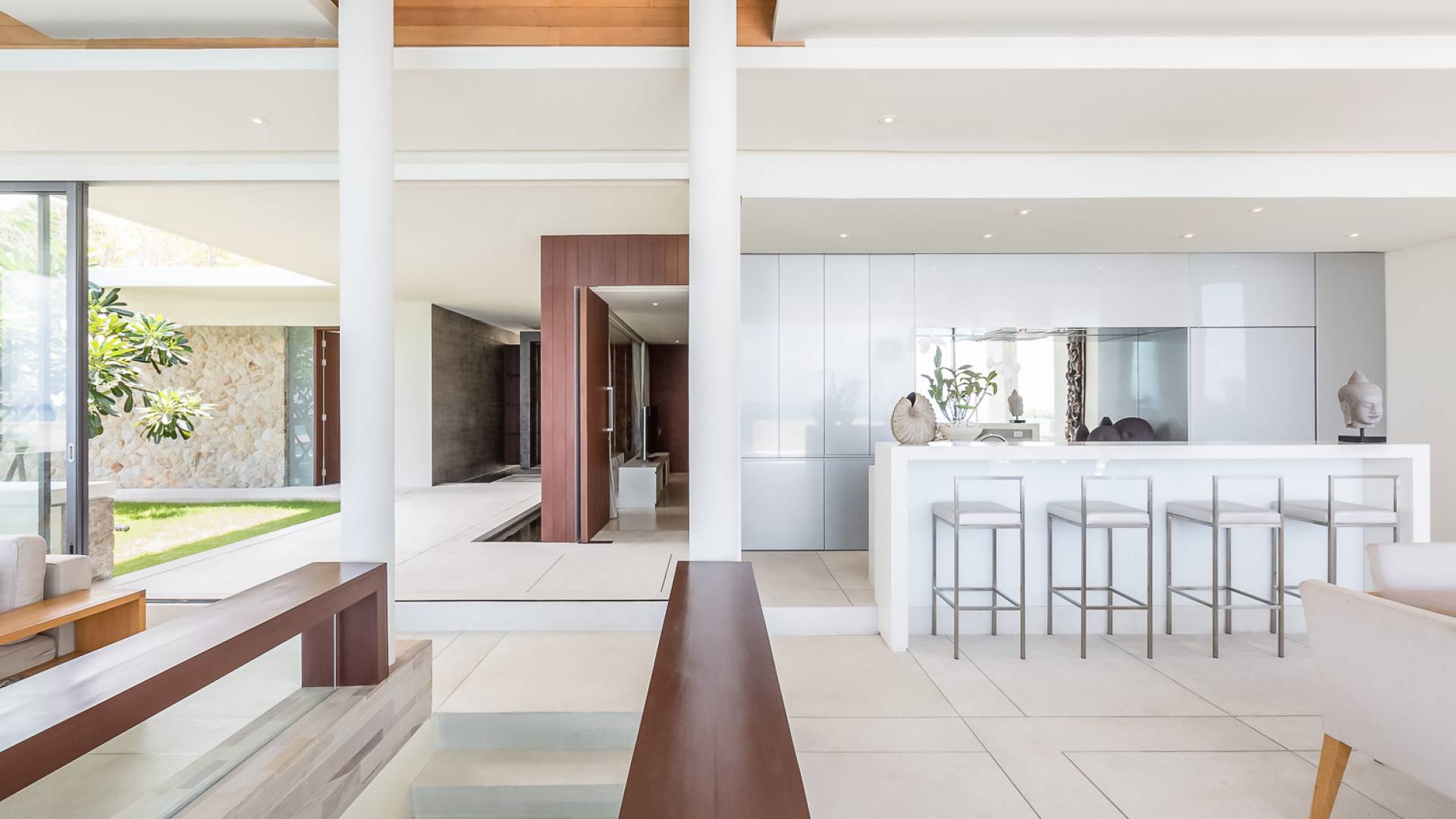 Il confortevole salone di livello superiore della villa è arredato con un invitante divano letto matrimoniale di grandi dimensioni, mentre l'ariosa sala da pranzo può ospitare comodamente 10 persone a un lungo tavolo da pranzo in legno lucido. La sala da pranzo dispone anche di un bancone per la colazione e sgabelli, ed entrambe le aree sono servite direttamente dalla cucina in stile occidentale della villa. Una seconda cucina è utilizzata principalmente dallo chef privato e dal team del personale per preparare i pasti degli ospiti. Una seconda zona giorno e una sala multimediale sono situate al piano intermedio della proprietà, arredate con un divano lungo e ultra confortevole di fronte a una grande TV a schermo piatto. Le porte scorrevoli a un'estremità della stanza si aprono su uno studio o su uno spazio ufficio privato. Tutte le aree soggiorno sono dotate di aria condizionata per gli ospiti che vogliono ritirarsi per il caldo tropicale.