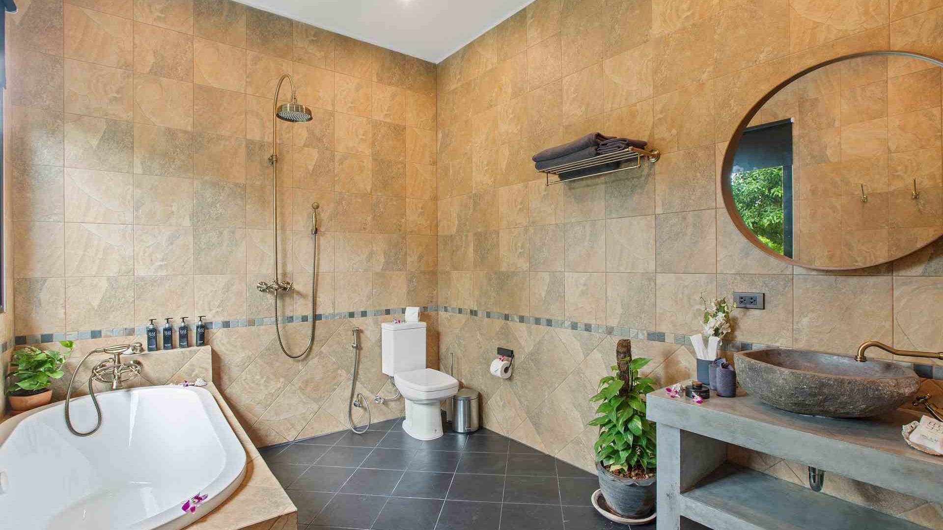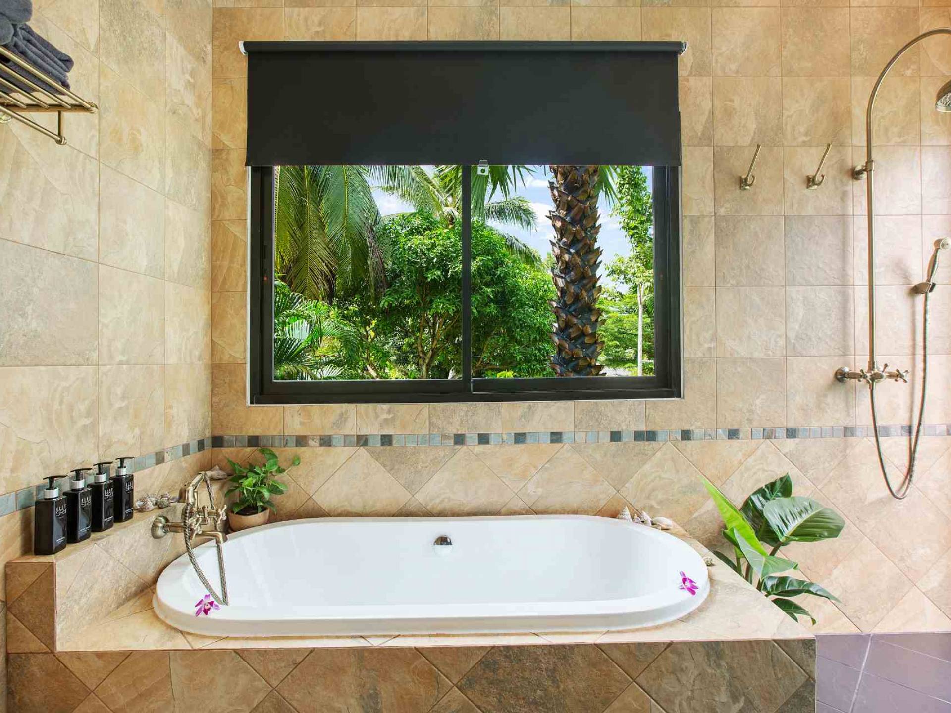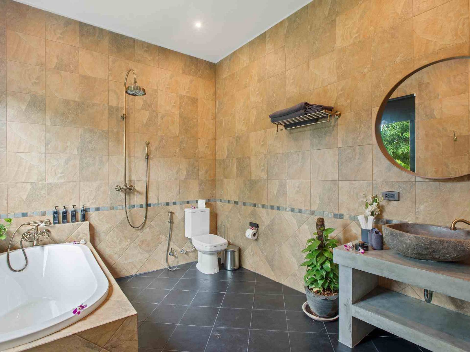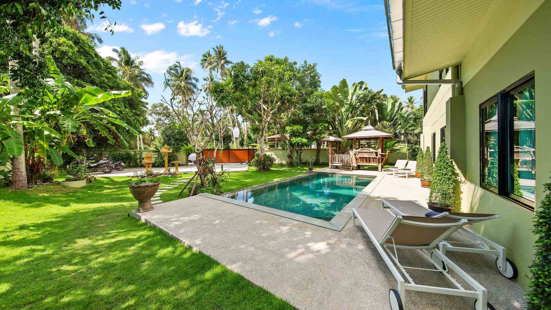 La piscina di acqua salata è lunga oltre 8 metri e profonda da 1 metro a 1,8 metri. L'ampia terrazza a bordo piscina è l'ideale per prendere il sole. A bordo piscina, c'è una sala tradizionale in legno in stile tailandese (10 posti a sedere) che è l'ideale per un po' di ombra di benvenuto nel pomeriggio e anche come zona pranzo ideale per quando si fa uso del barbecue la sera È ideale anche per semplicemente una serata di relax a bordo piscina. Questa villa per le vacanze è un rifugio ideale per le famiglie in quanto è una zona molto tranquilla e ricca di natura, molto vicina a tre spiagge bellissime ma tranquille e al villaggio di pescatori sulla spiaggia di Thong Krut. Thong Krut ha alcuni ristoranti e bar internazionali, nonché i caffè tailandesi locali sulla spiaggia. La zona organizza regolarmente snorkeling ed escursioni orientate al mare, oltre ad avere un minimarket locale e una caffetteria biologica.