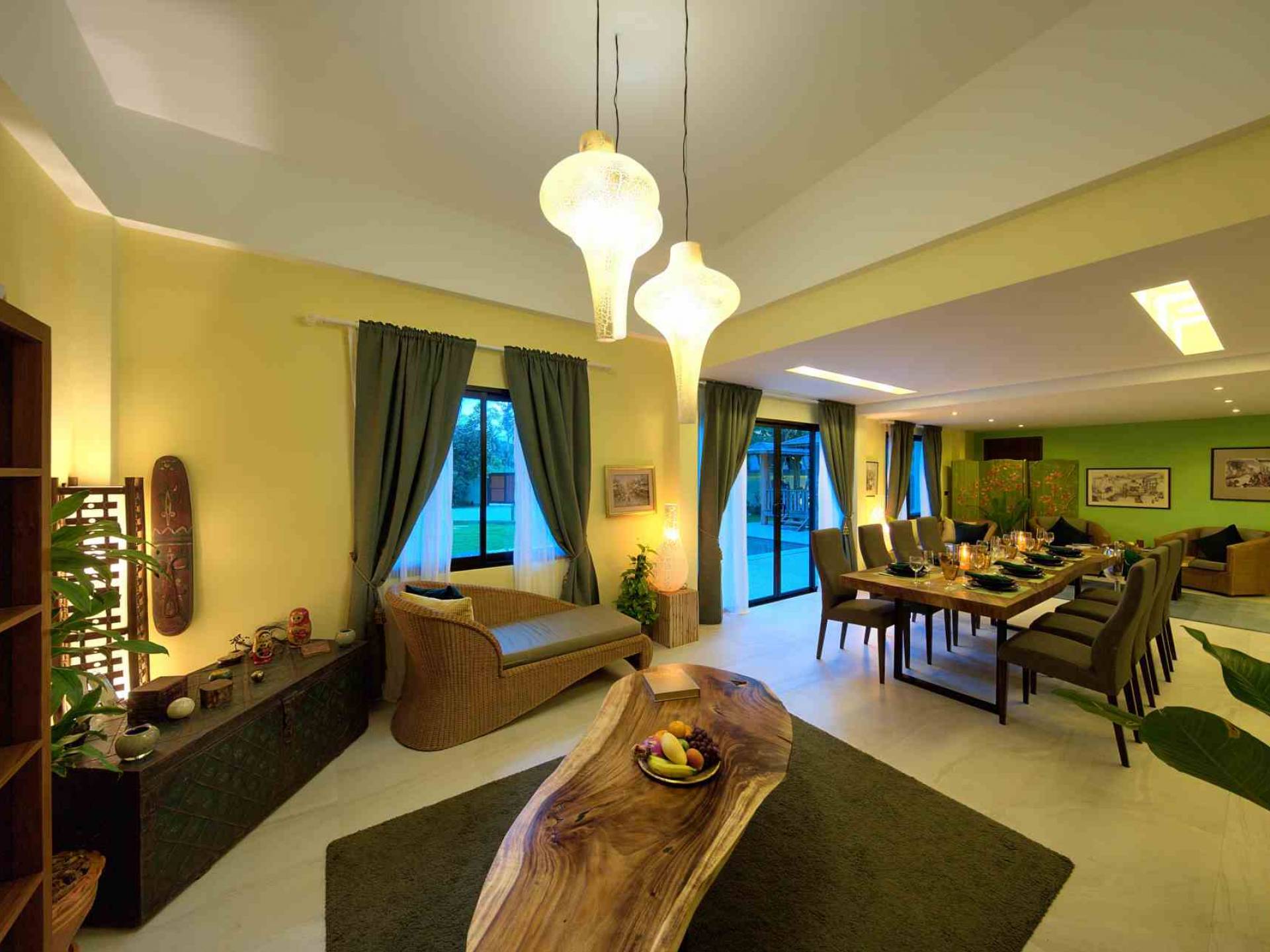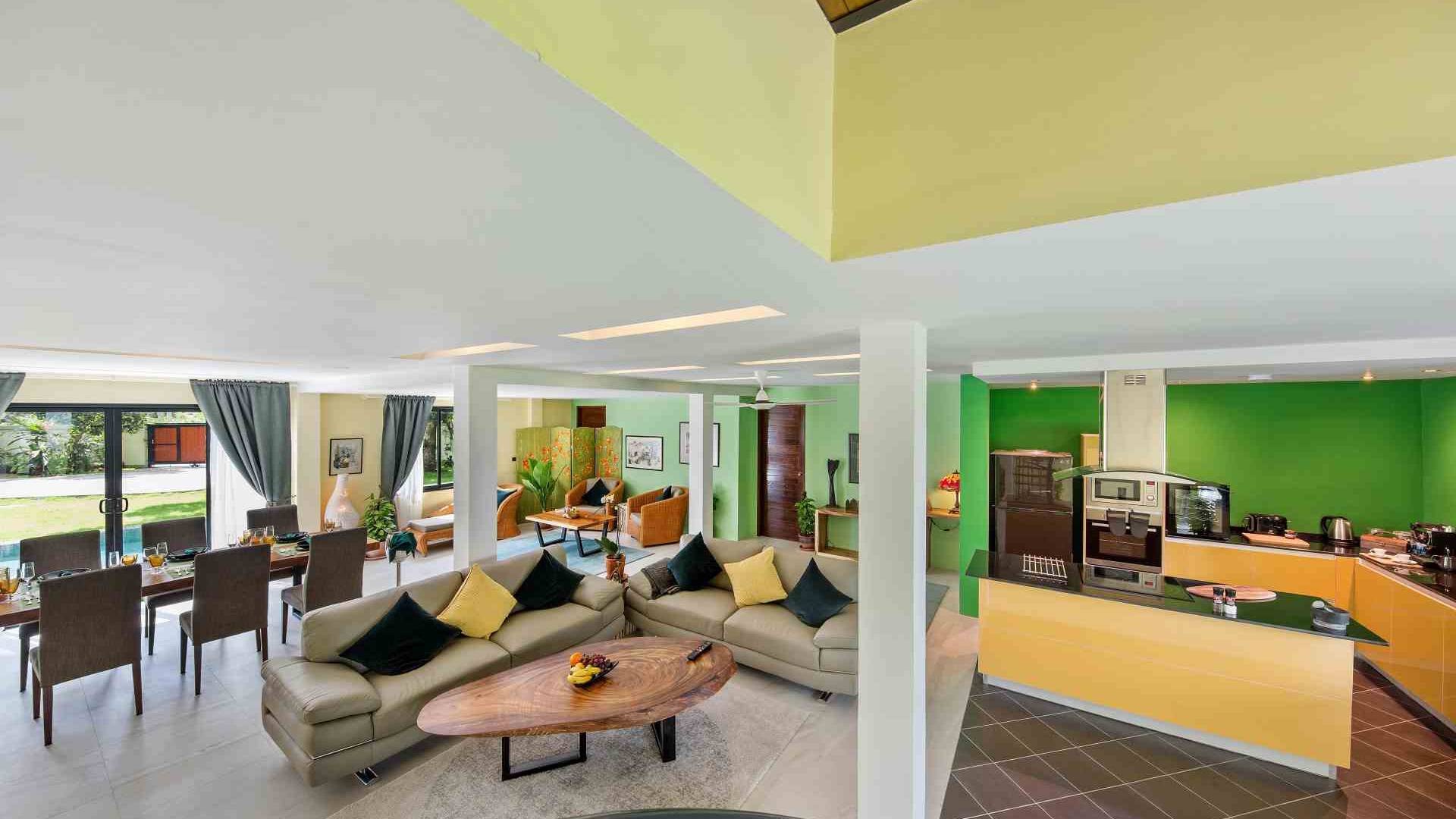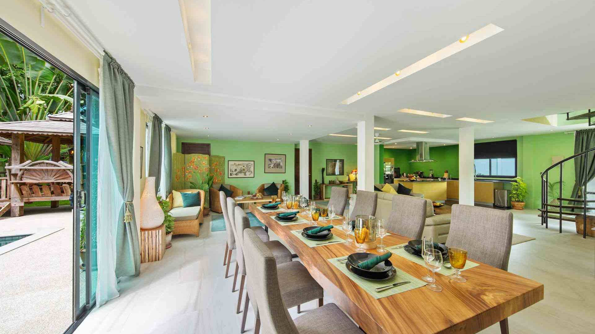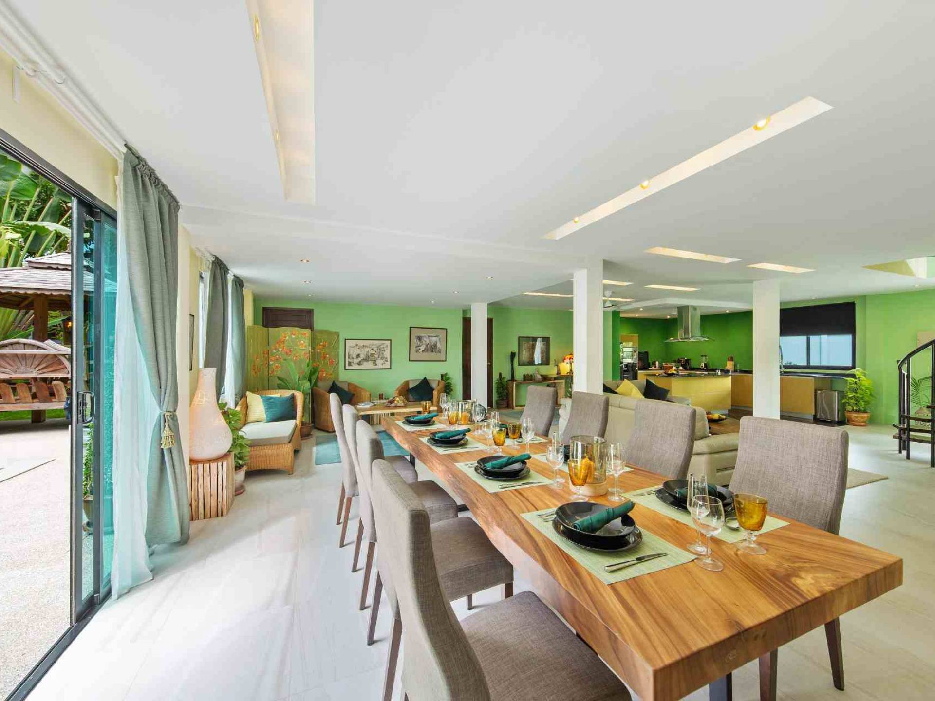 La zona giorno è molto spaziosa ma confortevole. Rilassati semplicemente su uno dei divani in pelle italiana mentre guardi la TV "smart" da 55 pollici, dotata di Ip tv, con oltre 300 canali in inglese, francese, tedesco, russo e tailandese. Viene fornito anche un lettore dvd. Il tavolo da pranzo in legno massello lungo tre metri è sistemato dalle finestre del patio che conducono alla piscina principale, alla sala, alla terrazza e al giardino anteriore. La Baan Suaan Serenity Villa dispone anche di rilassanti aree lettura e giochi. Nella parte posteriore del piano terra c'è una spaziosa cucina con un corridoio centrale di cottura. Questa cucina è molto moderna e completamente attrezzata con un grande frigorifero con congelatore. Dove oltre a generi alimentari di benvenuto troverete alcune birre locali (a pagamento) e bicchieri molto freschi. C'è anche un wine bar con una buona selezione di vini a prezzi ragionevoli.
