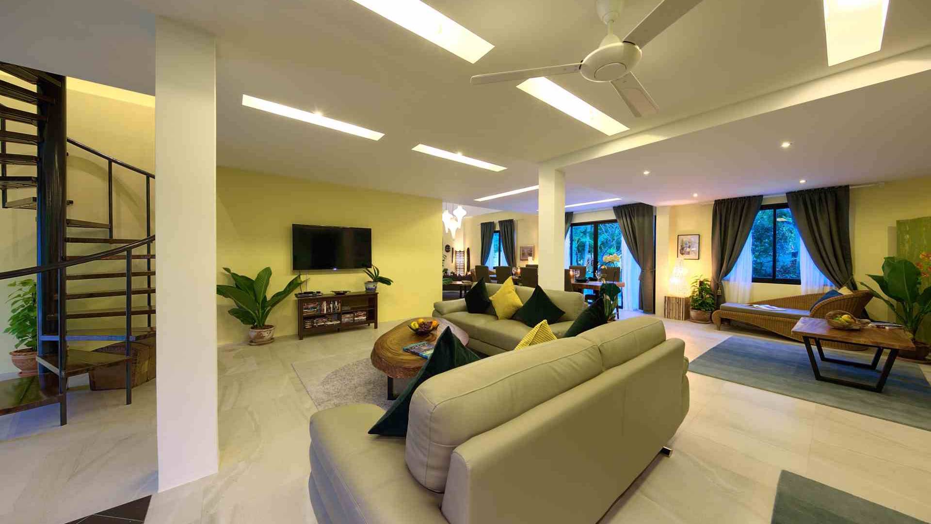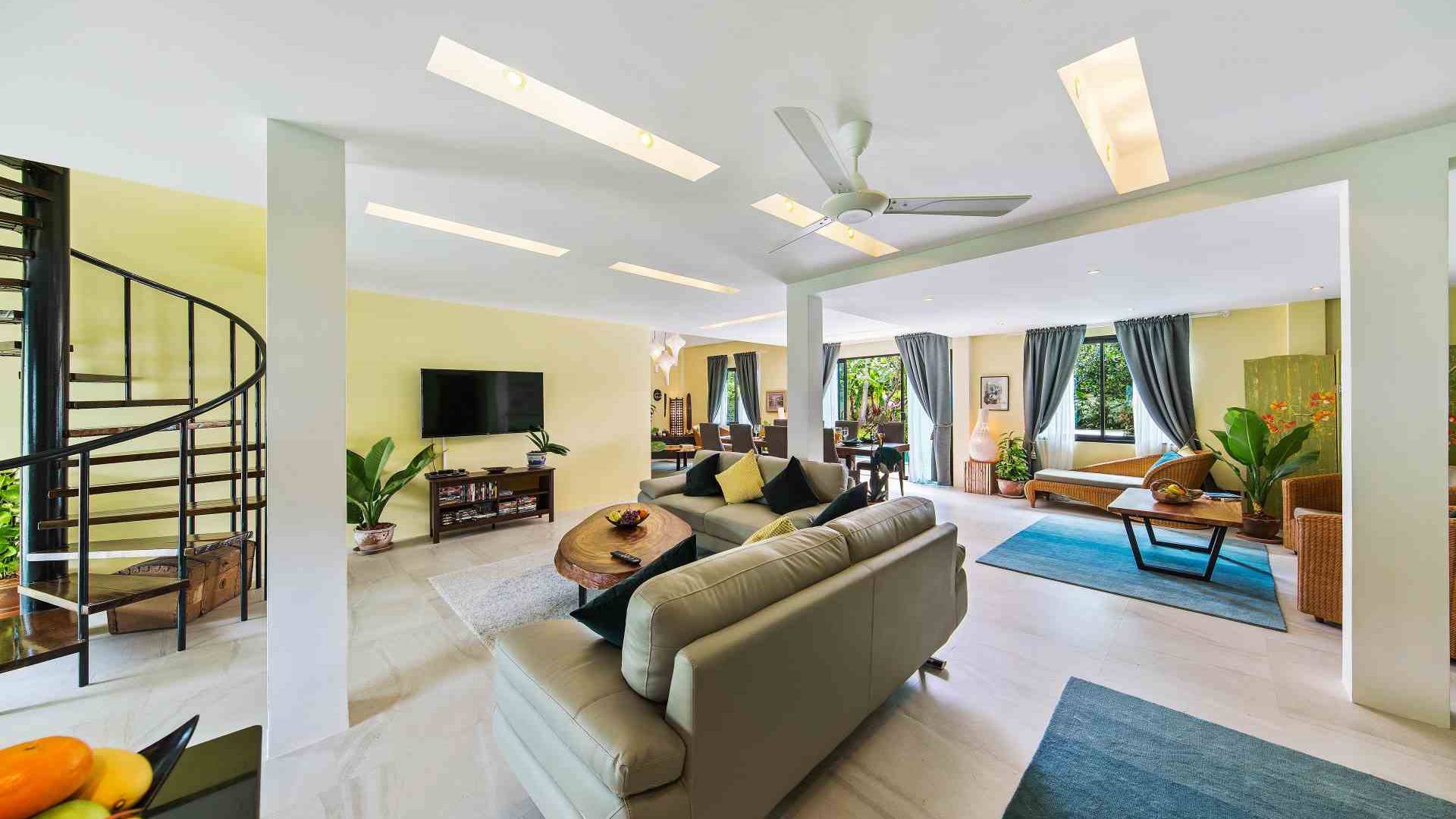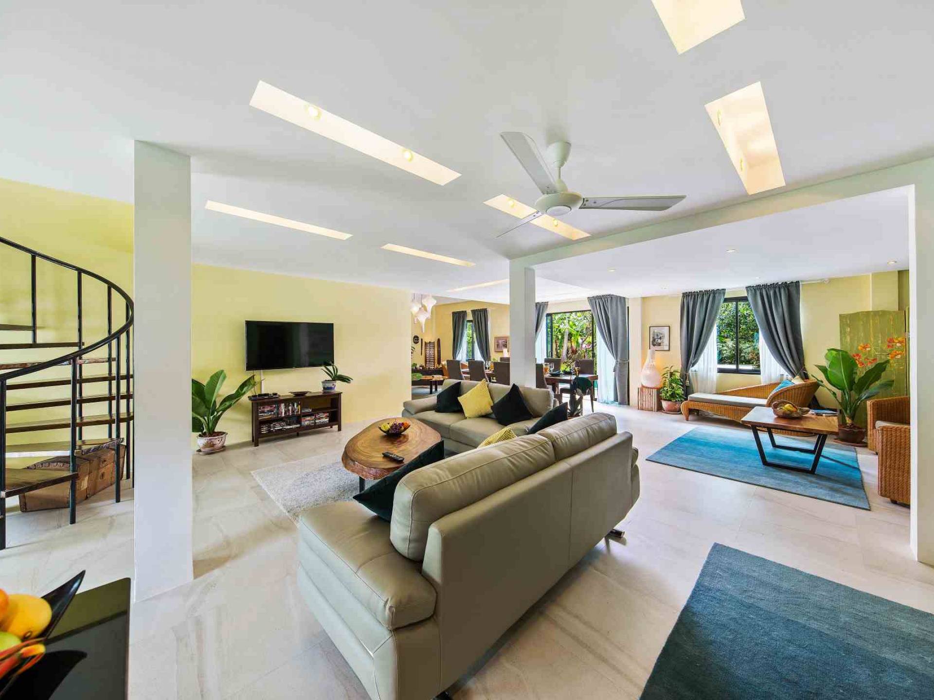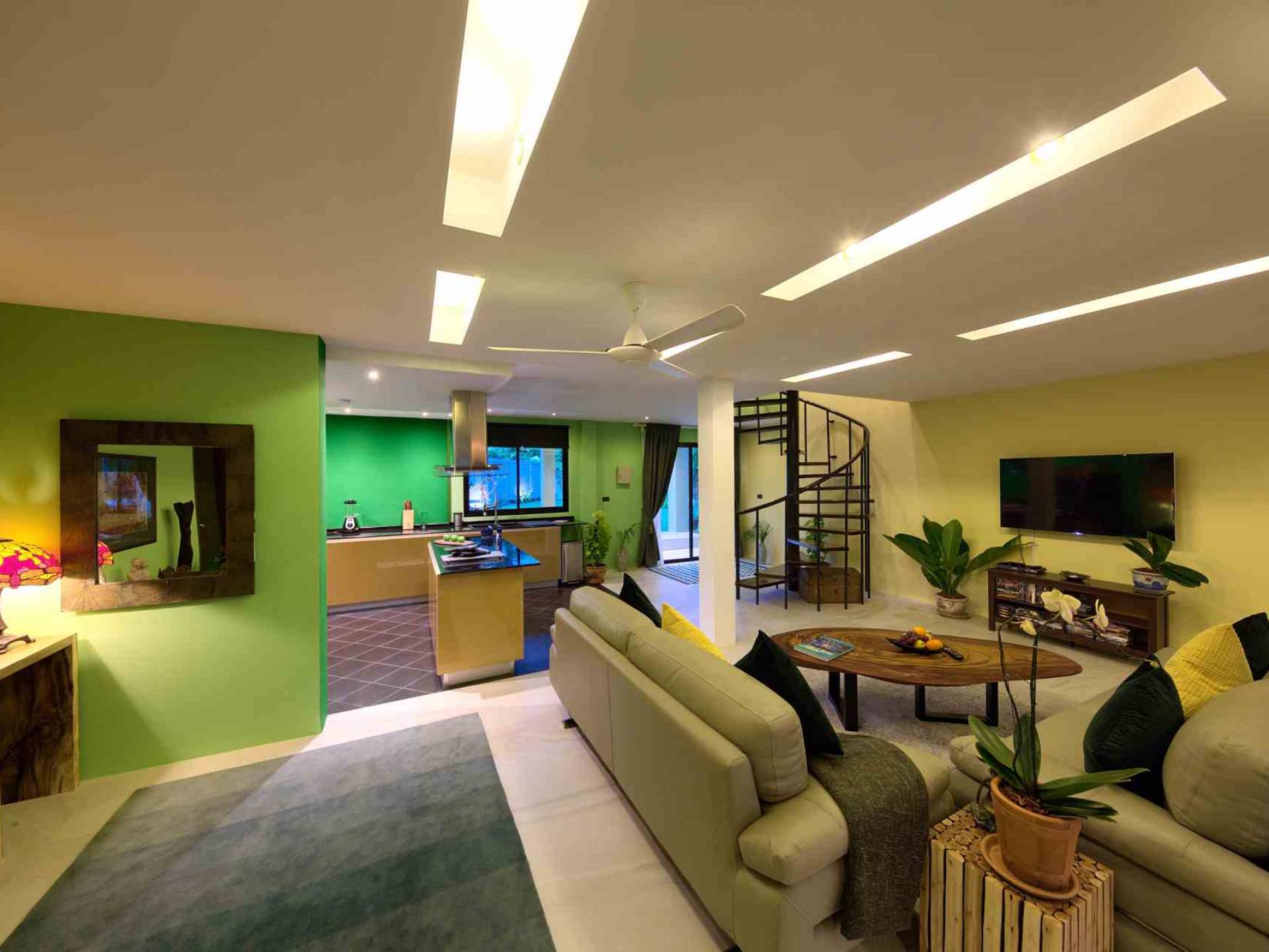 La zona giorno è molto spaziosa ma confortevole. Rilassati semplicemente su uno dei divani in pelle italiana mentre guardi la TV "smart" da 55 pollici, dotata di Ip tv, con oltre 300 canali in inglese, francese, tedesco, russo e tailandese. Viene fornito anche un lettore dvd. Il tavolo da pranzo in legno massello lungo tre metri è sistemato dalle finestre del patio che conducono alla piscina principale, alla sala, alla terrazza e al giardino anteriore. La Baan Suaan Serenity Villa dispone anche di rilassanti aree lettura e giochi. Nella parte posteriore del piano terra c'è una spaziosa cucina con un corridoio centrale di cottura. Questa cucina è molto moderna e completamente attrezzata con un grande frigorifero con congelatore. Dove oltre a generi alimentari di benvenuto troverete alcune birre locali (a pagamento) e bicchieri molto freschi. C'è anche un wine bar con una buona selezione di vini a prezzi ragionevoli.
