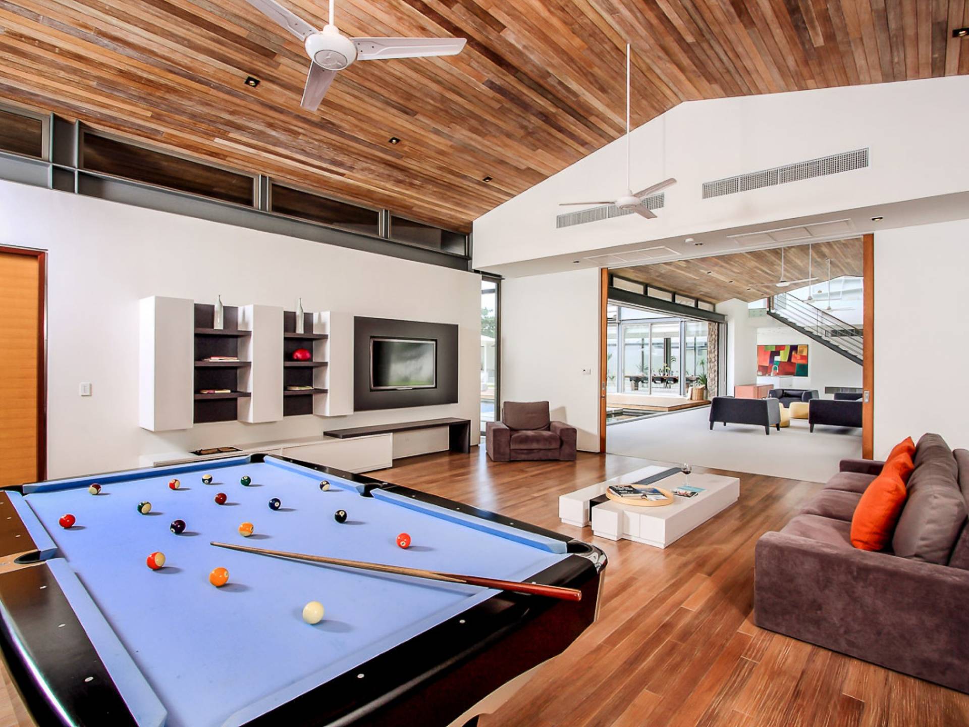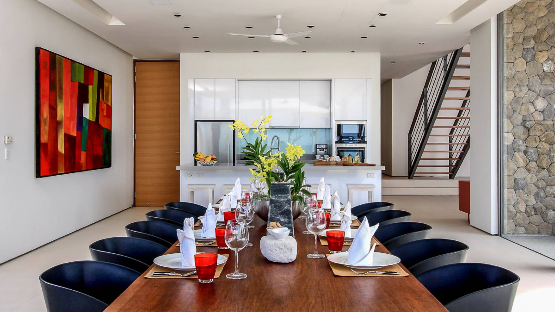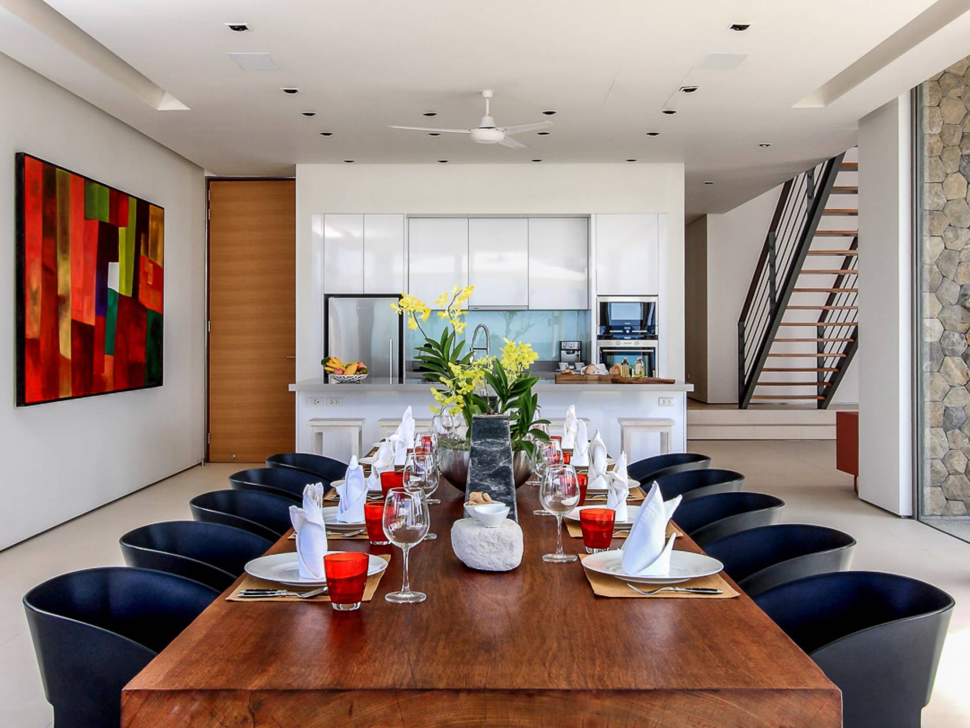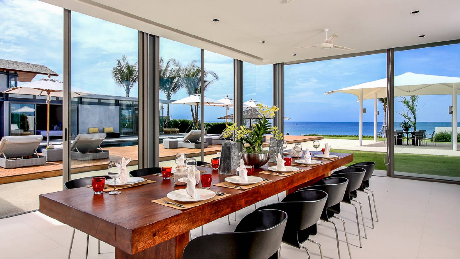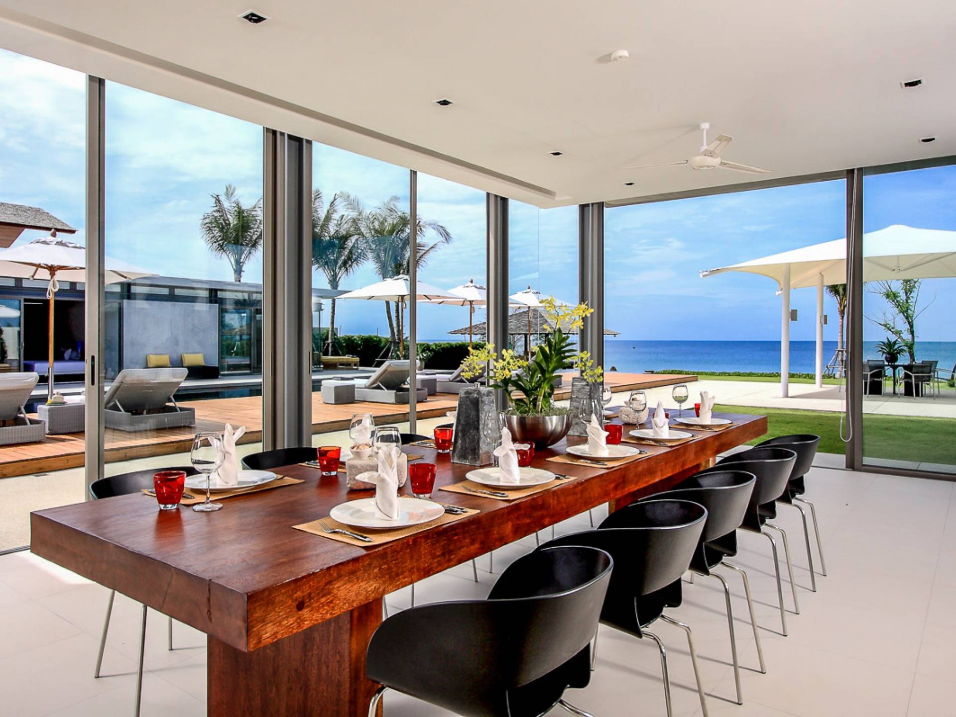 Cena con semplice eleganza al lungo tavolo da pranzo in legno per 12 persone, un luogo invitante dove riunirsi per i pasti con vista sul mare e sulla piscina. La sala TV adiacente alla zona giorno ha una grande TV a schermo piatto e un tavolo da biliardo, mentre può anche essere isolata da porte scorrevoli in legno per una maggiore privacy.