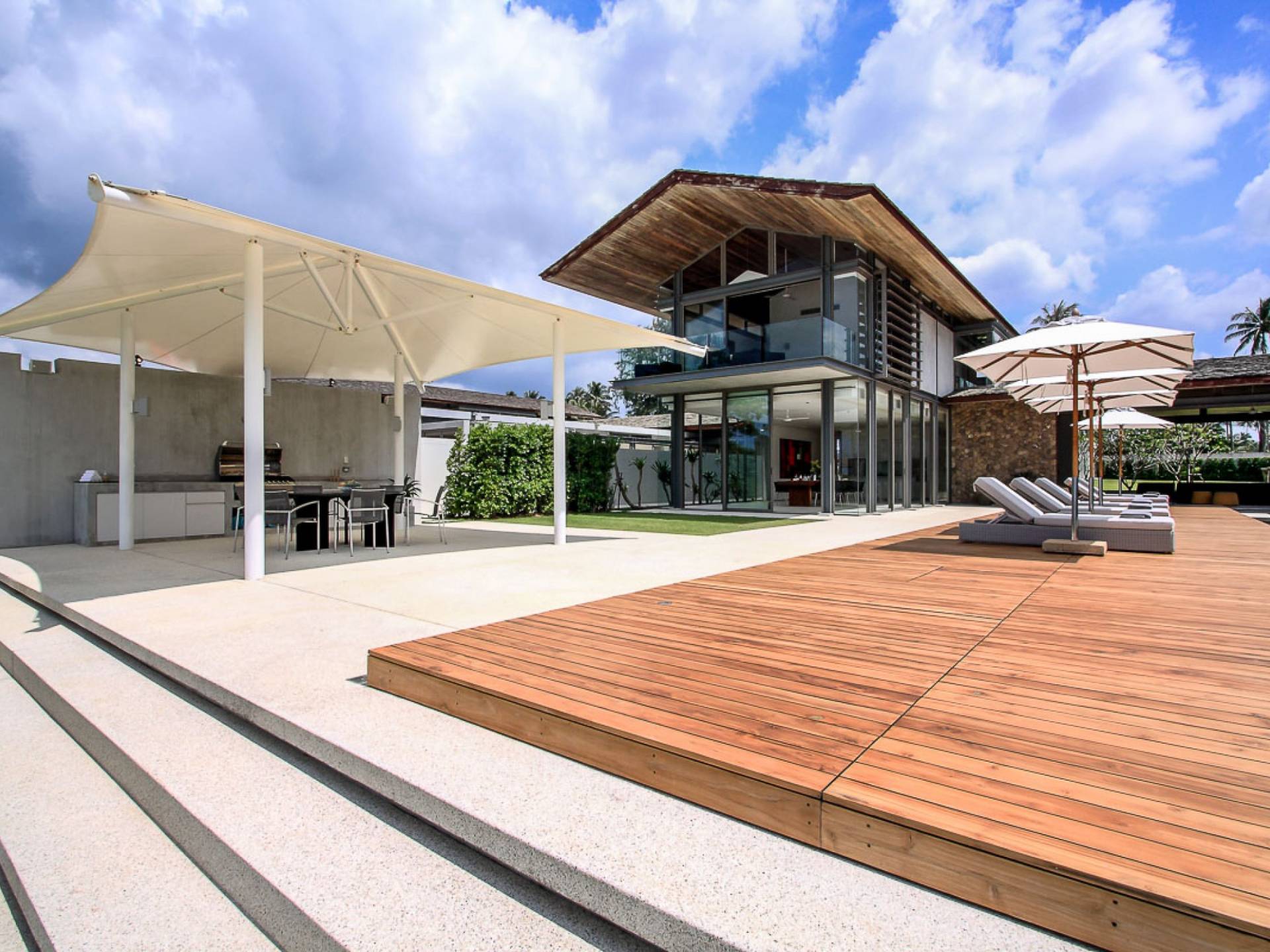Immersa in 3.800 metri quadrati di giardini fronte mare, Villa Amarelo offre ampi spazi per ospitare eventi o semplicemente per godersi un po' di tempo libero all'aperto con la famiglia e gli amici. La sua piscina a sfioro si estende verso il meraviglioso mare ed è circondata da una terrazza in legno attrezzata con lettini e una zona pranzo barbeque con tettoia. Sul prato di fronte alla spiaggia c'è una sala con tetto a punta che offre splendide viste sul mare, mentre un grande prato dietro la villa è il luogo perfetto per sistemare le reti da calcio o da pallavolo della villa.