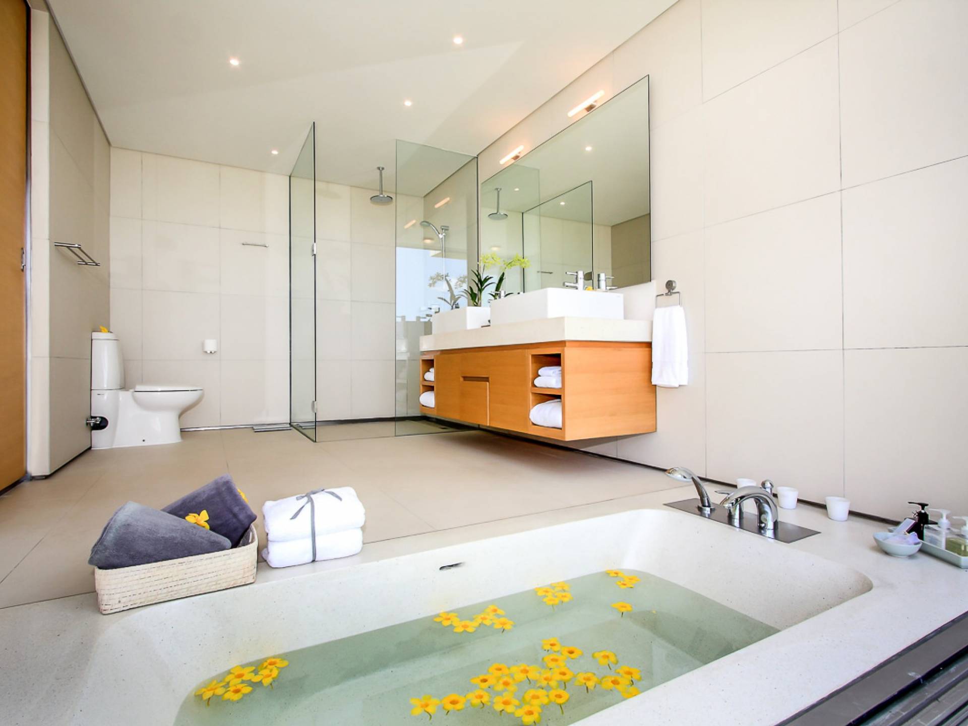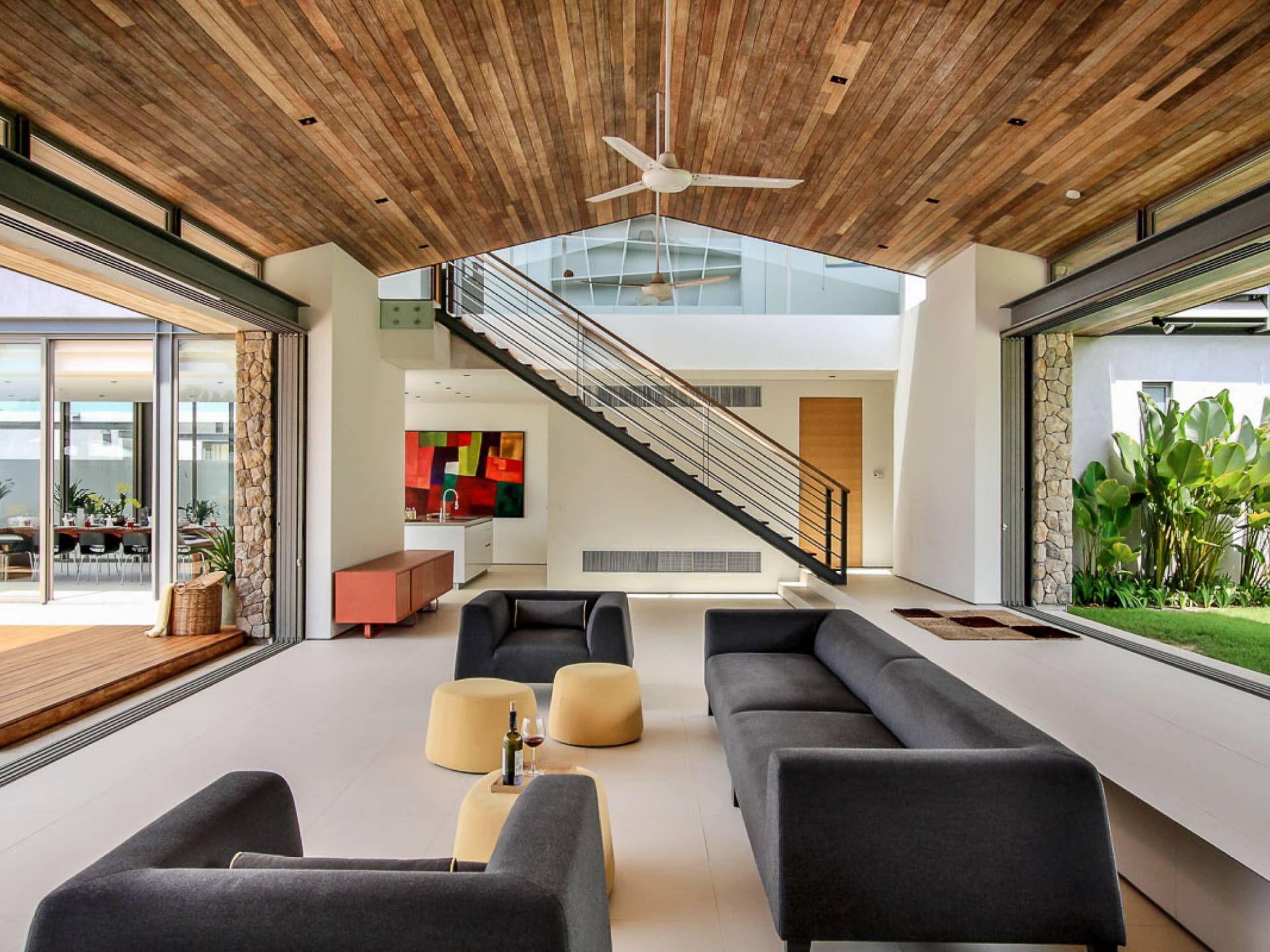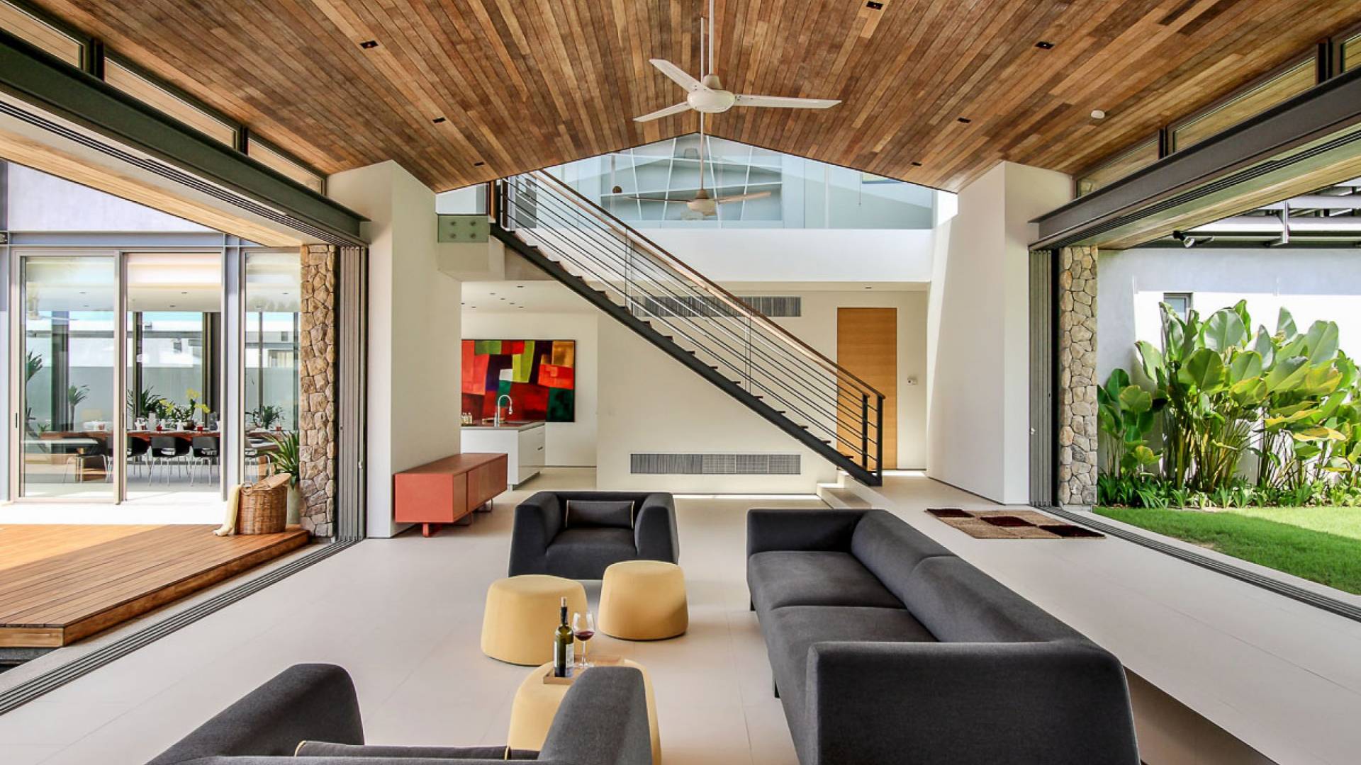 Villa Amarelo è progettata in modo unico per catturare le maestose viste sul mare in armonia con i suoi dintorni tropicali. Una zona giorno a pianta aperta si trova a pochi passi dalla piscina a sfioro, con porte in vetro dal pavimento al soffitto che si aprono completamente facendo entrare la brezza oceanica negli spazi interni e la luce solare naturale per offrire un bagliore baciato dal sole. Questo spazio fondamentale fornisce l'accesso a tutte le aree. Da un lato, la sala TV conduce all'ala monopiano della villa, che ospita tre camere da letto, di cui una master suite che si estende lungo la piscina verso il mare. Proprio di fronte, la zona pranzo e la cucina per gli ospiti occupano il piano terra di un'ala di due piani, con una seconda suite principale e due camere da letto sopra.