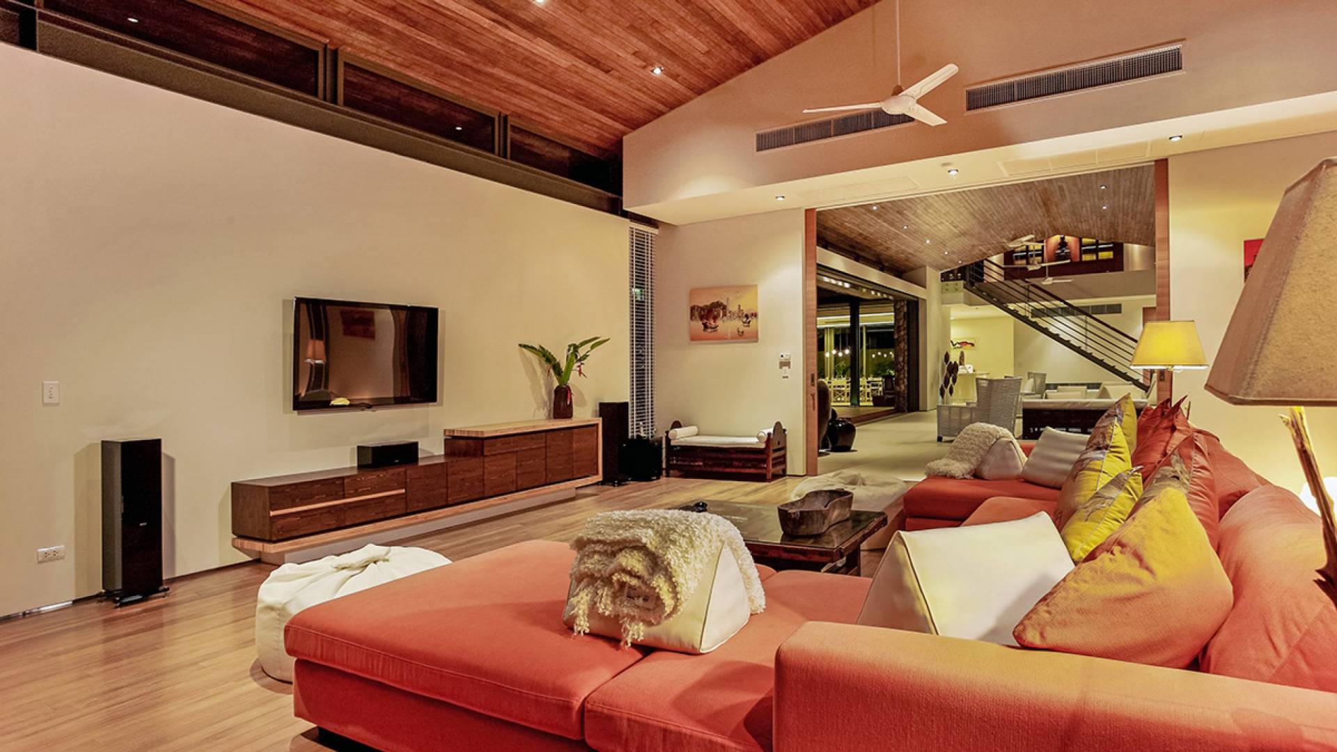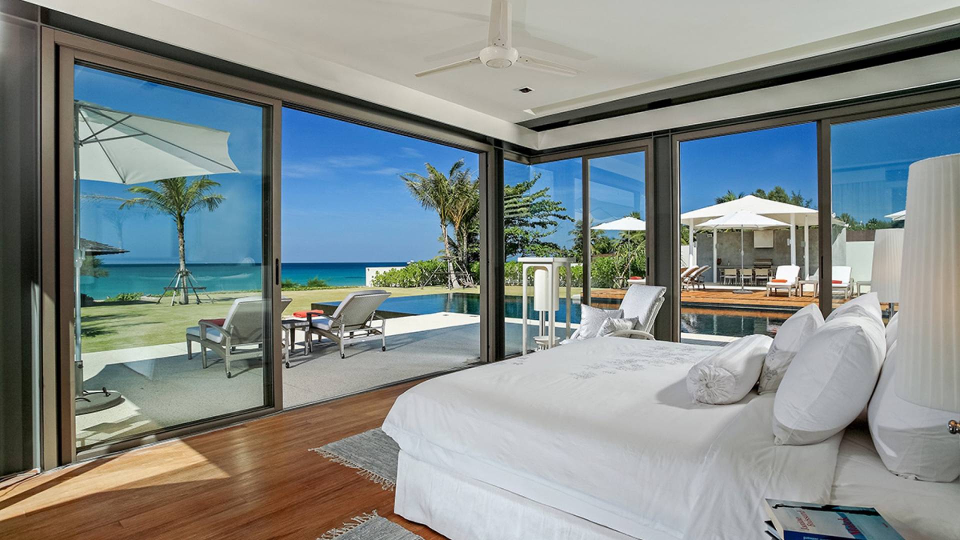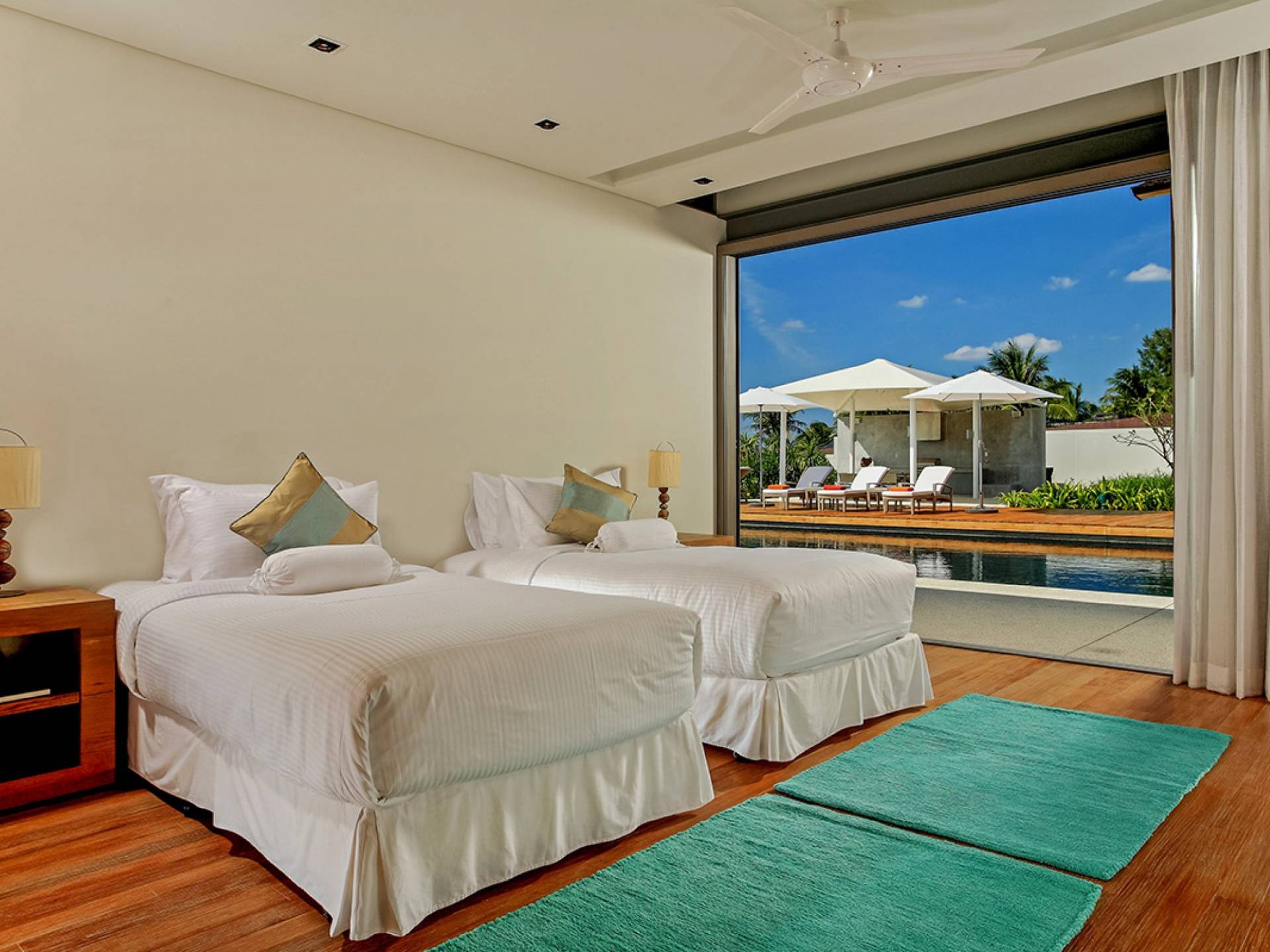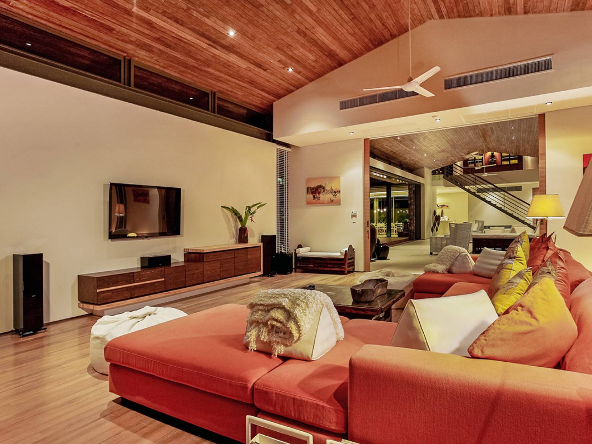 Disposta a forma di U che avvolge una piscina centrale, Villa Malee Sai offre magnifiche viste sul mare sconfinate. Situato al centro della villa, proprio dietro la piscina a sfioro privata, l'elegante zona giorno a pianta aperta presenta porte in vetro dal pavimento al soffitto che si aprono completamente per far scorrere la brezza oceanica. L'accesso a tutte le aree della villa, sia all'interno che all'esterno, avviene attraverso questo spazio cardine. La sala TV a lato conduce all'ala monopiano della villa con tre camere da letto, di cui una master suite, che si estende lungo la lunghezza della piscina verso il mare. La zona pranzo e la cucina per gli ospiti si trovano al piano terra dell'ala a due piani opposte, con una seconda master suite e due spaziose e confortevoli camere da letto per gli ospiti sopra.