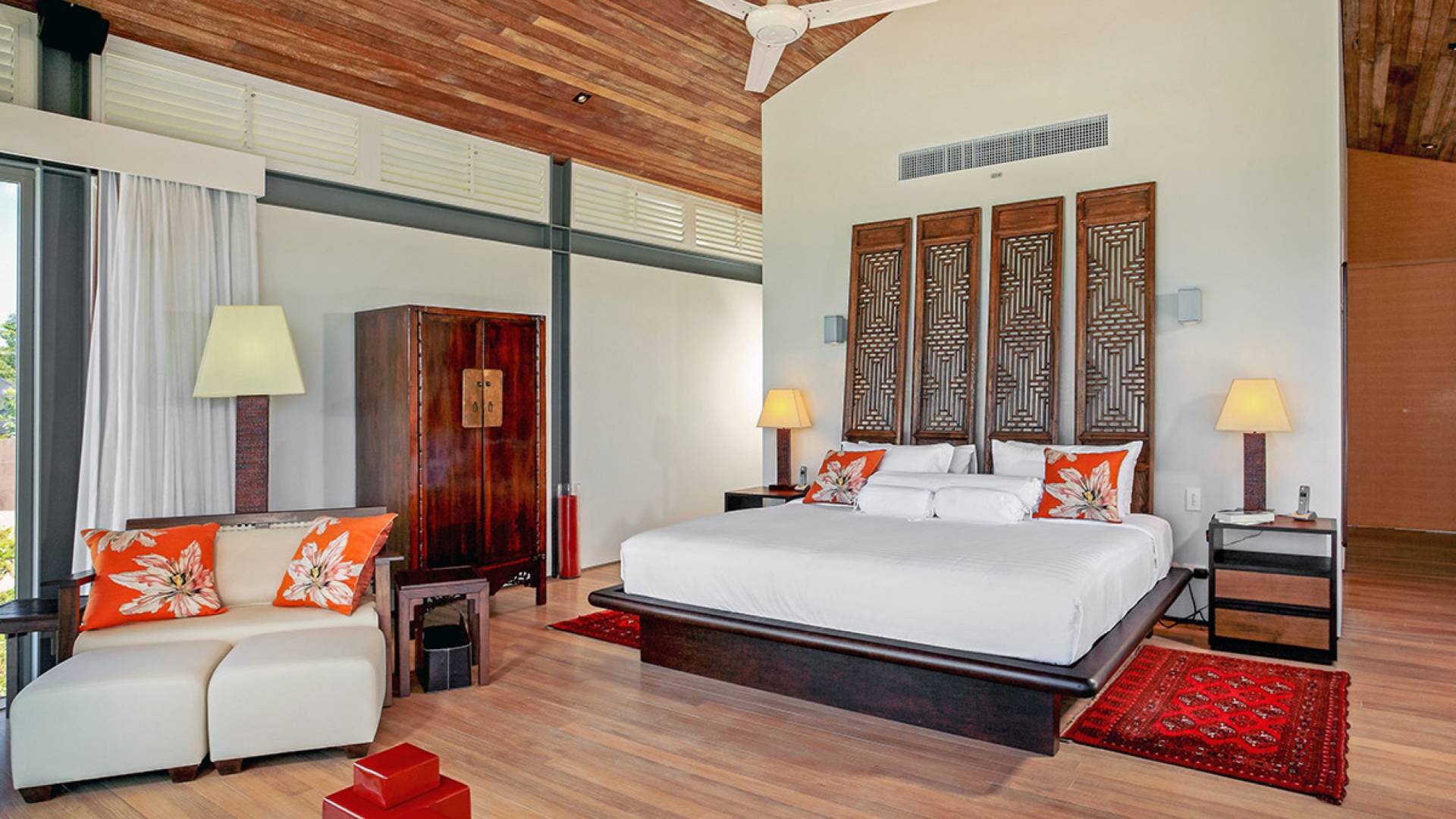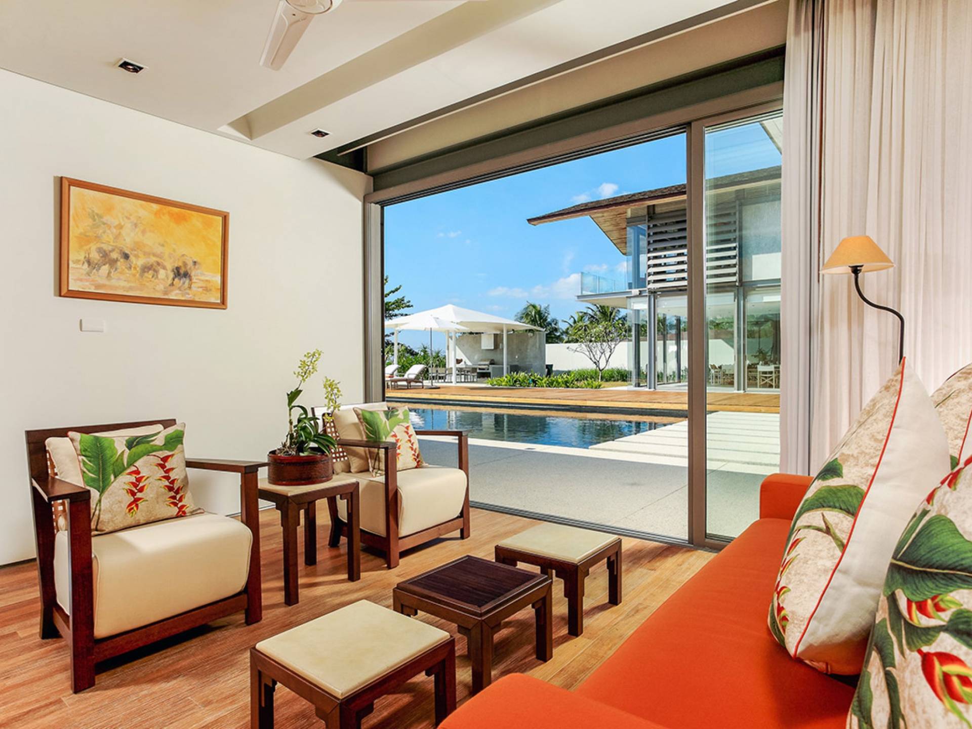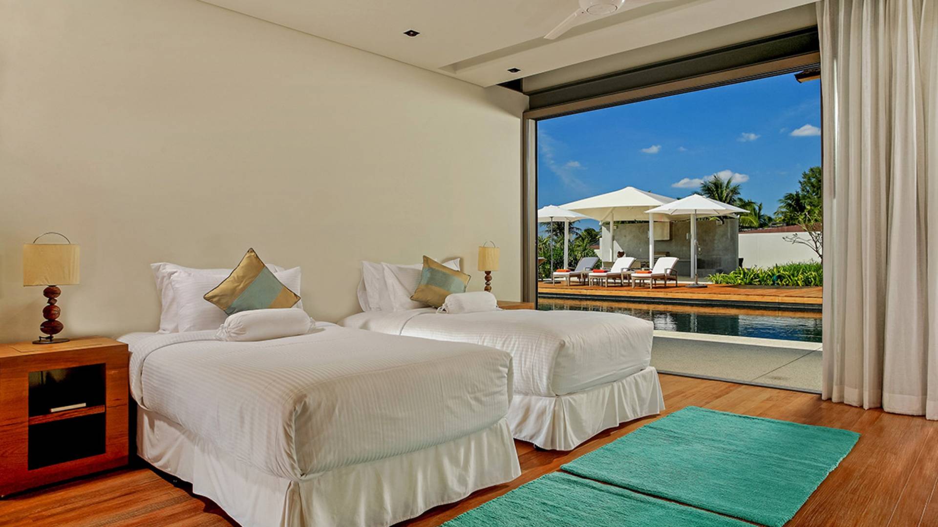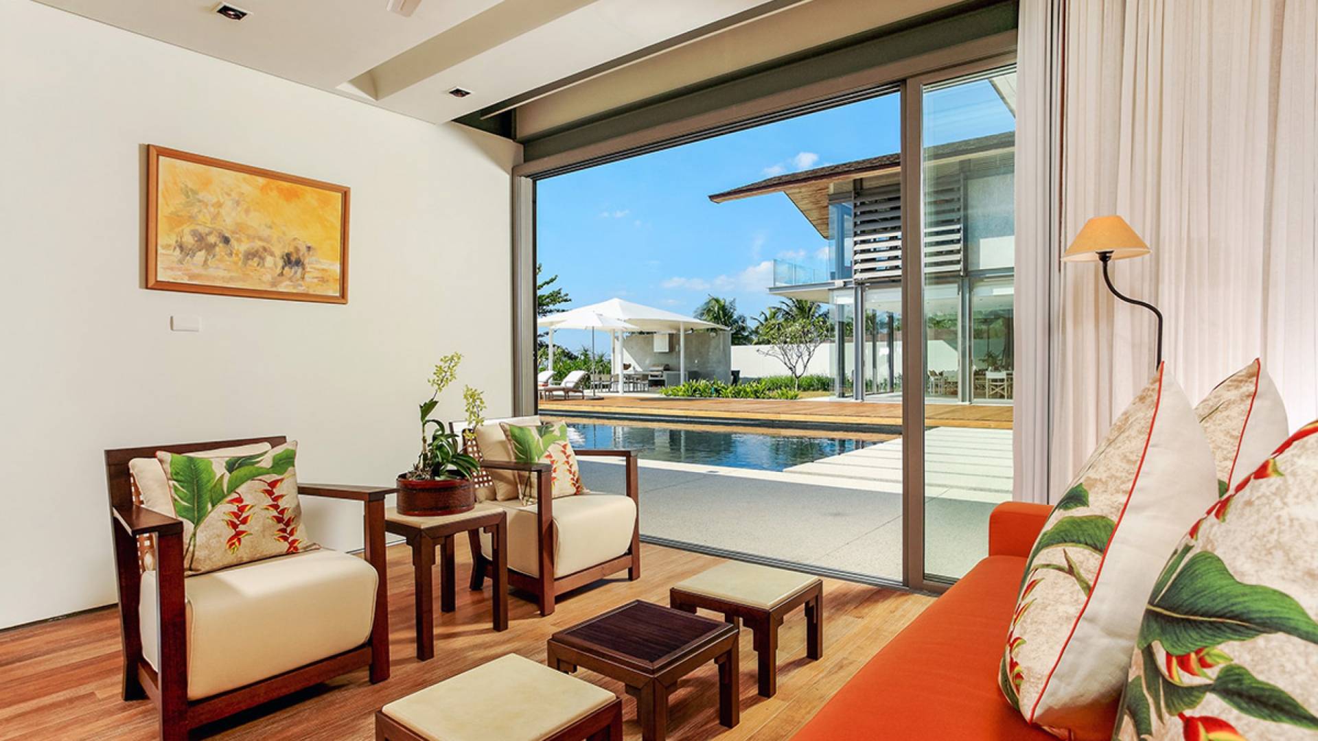 Disposta a forma di U che avvolge una piscina centrale, Villa Malee Sai offre magnifiche viste sul mare sconfinate. Situato al centro della villa, proprio dietro la piscina a sfioro privata, l'elegante zona giorno a pianta aperta presenta porte in vetro dal pavimento al soffitto che si aprono completamente per far scorrere la brezza oceanica. L'accesso a tutte le aree della villa, sia all'interno che all'esterno, avviene attraverso questo spazio cardine. La sala TV a lato conduce all'ala monopiano della villa con tre camere da letto, di cui una master suite, che si estende lungo la lunghezza della piscina verso il mare. La zona pranzo e la cucina per gli ospiti si trovano al piano terra dell'ala a due piani opposte, con una seconda master suite e due spaziose e confortevoli camere da letto per gli ospiti sopra.