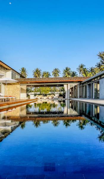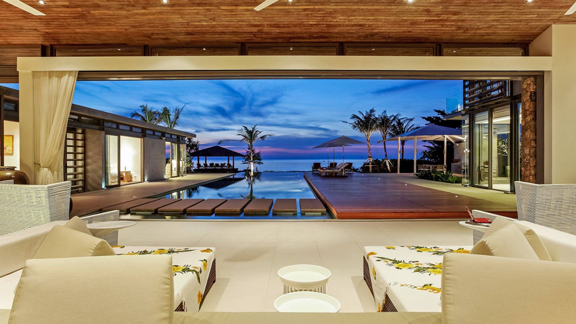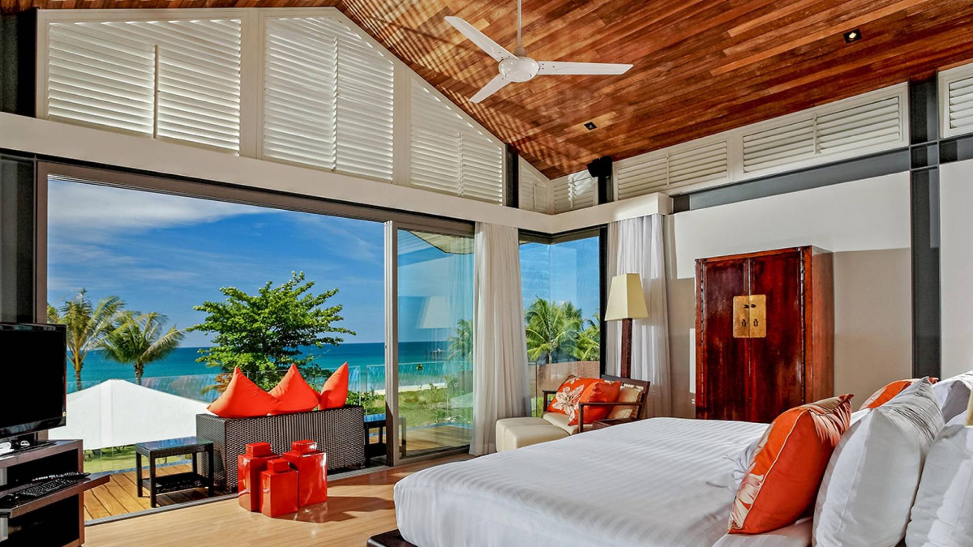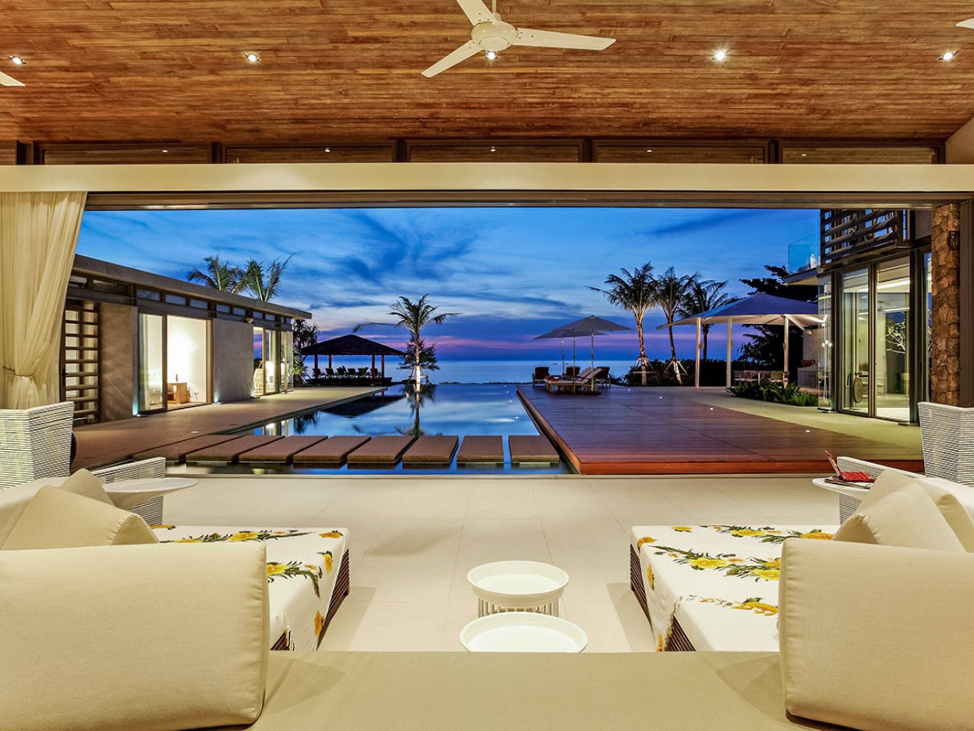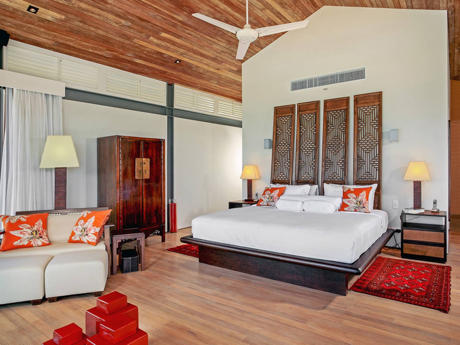 Disposta a forma di U che avvolge una piscina centrale, Villa Malee Sai offre magnifiche viste sul mare sconfinate. Situato al centro della villa, proprio dietro la piscina a sfioro privata, l'elegante zona giorno a pianta aperta presenta porte in vetro dal pavimento al soffitto che si aprono completamente per far scorrere la brezza oceanica. L'accesso a tutte le aree della villa, sia all'interno che all'esterno, avviene attraverso questo spazio cardine. La sala TV a lato conduce all'ala monopiano della villa con tre camere da letto, di cui una master suite, che si estende lungo la lunghezza della piscina verso il mare. La zona pranzo e la cucina per gli ospiti si trovano al piano terra dell'ala a due piani opposte, con una seconda master suite e due spaziose e confortevoli camere da letto per gli ospiti sopra.