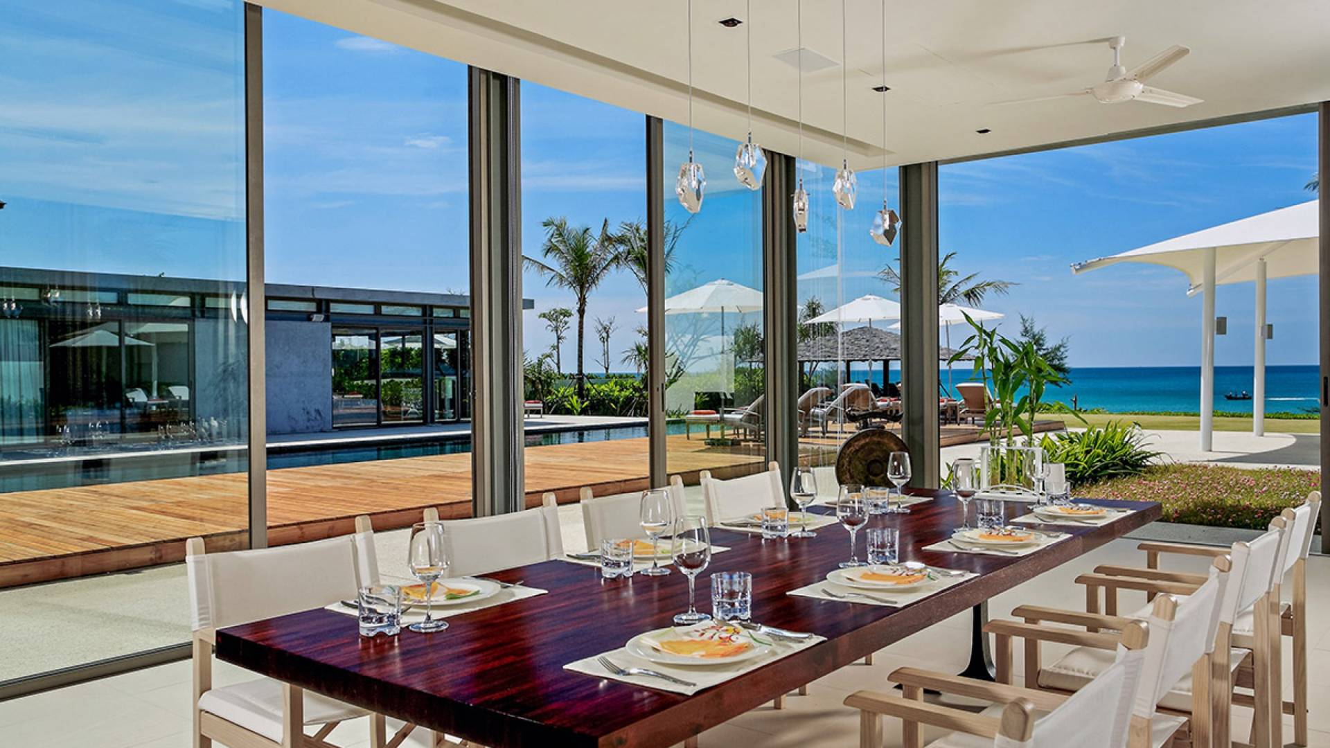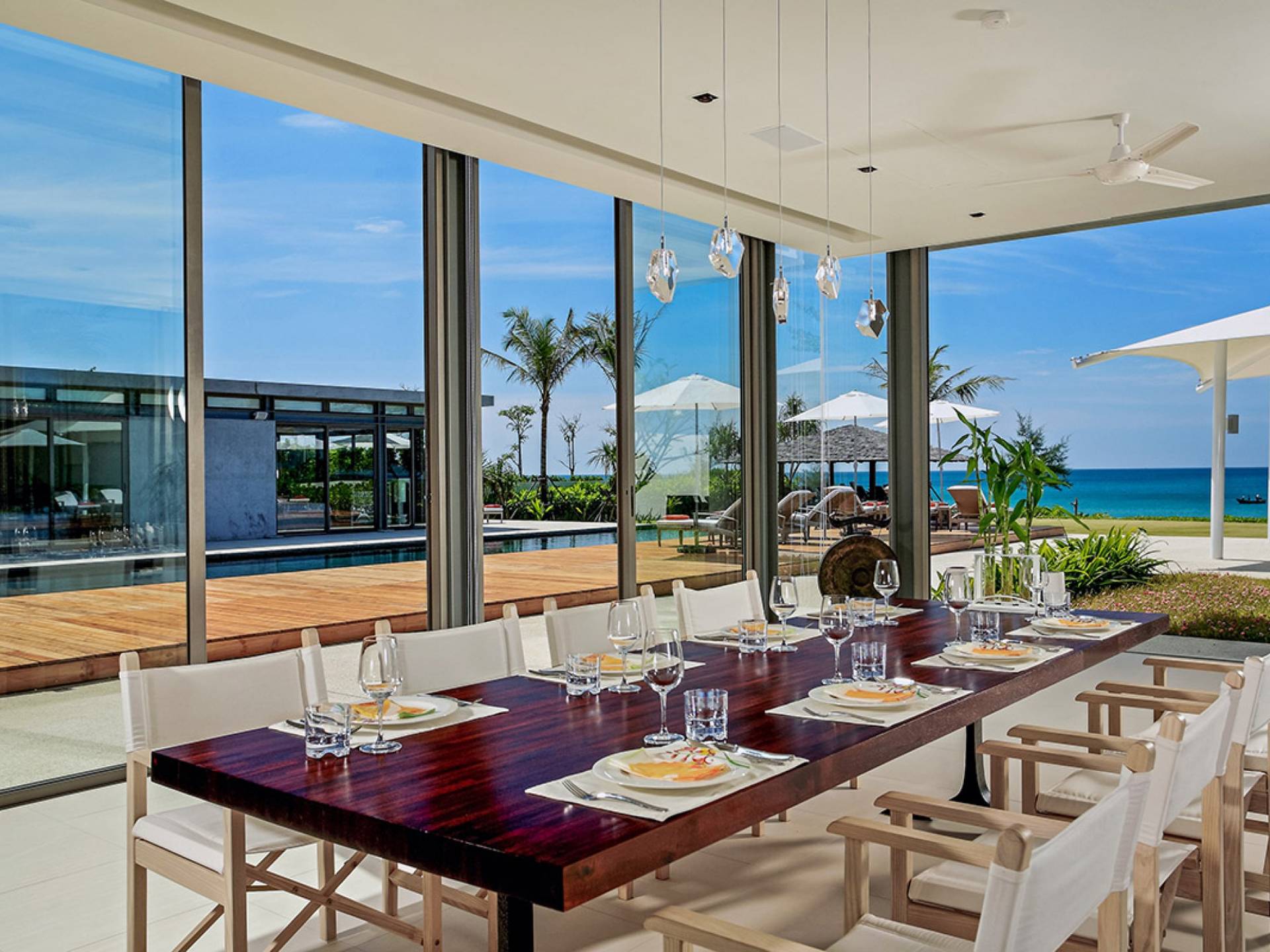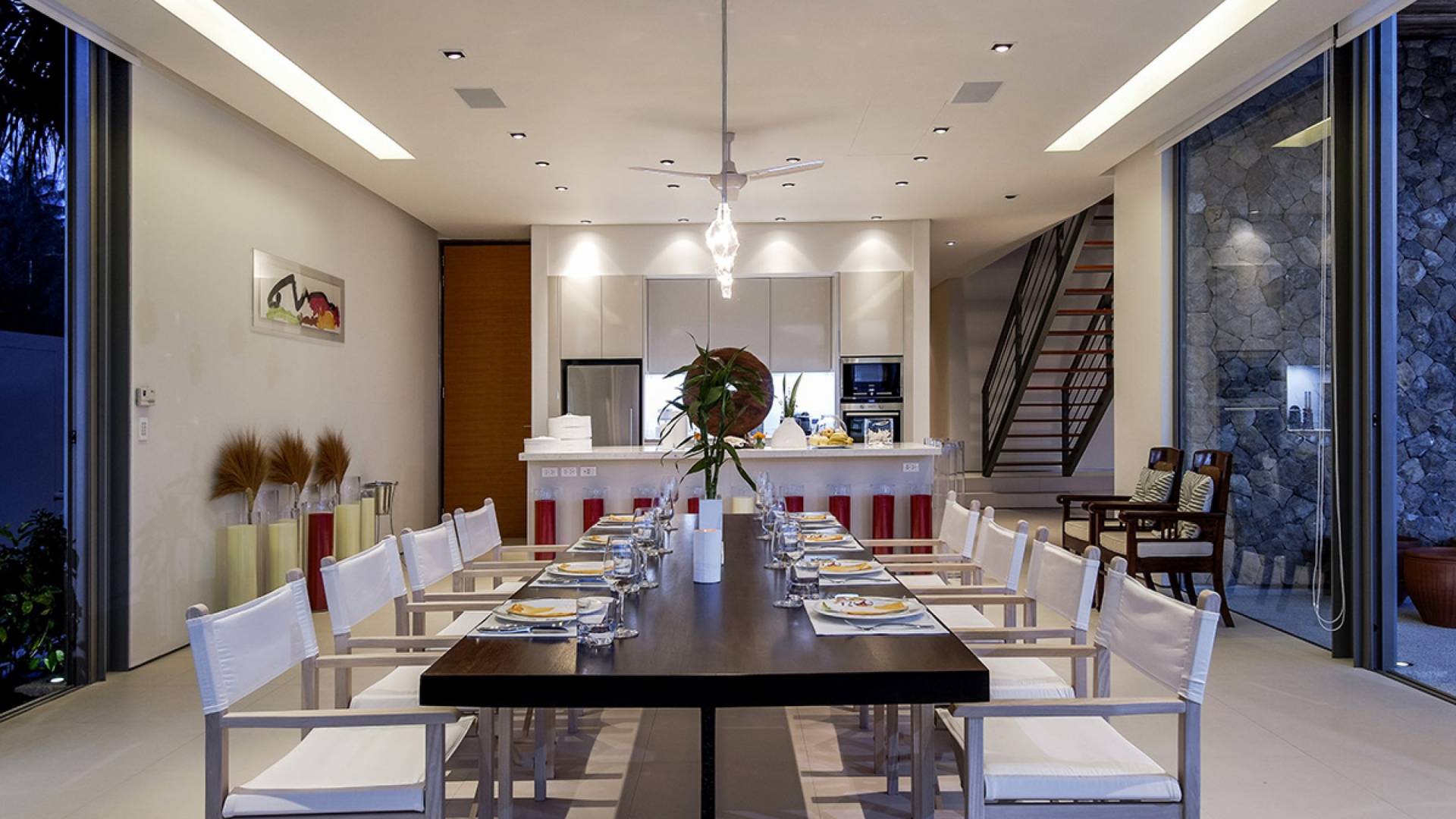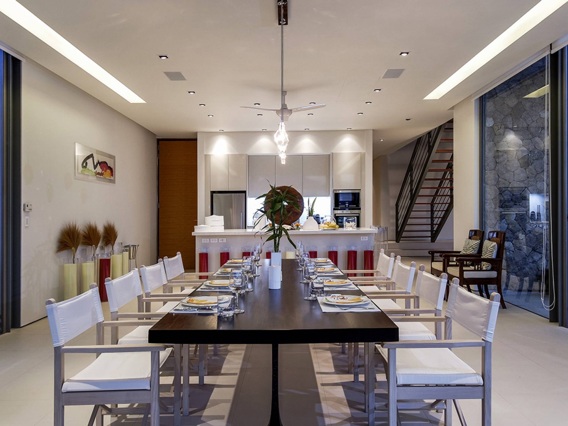 La zona giorno scorre verso la sala da pranzo e la moderna cucina per gli ospiti, dove il sole tropicale attraverso le porte in vetro dal pavimento al soffitto su tre lati illuminano la stanza con un bagliore dorato. Il tavolo da pranzo principale e un tavolino d'angolo insieme possono ospitare fino a 14 persone. La sala TV disseminata di sacchi di fagioli e un divano di grandi dimensioni è un luogo divertente e accogliente dove le famiglie possono riunirsi e può essere chiusa da porte scorrevoli in legno per una maggiore privacy.