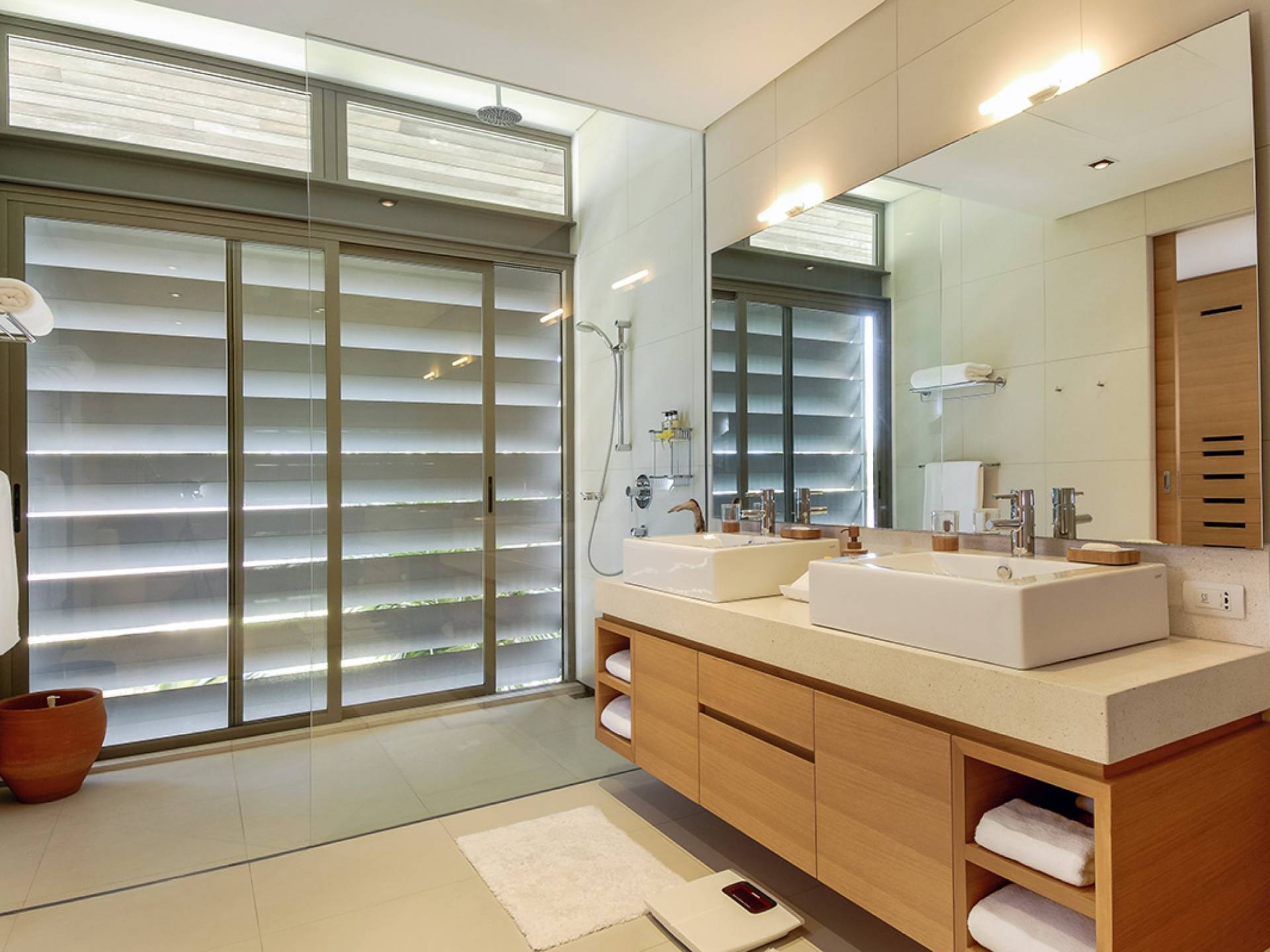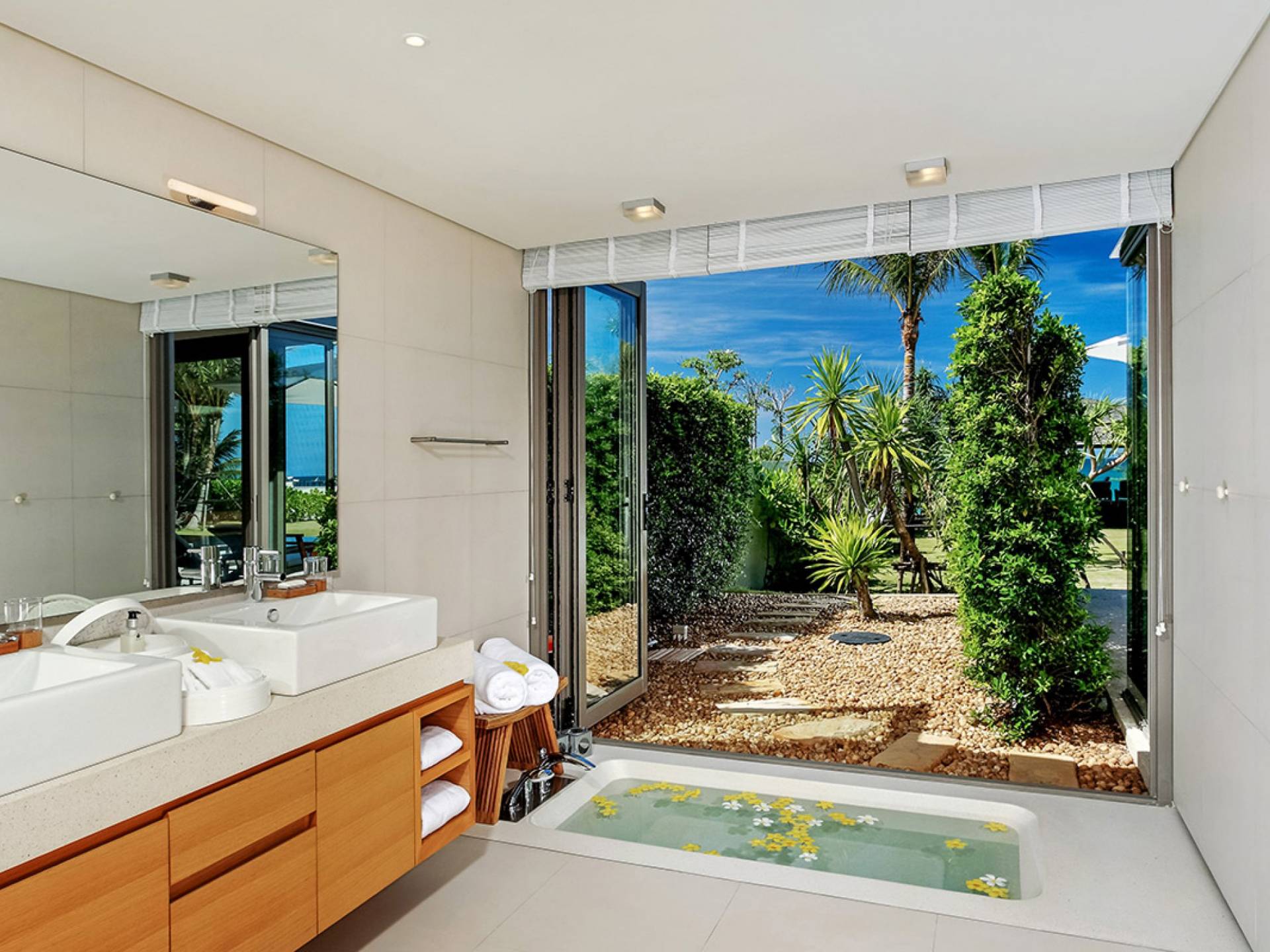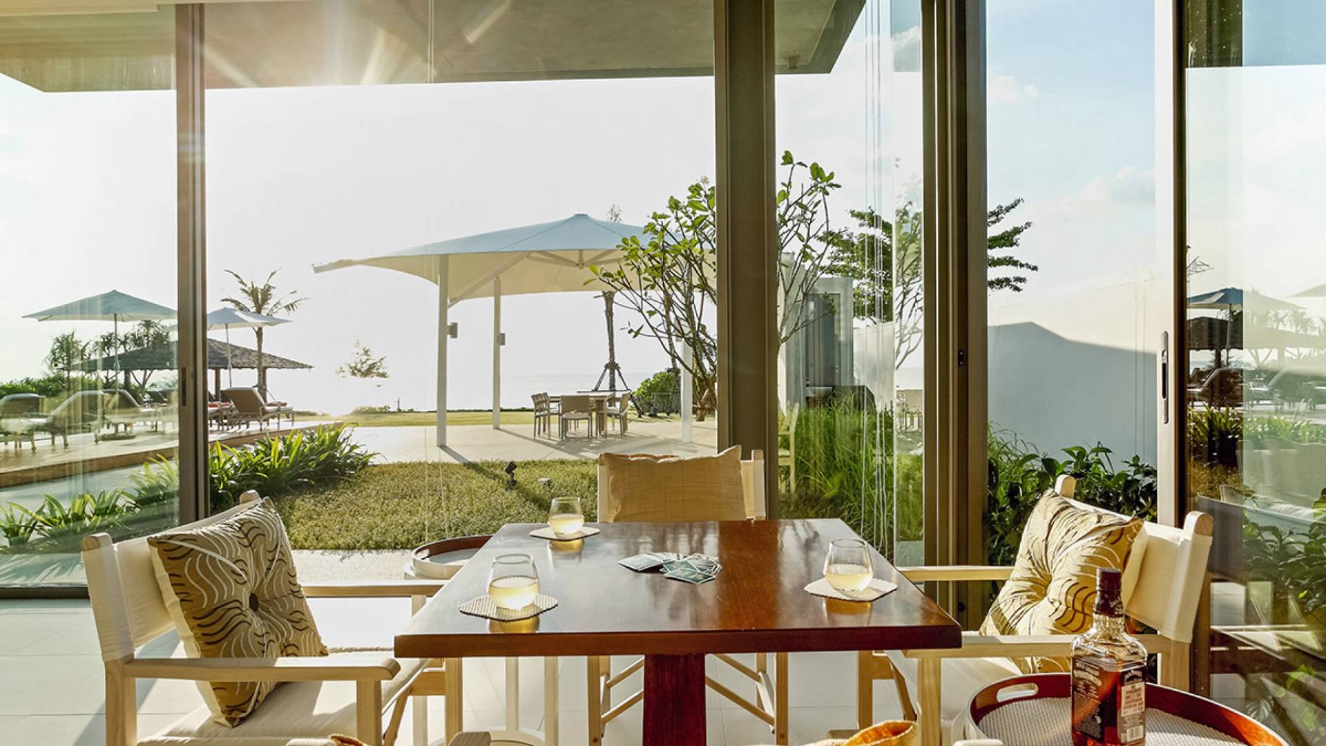La zona giorno scorre verso la sala da pranzo e la moderna cucina per gli ospiti, dove il sole tropicale attraverso le porte in vetro dal pavimento al soffitto su tre lati illuminano la stanza con un bagliore dorato. Il tavolo da pranzo principale e un tavolino d'angolo insieme possono ospitare fino a 14 persone. La sala TV disseminata di sacchi di fagioli e un divano di grandi dimensioni è un luogo divertente e accogliente dove le famiglie possono riunirsi e può essere chiusa da porte scorrevoli in legno per una maggiore privacy.