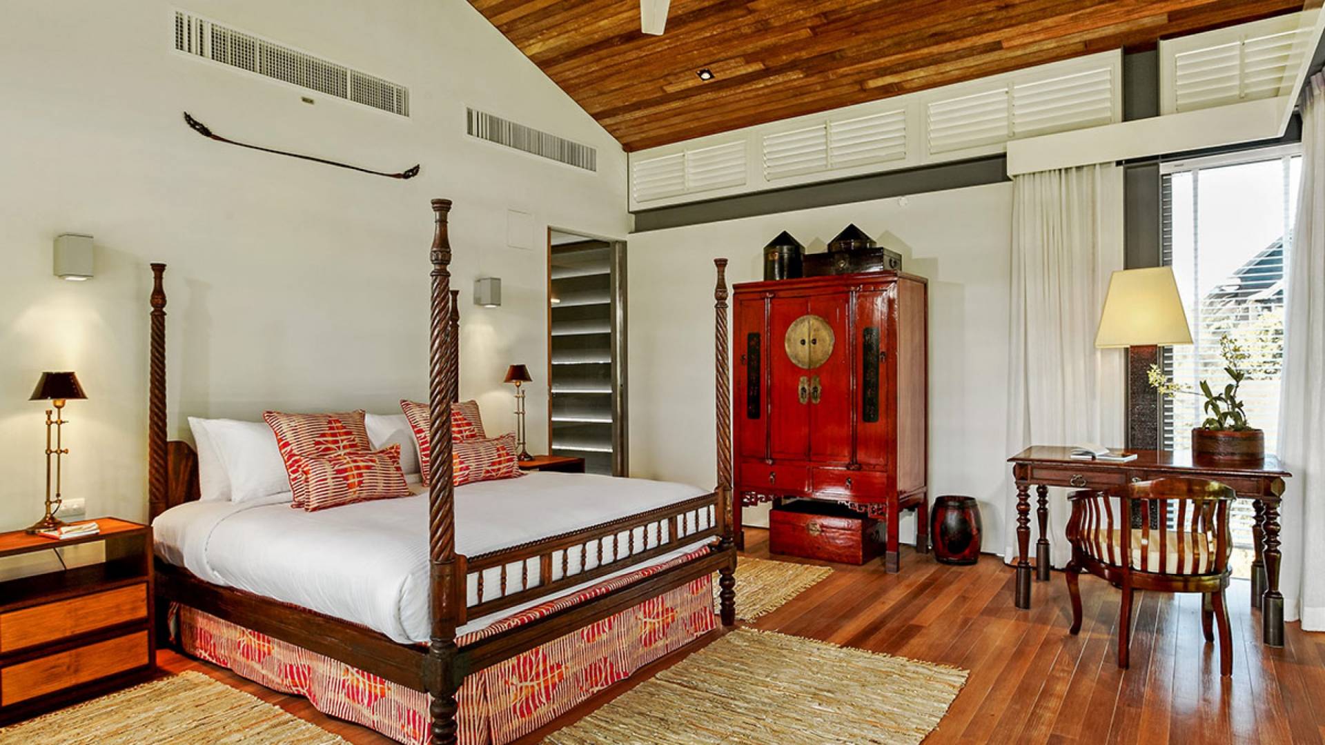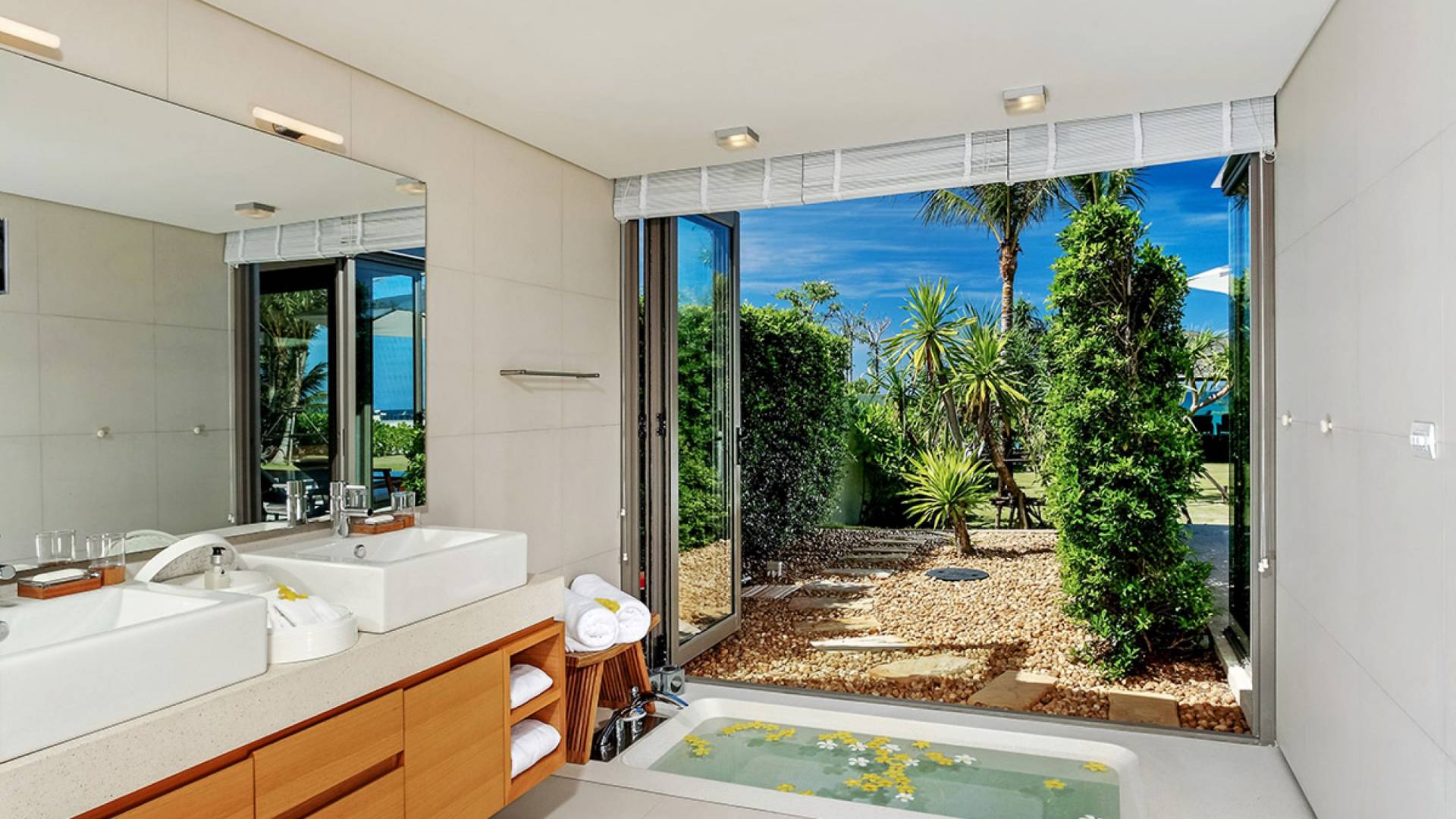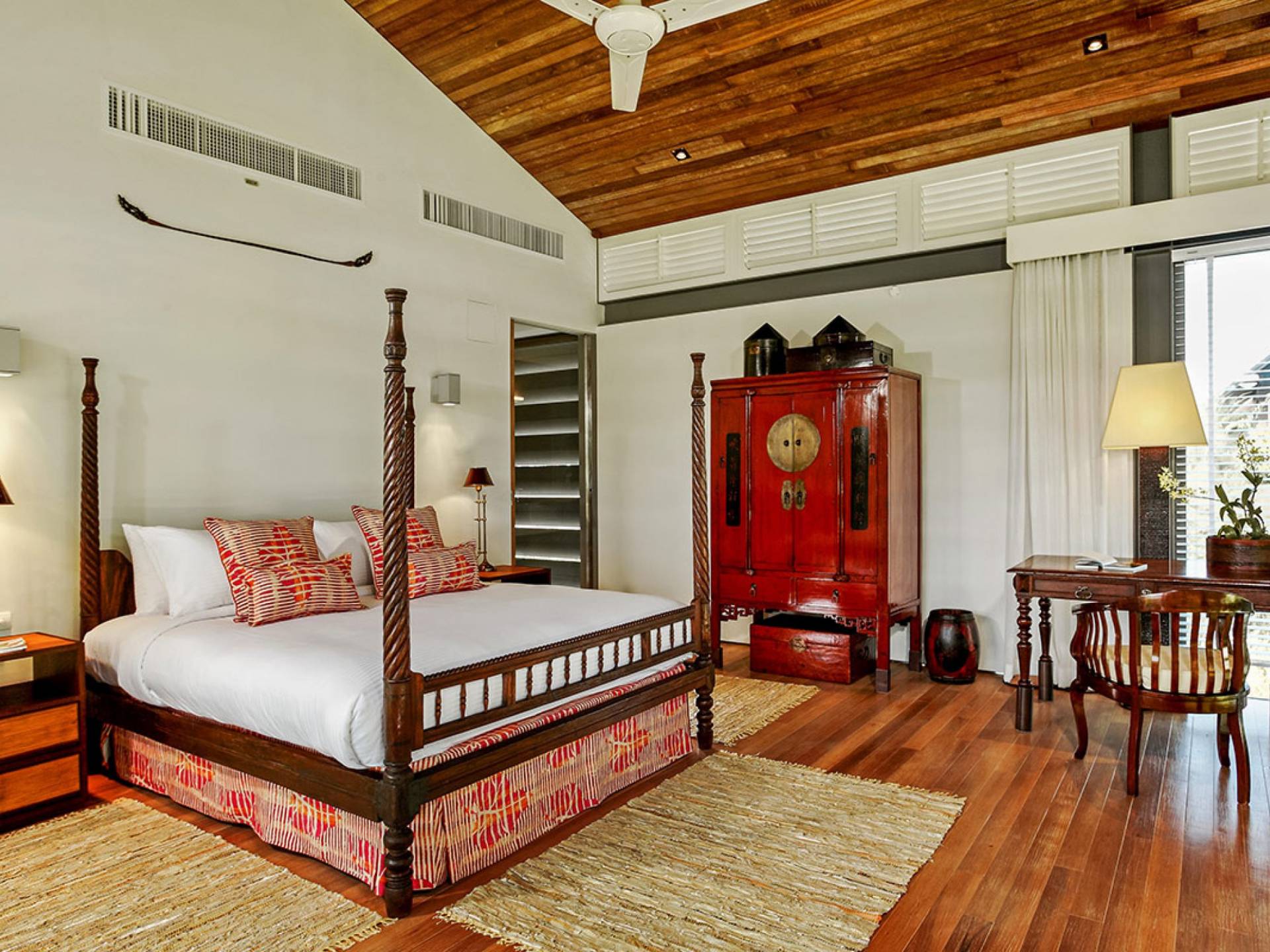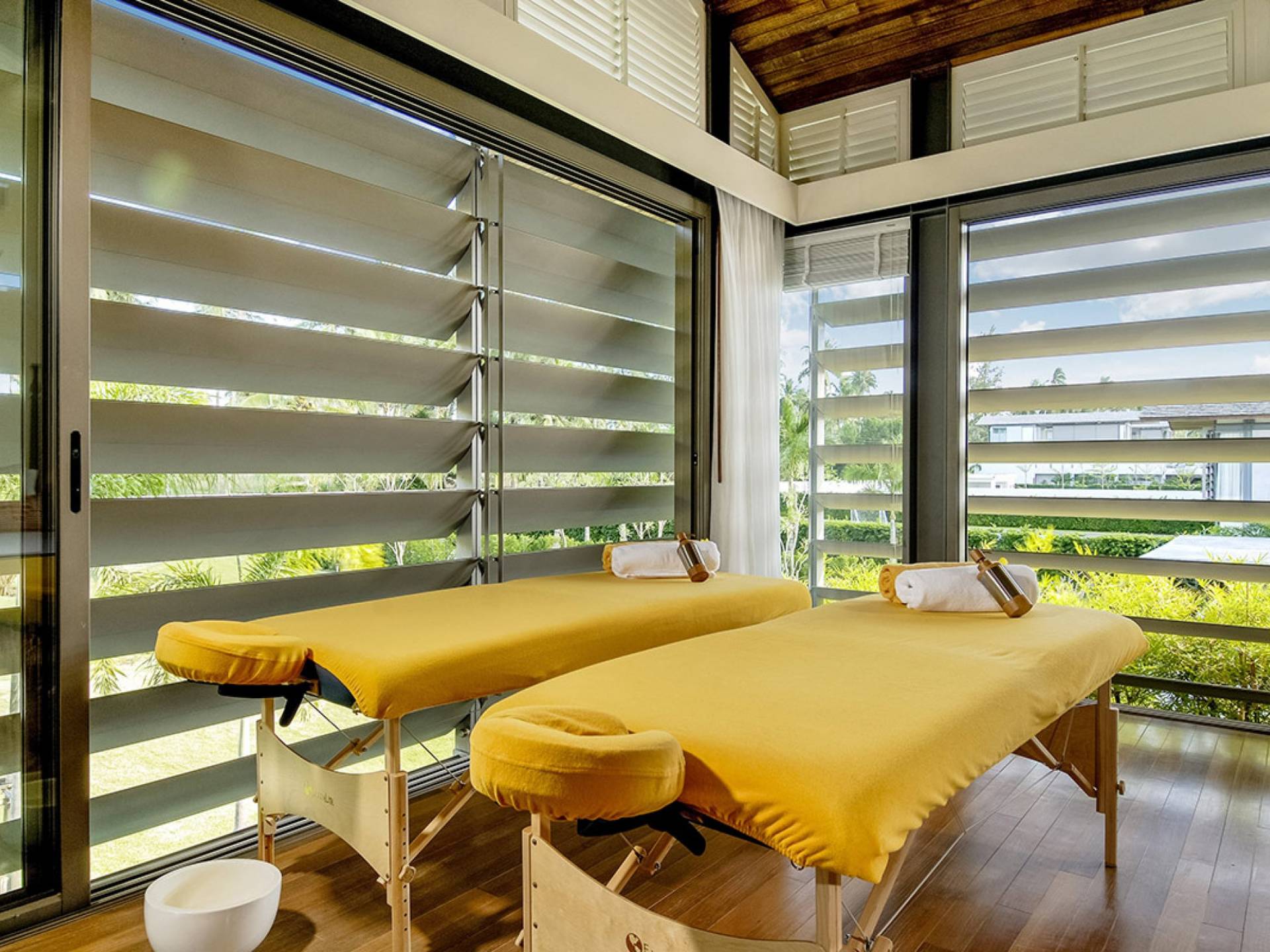 La zona giorno scorre verso la sala da pranzo e la moderna cucina per gli ospiti, dove il sole tropicale attraverso le porte in vetro dal pavimento al soffitto su tre lati illuminano la stanza con un bagliore dorato. Il tavolo da pranzo principale e un tavolino d'angolo insieme possono ospitare fino a 14 persone. La sala TV disseminata di sacchi di fagioli e un divano di grandi dimensioni è un luogo divertente e accogliente dove le famiglie possono riunirsi e può essere chiusa da porte scorrevoli in legno per una maggiore privacy.