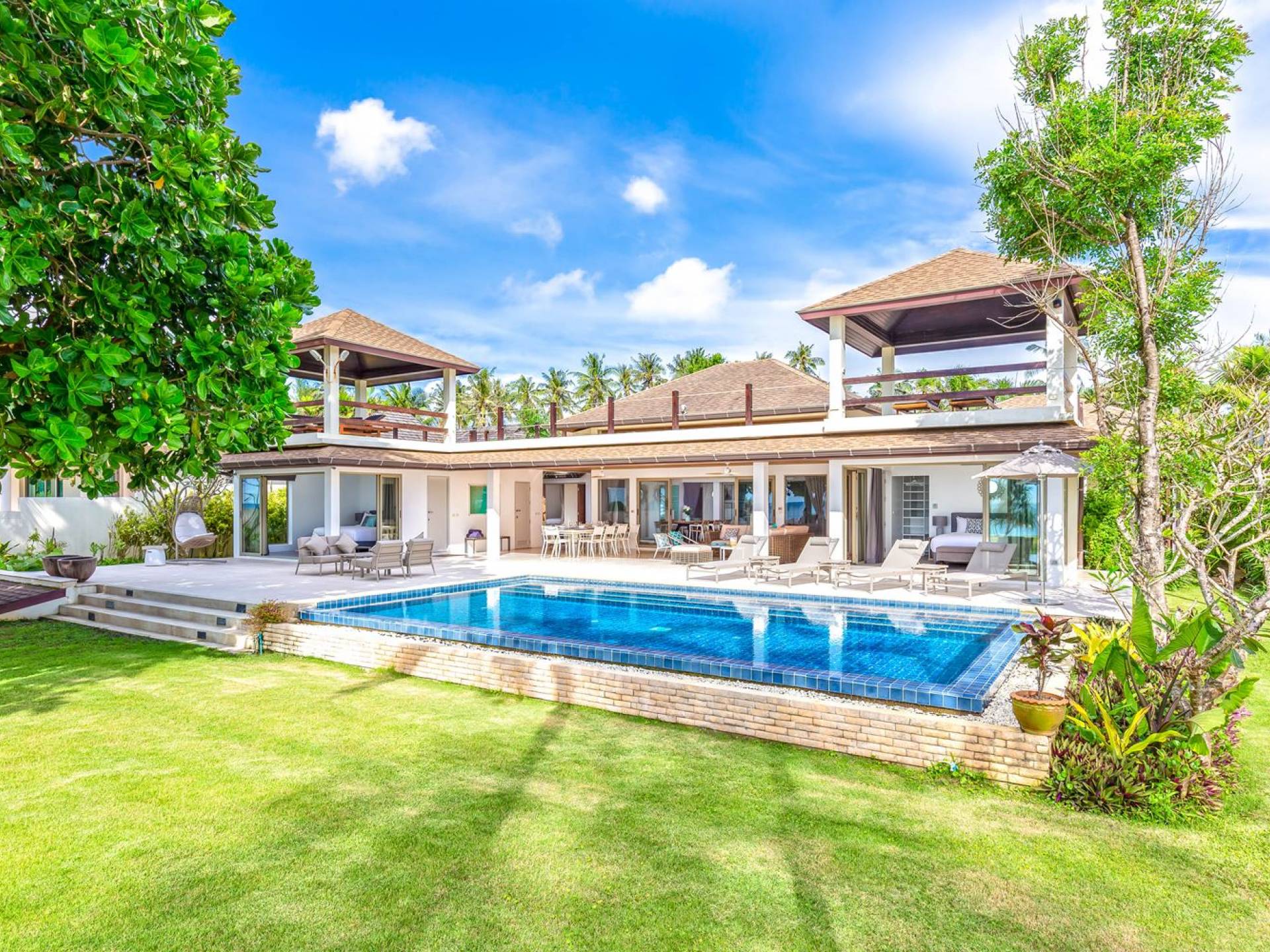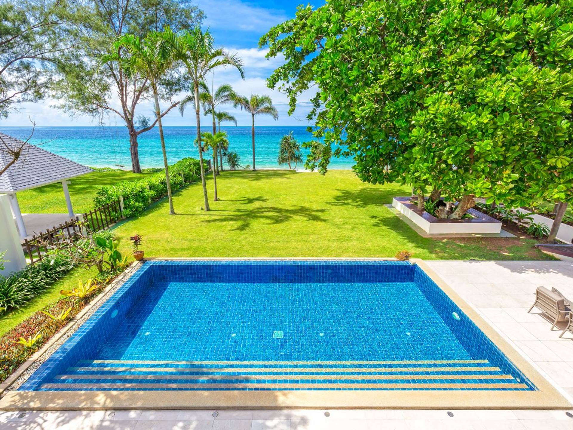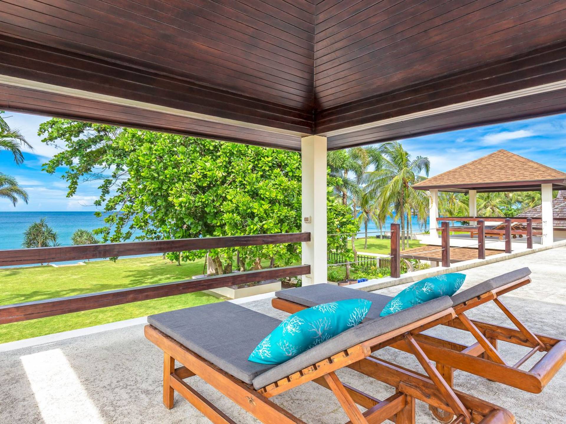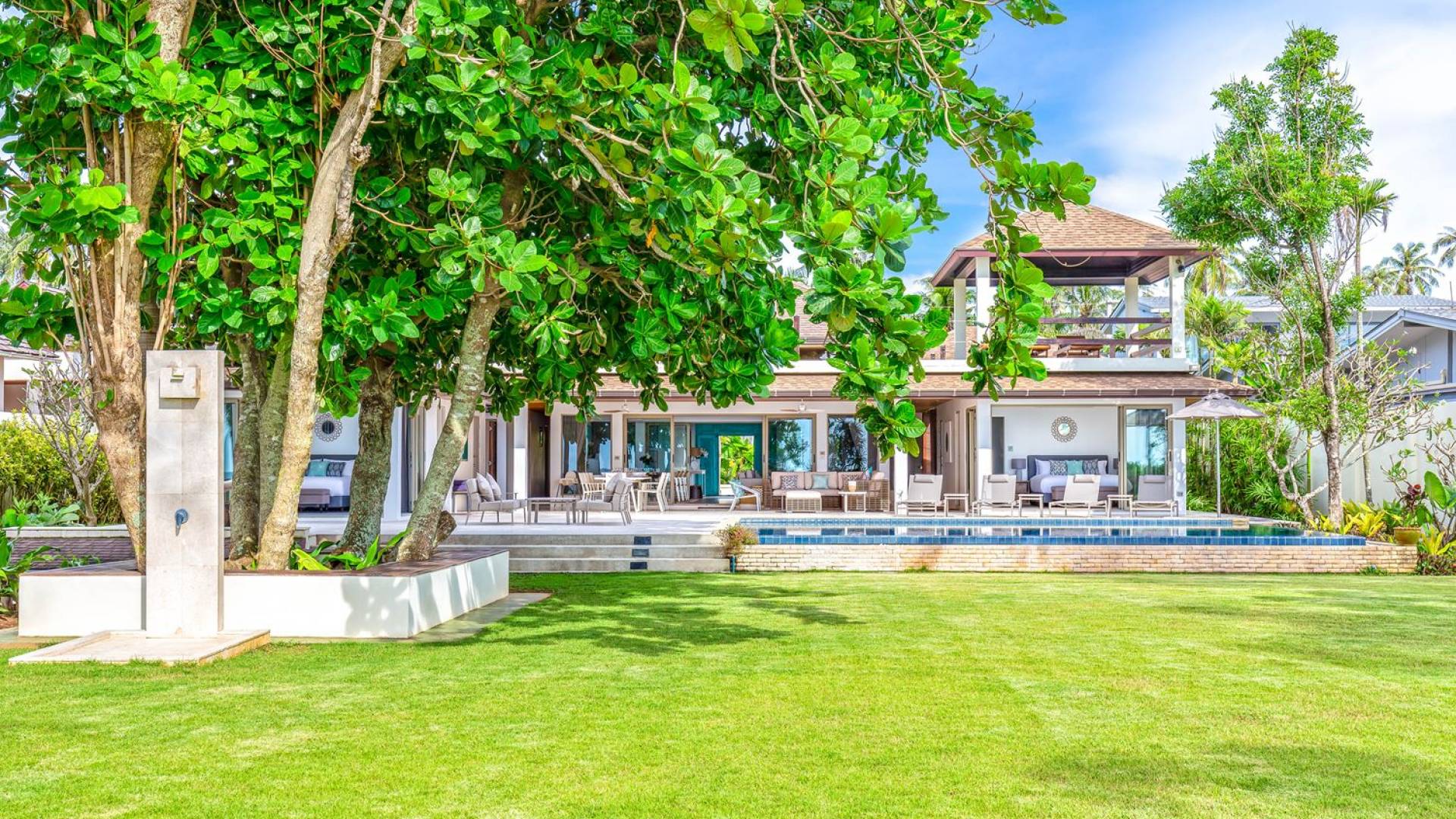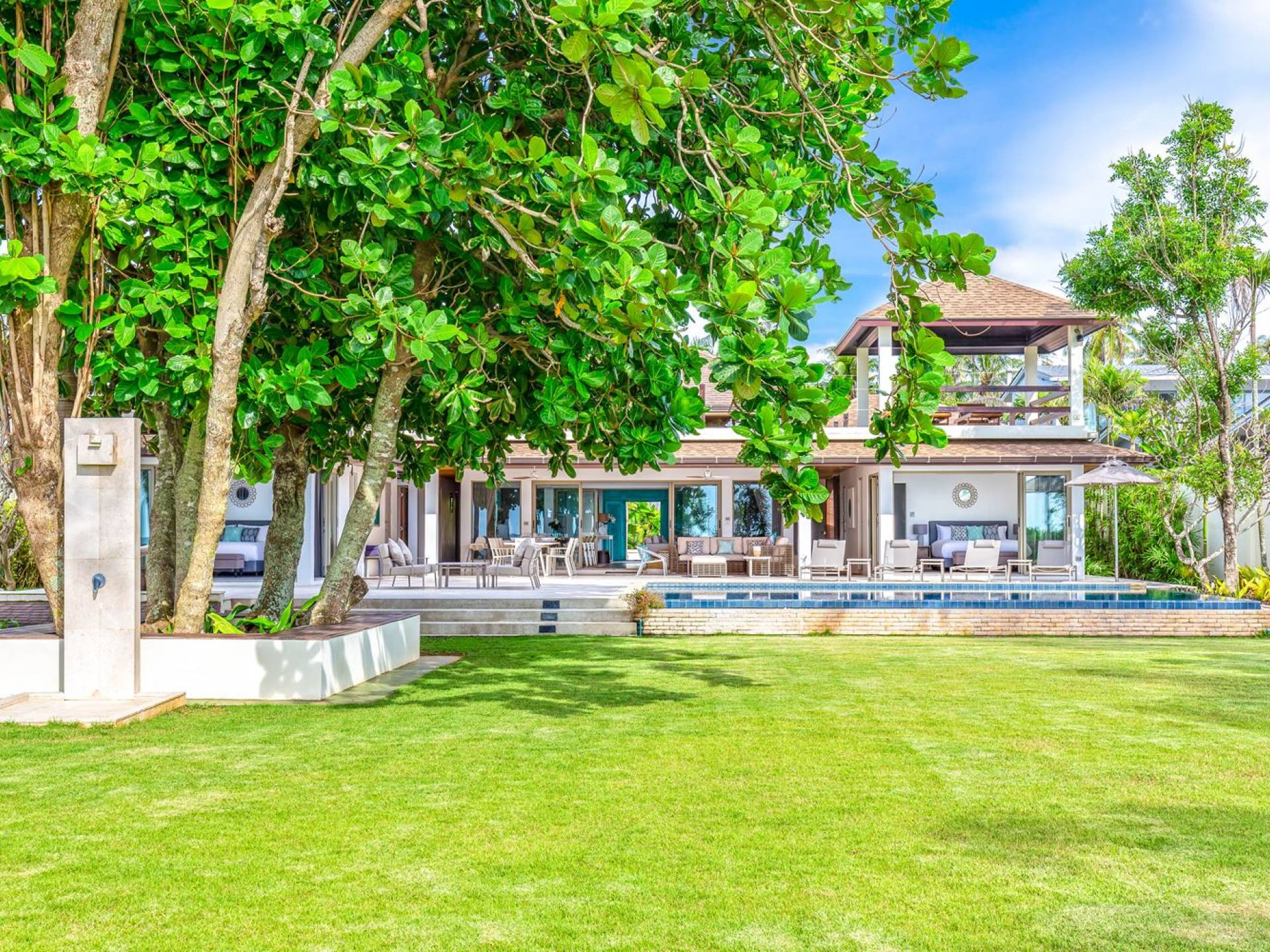 Il giardino ben curato separa la casa dalla spiaggia. Quattro alberi di Barringtonia Asiatica al centro forniscono un'ombra di benvenuto e anche un'area salotto sotto di loro. C'è spazio per allestire un campo da calcio o da badminton affinché tutti possano godersi alcune attività pomeridiane, o scendere in spiaggia prima del tramonto per una partita a bocce. Sono disponibili anche materassini da yoga per chi ama il saluto al sole e la meditazione al mattino presto. Una rimessa per barche situata sotto il giardino ospita un kayak, una tavola da windsurf e una tavola da boogie che sono ad uso gratuito per tutti gli ospiti.