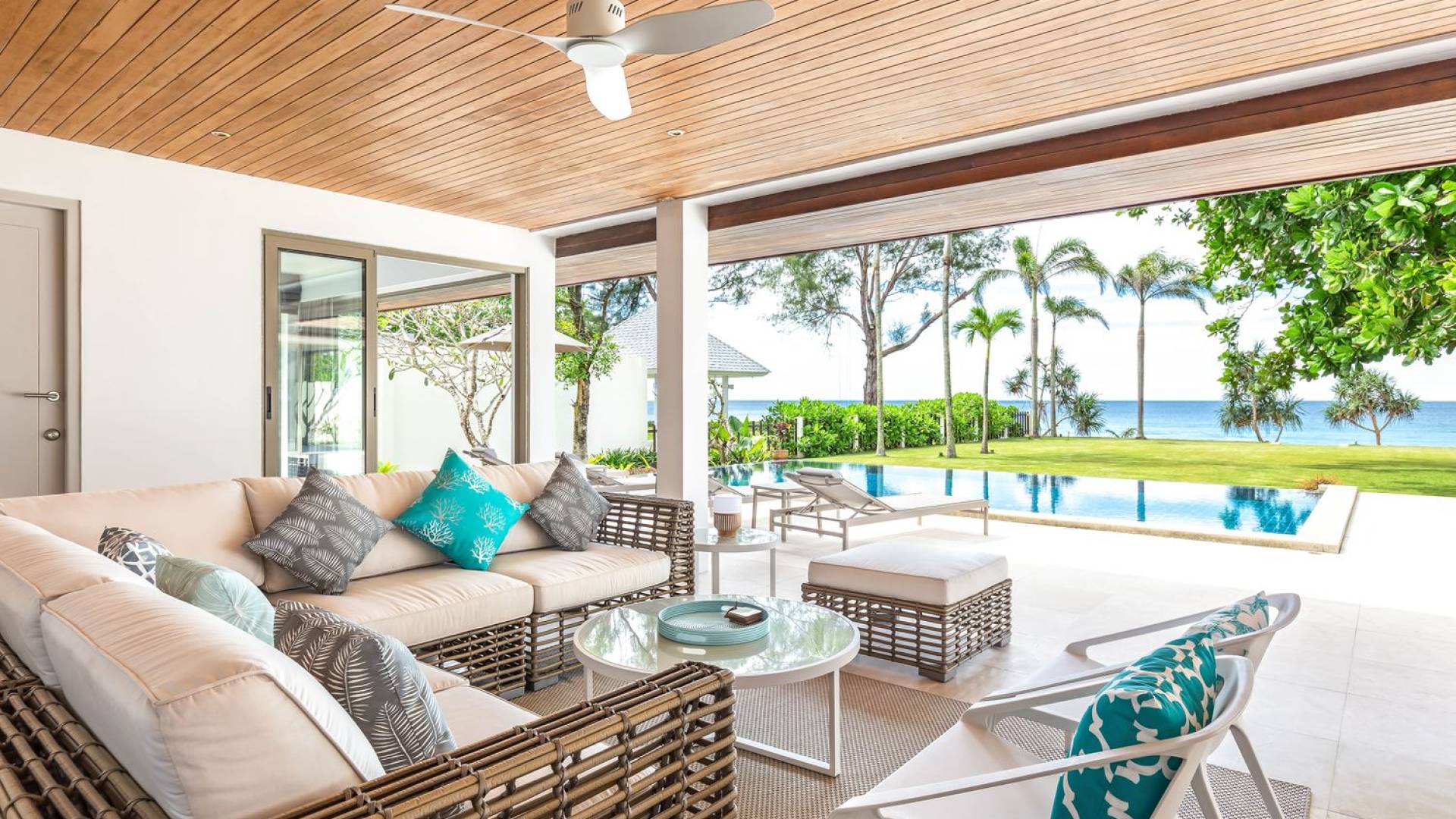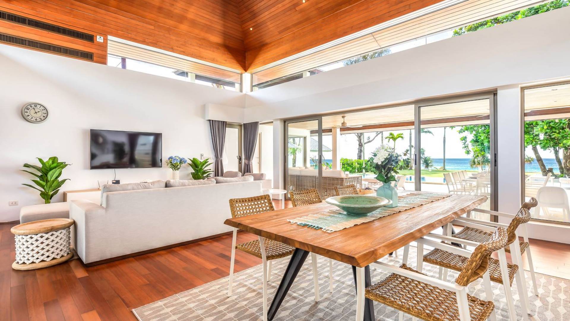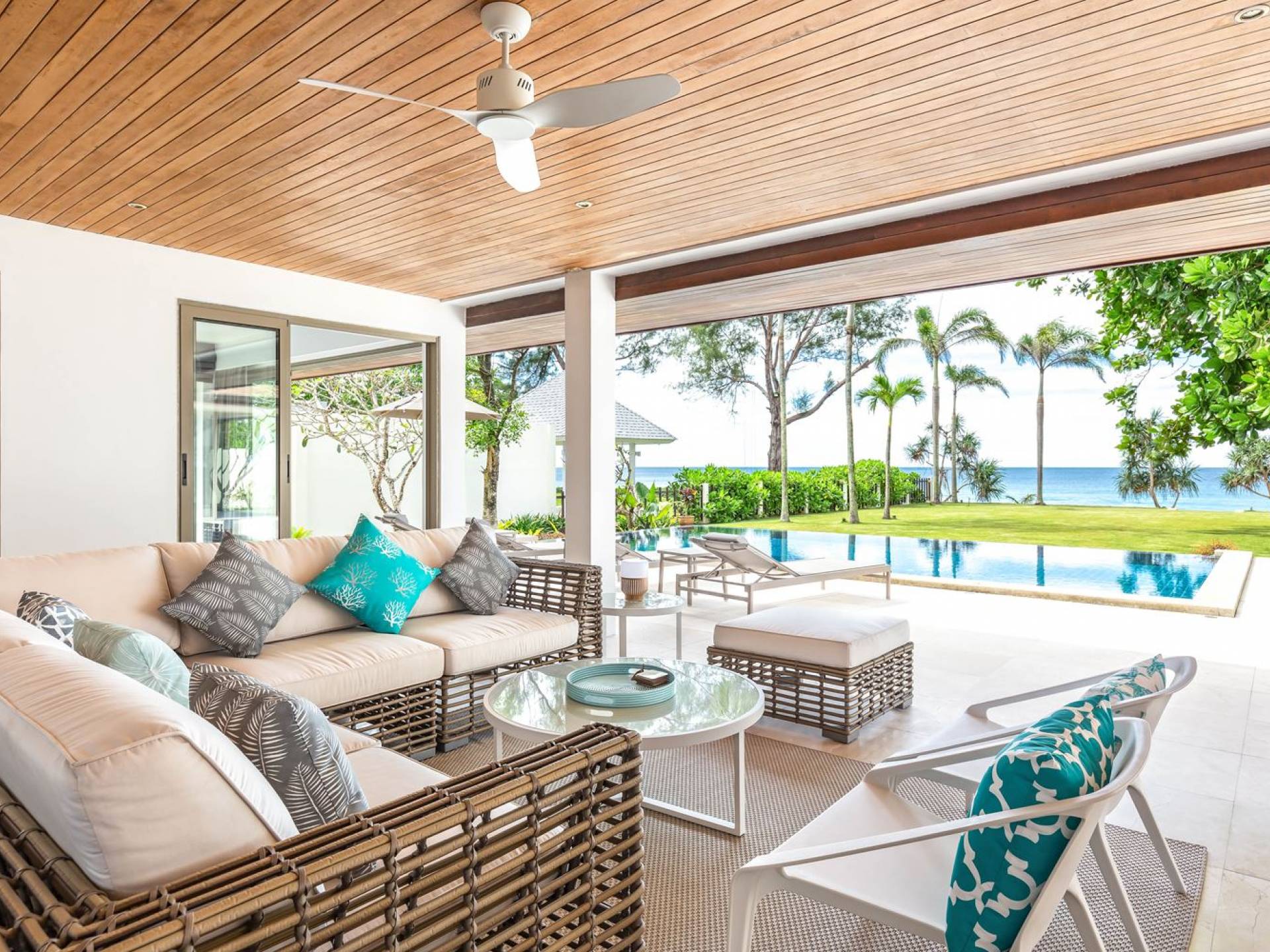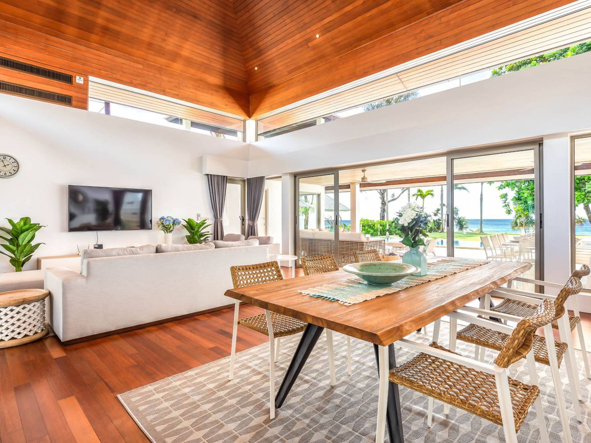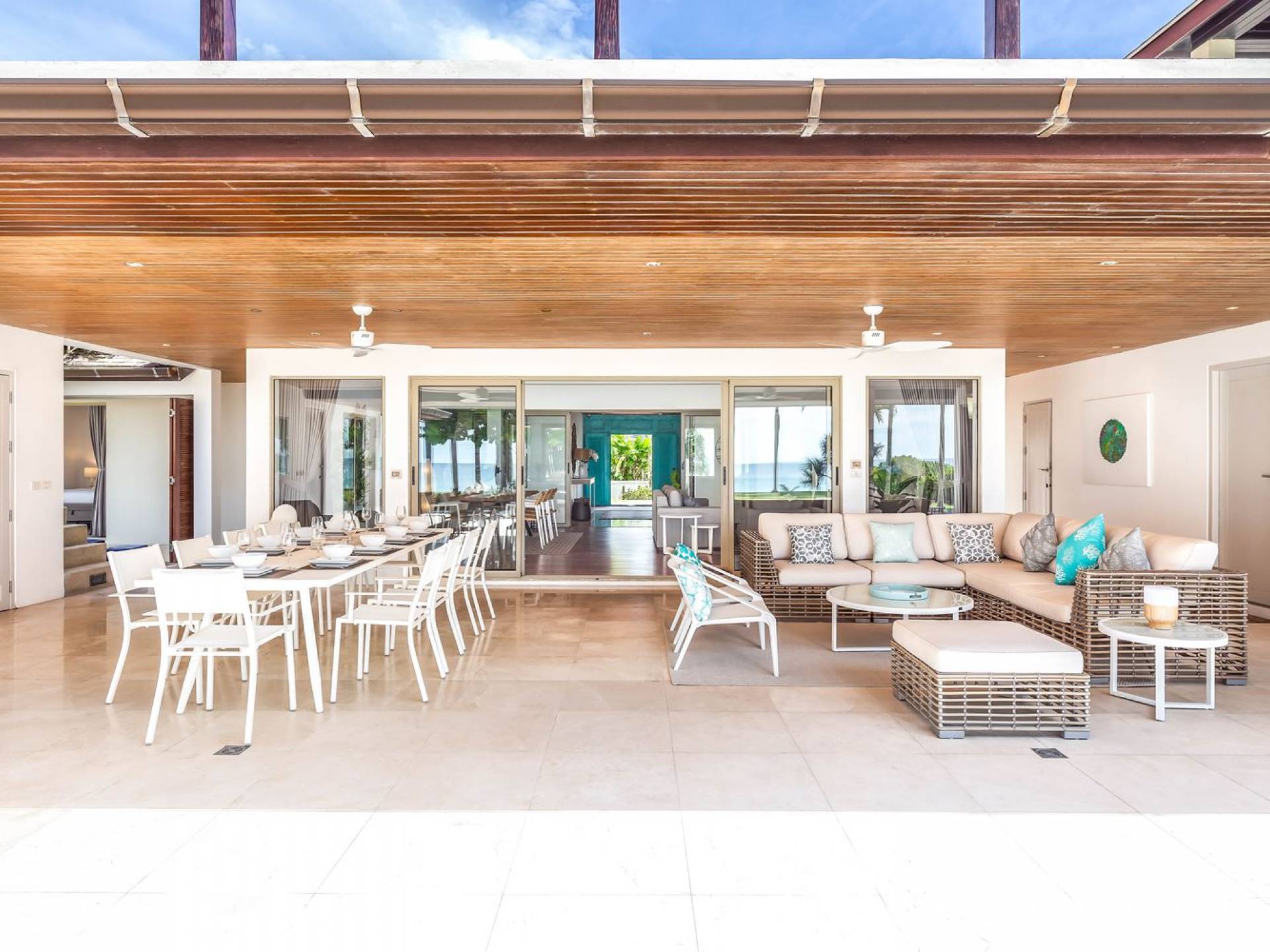 Il punto focale della villa è la vasta terrazza esterna coperta che si affaccia sul rigoglioso giardino e sull'oceano. Un tavolo da pranzo in stile moderno può ospitare 10 persone e significa che la maggior parte dei pasti sarà gustata "al fresco". Un'area salotto separata ti dà la possibilità di sederti e rilassarti mentre guardi il tramonto. La piscina si trova sulla terrazza ed è circondata da lettini prendisole.