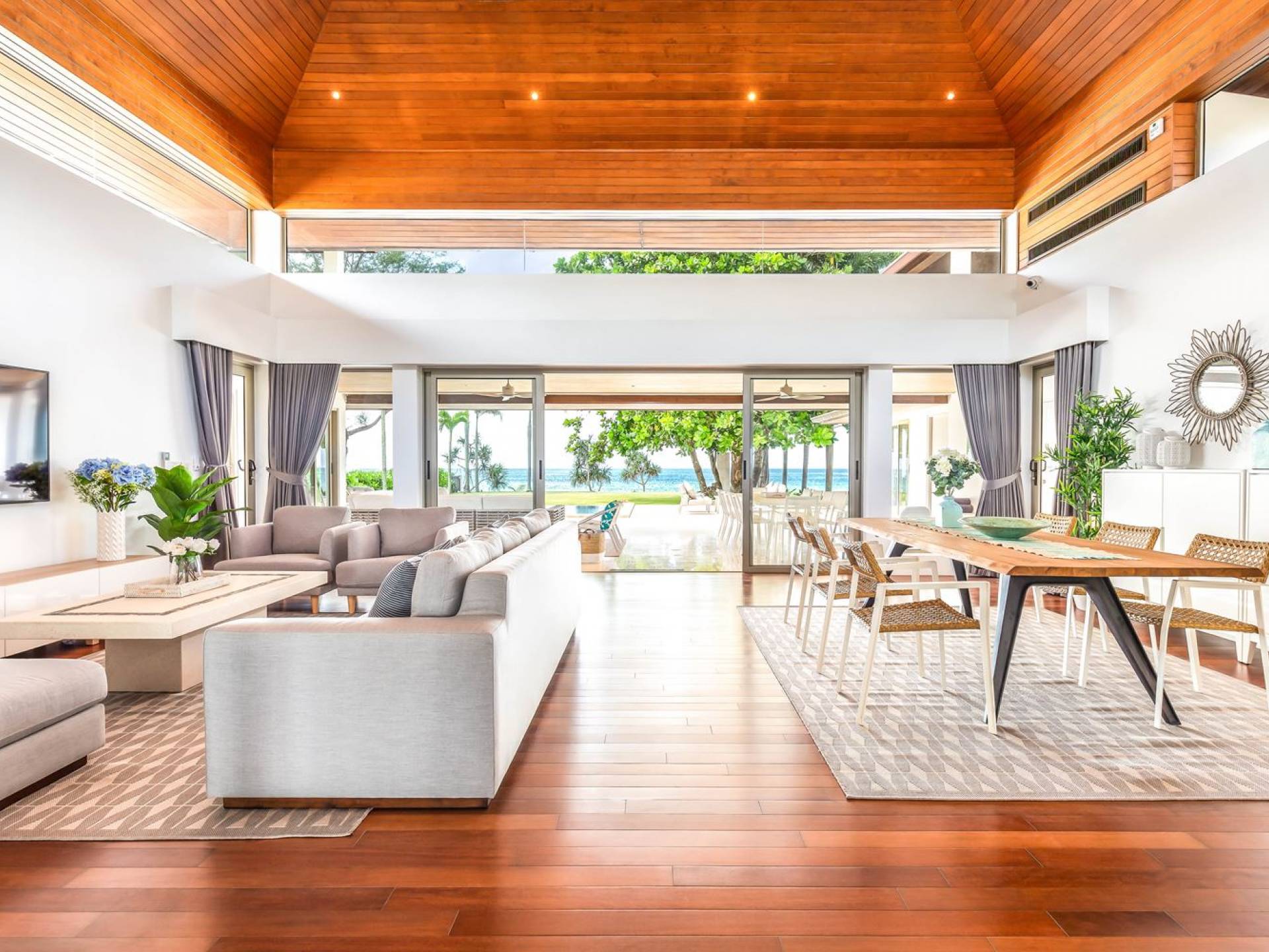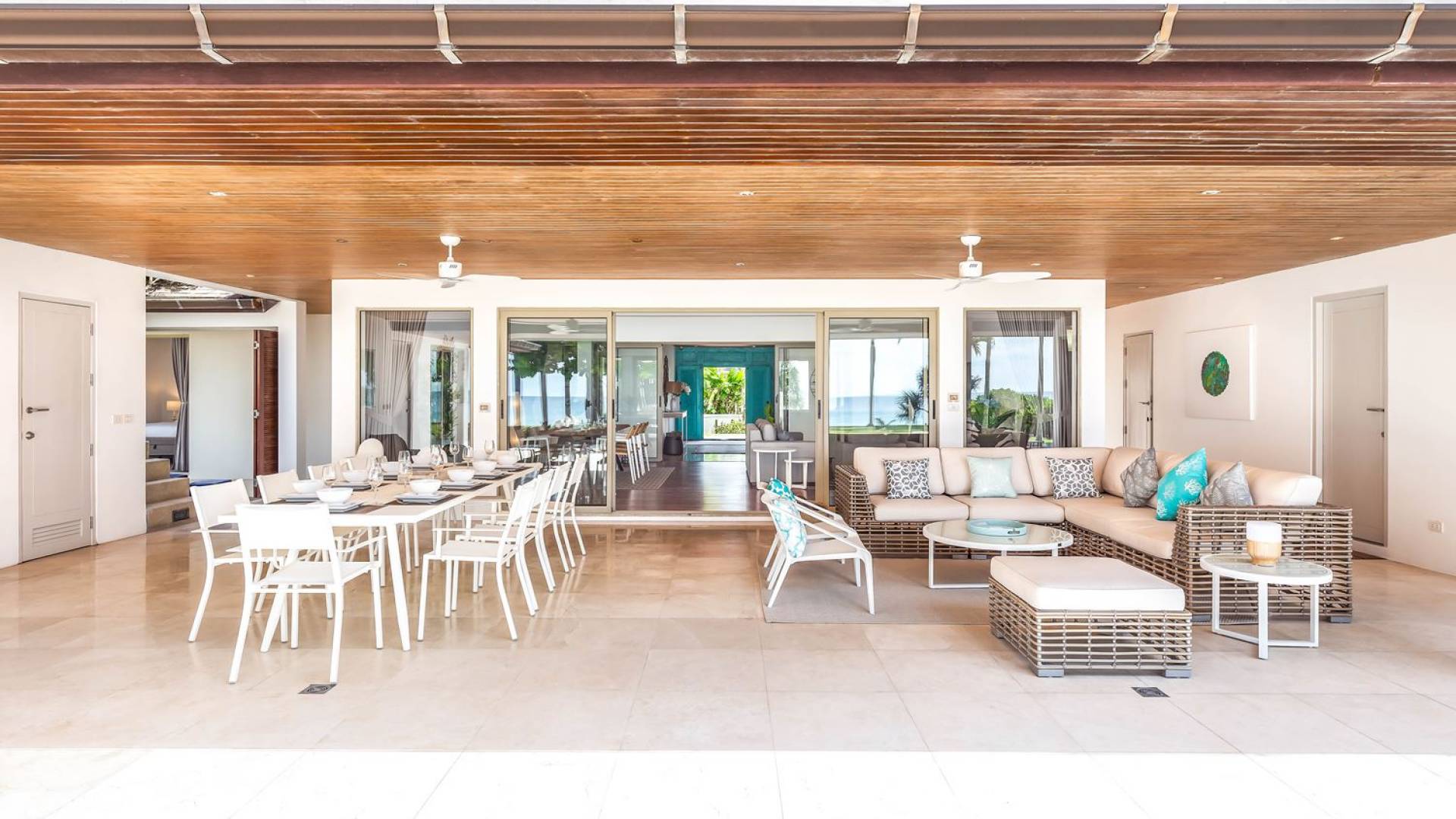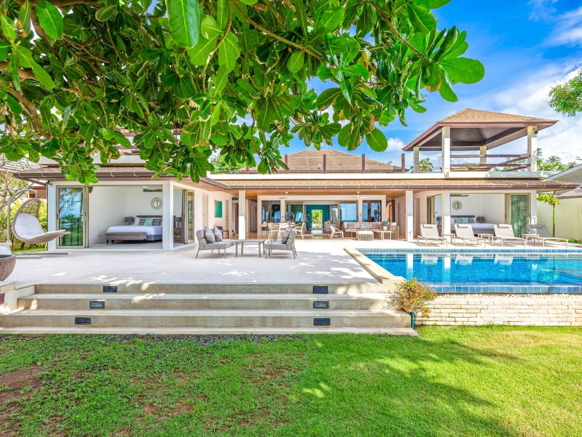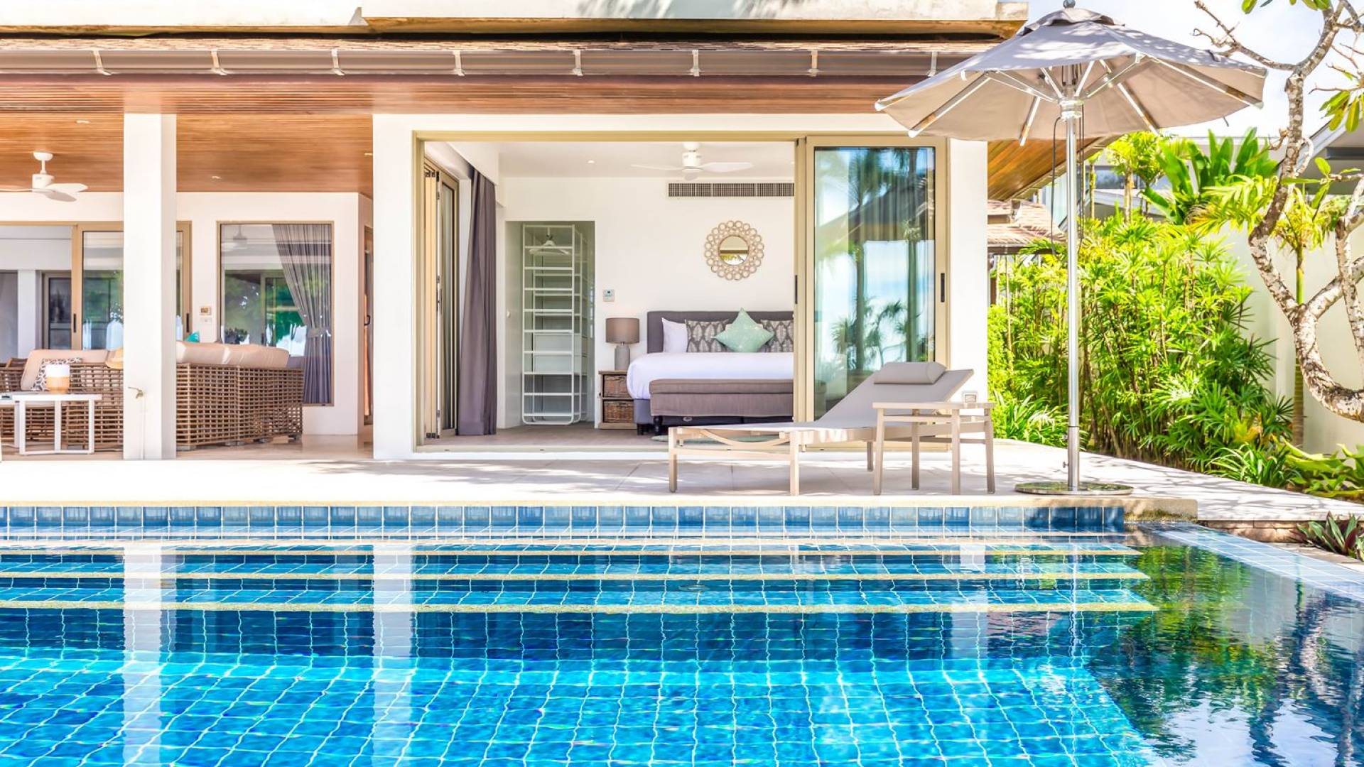Il punto focale della villa è la vasta terrazza esterna coperta che si affaccia sul rigoglioso giardino e sull'oceano. Un tavolo da pranzo in stile moderno può ospitare 10 persone e significa che la maggior parte dei pasti sarà gustata "al fresco". Un'area salotto separata ti dà la possibilità di sederti e rilassarti mentre guardi il tramonto. La piscina si trova sulla terrazza ed è circondata da lettini prendisole.