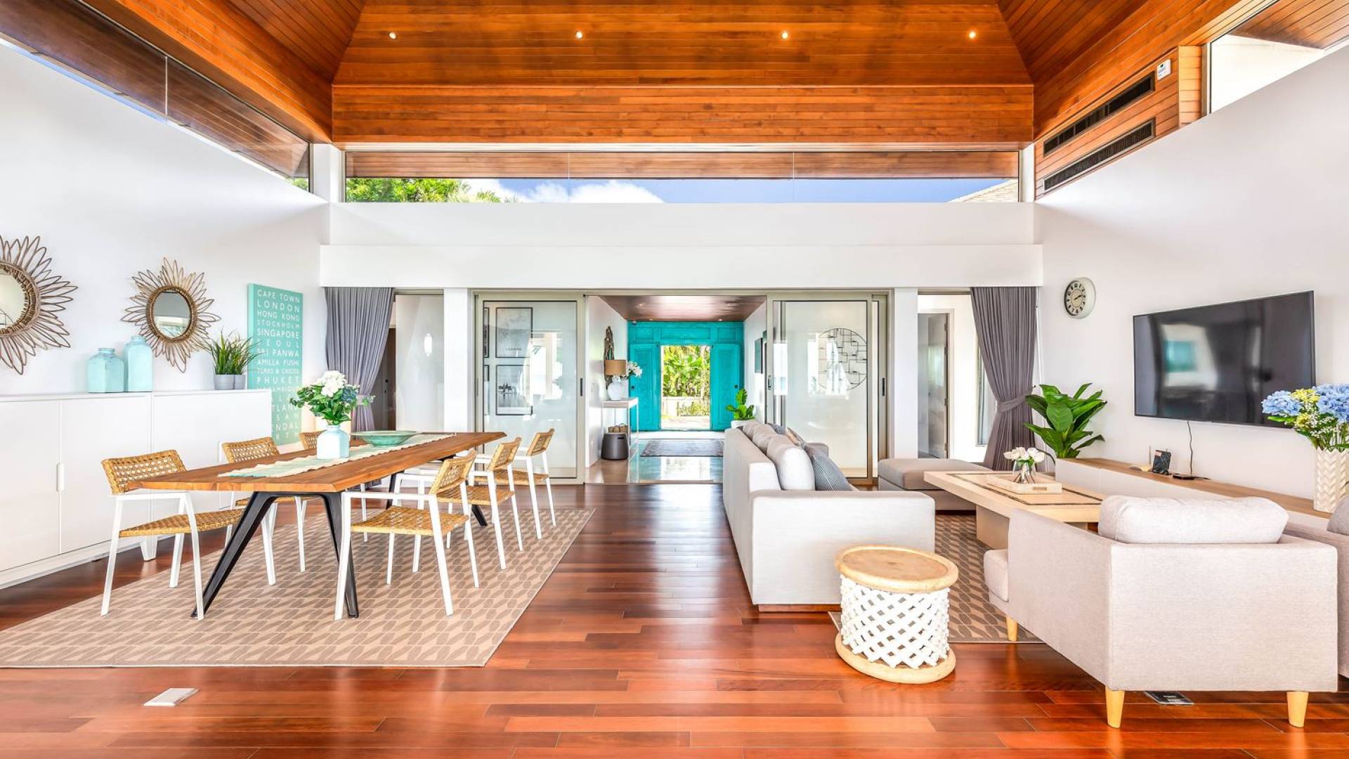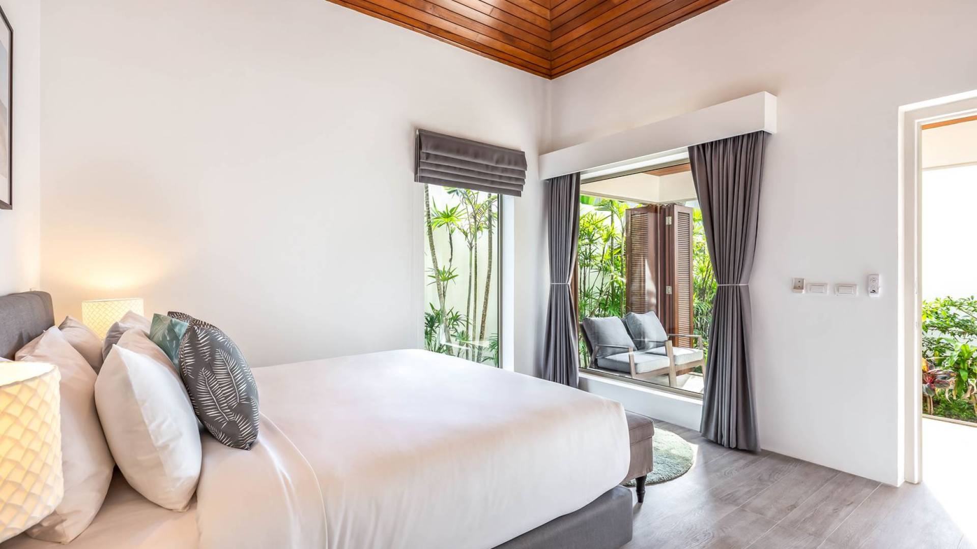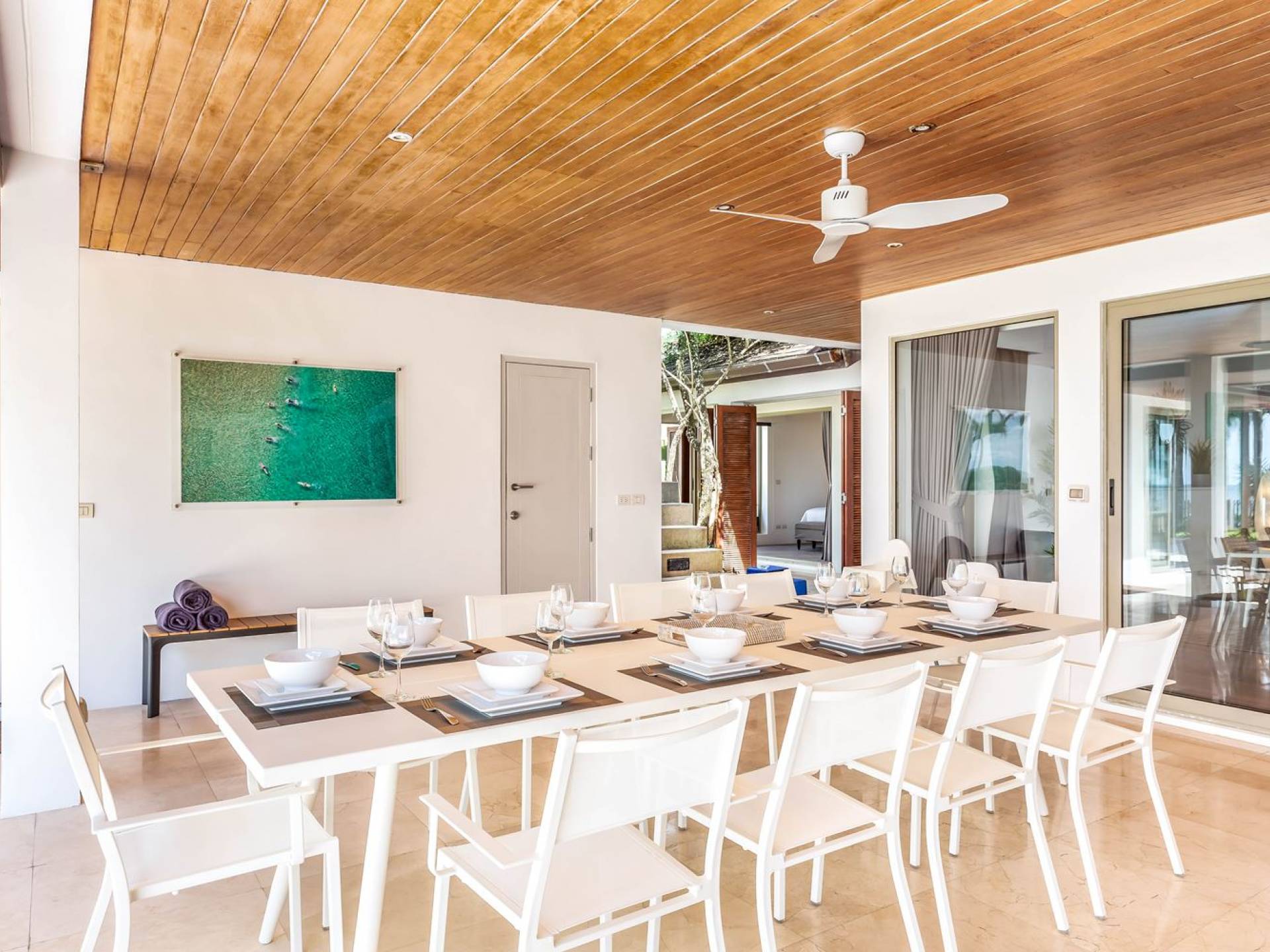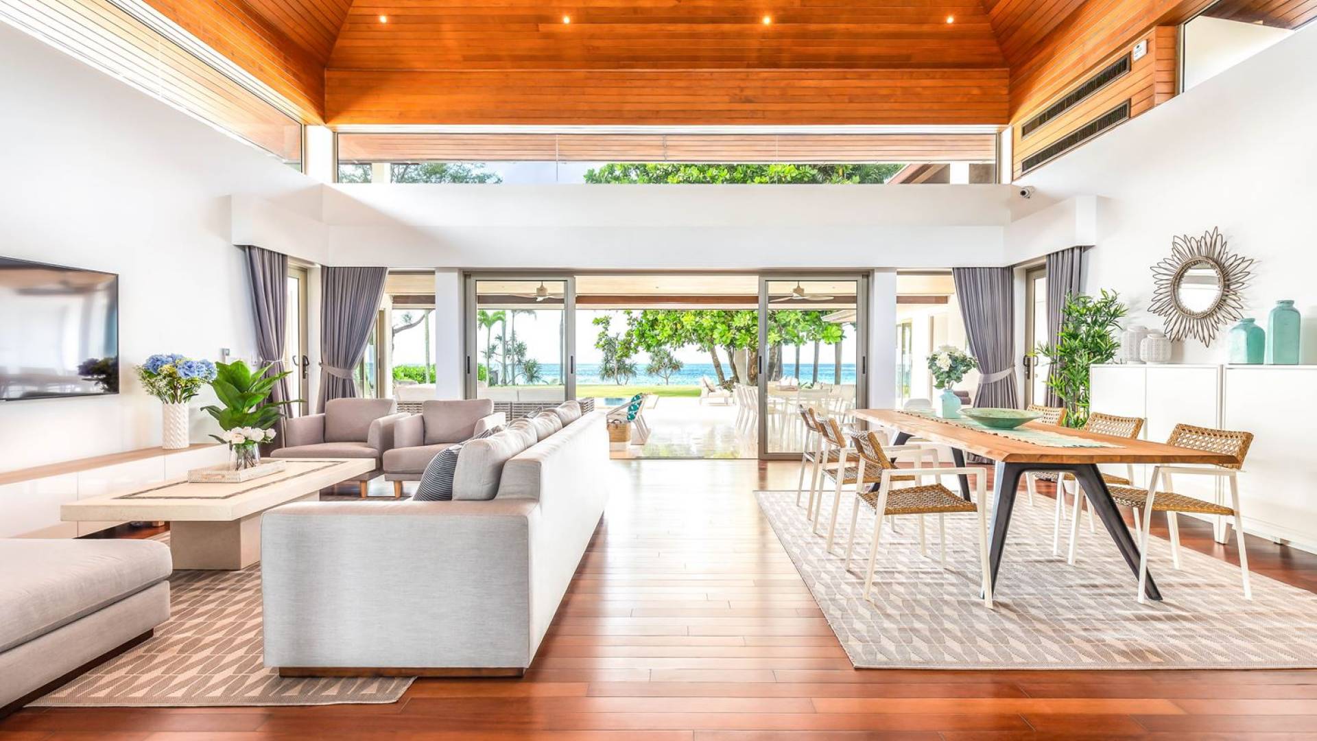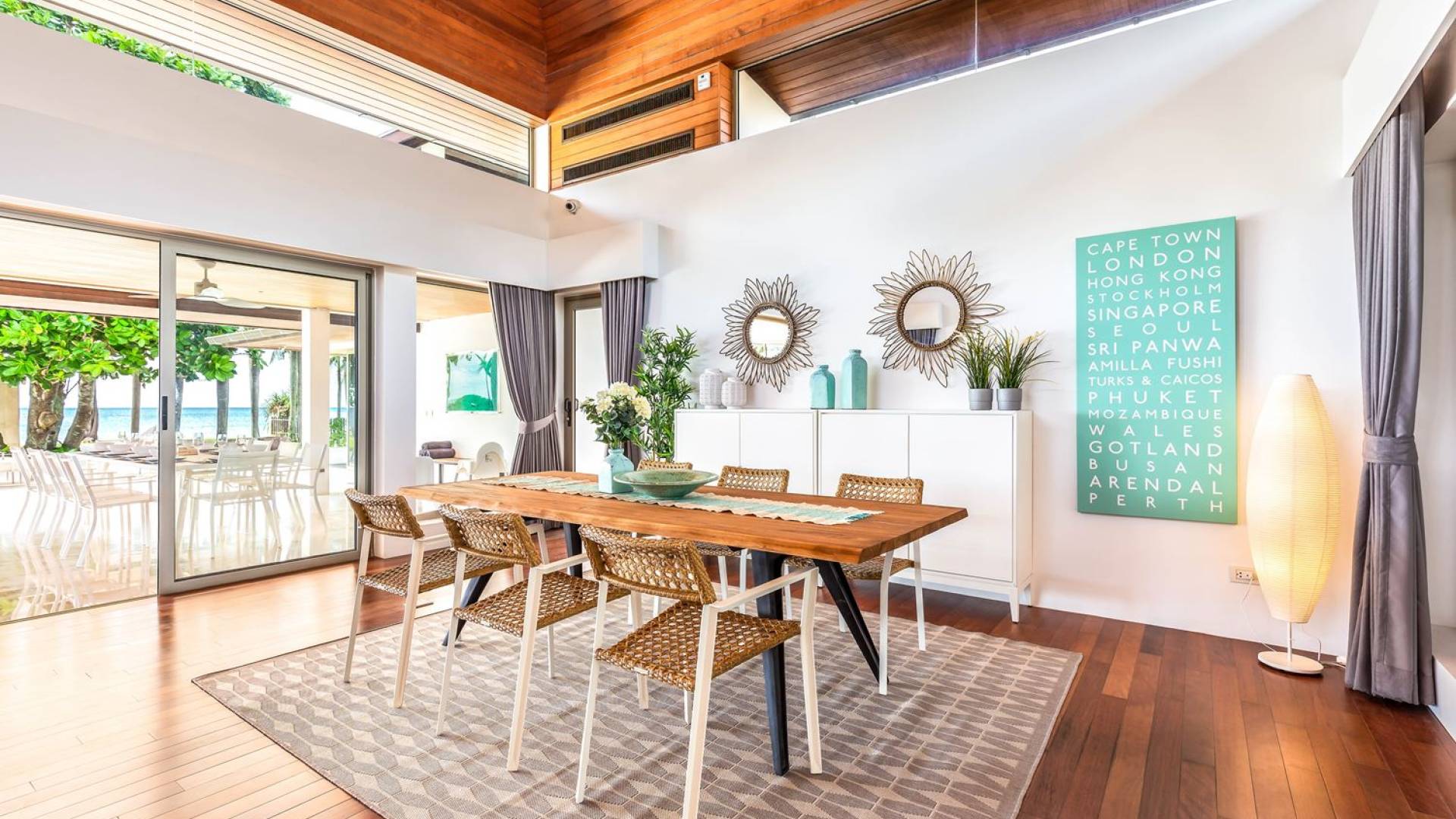 Il punto focale della villa è la vasta terrazza esterna coperta che si affaccia sul rigoglioso giardino e sull'oceano. Un tavolo da pranzo in stile moderno può ospitare 10 persone e significa che la maggior parte dei pasti sarà gustata "al fresco". Un'area salotto separata ti dà la possibilità di sederti e rilassarti mentre guardi il tramonto. La piscina si trova sulla terrazza ed è circondata da lettini prendisole.
