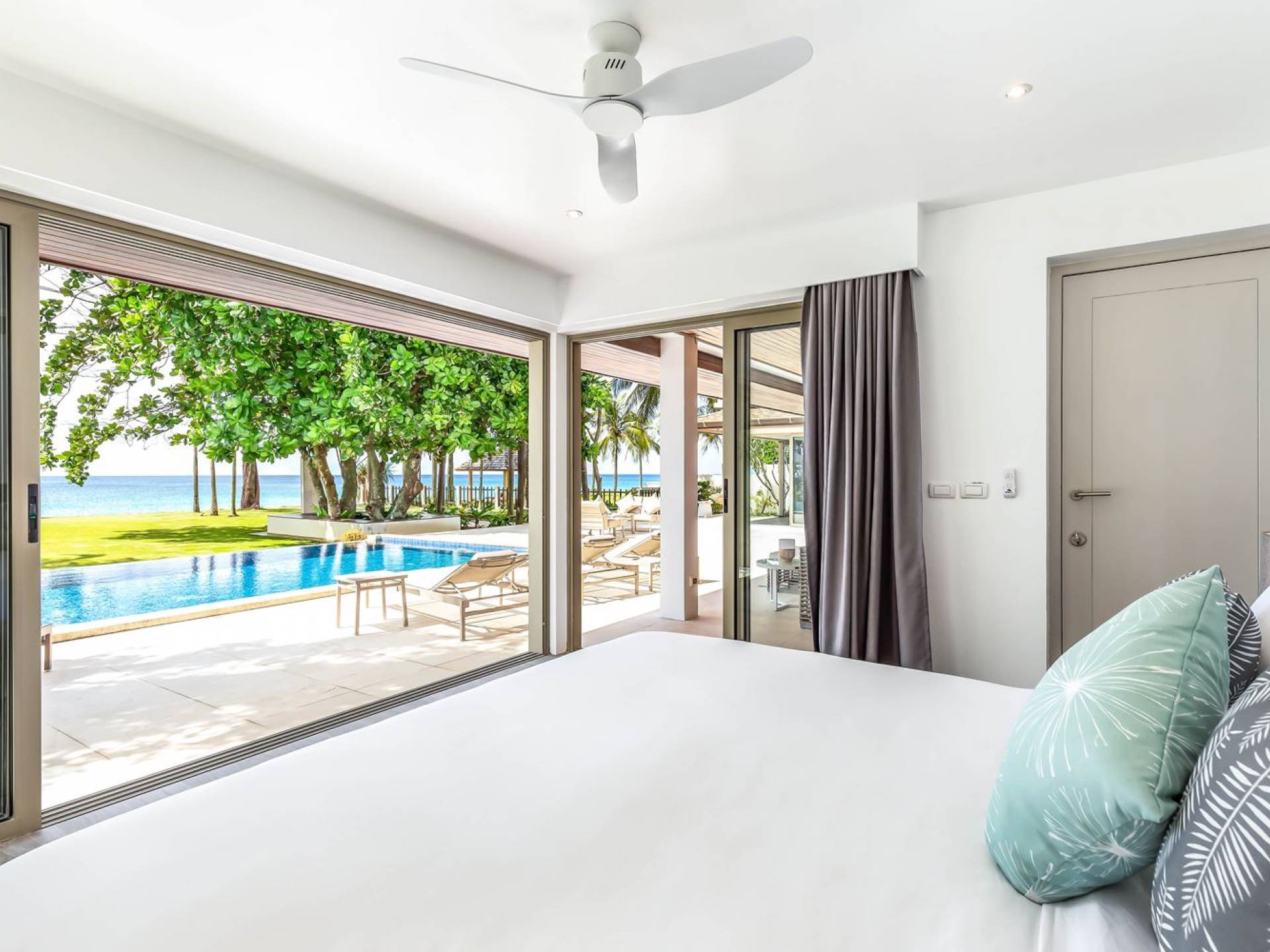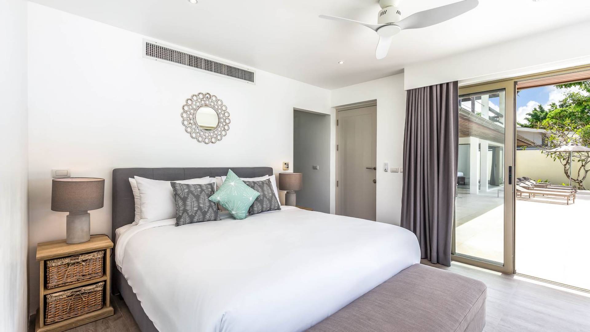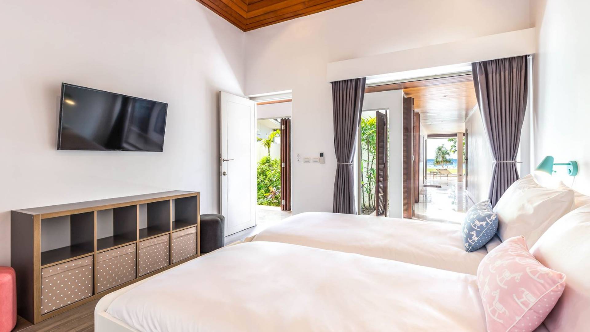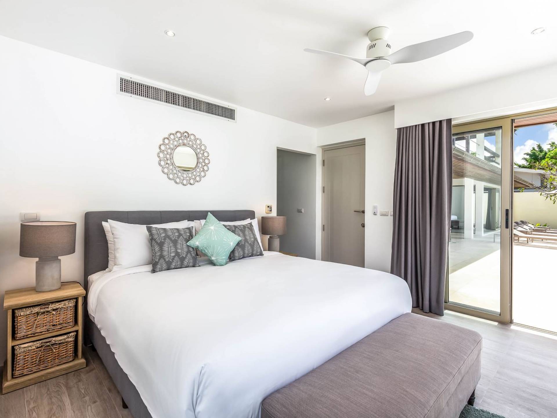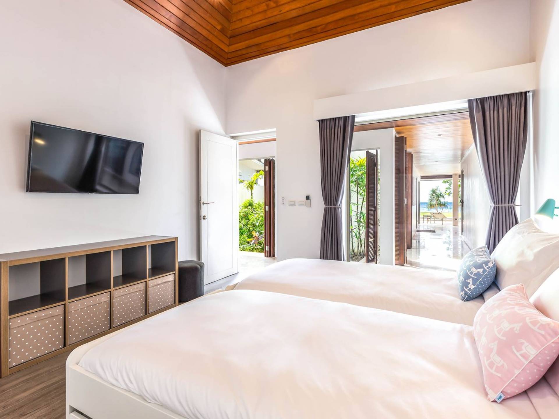 Due camere matrimoniali con bagno privato si trovano nella parte anteriore della casa e con finestre dal pavimento al soffitto significa una vista mozzafiato direttamente sull'oceano dal comfort del tuo letto. Altre due camere da letto, entrambe con bagno privato, sono arretrate rispetto al giardino e dotate di letti king size e splendidamente decorate con le immagini degli arcipelaghi scandinavi. La camera dei bambini è dotata di due letti singoli con letti scorrevoli sotto, che si trasformano in 4 letti singoli per un'esperienza di pigiama party. Questa camera è inoltre dotata di TV e PlayStation (su richiesta), dove i bambini possono ritirarsi al tramonto. Una stanza studio in più con un letto matrimoniale a scomparsa significa che Villa Sand può ospitare comodamente fino a 10 adulti o 8 adulti e 6 bambini. La camera extra è anche un'aggiunta perfetta per tutte le famiglie che desiderano portare con sé una tata. Tutte le camere sono dotate di aria condizionata e ventilatori a soffitto.