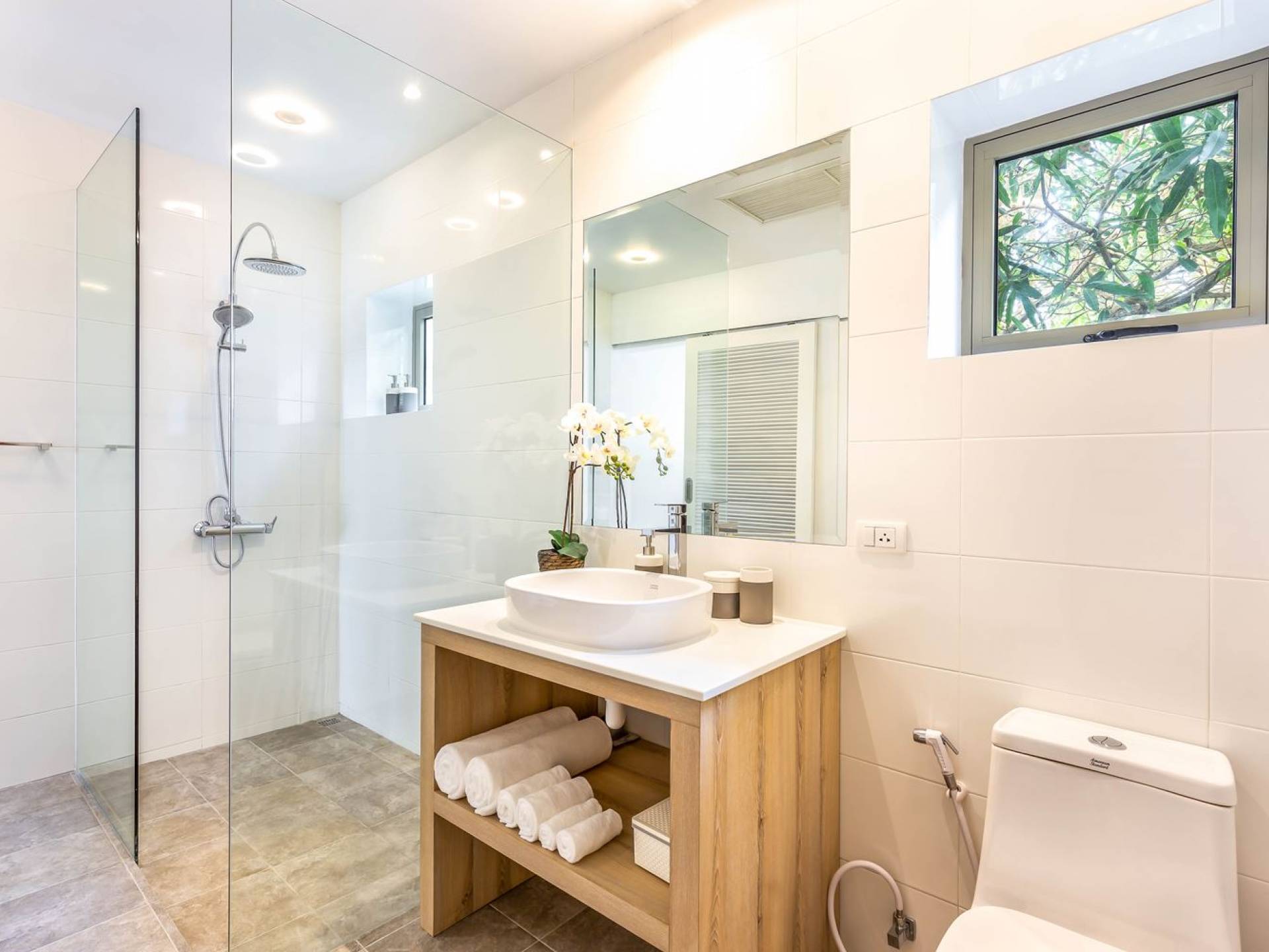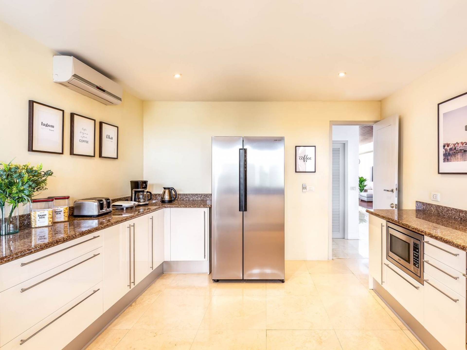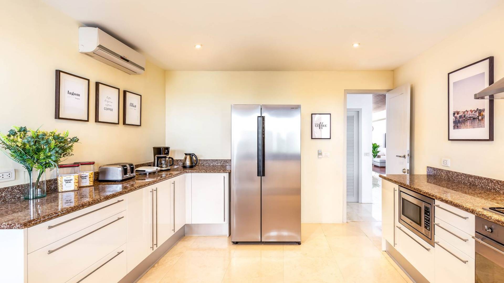 Una cucina occidentale comprende frigorifero/congelatore, piano cottura a gas, forno, microonde, macchina per il caffè, tostapane e bollitore. La cucina è completamente attrezzata per gli ospiti e un supermercato Tesco Lotus si trova a soli 5 minuti di auto dalla villa. Gli ospiti possono gustare le delizie locali dai ristoranti vicini a 5 minuti a piedi dalla villa, o fare una passeggiata lungo la spiaggia fino al "Baba Beach Club", che serve una vasta gamma di piatti della cucina internazionale, dal sushi alla pizza. Se preferisci consumare i tuoi pasti nel comfort della villa, troverai tutti i menù del ristorante disponibili, è sufficiente ordinare tramite il personale e il cibo verrà consegnato a casa tua.