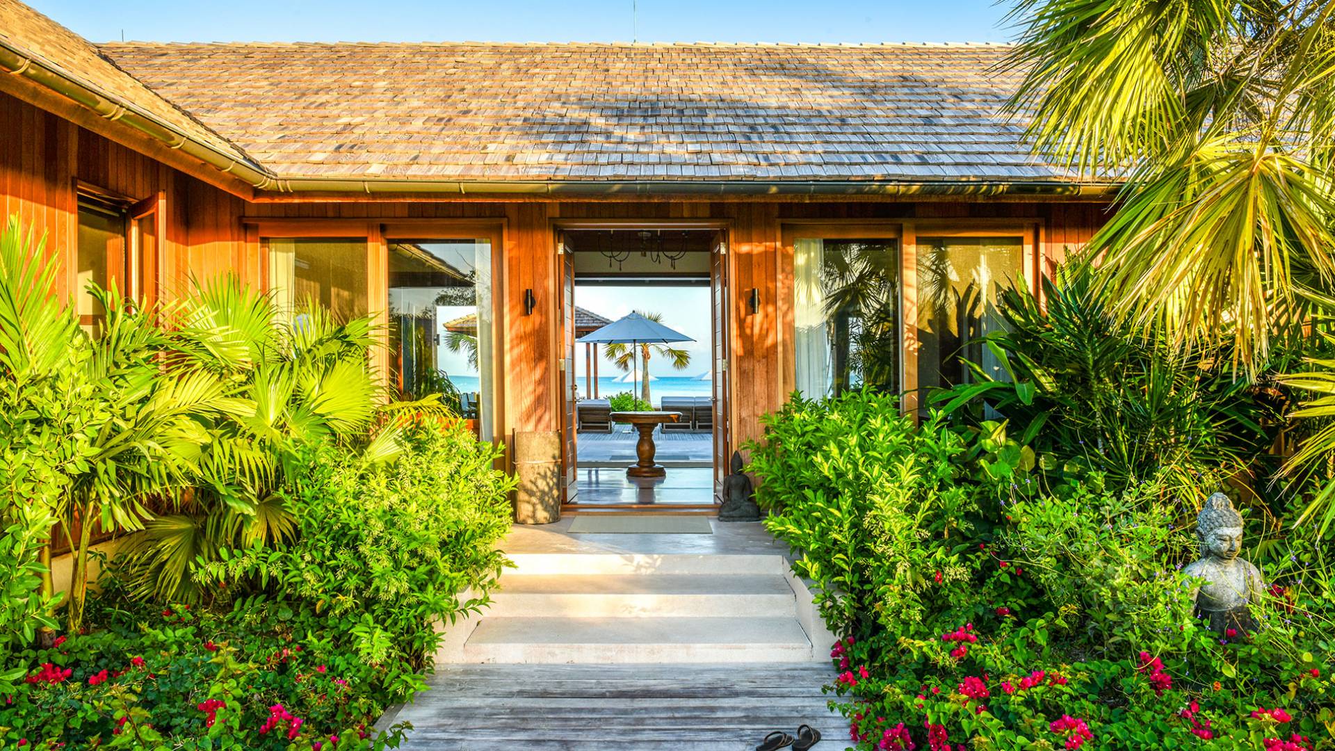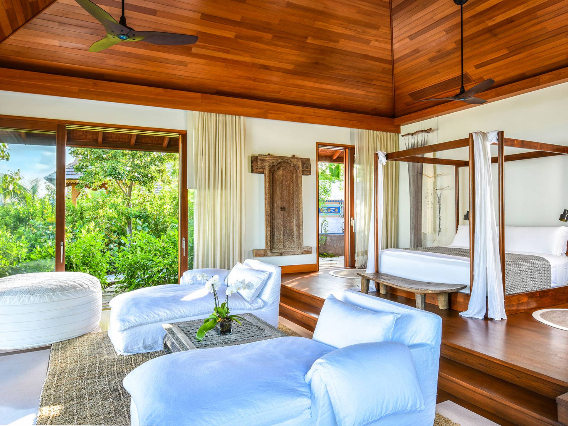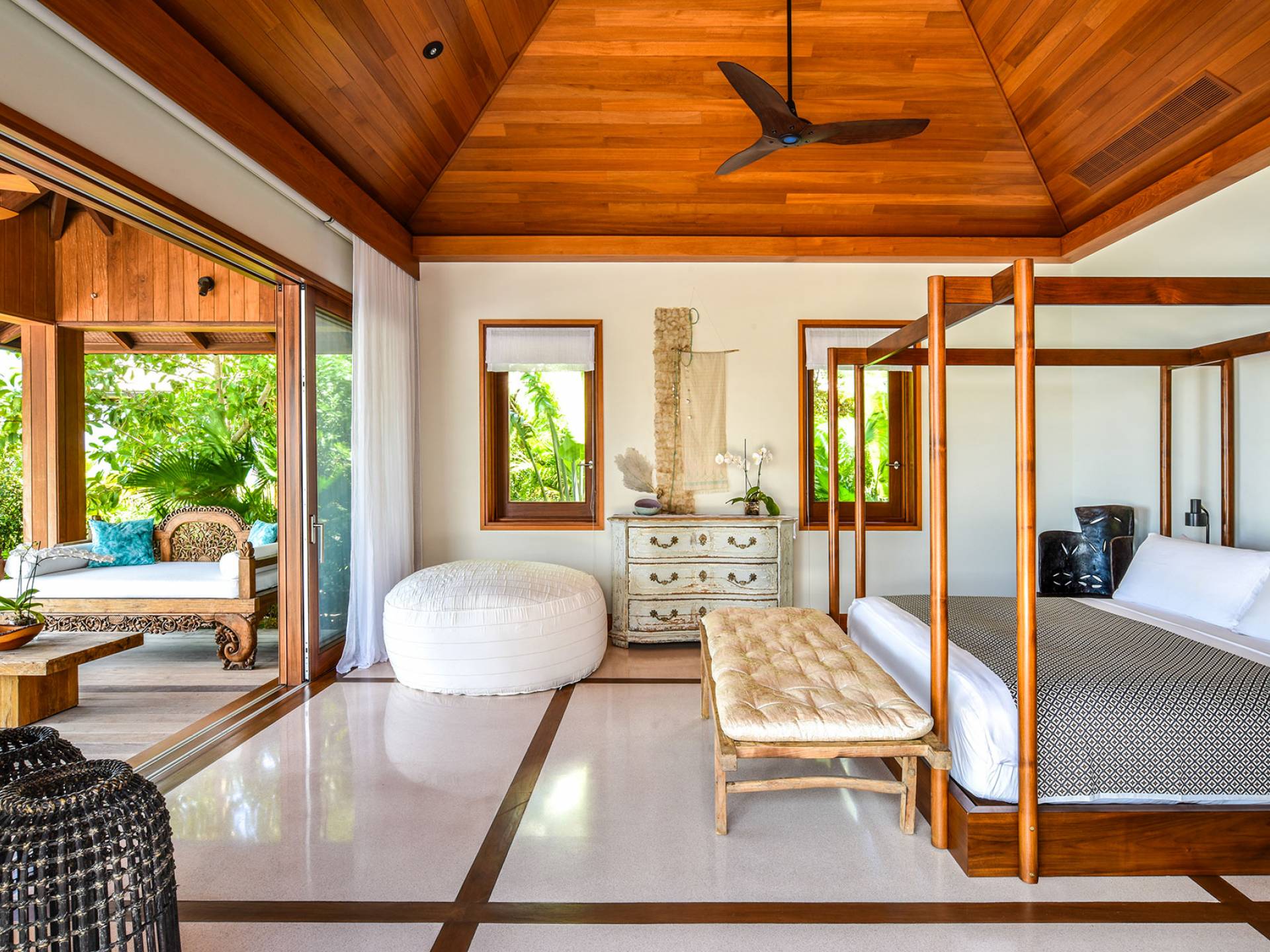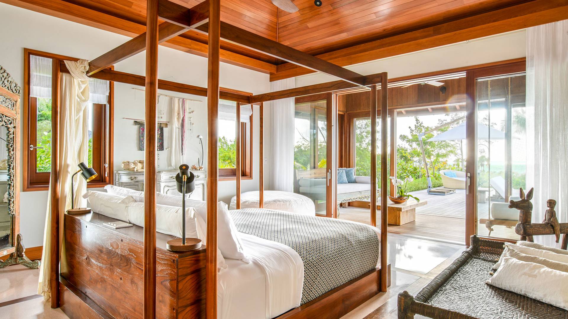 La casa principale di 6.200 piedi quadrati (668 m²) ha una camera da letto principale con oltre 2.000 piedi quadrati di spazio, che si apre su un terrazzo privato con un divano letto in teak. Il bagno privato può diventare un bagno all'aperto, con doccia a cascata in pietra scura e vista sull'oceano turchese. Le altre due camere sono dotate di bagno privato con lavandini e vasche da bagno in pietra e pavimenti in pietra incisa con fossili marini. All'esterno, la piscina a sfioro di 60 piedi x 21 piedi è realizzata in roccia lavica, circondata dal verde dell'isola e da un ponte punteggiato da sedie a sdraio in teak. Un grande gazebo balinese funge da fulcro.