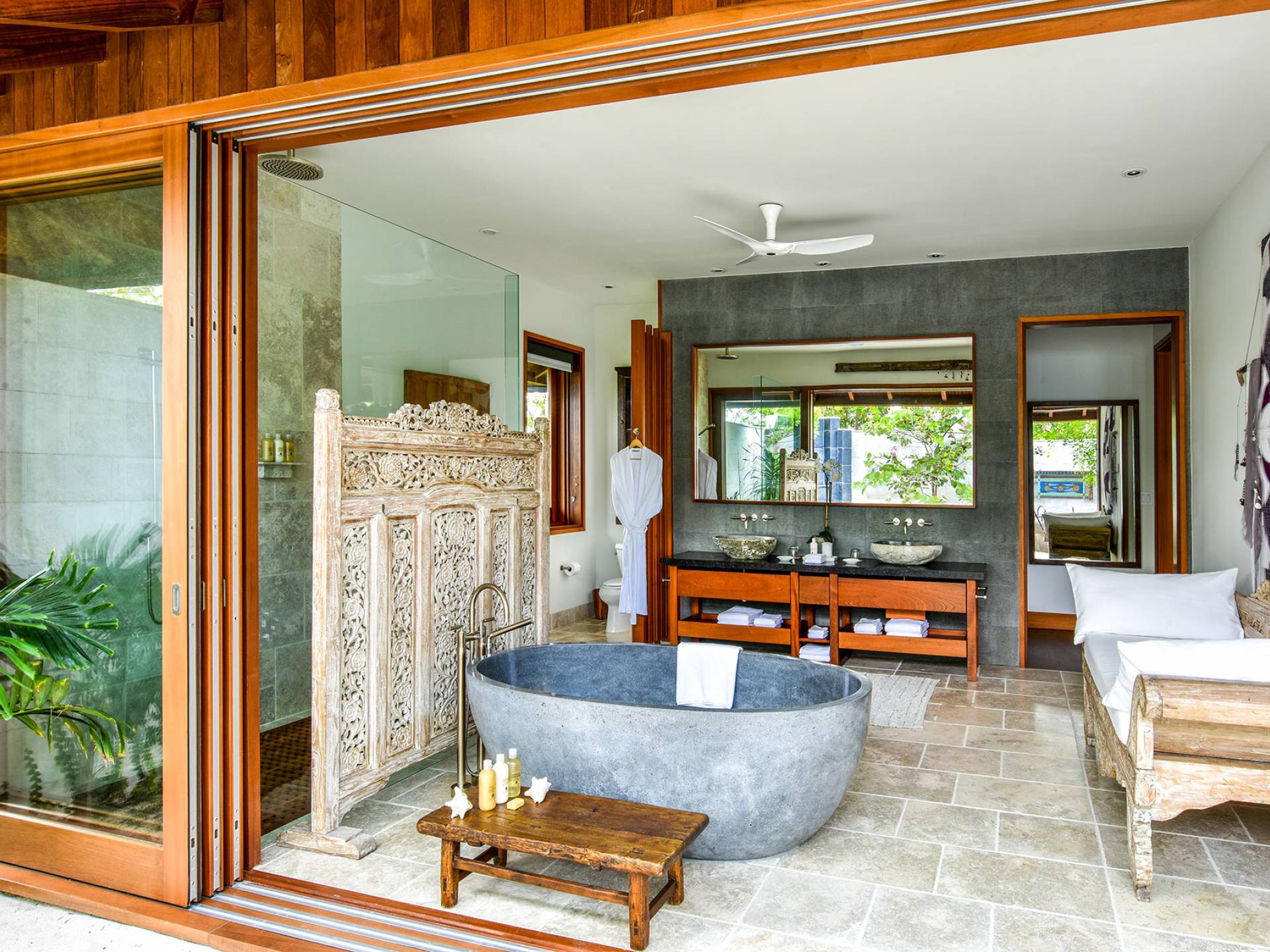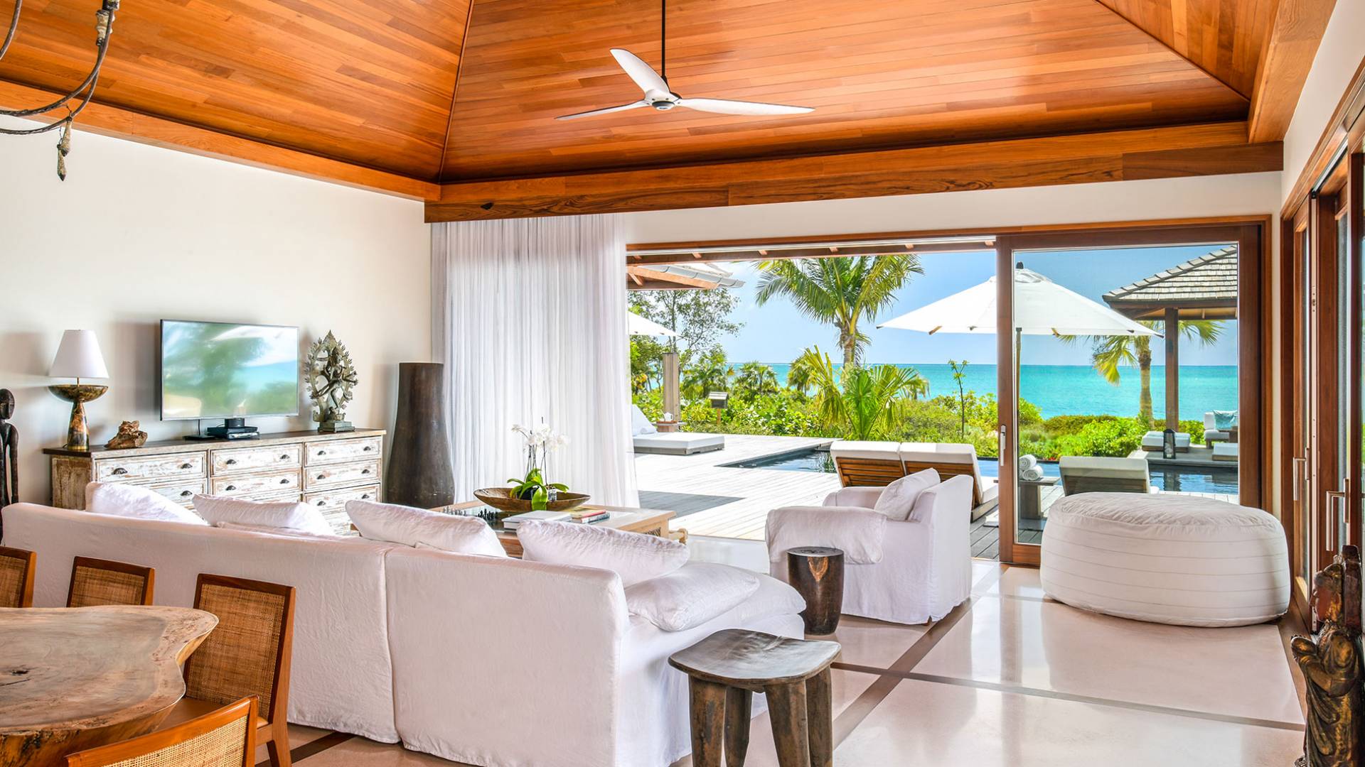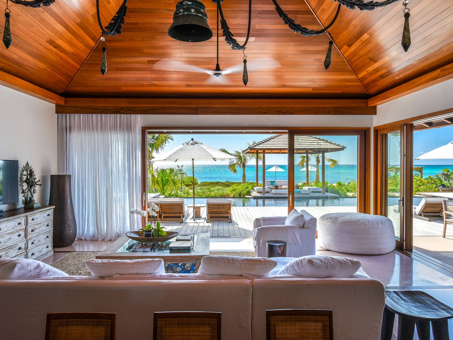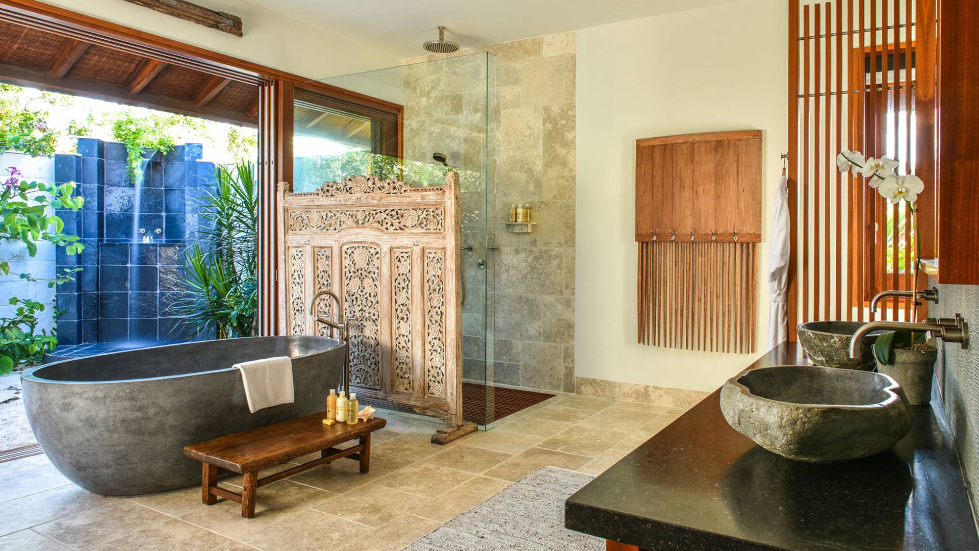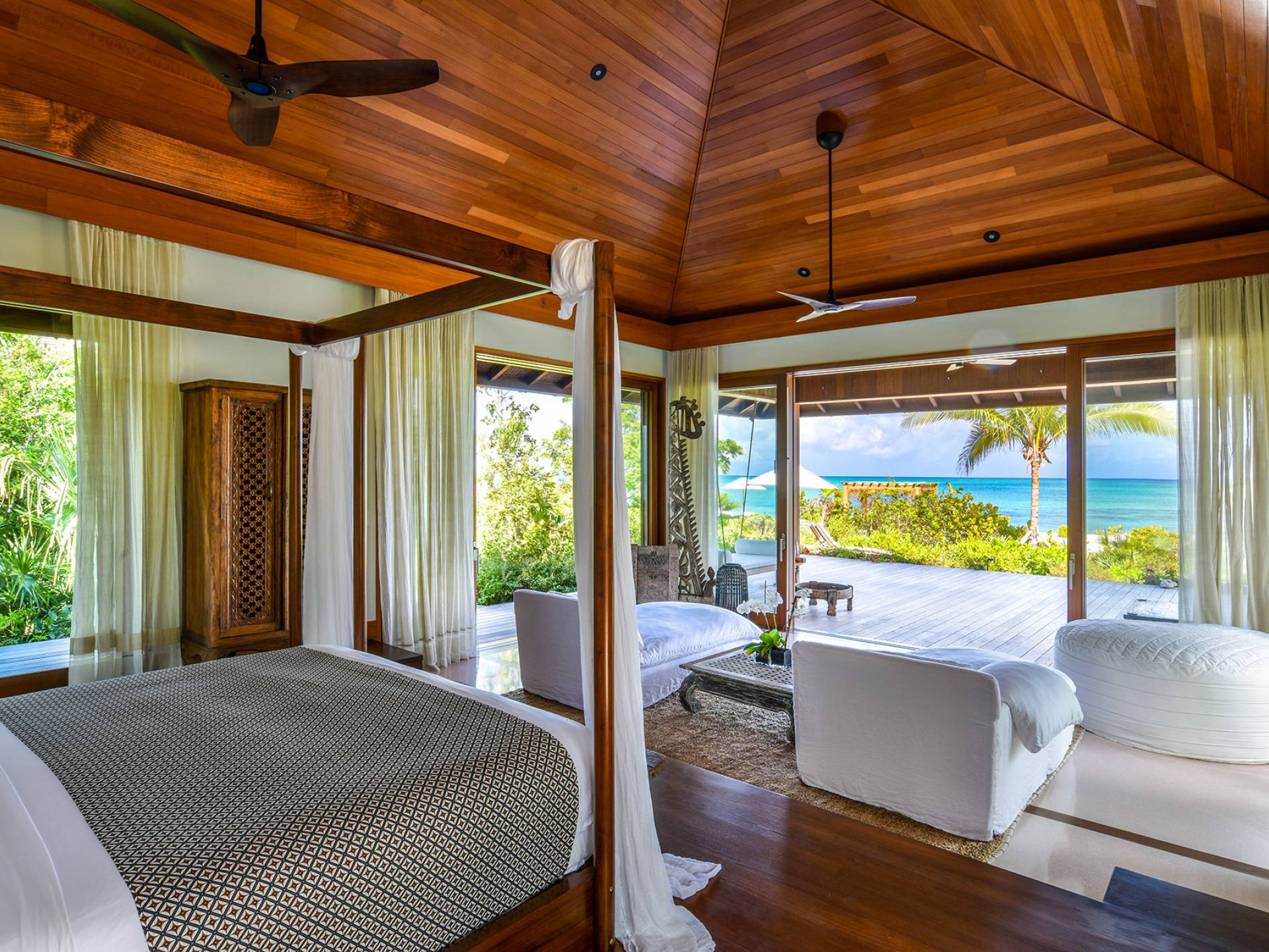 La casa principale di 6.200 piedi quadrati (668 m²) ha una camera da letto principale con oltre 2.000 piedi quadrati di spazio, che si apre su un terrazzo privato con un divano letto in teak. Il bagno privato può diventare un bagno all'aperto, con doccia a cascata in pietra scura e vista sull'oceano turchese. Le altre due camere sono dotate di bagno privato con lavandini e vasche da bagno in pietra e pavimenti in pietra incisa con fossili marini. All'esterno, la piscina a sfioro di 60 piedi x 21 piedi è realizzata in roccia lavica, circondata dal verde dell'isola e da un ponte punteggiato da sedie a sdraio in teak. Un grande gazebo balinese funge da fulcro.