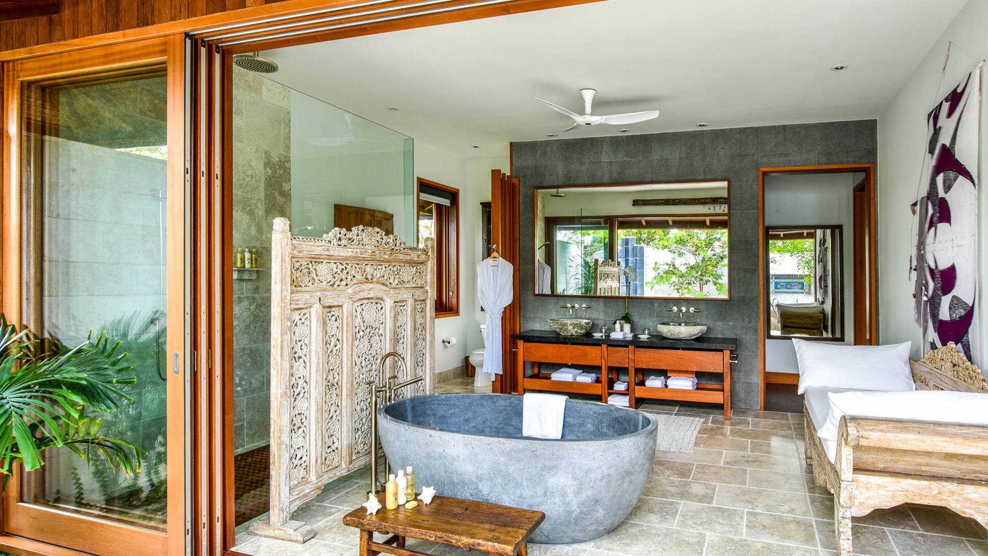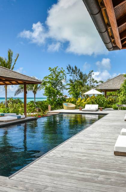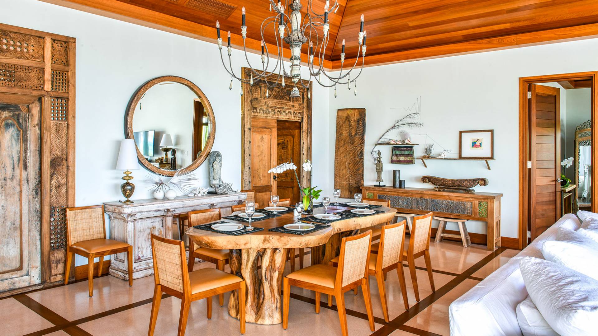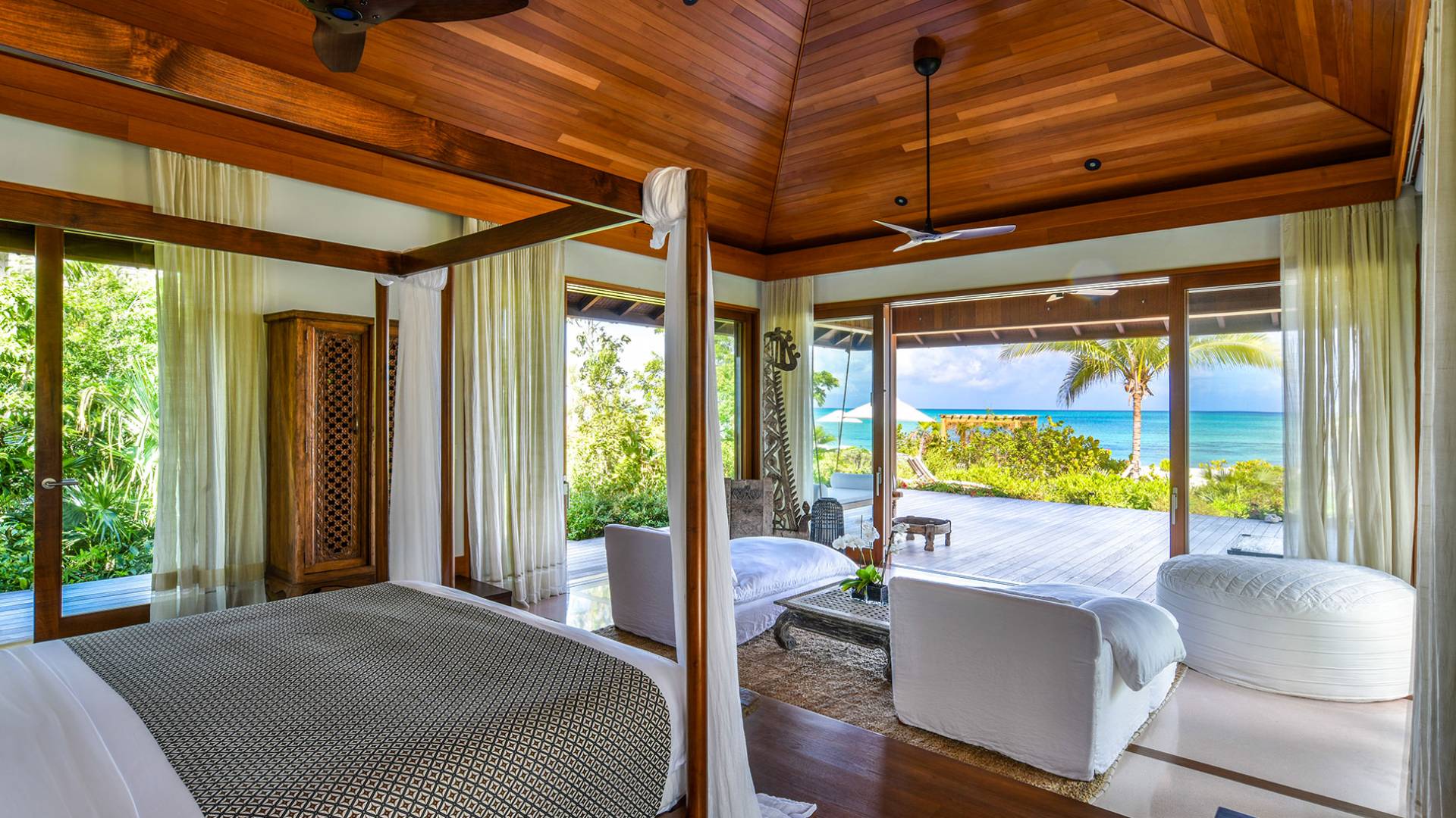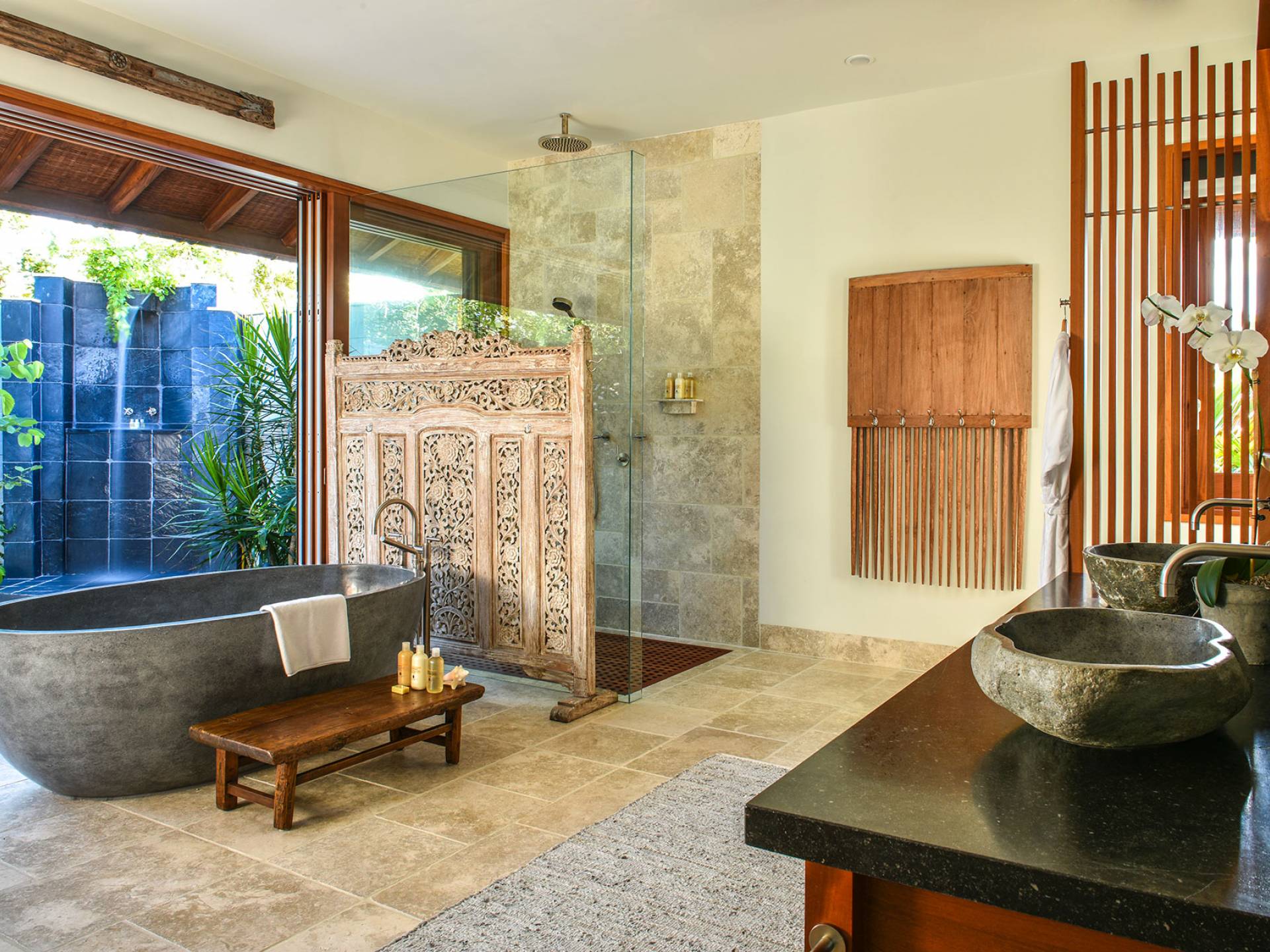 La casa principale di 6.200 piedi quadrati (668 m²) ha una camera da letto principale con oltre 2.000 piedi quadrati di spazio, che si apre su un terrazzo privato con un divano letto in teak. Il bagno privato può diventare un bagno all'aperto, con doccia a cascata in pietra scura e vista sull'oceano turchese. Le altre due camere sono dotate di bagno privato con lavandini e vasche da bagno in pietra e pavimenti in pietra incisa con fossili marini. All'esterno, la piscina a sfioro di 60 piedi x 21 piedi è realizzata in roccia lavica, circondata dal verde dell'isola e da un ponte punteggiato da sedie a sdraio in teak. Un grande gazebo balinese funge da fulcro.