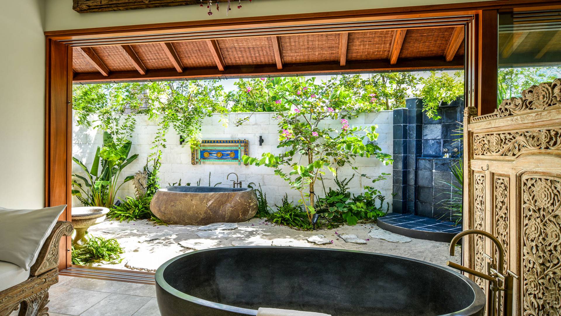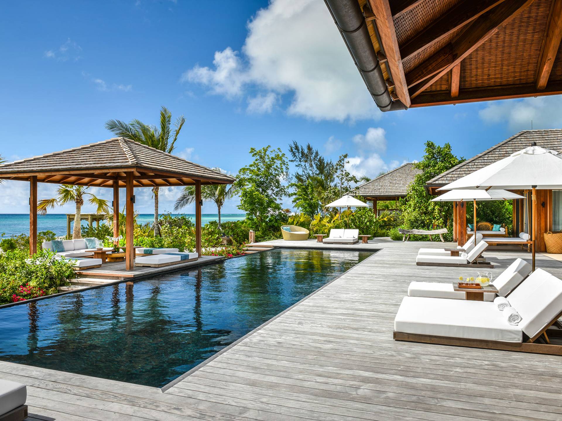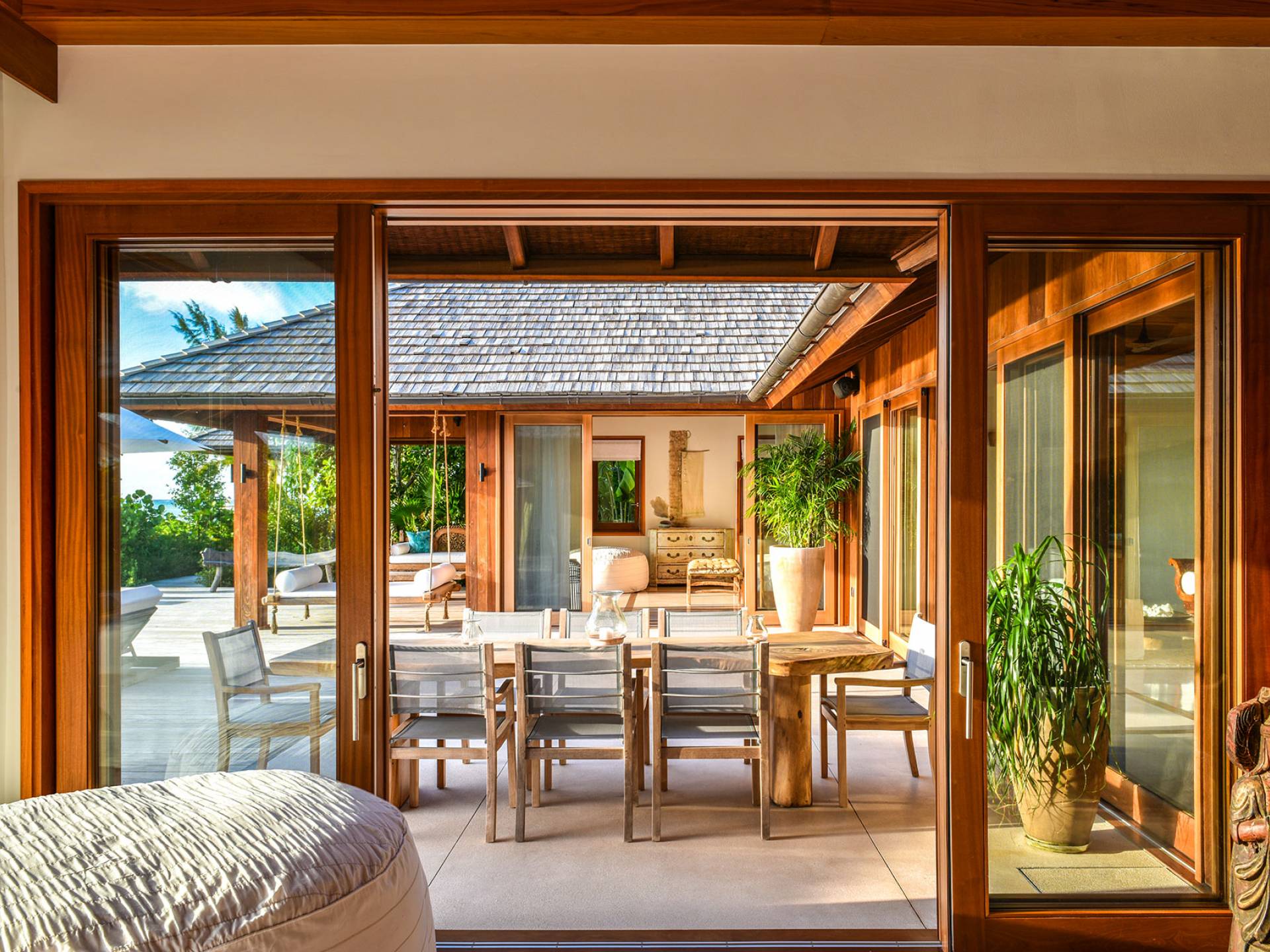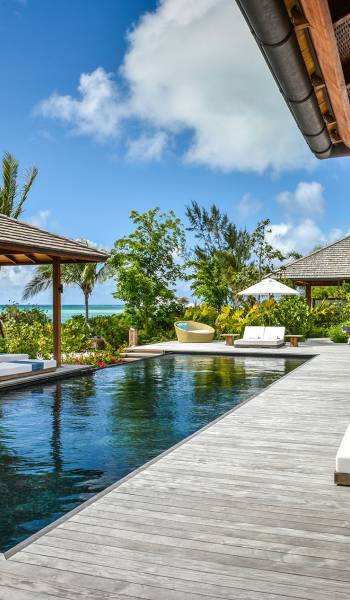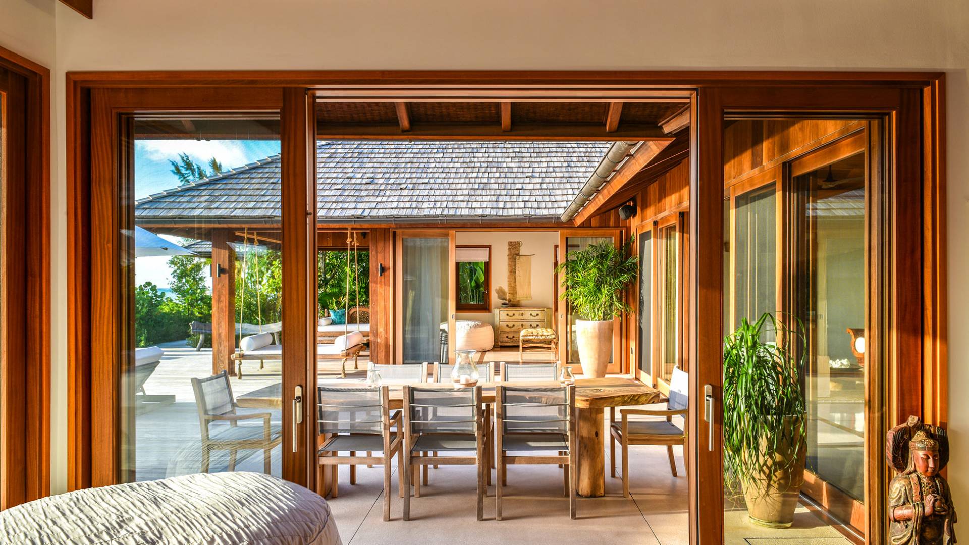 La casa principale di 6.200 piedi quadrati (668 m²) ha una camera da letto principale con oltre 2.000 piedi quadrati di spazio, che si apre su un terrazzo privato con un divano letto in teak. Il bagno privato può diventare un bagno all'aperto, con doccia a cascata in pietra scura e vista sull'oceano turchese. Le altre due camere sono dotate di bagno privato con lavandini e vasche da bagno in pietra e pavimenti in pietra incisa con fossili marini. All'esterno, la piscina a sfioro di 60 piedi x 21 piedi è realizzata in roccia lavica, circondata dal verde dell'isola e da un ponte punteggiato da sedie a sdraio in teak. Un grande gazebo balinese funge da fulcro.