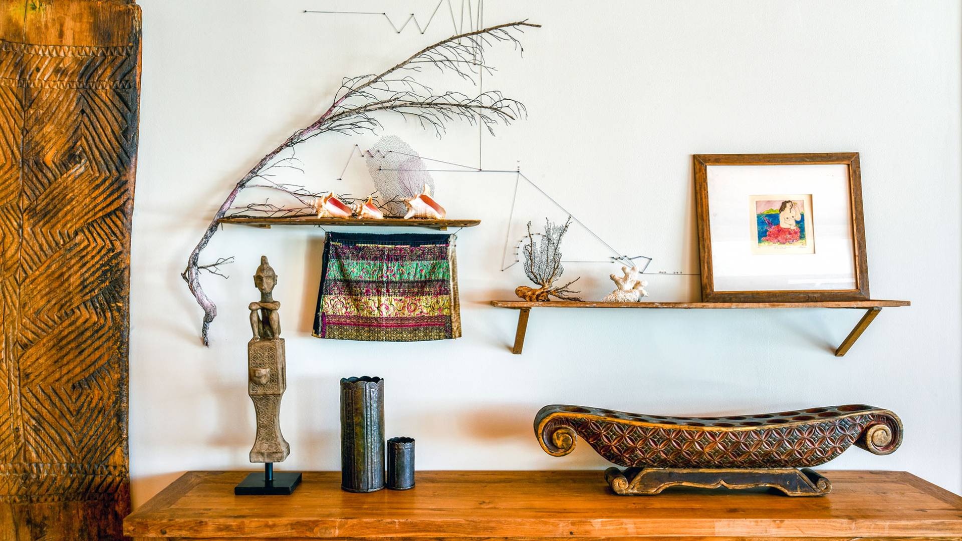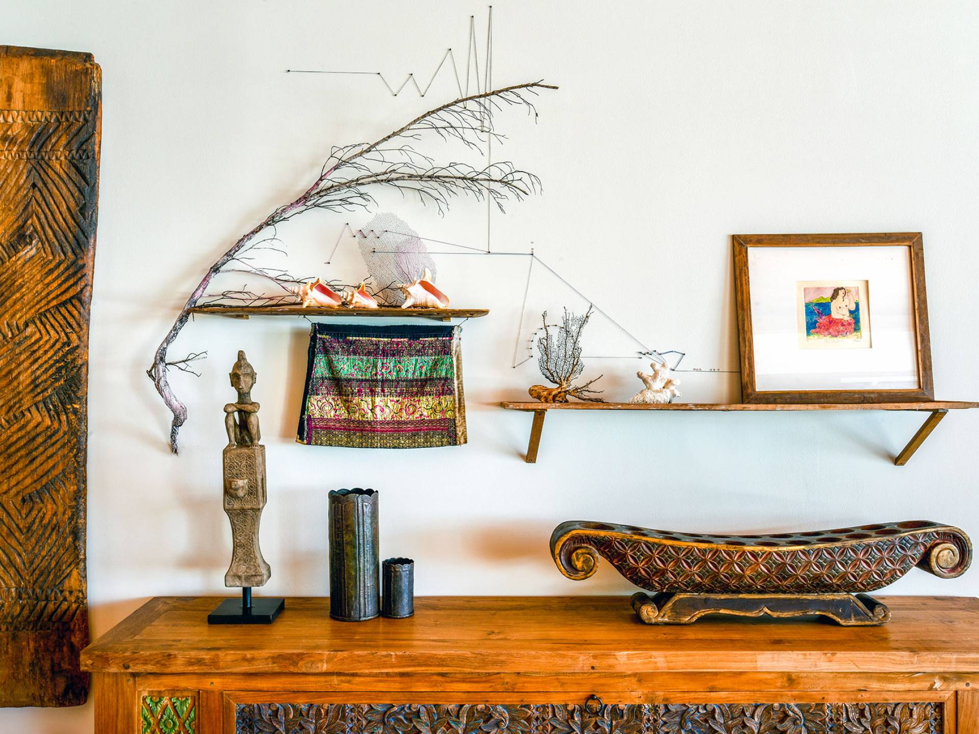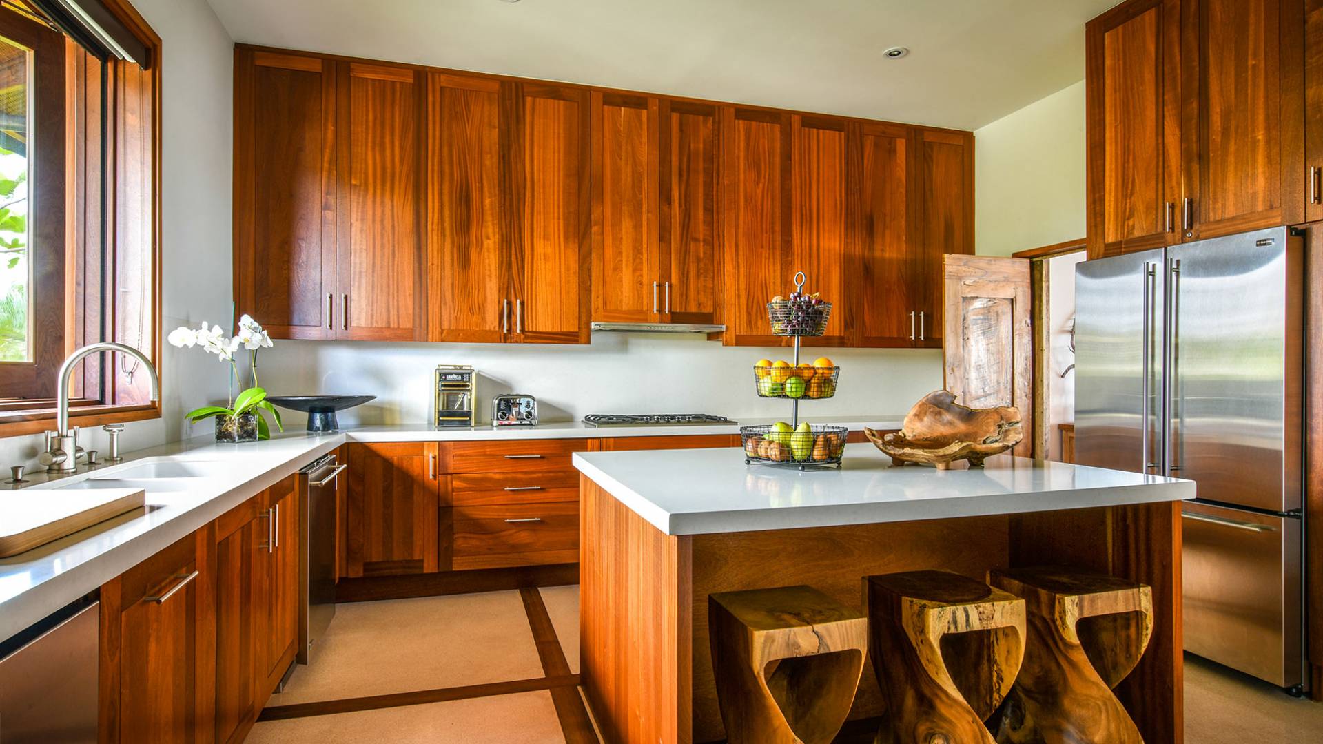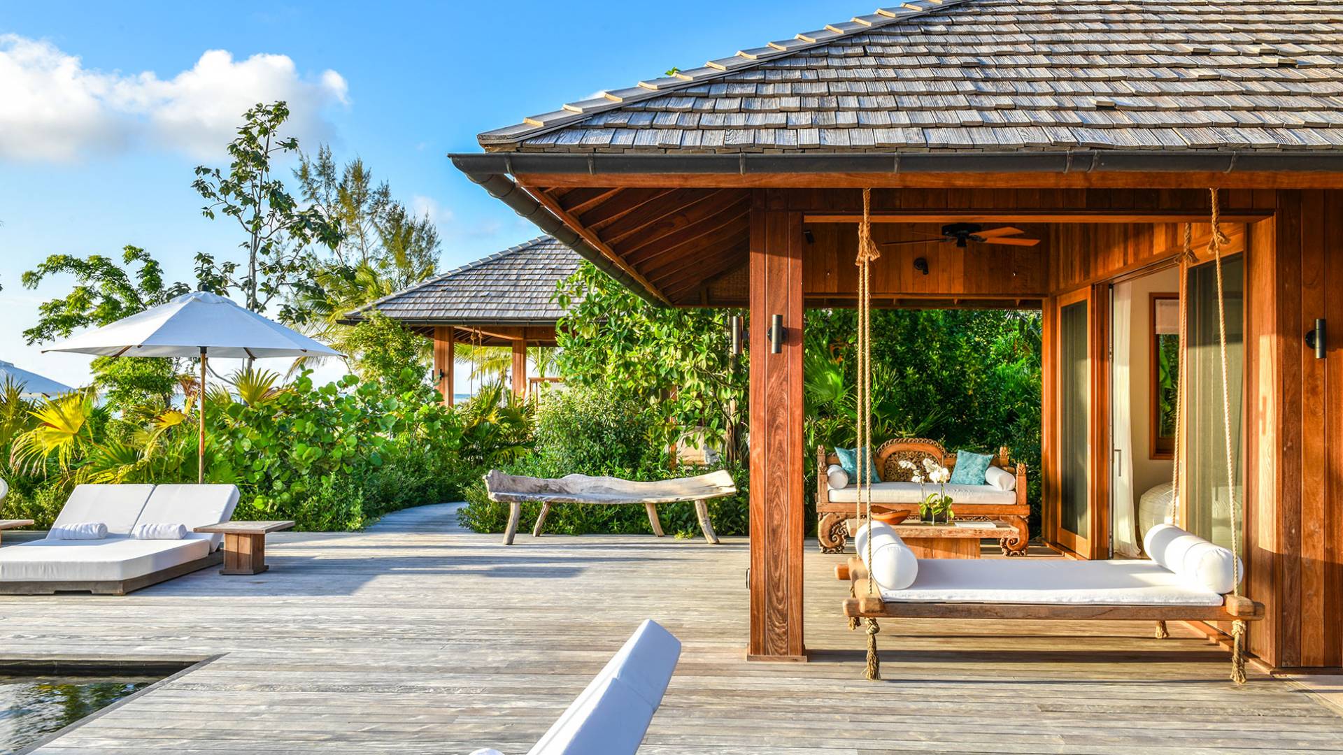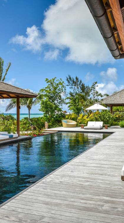 La casa principale di 6.200 piedi quadrati (668 m²) ha una camera da letto principale con oltre 2.000 piedi quadrati di spazio, che si apre su un terrazzo privato con un divano letto in teak. Il bagno privato può diventare un bagno all'aperto, con doccia a cascata in pietra scura e vista sull'oceano turchese. Le altre due camere sono dotate di bagno privato con lavandini e vasche da bagno in pietra e pavimenti in pietra incisa con fossili marini. All'esterno, la piscina a sfioro di 60 piedi x 21 piedi è realizzata in roccia lavica, circondata dal verde dell'isola e da un ponte punteggiato da sedie a sdraio in teak. Un grande gazebo balinese funge da fulcro.