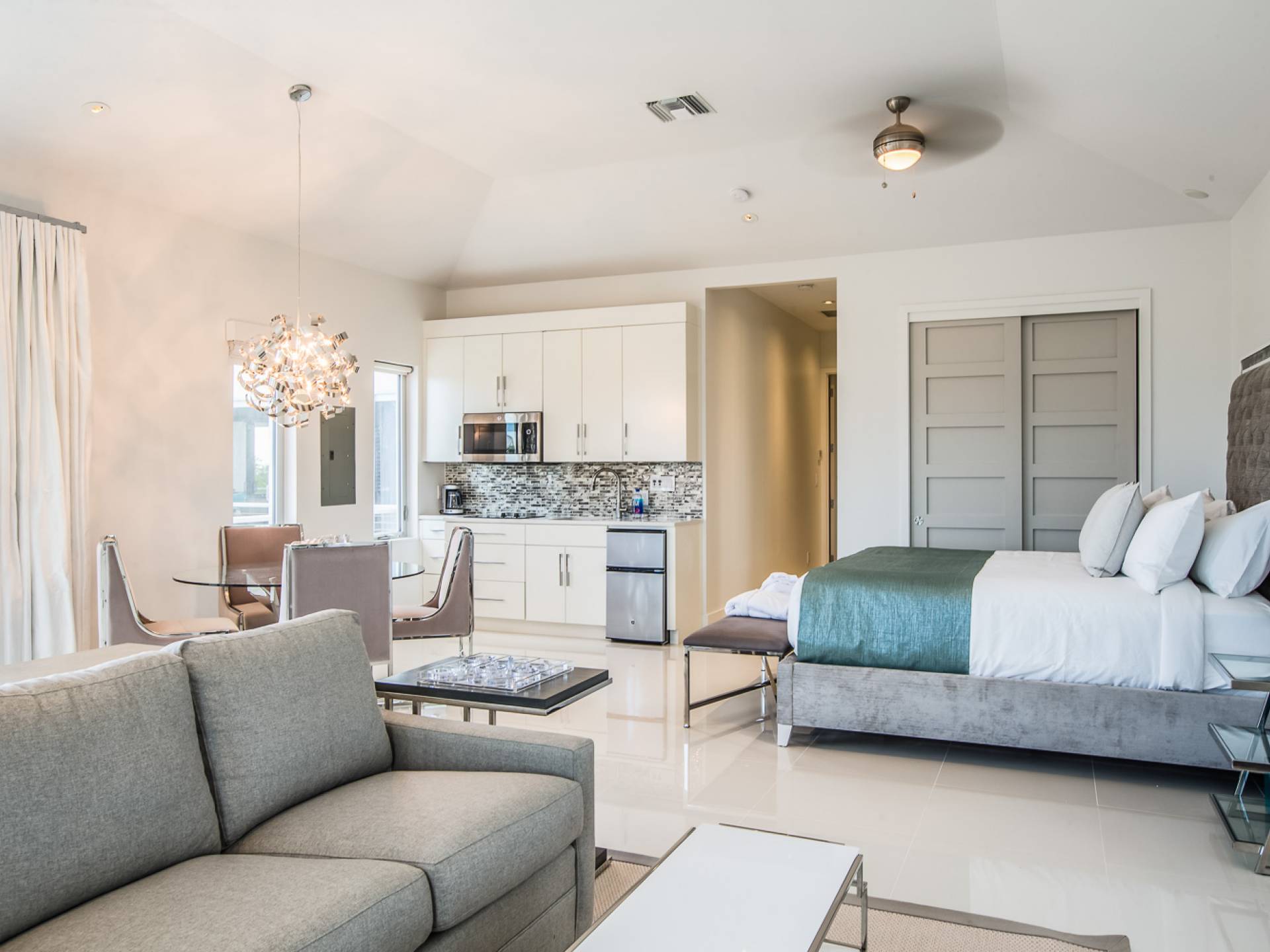 Un bellissimo monolocale al piano terra con letto king size, angolo cottura con piano cottura, frigorifero, forno a microonde e lavandino. Tavolo da pranzo e TV da 60 pollici. Porta scorrevole in vetro sul ponte della piscina. Il bagno è dotato di doccia con getto a pioggia Grohe. Un bellissimo monolocale al piano superiore con letto king size, angolo cottura con piano cottura, frigorifero, forno a microonde e lavandino. Tavolo da pranzo e TV da 60 pollici. Porta scorrevole in vetro sul patio privato con vista sulla terrazza della piscina. Vista sull'oceano. Il bagno è dotato di doccia a pioggia Grohe.