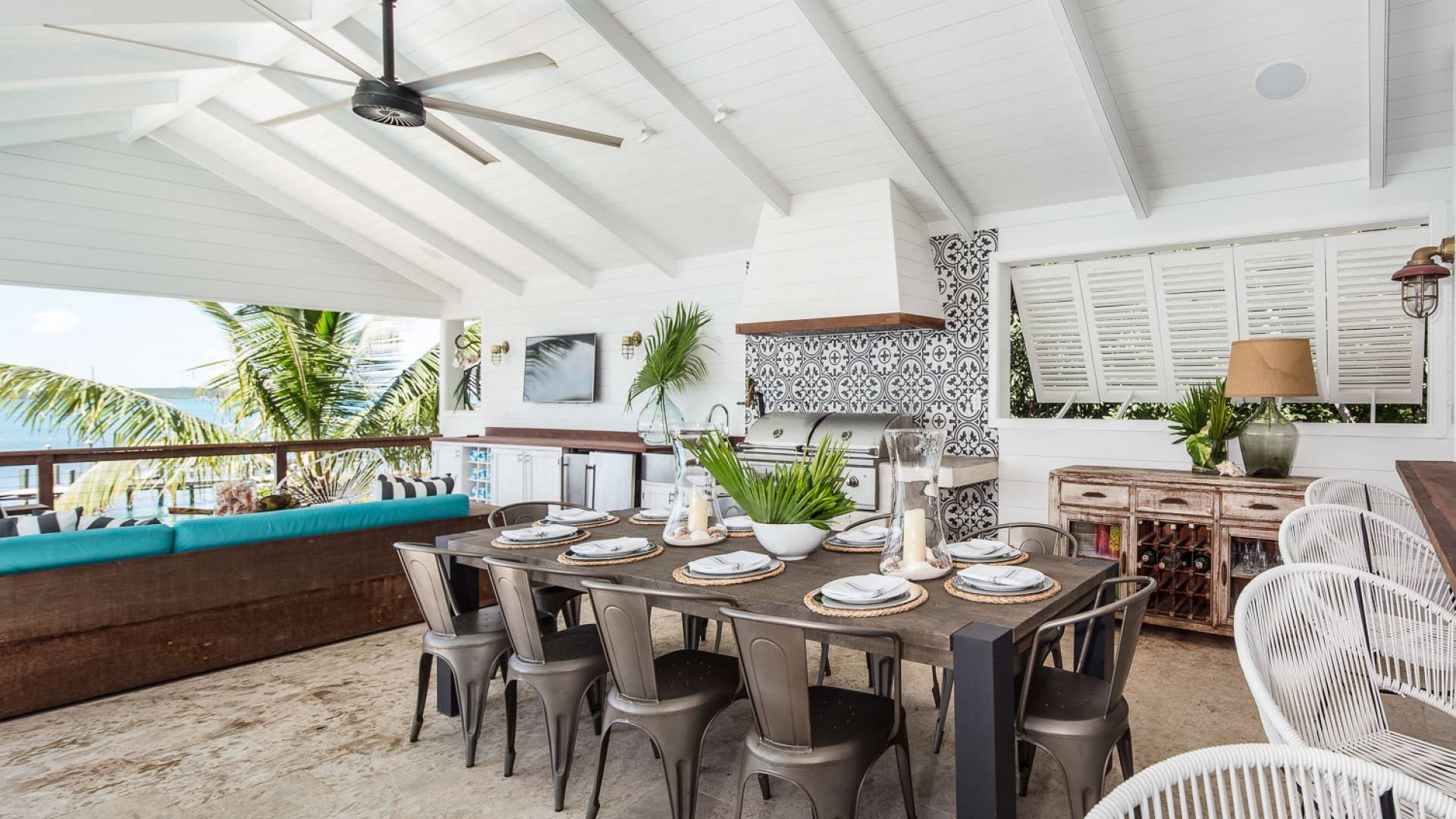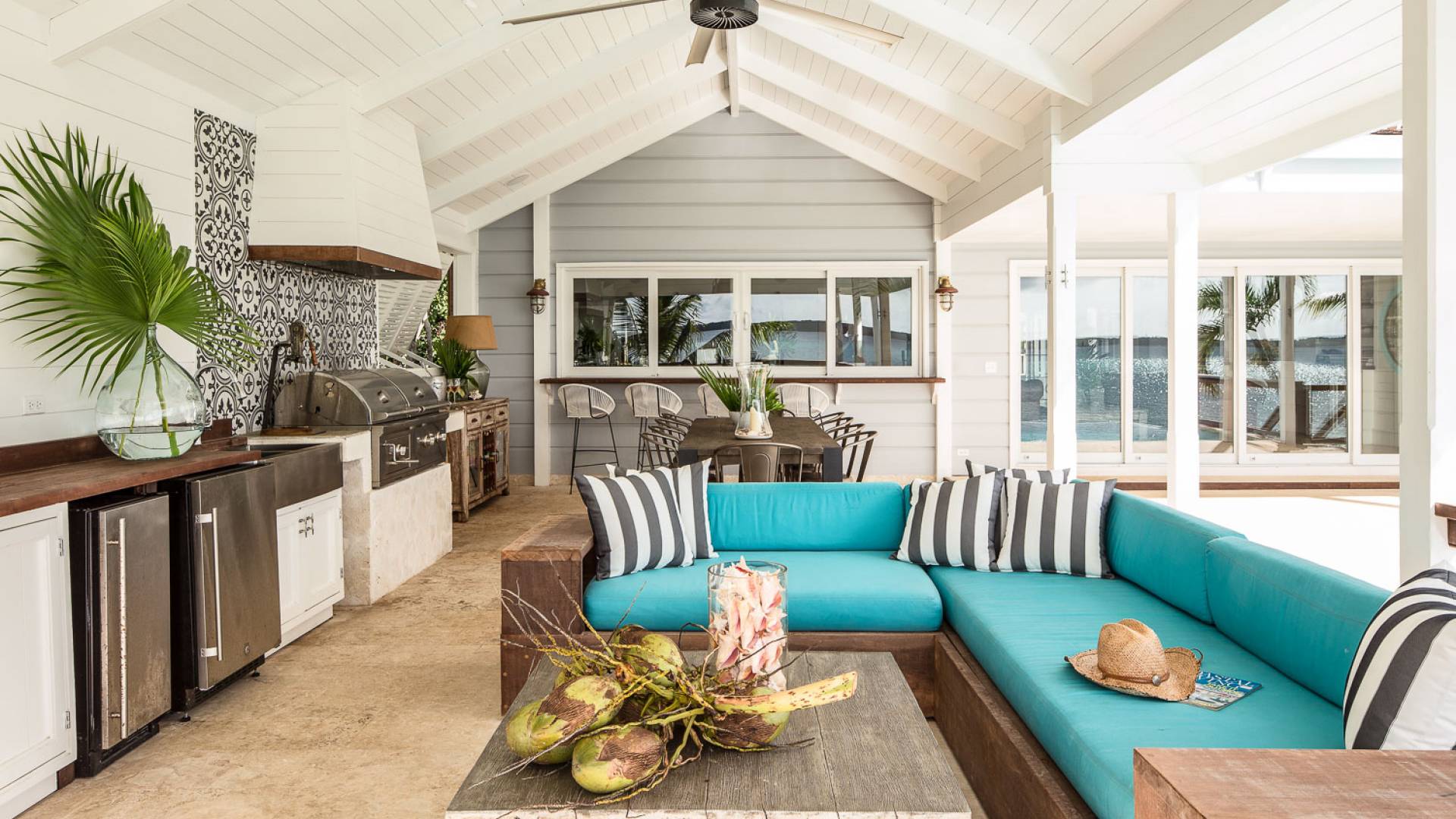 Панорамные двери и окна ведут прямо на заднюю террасу, откуда открывается захватывающий вид на море и потрясающие закаты. Здесь вы также найдете летнюю кухню, оборудованную гибридным газовым и угольным грилем койота, обеденный стол на открытом воздухе на десять человек и впечатляющий пейзажный бассейн.