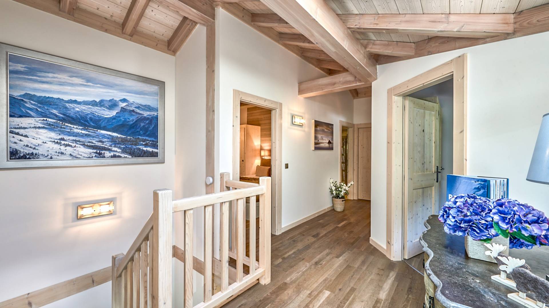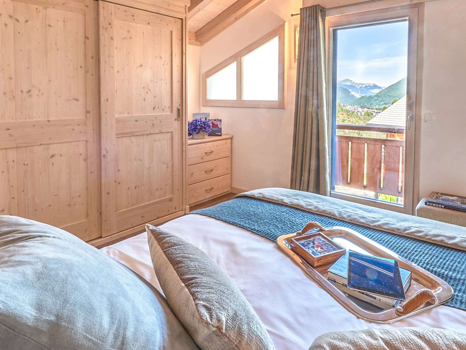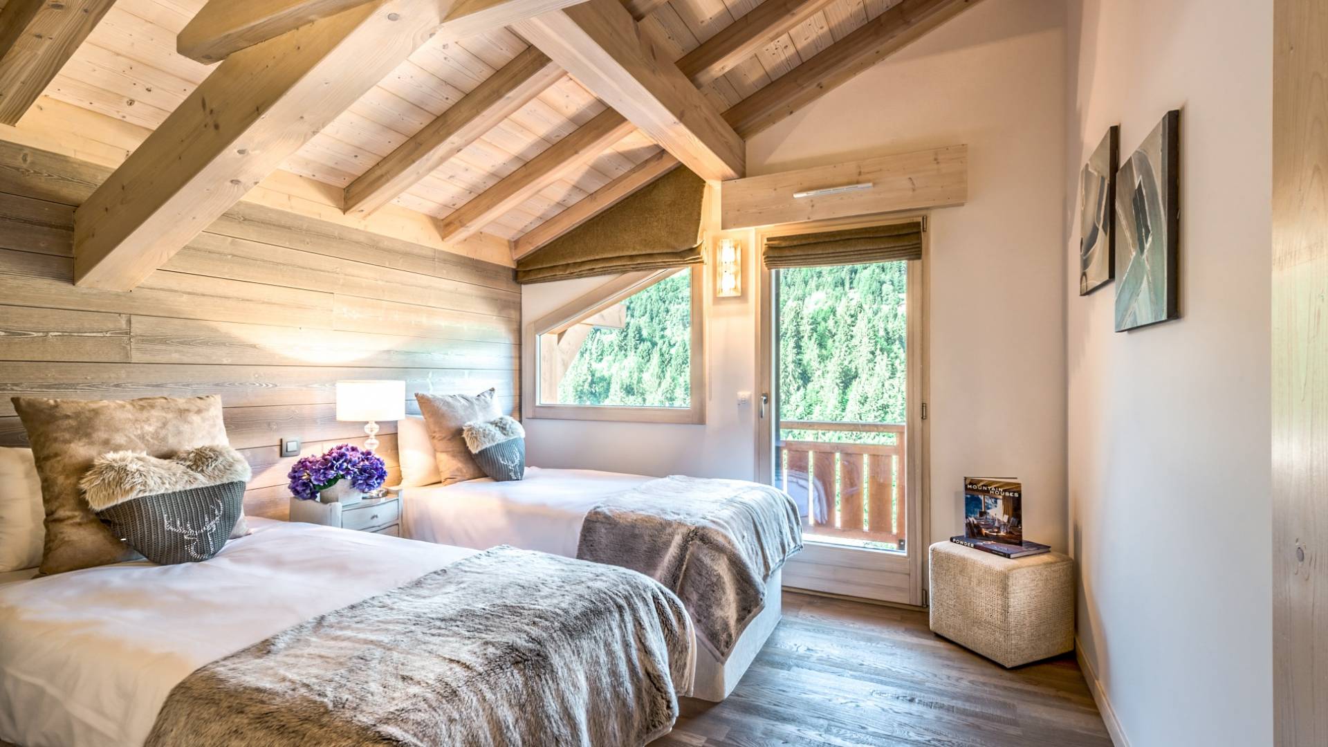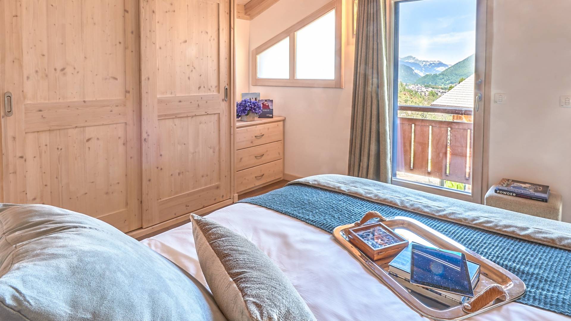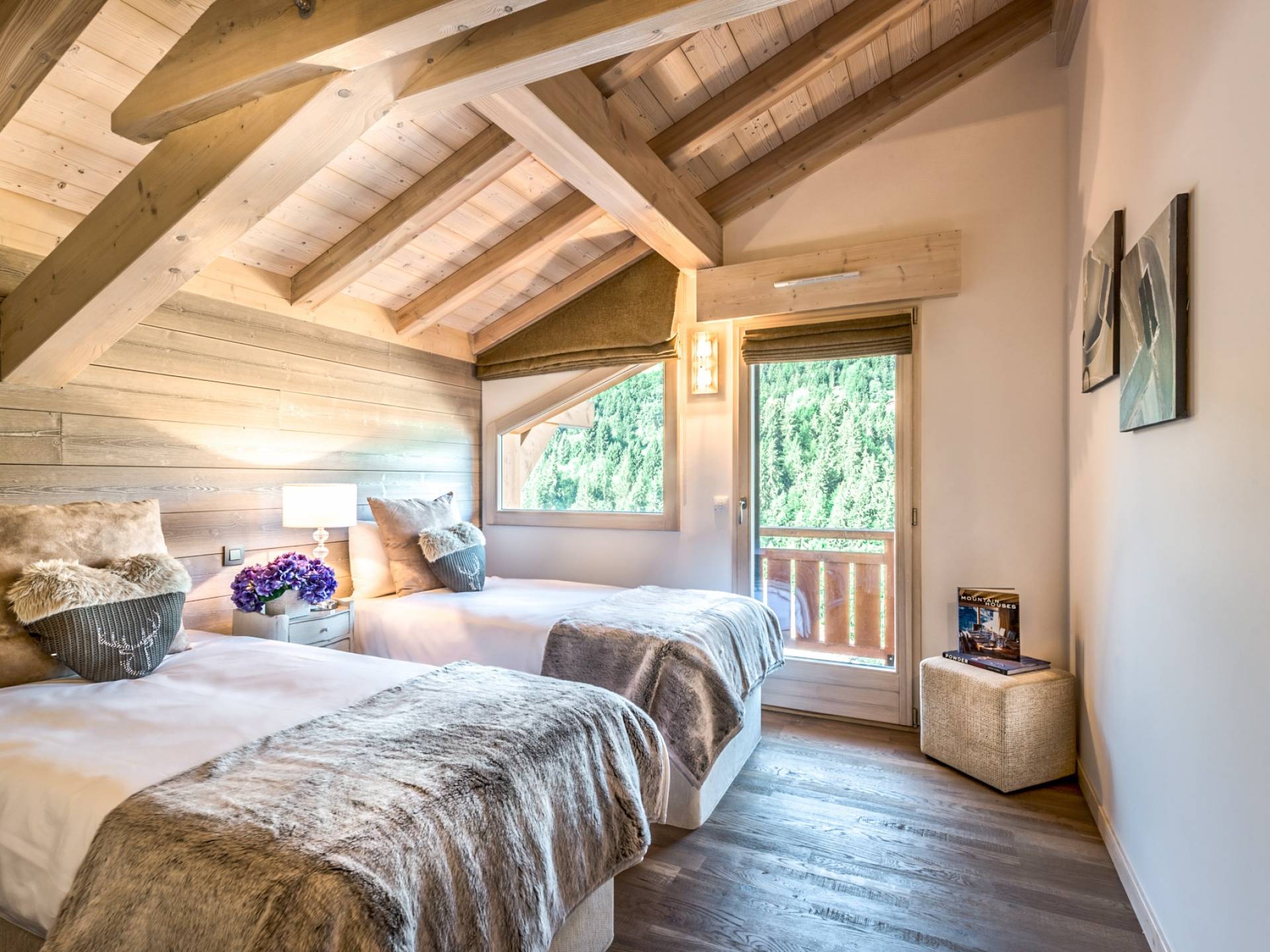 На верхнем уровне шале расположены еще четыре спальни. В главной спальне есть большой балкон и французские окна, что означает, что гости могут наслаждаться прекрасным видом на горнолыжные склоны и деревню Морзин, не вставая с постели. Две спальни, из которых также открывается вид на долину, имеют общую очень большую ванную комнату. Обе спальни имеют выход на балконы и отличное место для хранения вещей. Из третьей спальни с ванной комнатой открывается вид на сад и террасу внизу. Все спальни могут быть сконфигурированы как двухместные или двухместные.