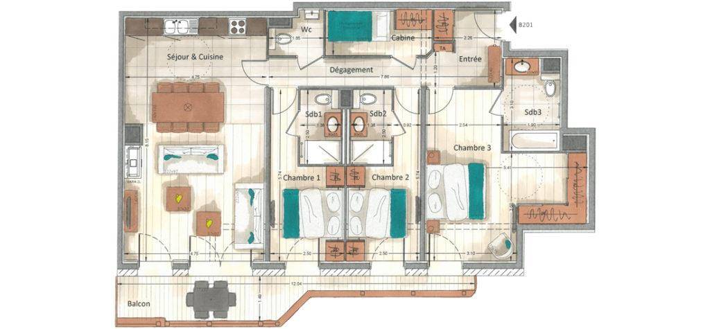 Апартаменты B201, расположенные на 2-м этаже Residence Annapurna Les Gets, площадью 114 м2, идеально подходят для размещения 8 человек. В этой квартире есть три спальни с двуспальной кроватью, спальная каюта с двухъярусной кроватью, а также три ванные комнаты. Гостиная с телевизором и камином имеет также полностью оборудованную кухню и большой балкон. Во время отпуска вы можете воспользоваться парковочным местом на частной автостоянке, помещением для хранения лыж и доступом к Wi-Fi.