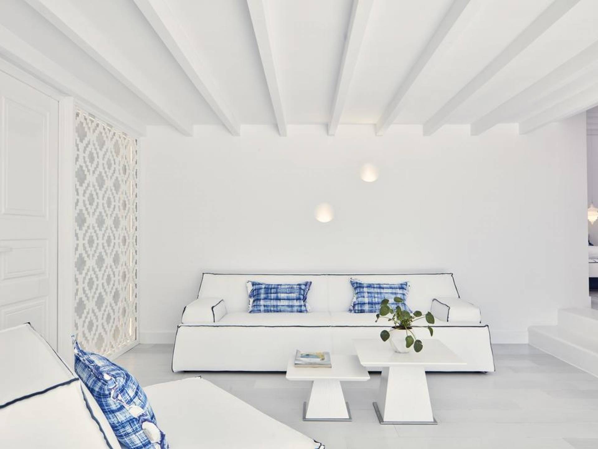 Главный люкс в отеле Katikies Mykonos с частным бассейном, вмещающий до 3 человек, с бесплатным Wi-Fi, кондиционером, спутниковым телевидением, сейфом, феном и кофеваркой.