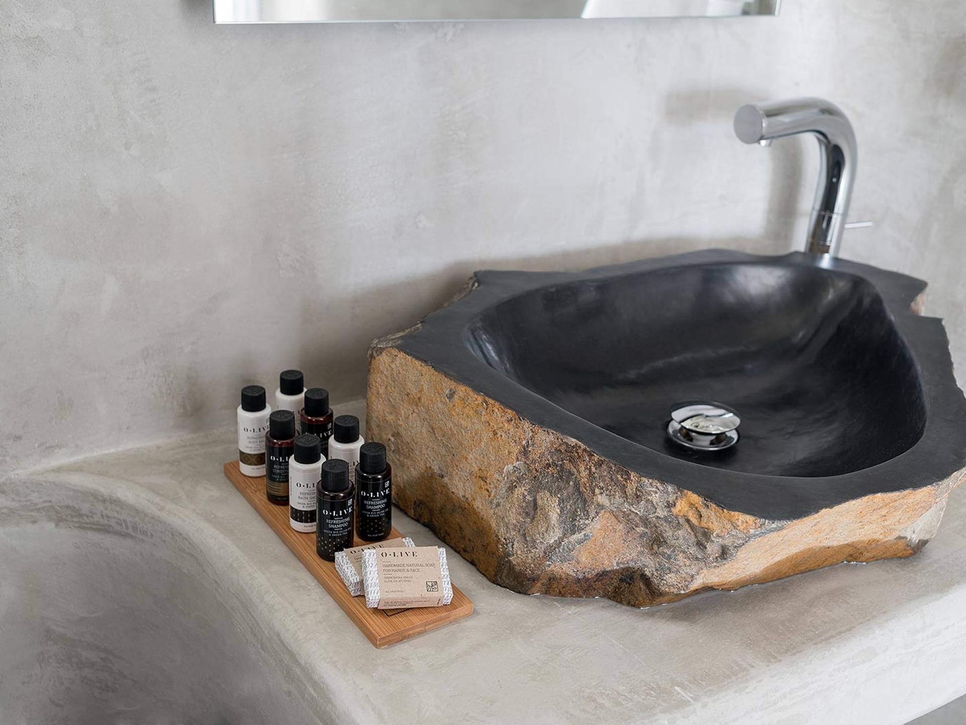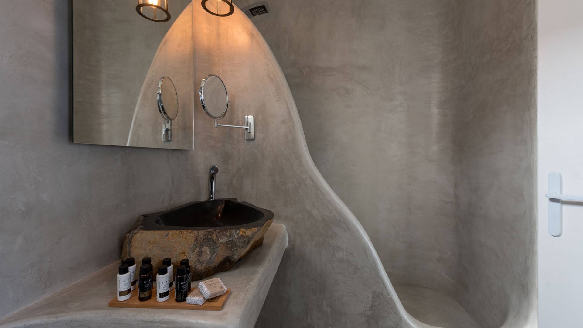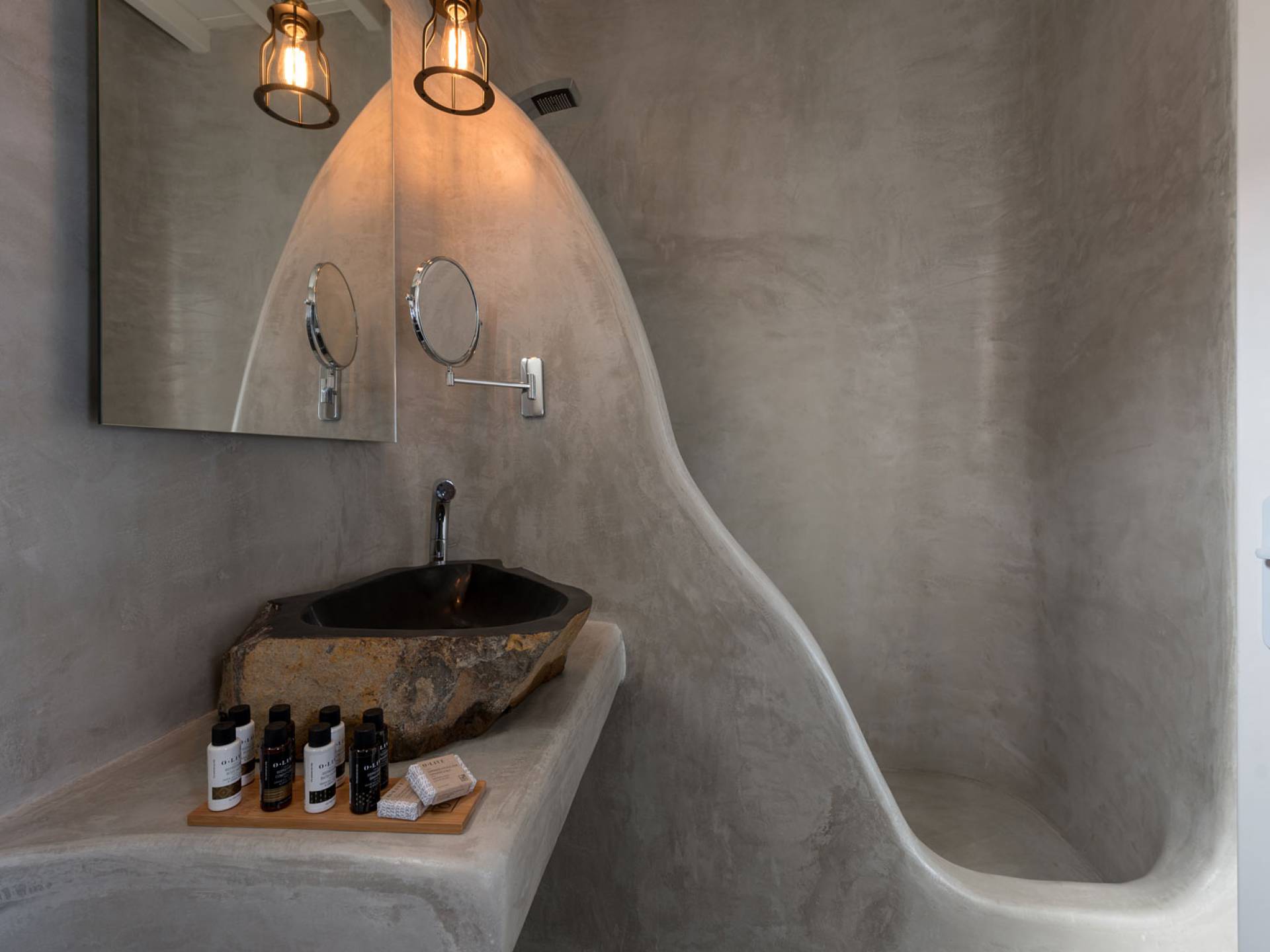 Ванные комнаты площадью 10 квадратных метров из стяжки в сочетании с душевой кабиной создают ощущение роскоши. Умывальник из камня сделан вручную. Отдельная спальня от гостиной дает возможность почувствовать себя как дома вдали от дома и уникального гостя на Миконосе.
