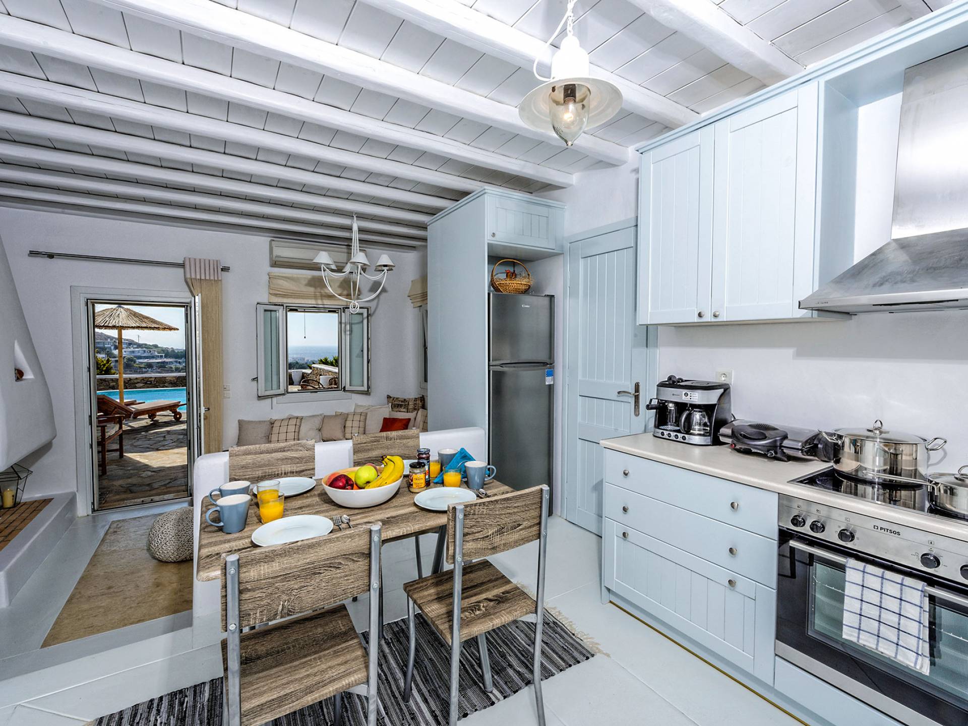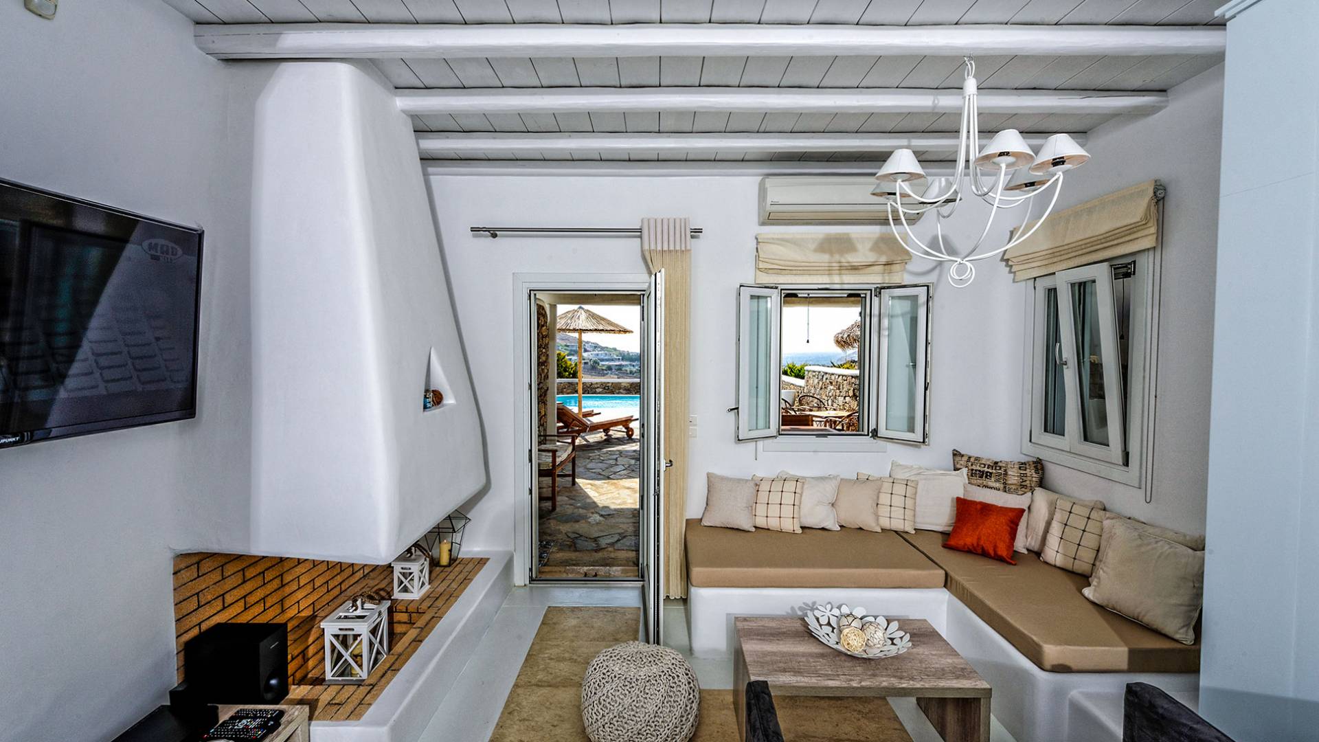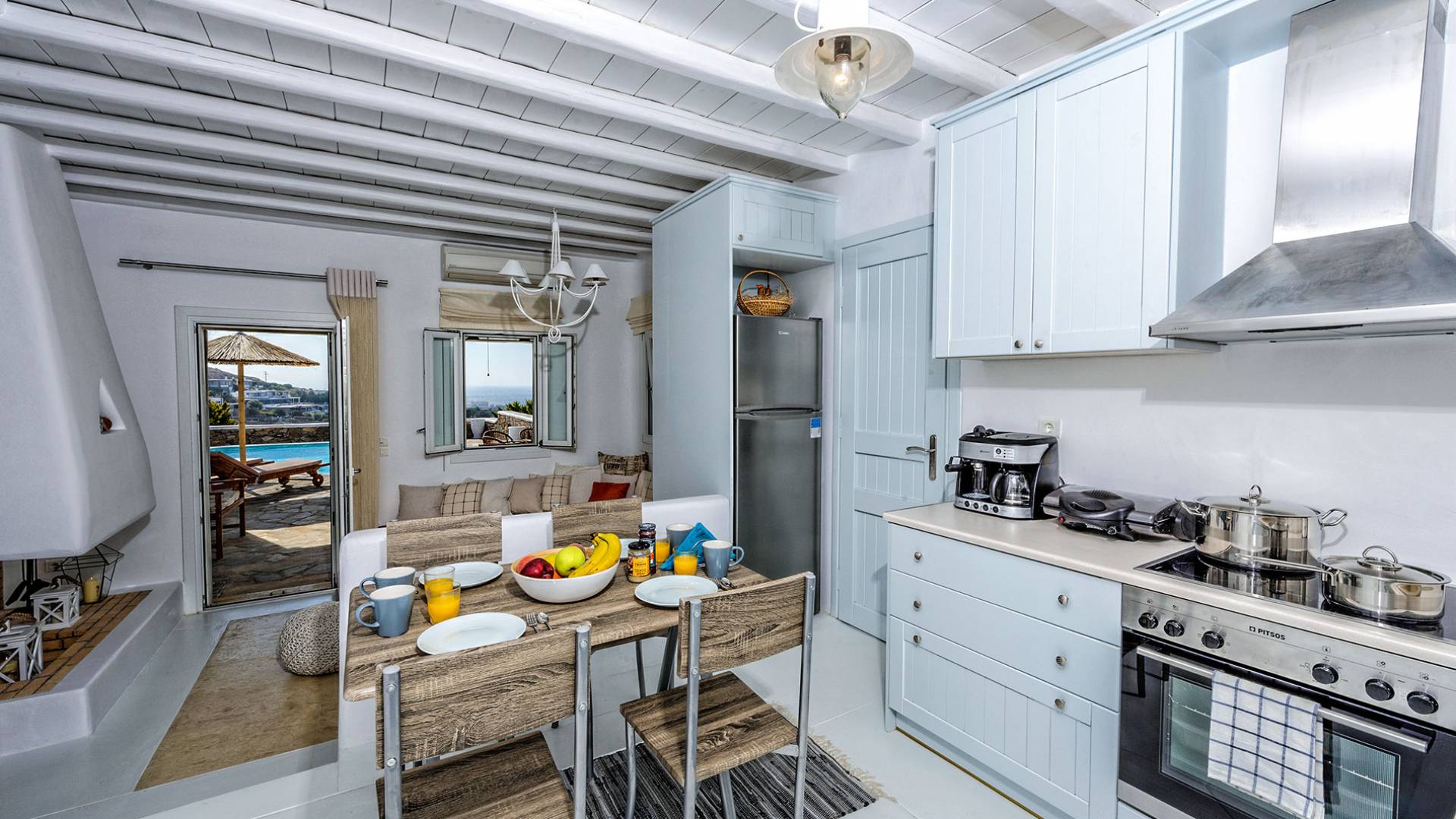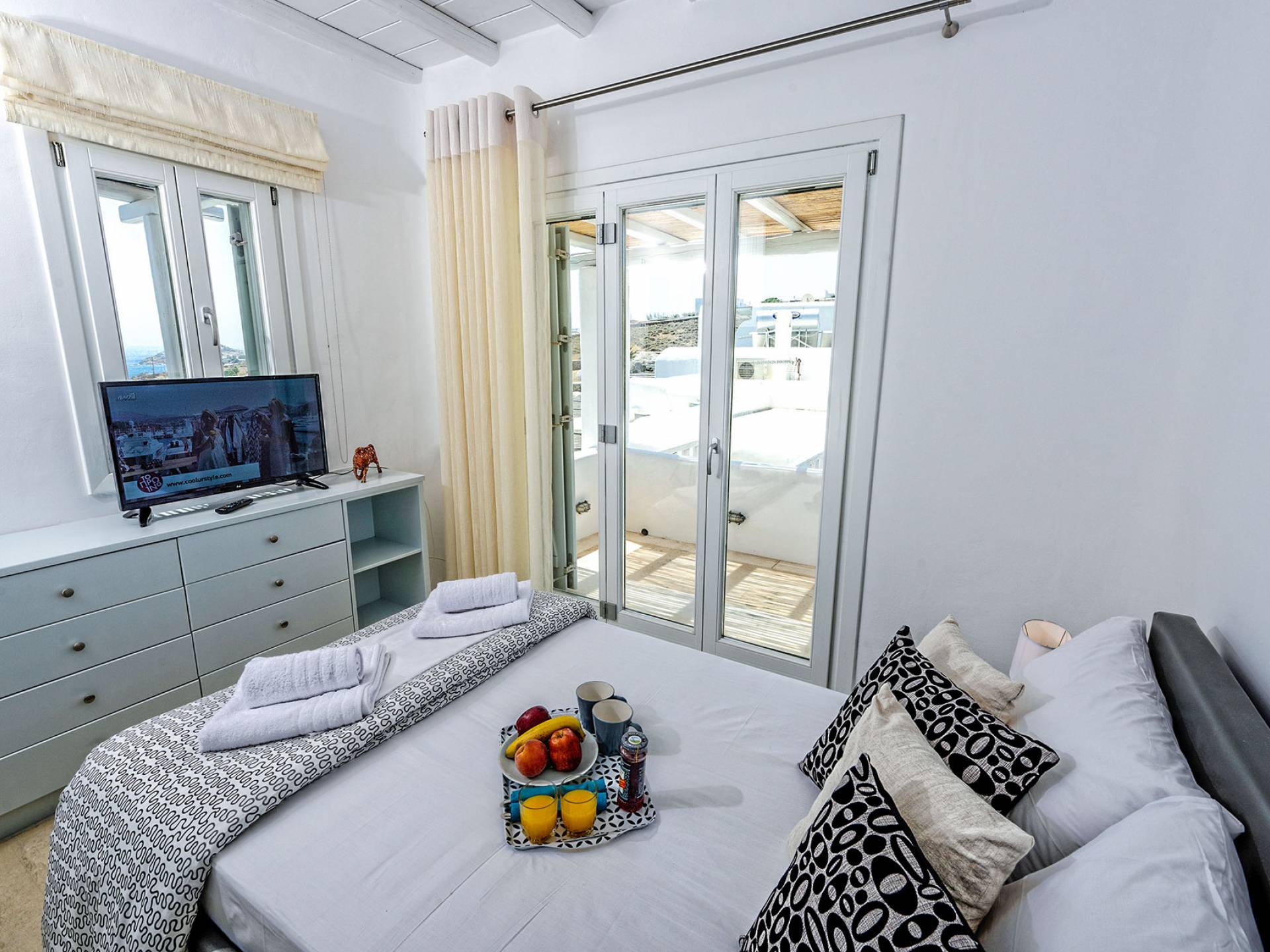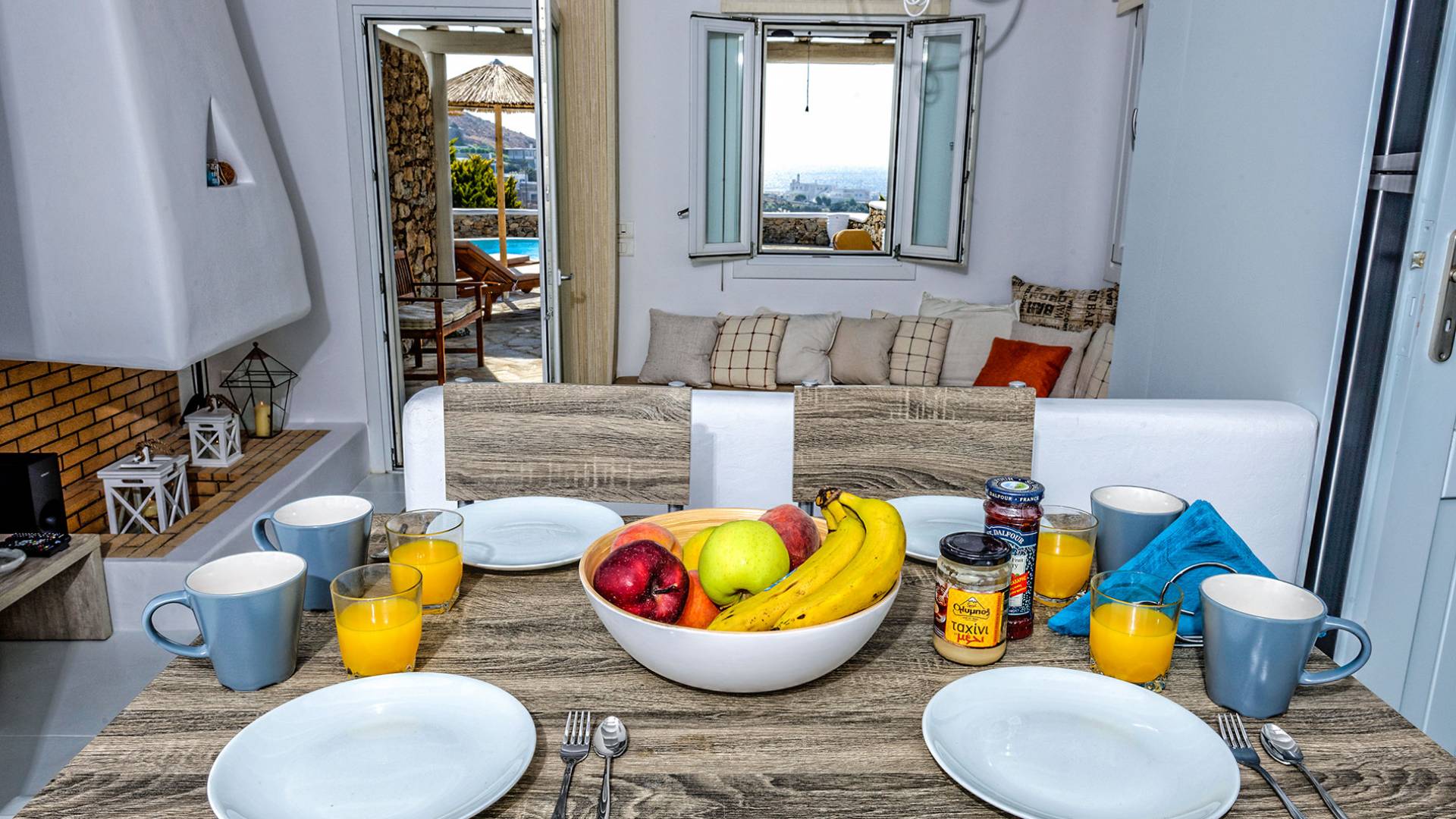 На первом уровне находятся гостиная, полностью оборудованная открытая кухня и обеденная зона. На верхнем уровне находится главная спальня со своей ванной и собственной верандой с видом на море. На подземном уровне расположены три спальни с двуспальными кроватями, две ванные комнаты, небольшая кухня и прачечная. Все комнаты полностью кондиционированы. Хорошо спроектированная открытая площадка, расположенная перед виллой, представляет собой большой современный бассейн и большую зону отдыха вокруг него. Кроме того, под элегантной деревянной беседкой есть встроенное барбекю, где гости могут приготовить себе еду, любуясь чудесным видом на море. Lucia Villa Mykonos идеально подходит для семей, пар и друзей, которые хотят насладиться всем, что может предложить Миконос, и при этом иметь возможность уединиться в более уединенной обстановке.