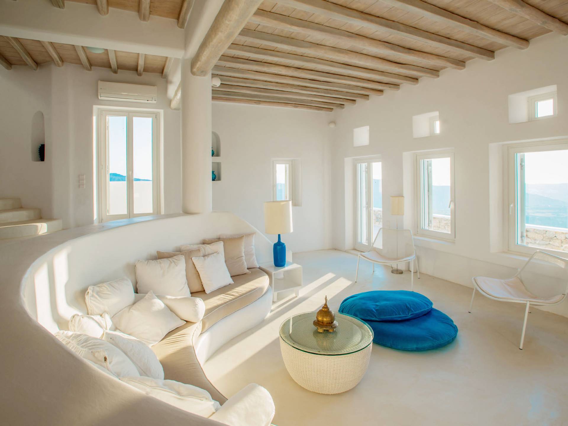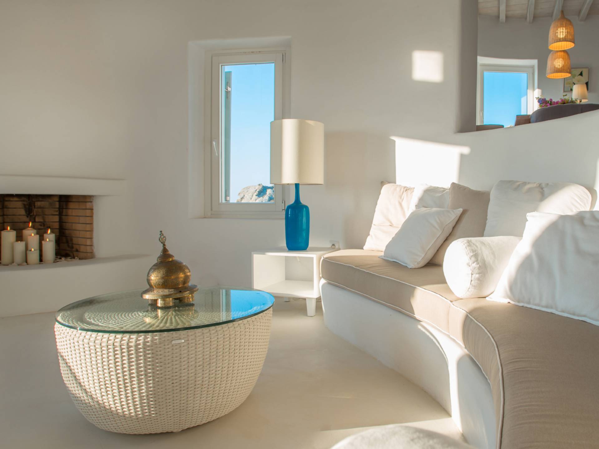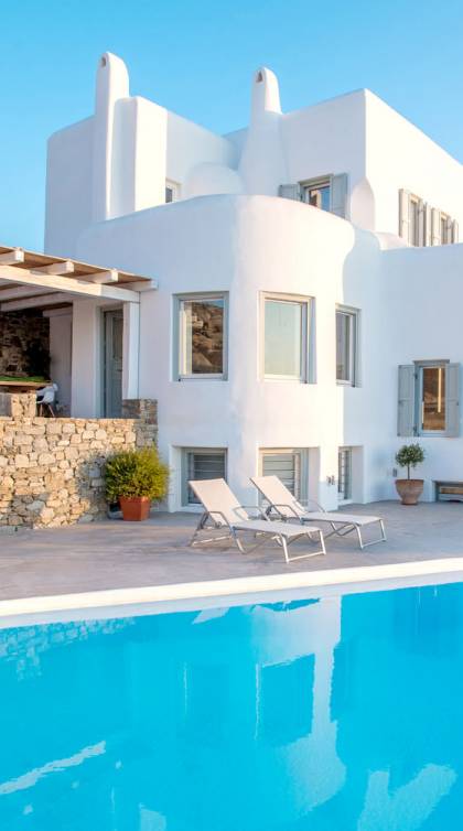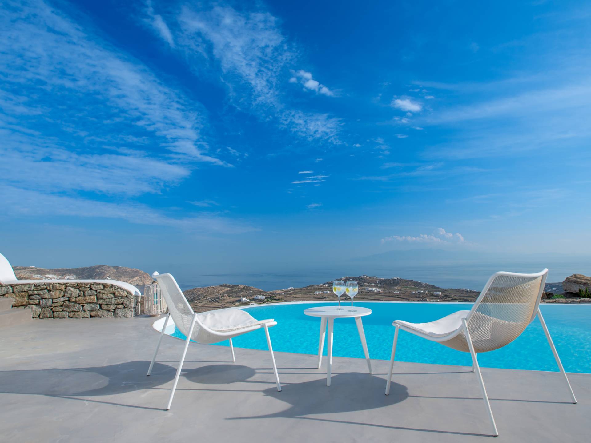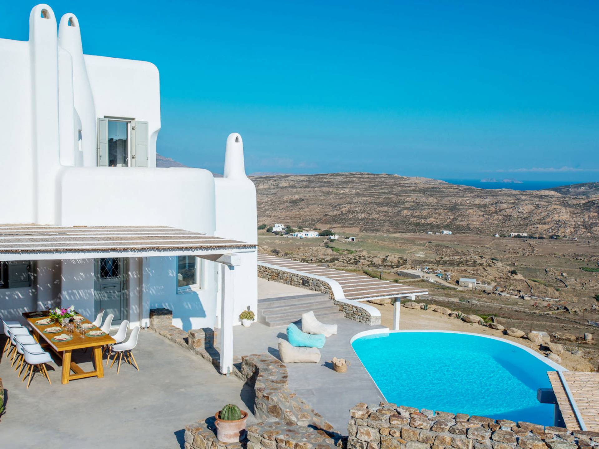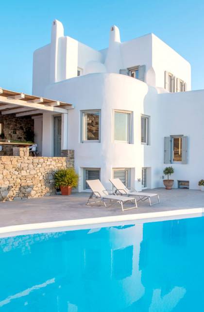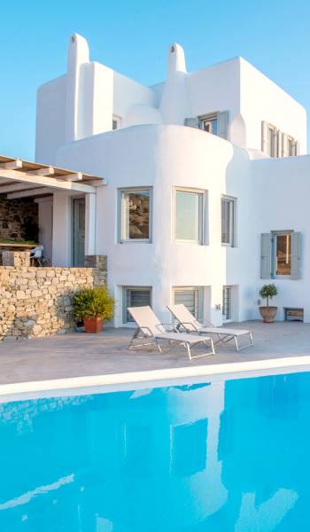 Velanos Villa Mykonos - это элегантная и просторная семейная вилла площадью около 450 квадратных метров (4 840 квадратных футов), выходящая на юг, в привилегированном защищенном от ветра месте на вершине холма Кунупас с захватывающим видом на Эгейское море. Он предлагает в общей сложности 6 спален и 5 ванных комнат и может вместить до 12 человек.