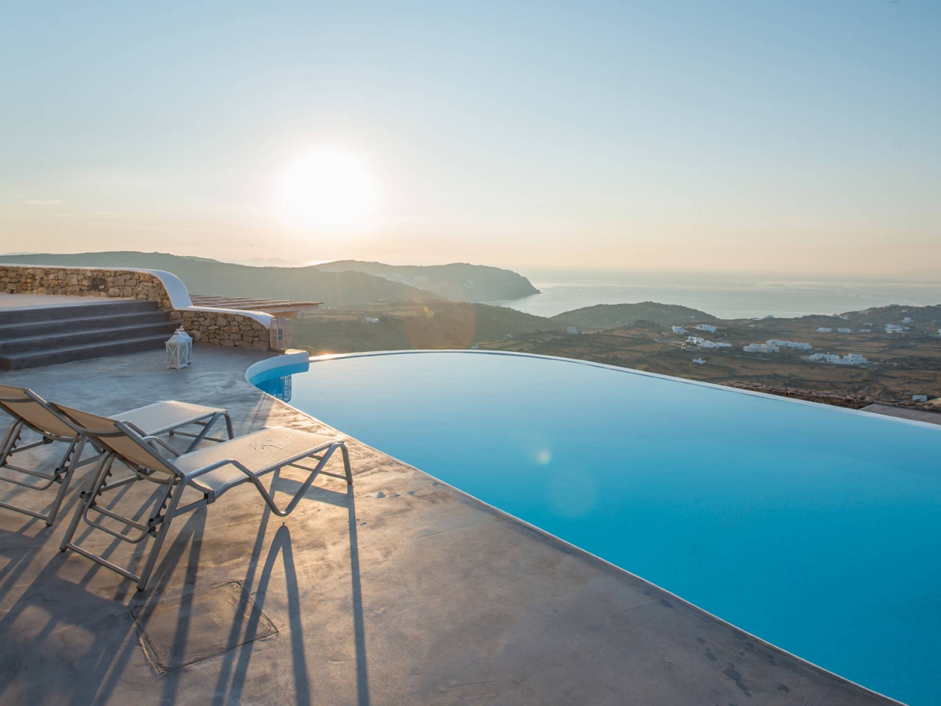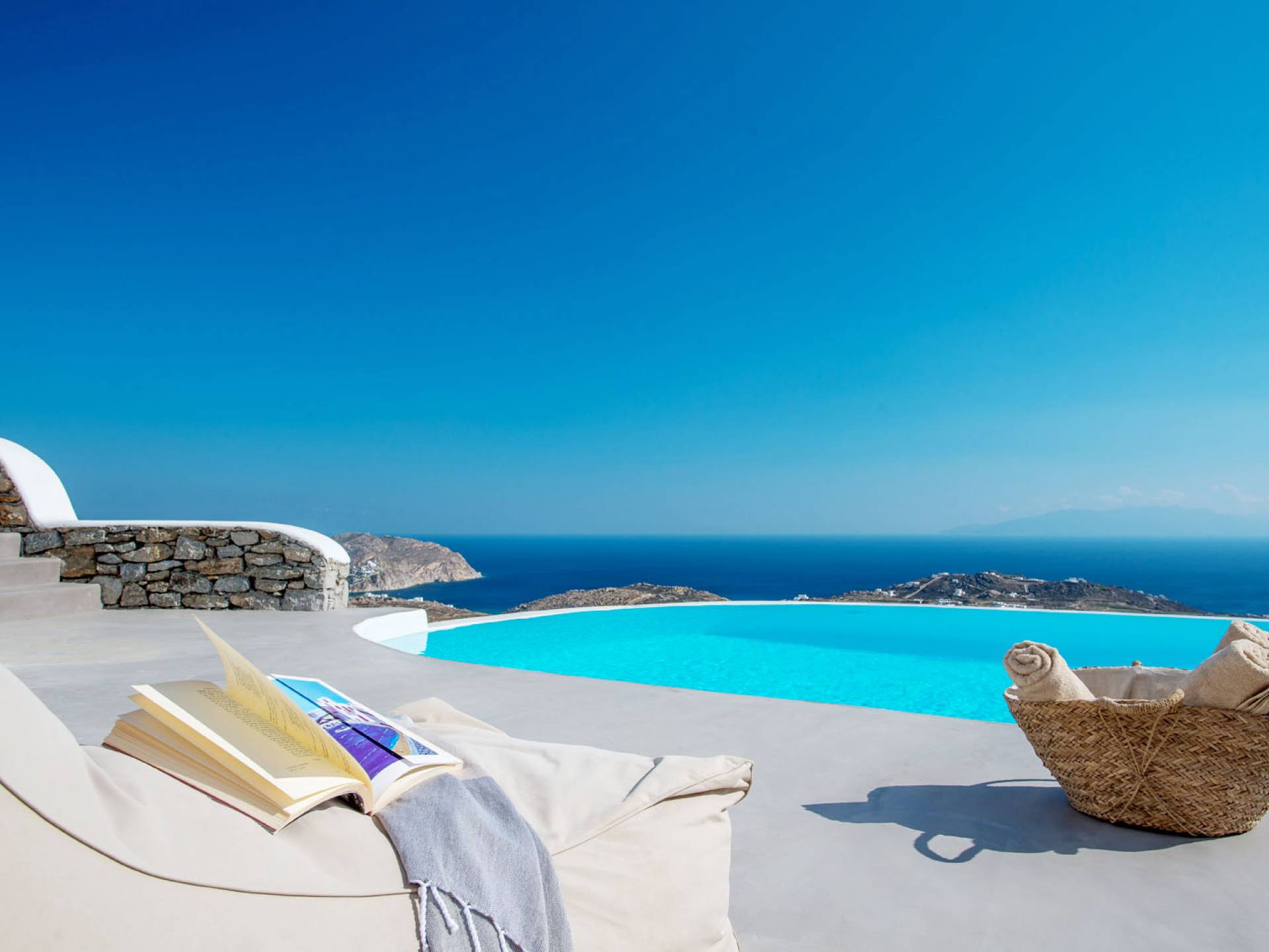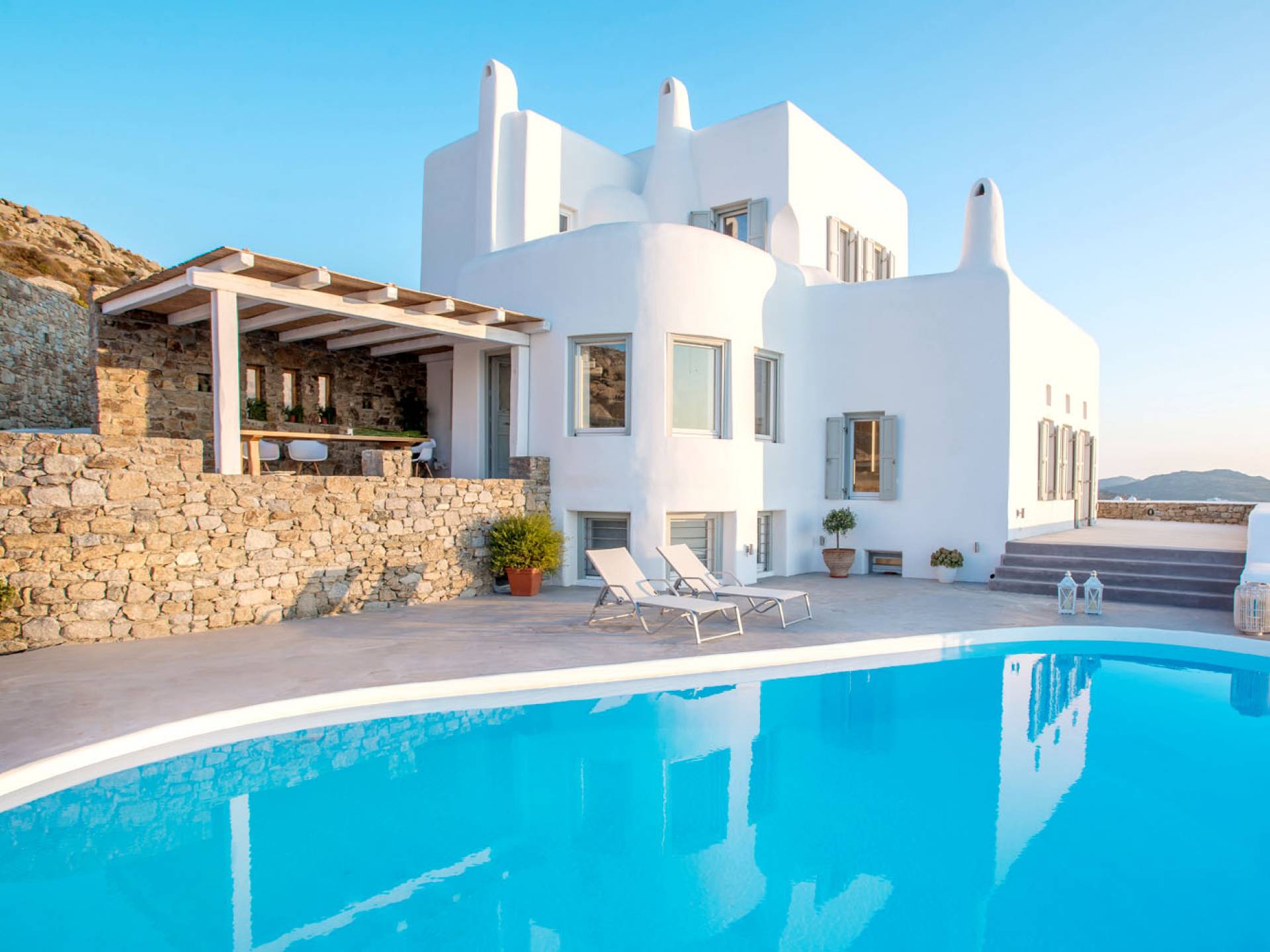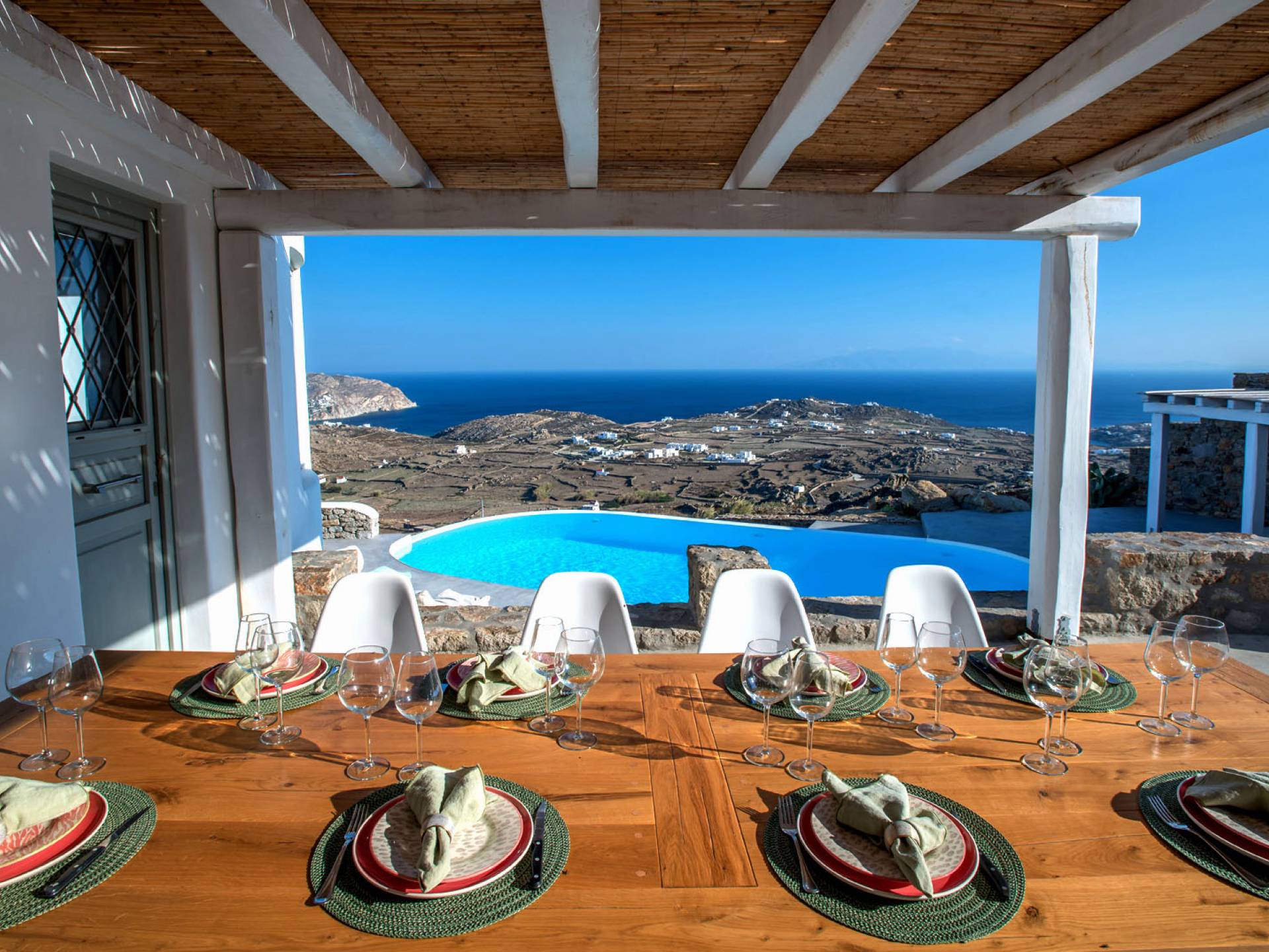 Velanos Villa Mykonos - это элегантная и просторная семейная вилла площадью около 450 квадратных метров (4 840 квадратных футов), выходящая на юг, в привилегированном защищенном от ветра месте на вершине холма Кунупас с захватывающим видом на Эгейское море. Он предлагает в общей сложности 6 спален и 5 ванных комнат и может вместить до 12 человек.