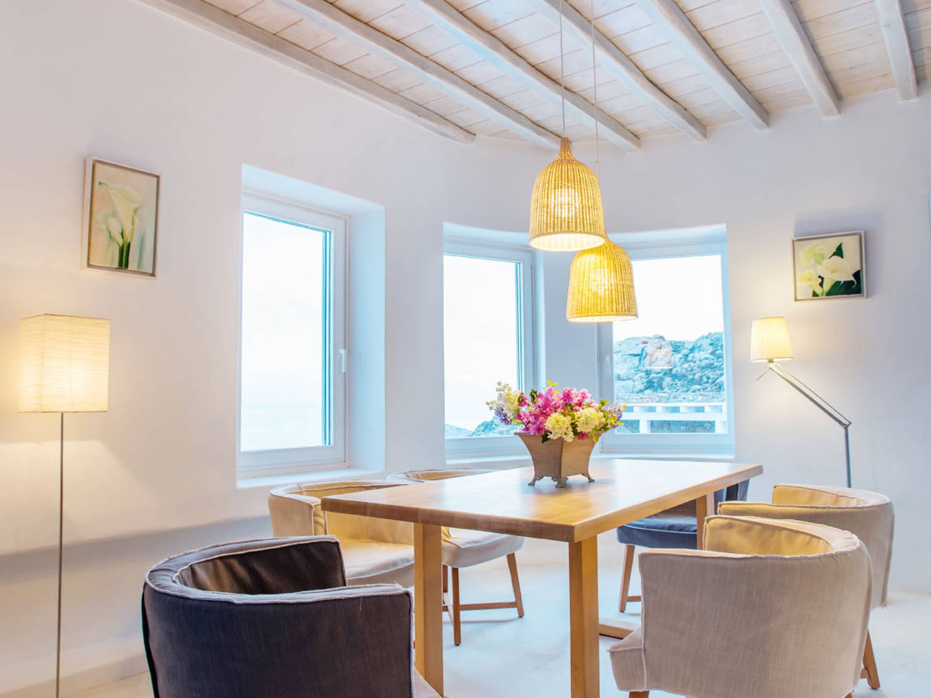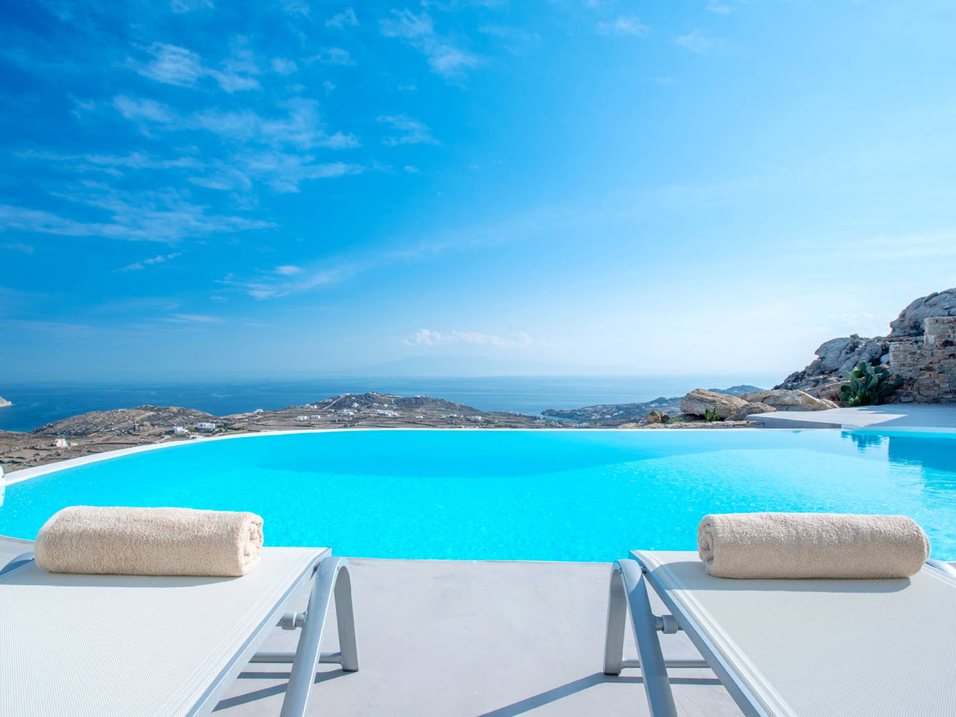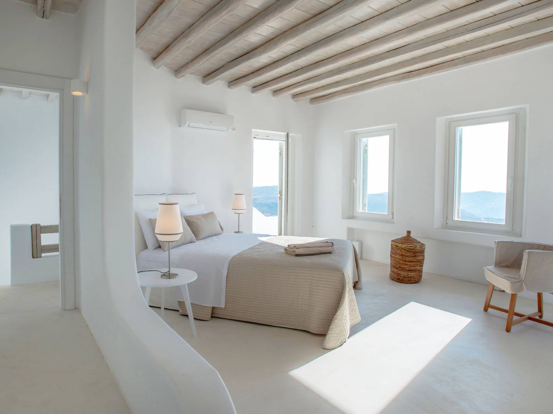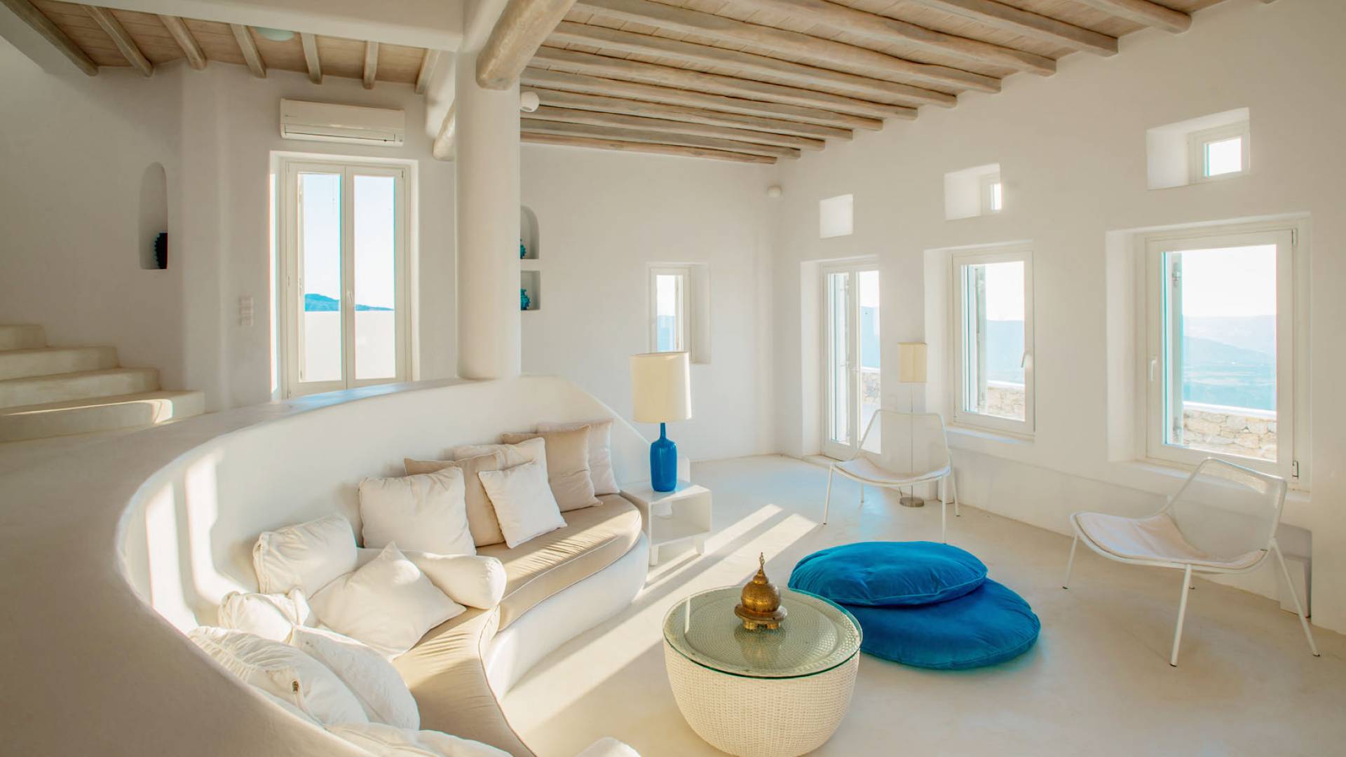 Velanos Villa Mykonos - это элегантная и просторная семейная вилла площадью около 450 квадратных метров (4 840 квадратных футов), выходящая на юг, в привилегированном защищенном от ветра месте на вершине холма Кунупас с захватывающим видом на Эгейское море. Он предлагает в общей сложности 6 спален и 5 ванных комнат и может вместить до 12 человек.