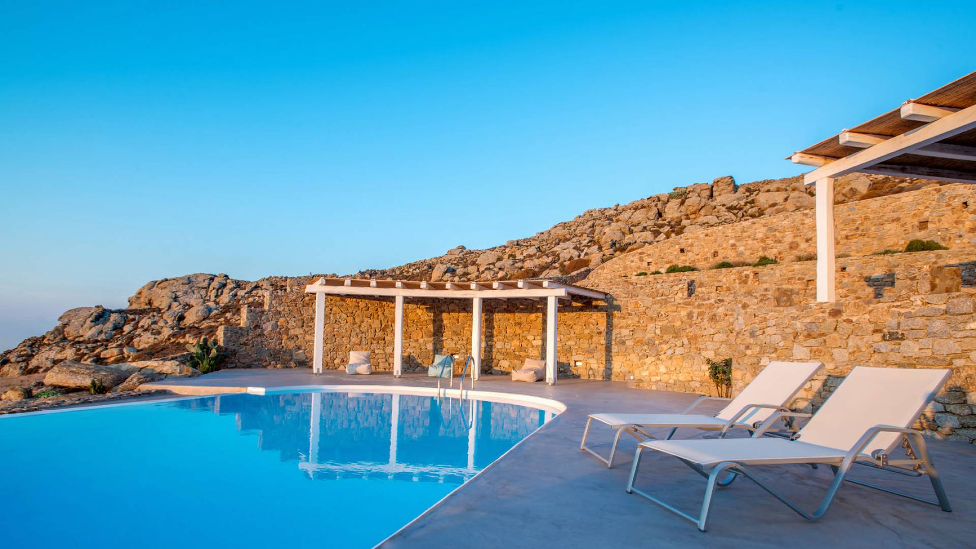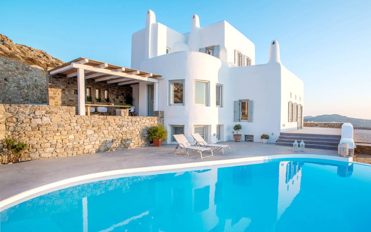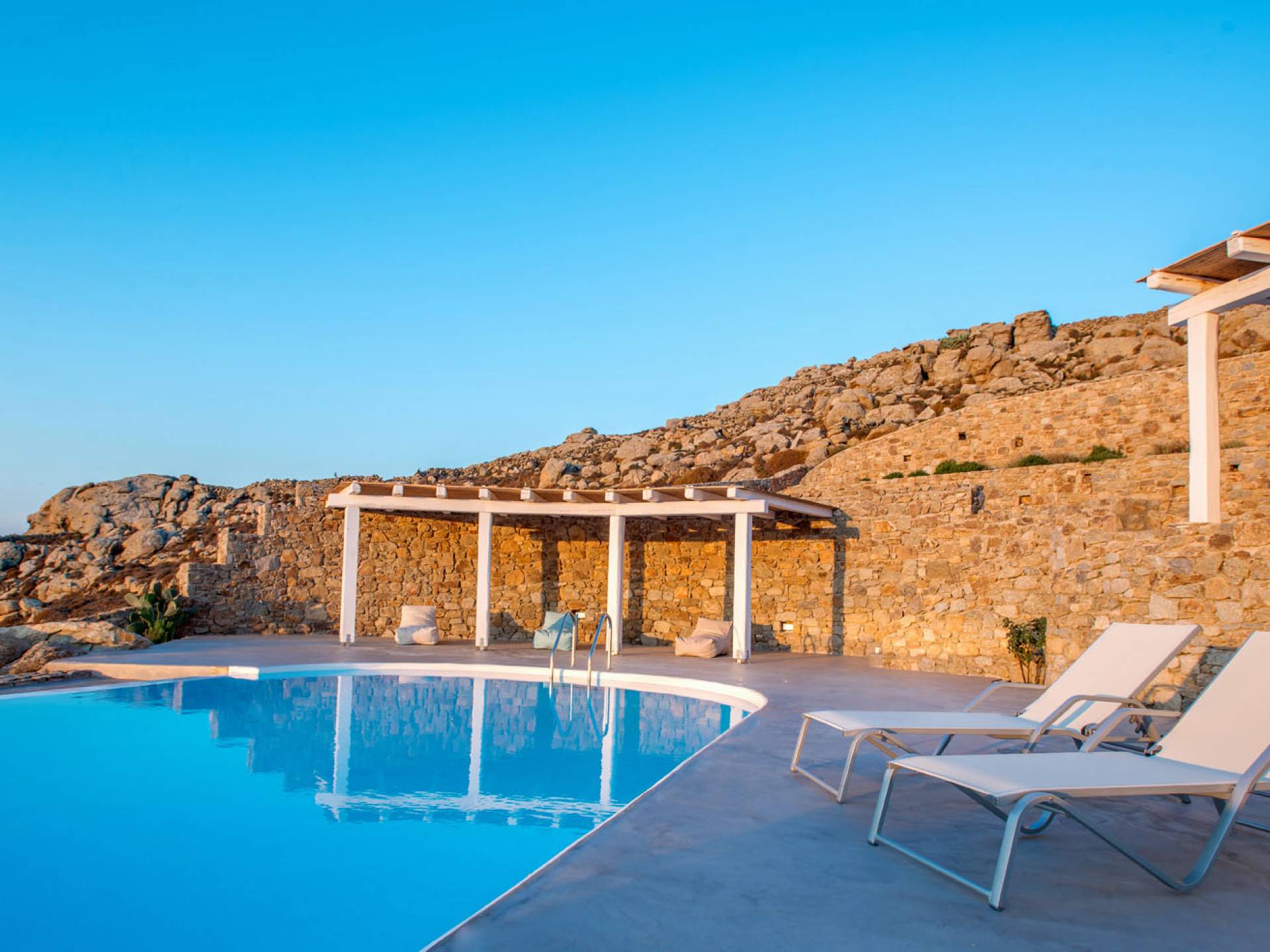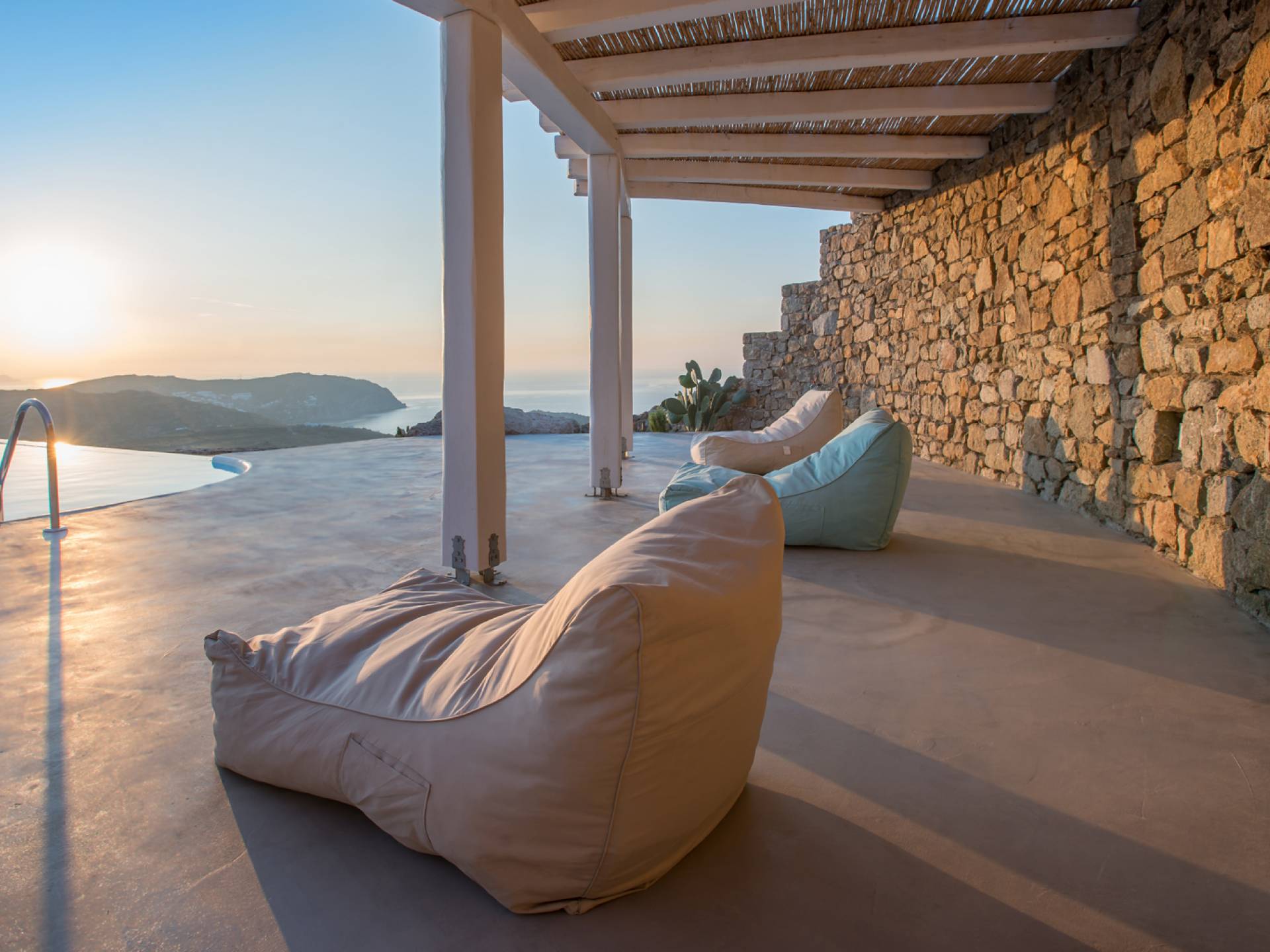 Веланос Вилла Миконос окружена скалистыми холмами и богатыми средиземноморскими травами, в которых царит истинный дух летней жизни. Элегантный пейзажный бассейн в сочетании с очень просторными террасами с удобной летней мебелью позволяет гостям наслаждаться греческим солнцем, а перголы создают освежающую тень.