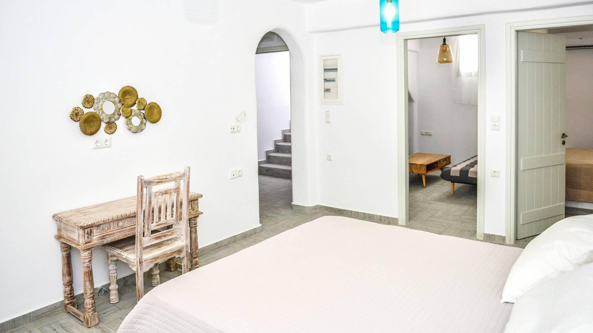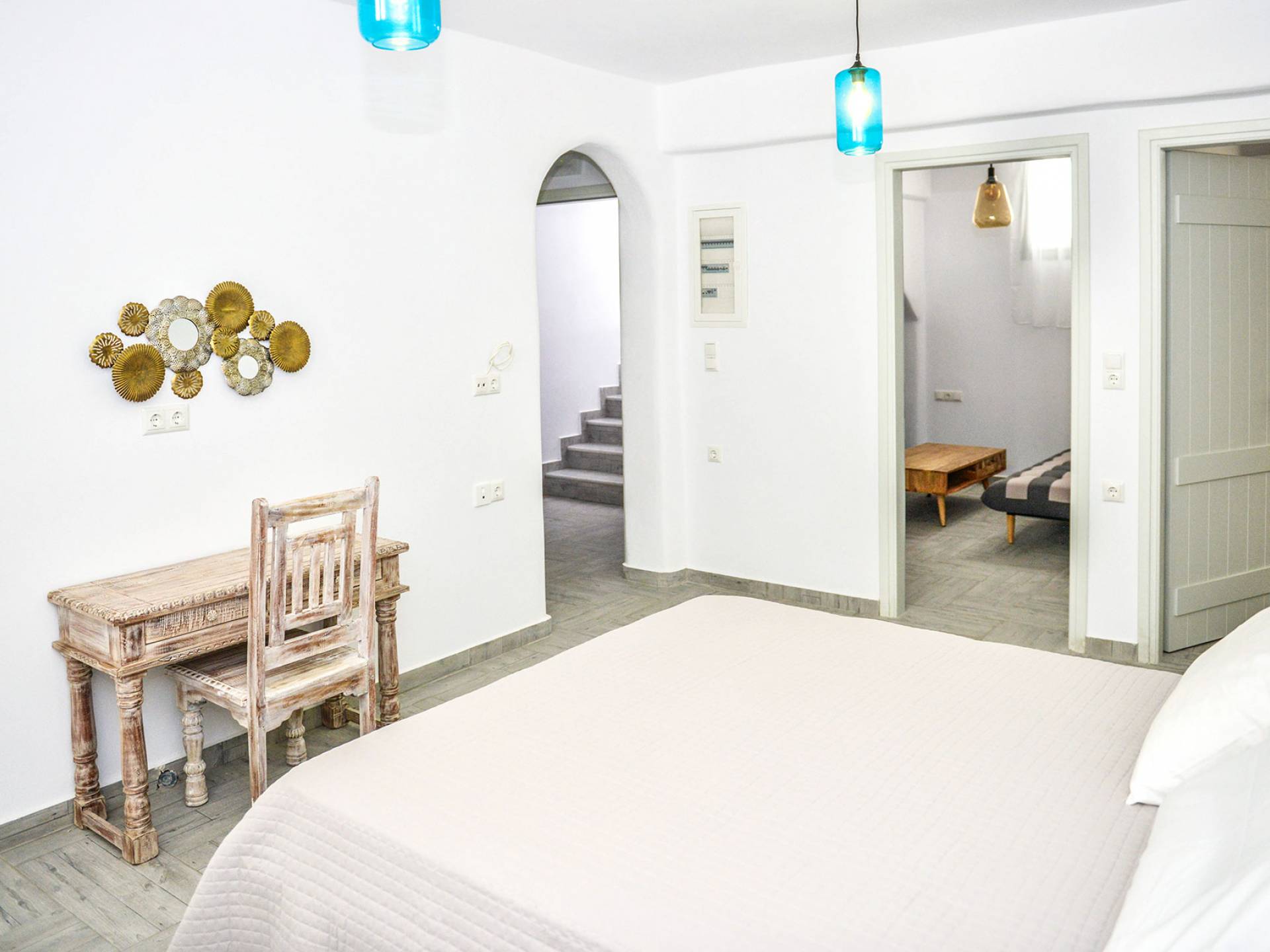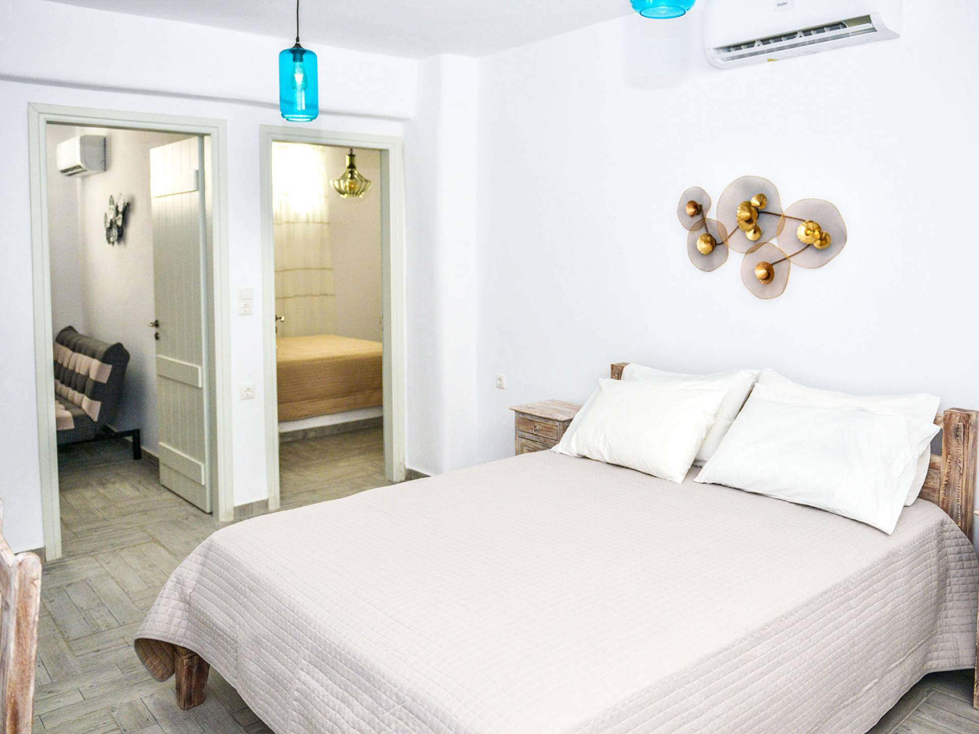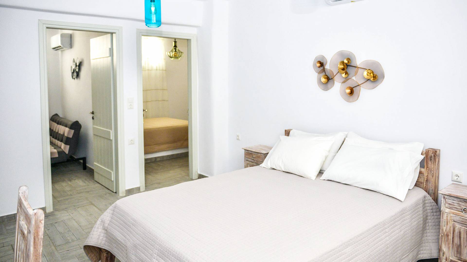 Вилла Erato Naxos — это вилла с 3 спальнями, тщательно спроектированная для семей или больших компаний. Главная спальня находится на верхнем этаже с 1 двуспальной кроватью (160 см х 200 см), собственной ванной комнатой, общим пространством, в котором может разместиться один человек, и балконом с прямым выходом на частную прихожую площадью 14 кв.м. бассейн с потрясающим видом на море. На первом этаже расположены две спальни с двуспальной кроватью (160 см х 200 см), небольшая комната с 2 односпальными диванами-кроватями и одна ванная комната.