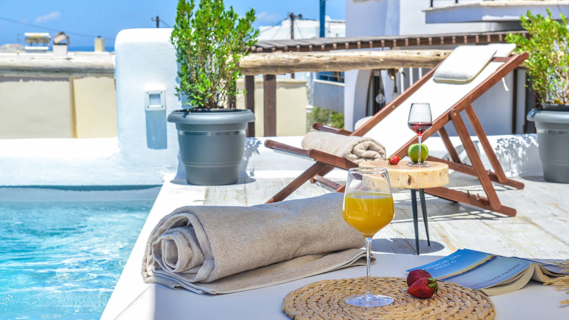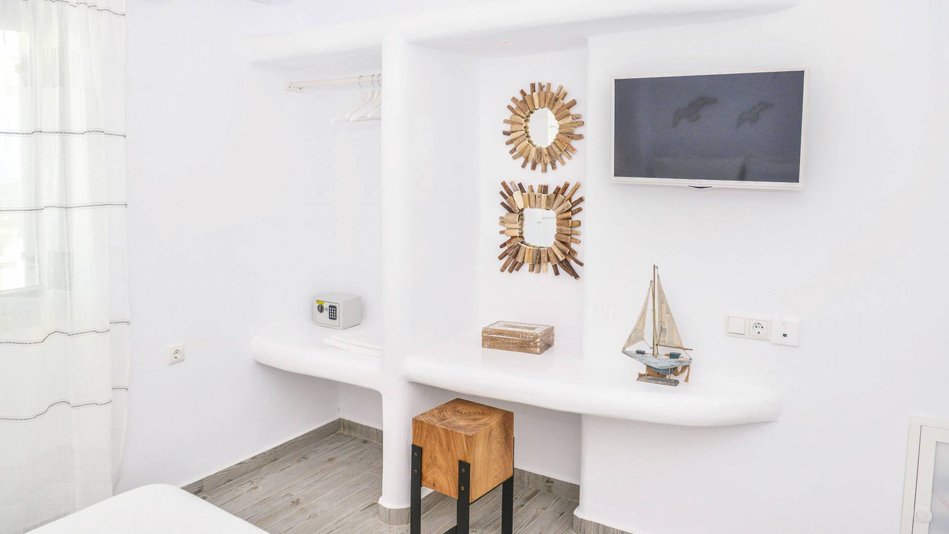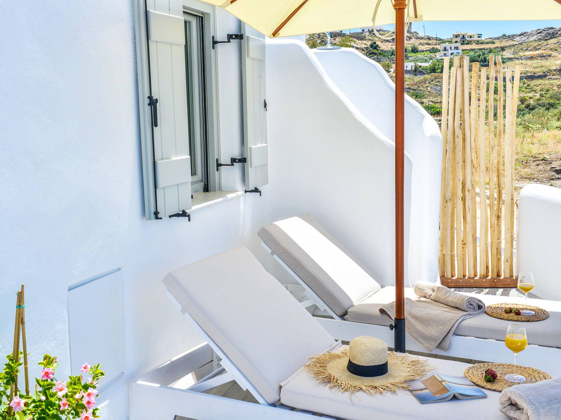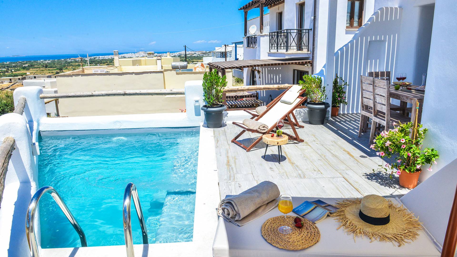 Вилла Erato Naxos — это вилла с 3 спальнями, тщательно спроектированная для семей или больших компаний. Главная спальня находится на верхнем этаже с 1 двуспальной кроватью (160 см х 200 см), собственной ванной комнатой, общим пространством, в котором может разместиться один человек, и балконом с прямым выходом на частную прихожую площадью 14 кв.м. бассейн с потрясающим видом на море. На первом этаже расположены две спальни с двуспальной кроватью (160 см х 200 см), небольшая комната с 2 односпальными диванами-кроватями и одна ванная комната.