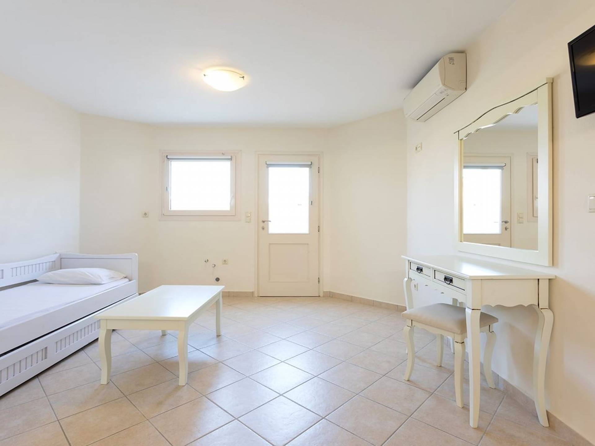 В этой вилле могут разместиться до 6 человек. На нижнем уровне есть спальня с двуспальной кроватью, гостиная зона с 2 диванами-кроватями и ванная комната с душем, а на первом этаже есть вторая гостиная зона с диванами-кроватями. , вторая ванная комната с душевой кабиной и верхний уровень, на котором находится главная спальня с примыкающей к ней третьей ванной комнатой с душевой кабиной. На первом уровне есть собственная терраса площадью 15 квадратных метров, а на верхнем уровне — собственная терраса площадью 20 квадратных метров, обе с садовой мебелью и прекрасным видом, а мезонет имеет два отдельных входа.